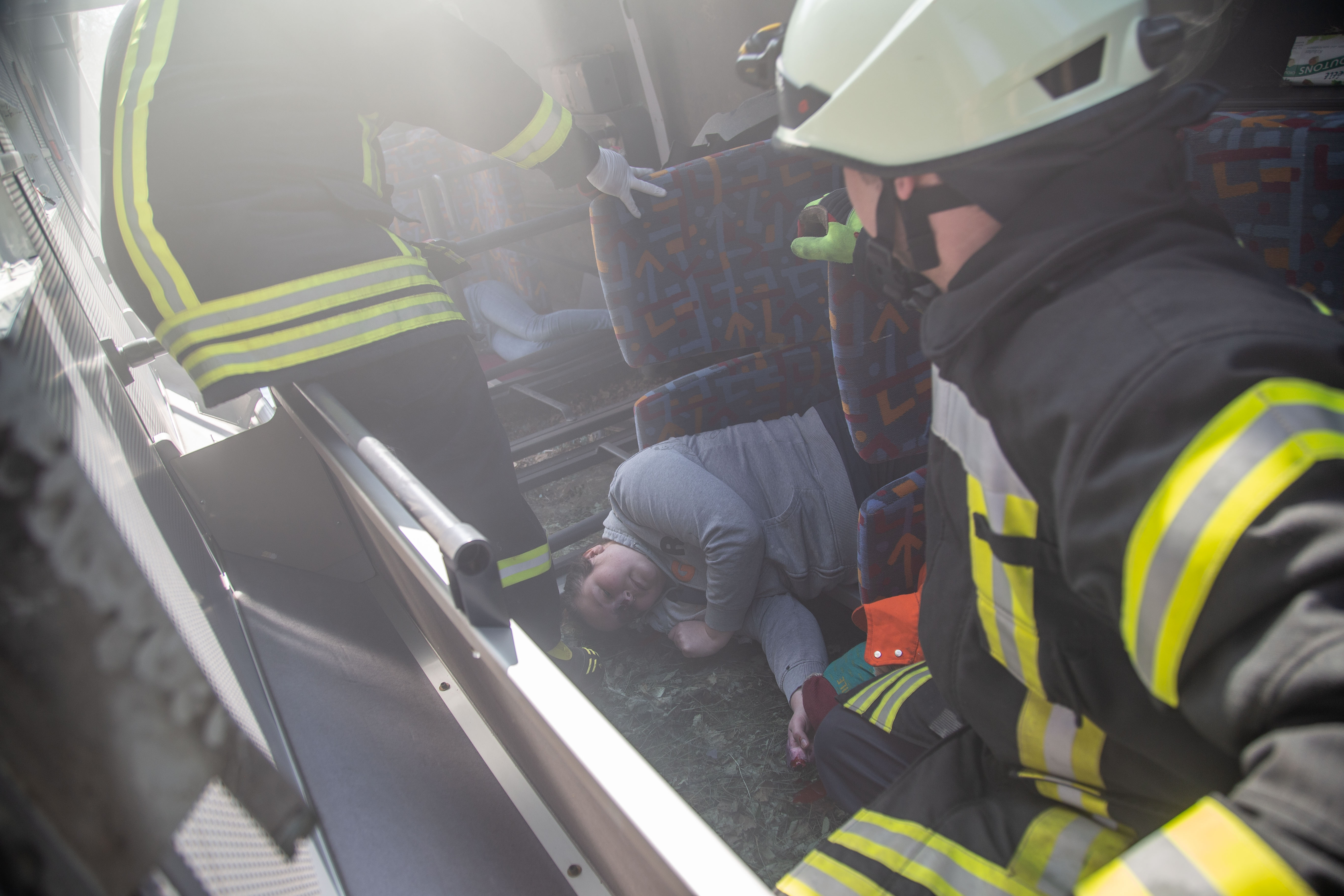 Für die Befreiung der Person unter dem Bus wurde dieser mittels Hebekissen vom THW angehoben.