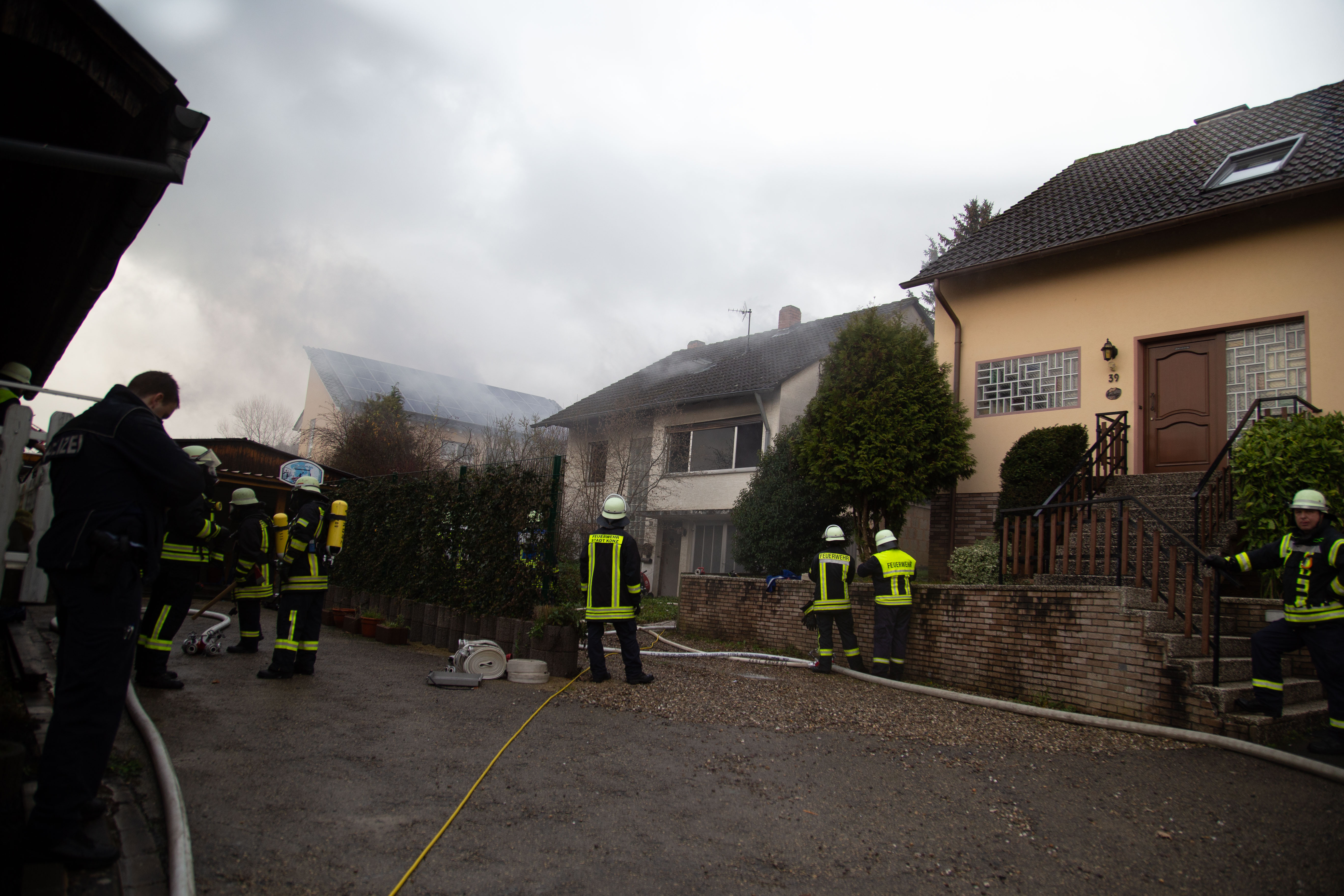 Das Haus war hinter einem Gebäudekomplex. Für die Drehleiter war ein rankommen an die Einsatzstelle nur schwer möglich. Es war alles sehr eng. Die Flammen schlugen am Anfang aus dem Gebäude. Das Feuer war schnell unter Kontrolle.