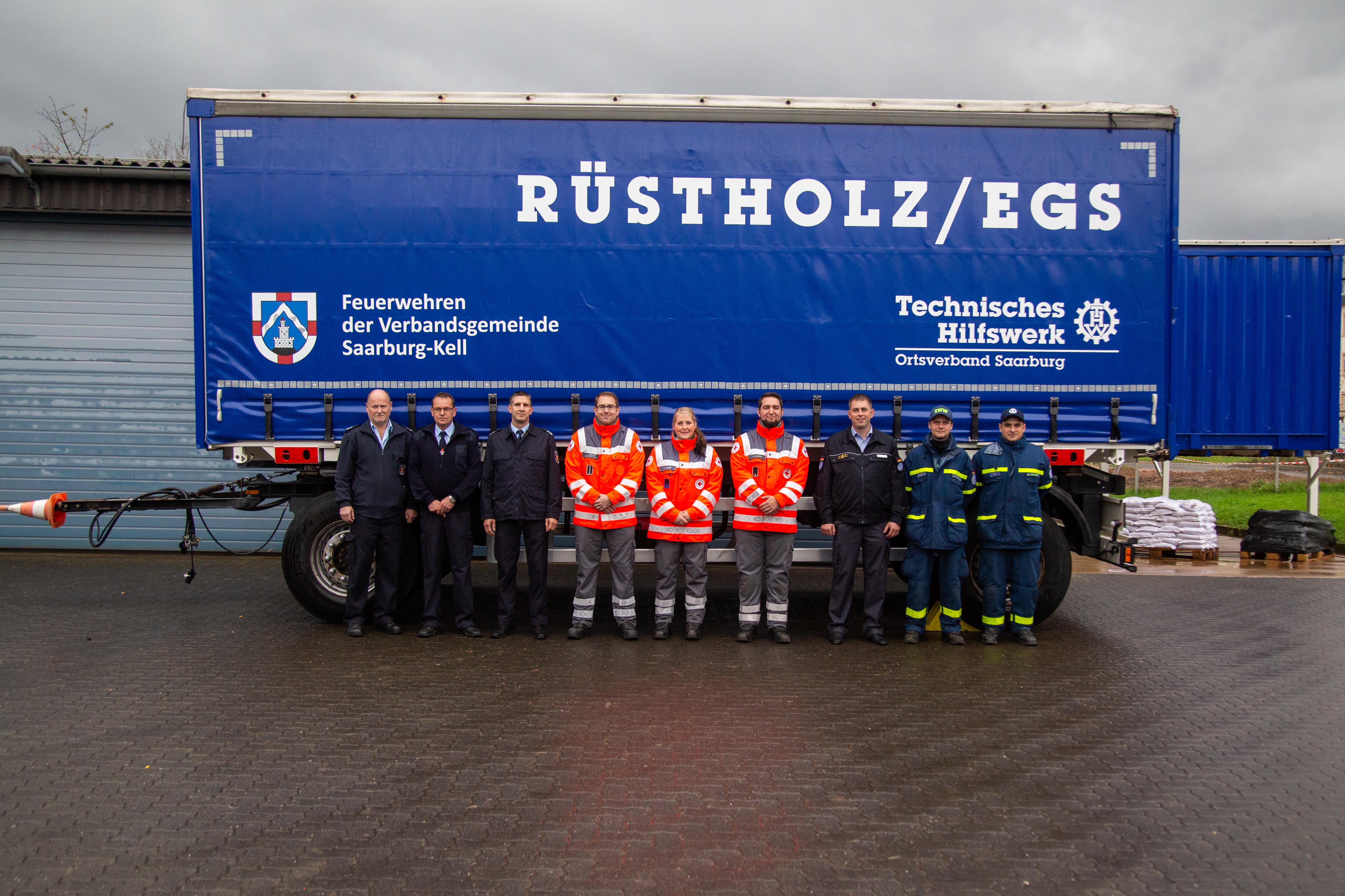 Herr Dixius ging in seiner Ansprache auf die vorbildliche und gute Zusammenarbeit des THW mit der Feuerwehr der VG Saarburg-Kell ein. In zahlreichen Einsätzen haben sie bewiesen, dass man sich gegenseitig unterstützen kann. Da sich nach den zahlreichen Starkregenereignissen die Wichtigkeit der Vorhaltung von Sandsäcken herausgestellt hatte, war es ein Problem für die Lagerung eine geeignete Unterstellmöglichkeit zu finden. Auch sollten die Sandsäcke schnell verfügbar und der Transport zur Einsatzstelle direkt gewährleitet sein. Mit der Idee der Anschaffung von den Wechselbrücken war dies gegeben. Durch den Verbandsgemeinderat wurde die finanzielle Beteiligung an der Beschaffung zugestimmt, dafür dankte er den Gremien. Mit der zweiten Wechselbrücke wird Abstütz- und Rüstmaterial vorgehalten. Nach dem Brand des Verwaltungsgebäudes der Verbandsgemeinde in Saarburg hat sich gezeigt, wie wichtig auch solche Materialien sein können. Das THW hatte damals die Gebäudeabstützung übernommen und somit wesentlich zur Sicherung der Bausubtanz beigetragen.