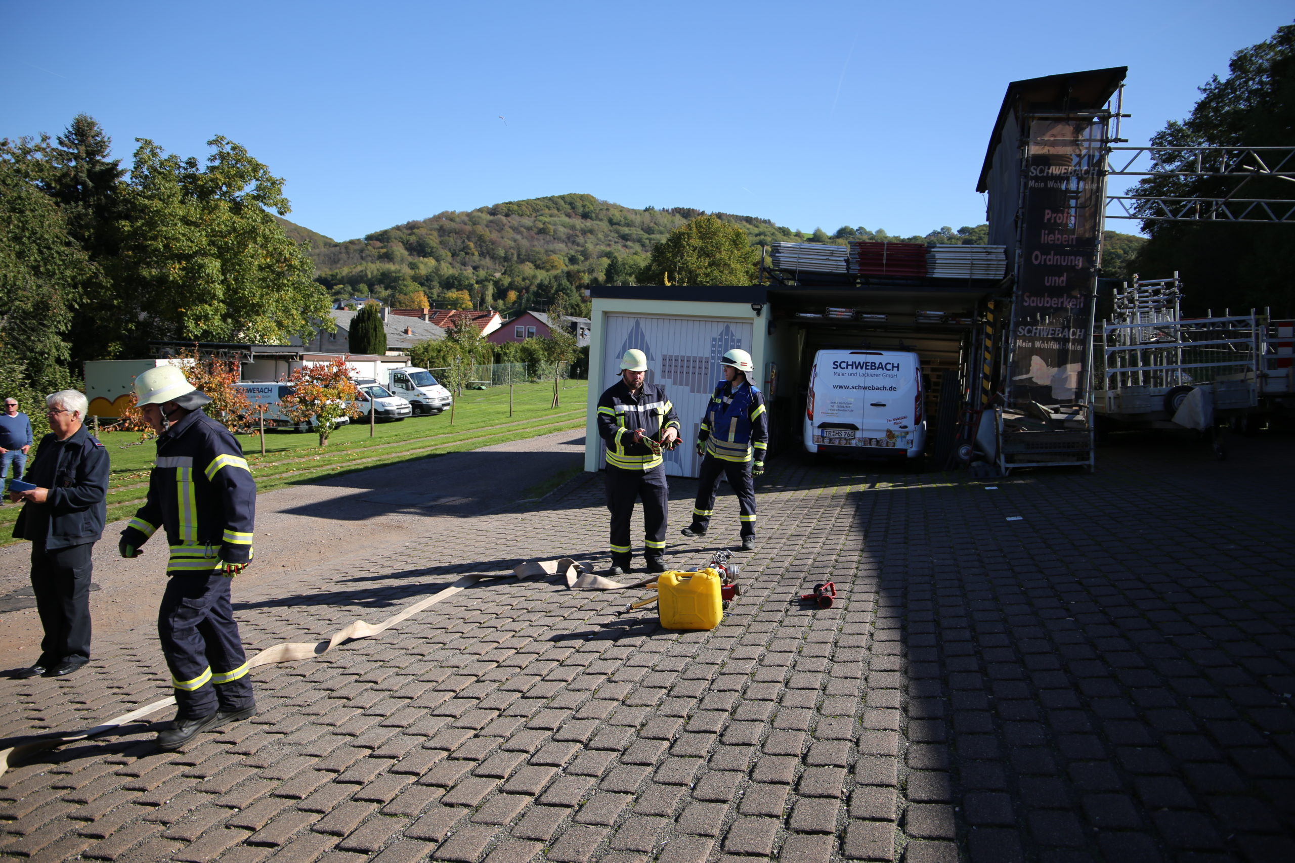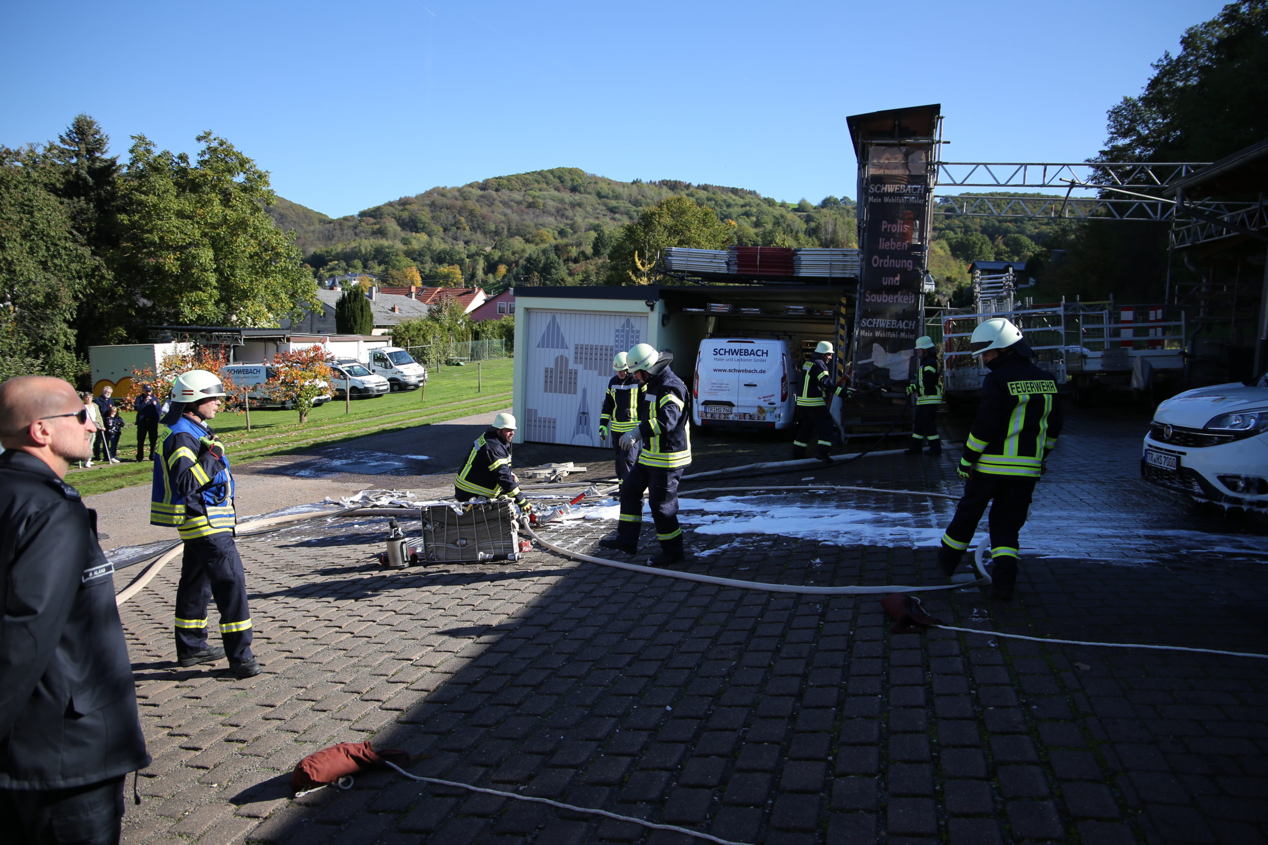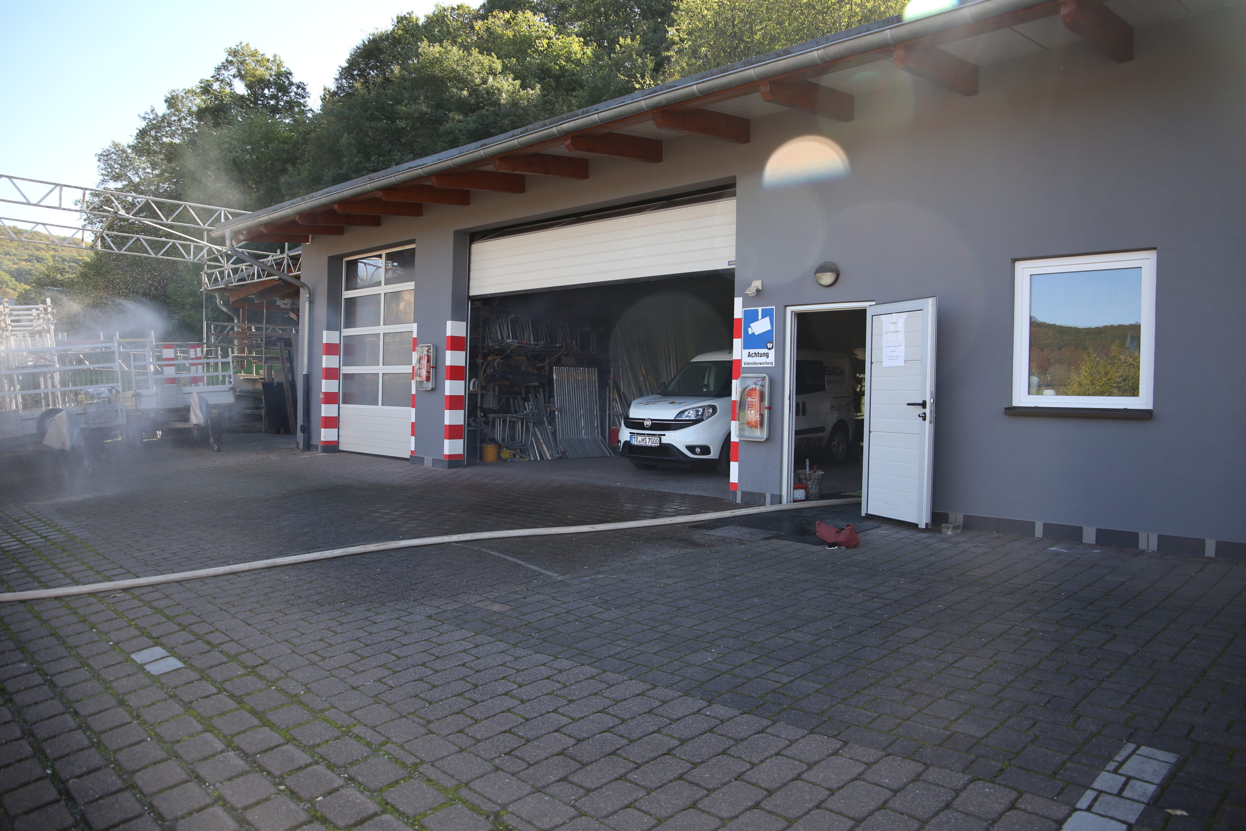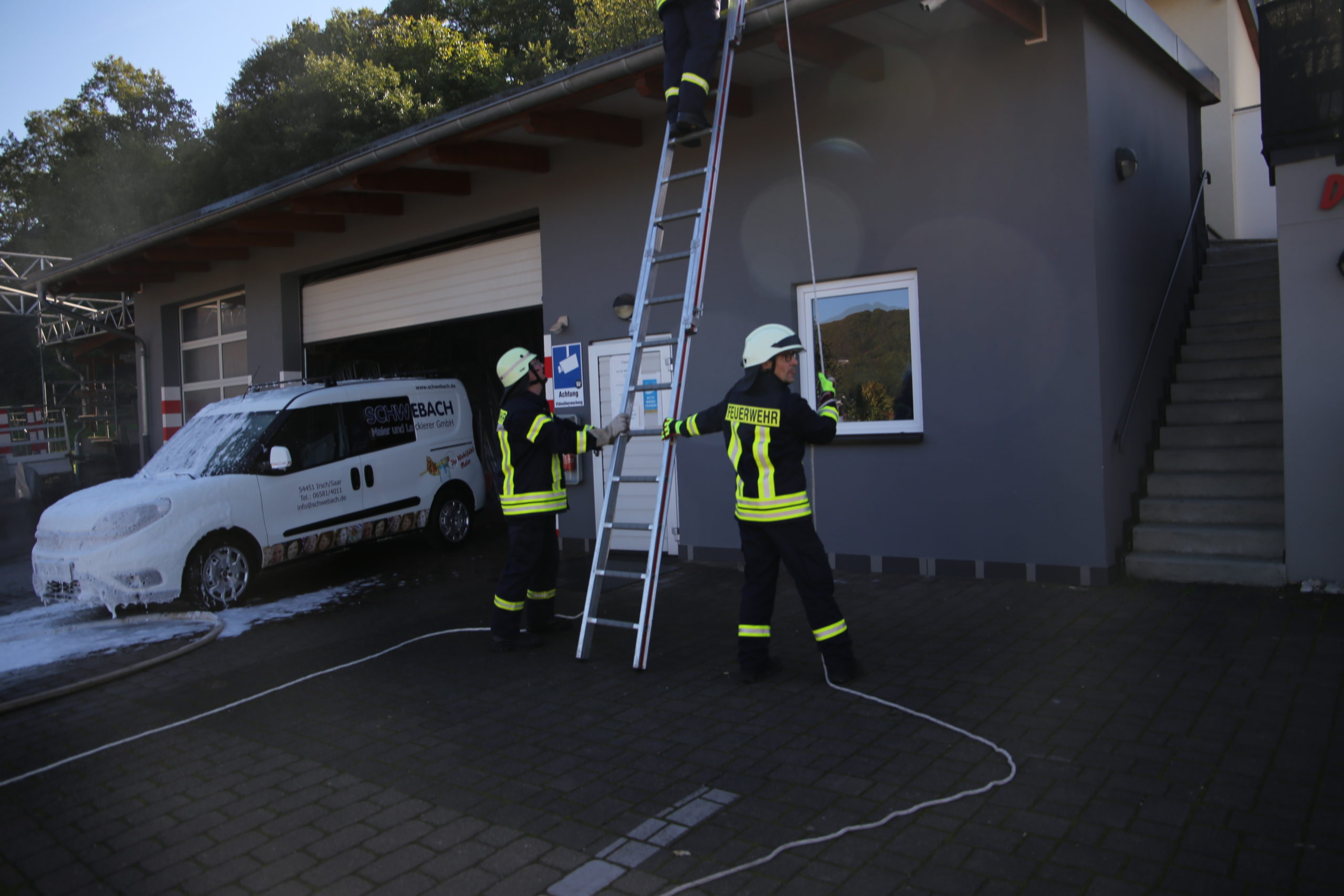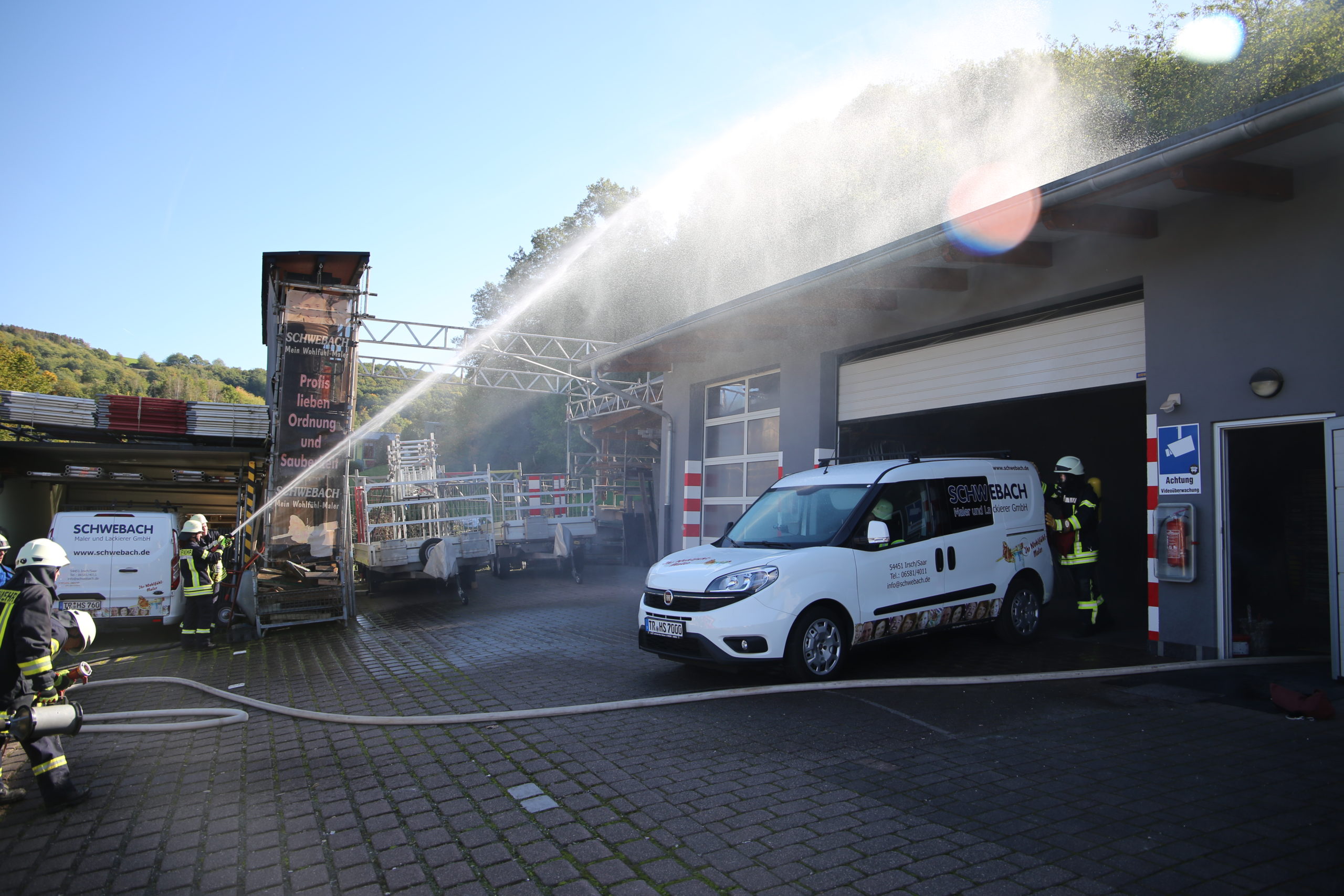 Bei Räumungsarbeiten in der Lager und Fahrzeughalle bei der Firma Hans Schwebach (Maler und Lackierbetrieb) in Irsch kam es plötzlich durch einen Defekt an einer Akku-Ladestation zu einem Brandausbruch.  In der Fahrzeughalle und in den Lagerräumen lagerten Lacke und Verdünner, welche sich im Ernstfall sehr schnell als Brandbeschleuniger heraus stellen können.