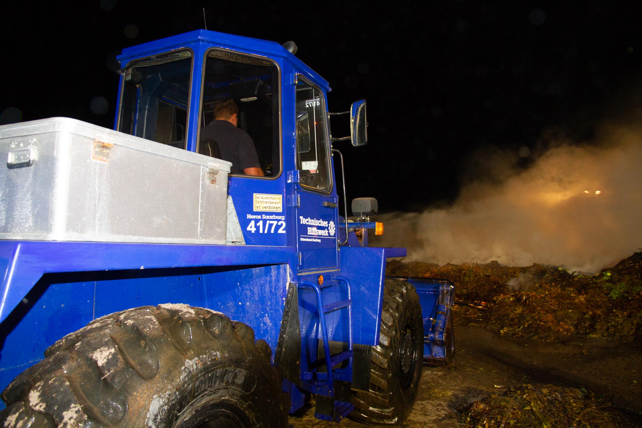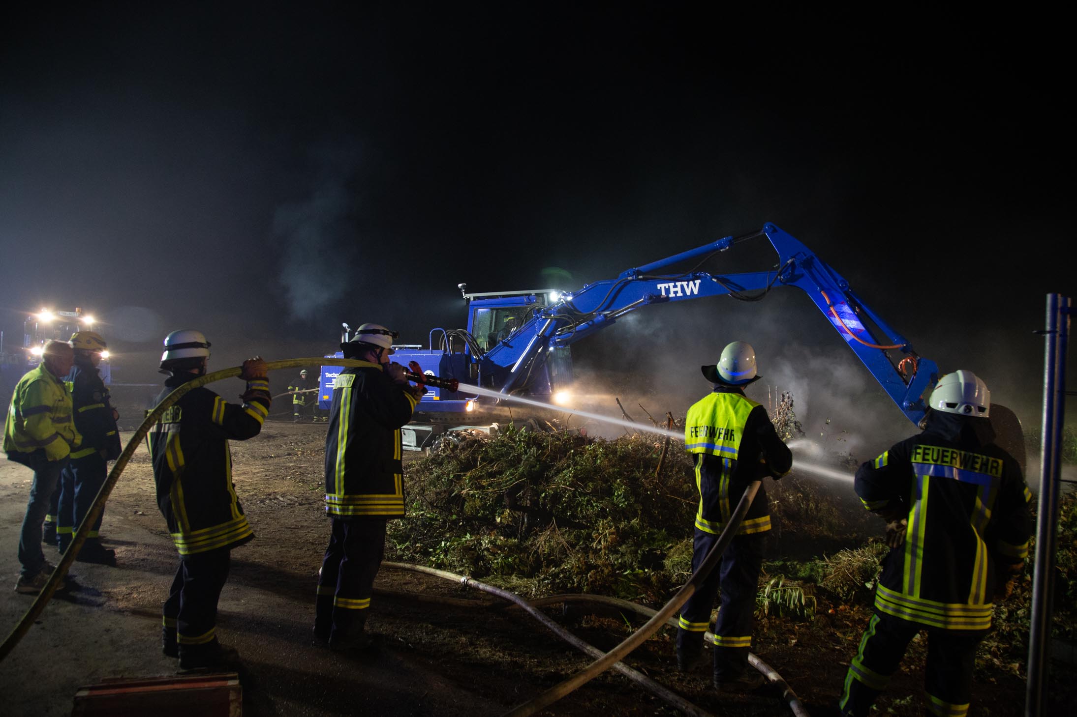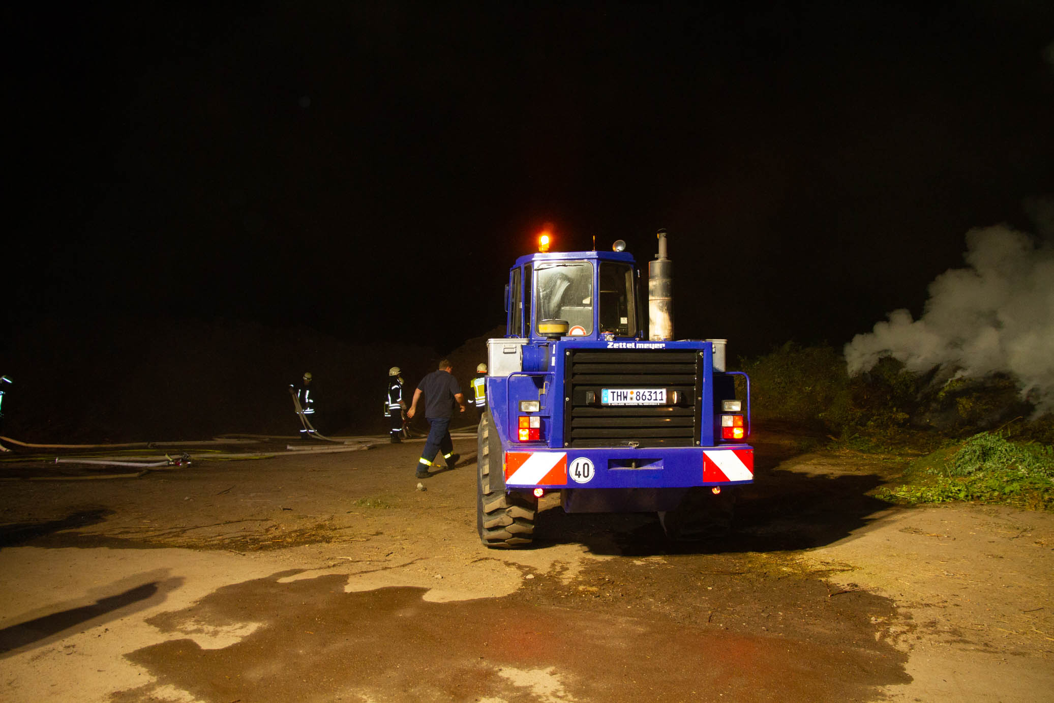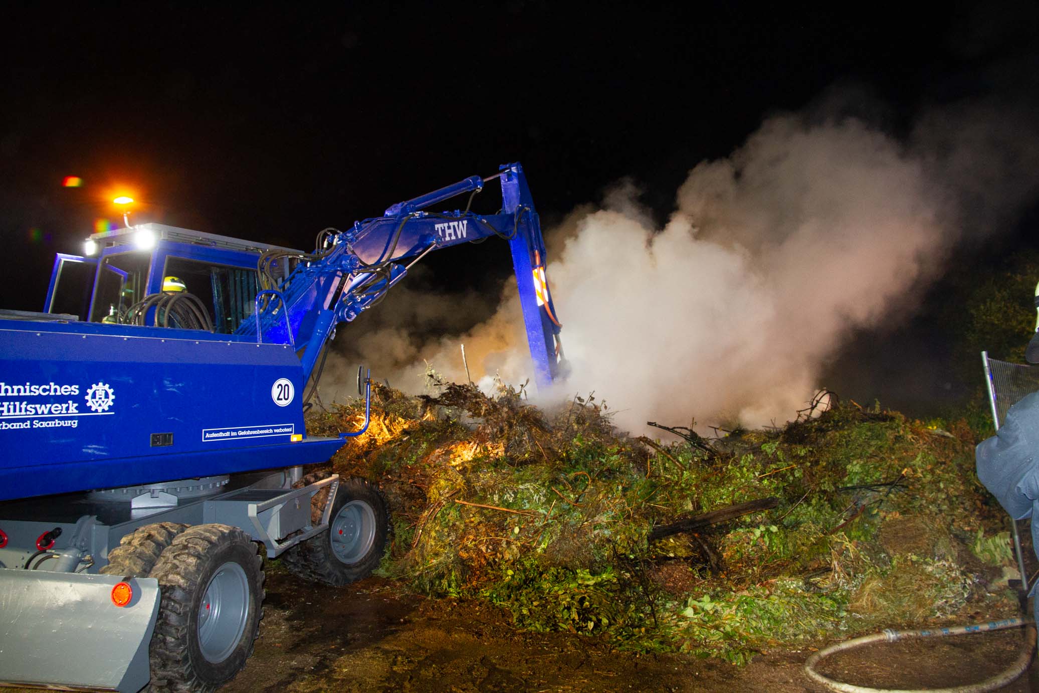 Zwischen 800 und 1000 Kubikmeter Grünschnitt brannten. Mit schwerem Gerät wurde der Grünschnitt auseinander gezogen und abgelöscht. Hier kamen ein Radlader und der Bagger des THW Ortsverbands Saarburg zum Einsatz.