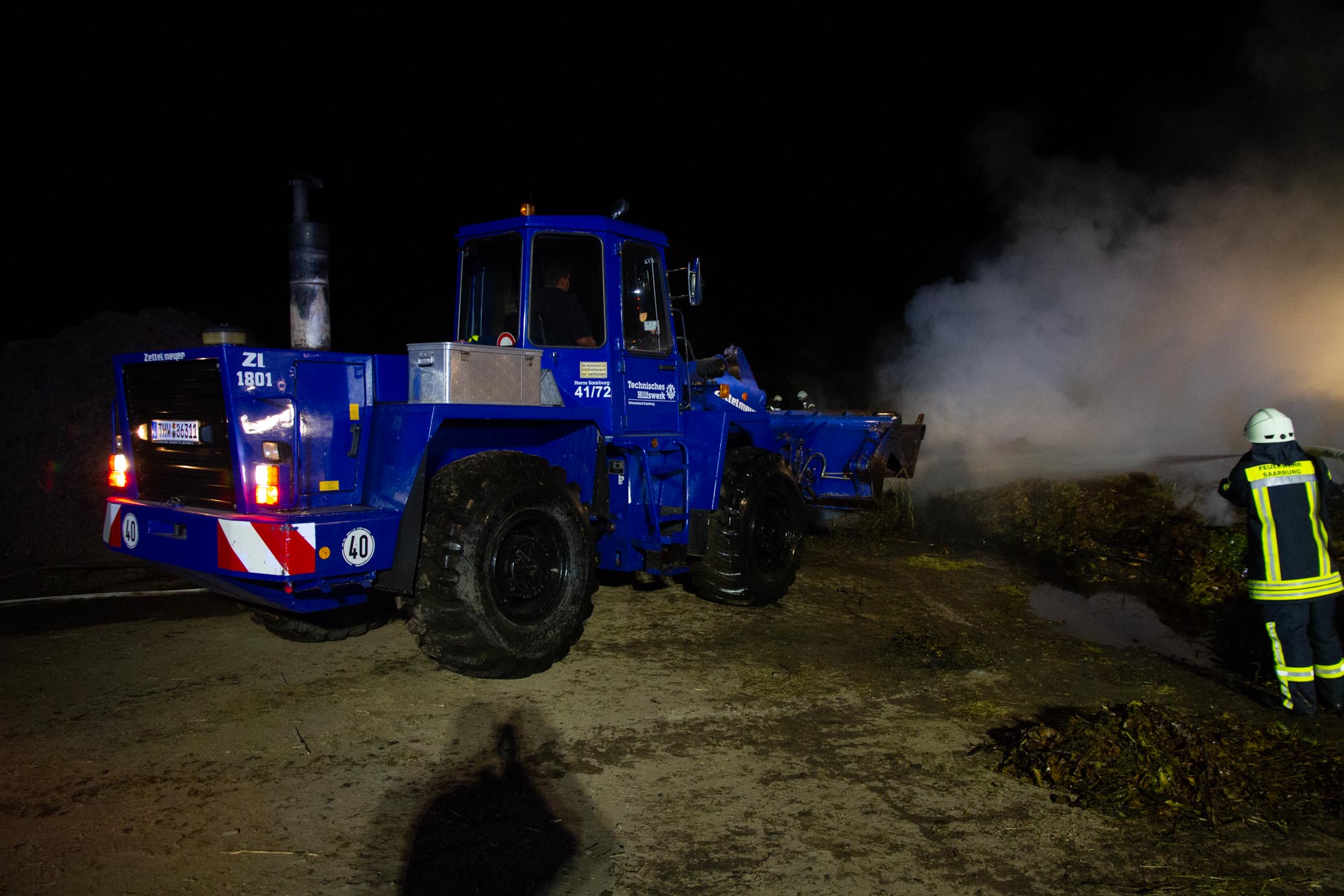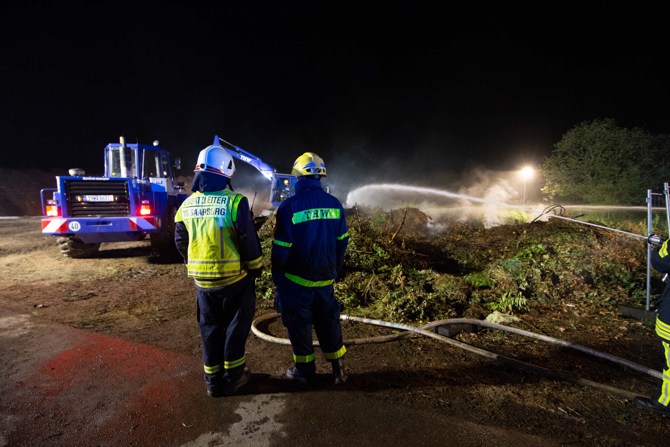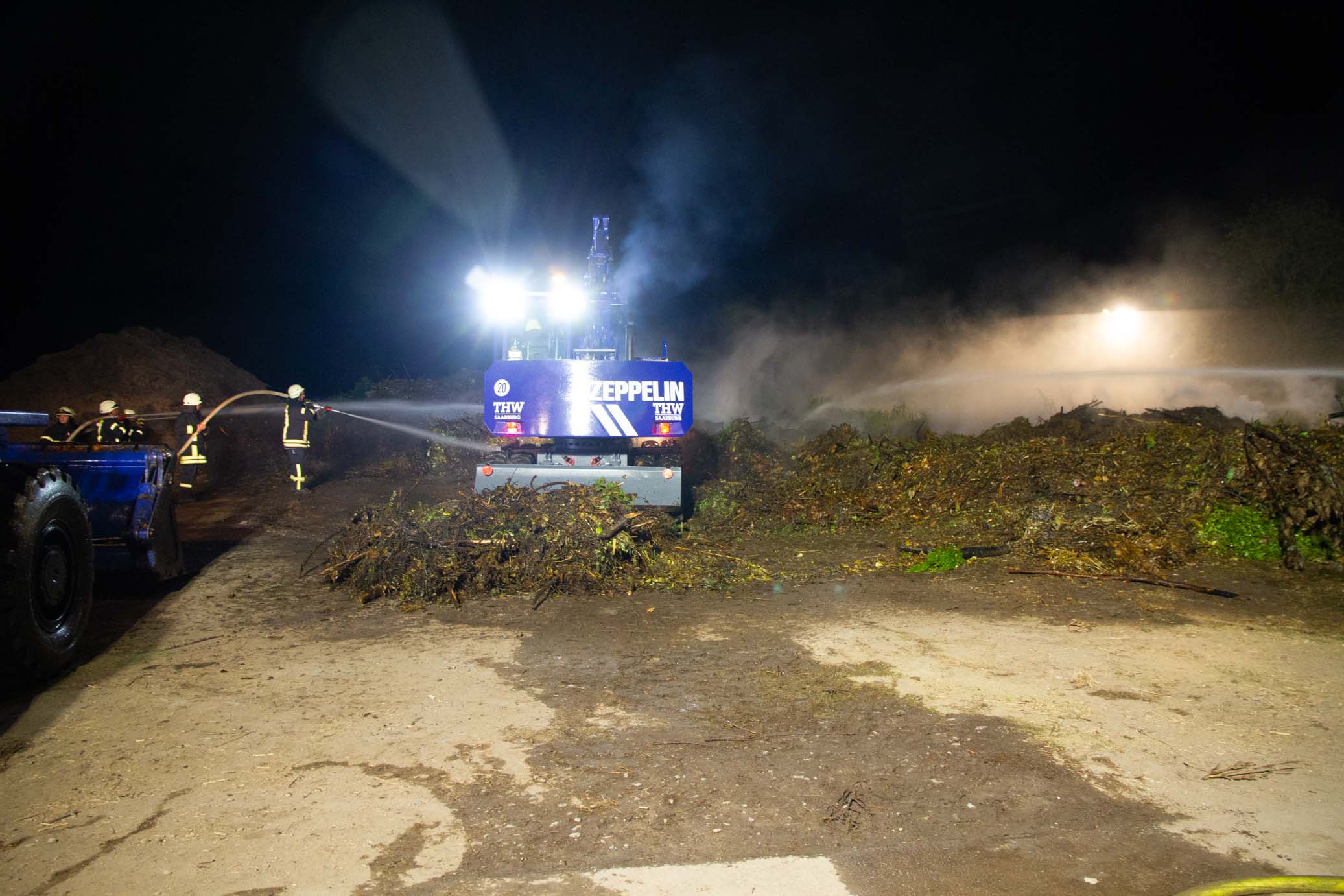 Zwischen 800 und 1000 Kubikmeter Grünschnitt brannten. Mit schwerem Gerät wurde der Grünschnitt auseinander gezogen und abgelöscht. Hier kamen ein Radlader und der Bagger des THW Ortsverbands Saarburg zum Einsatz.