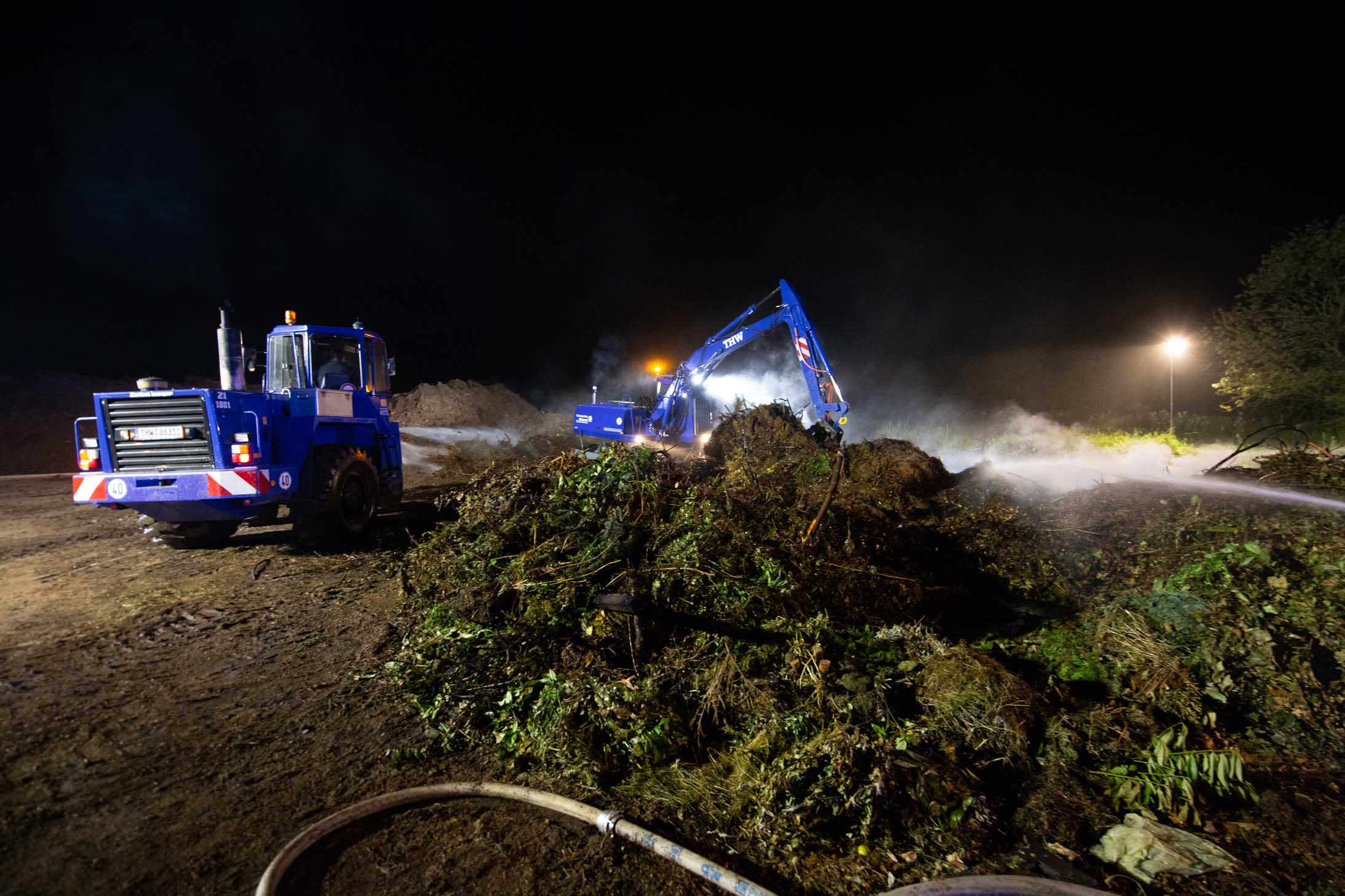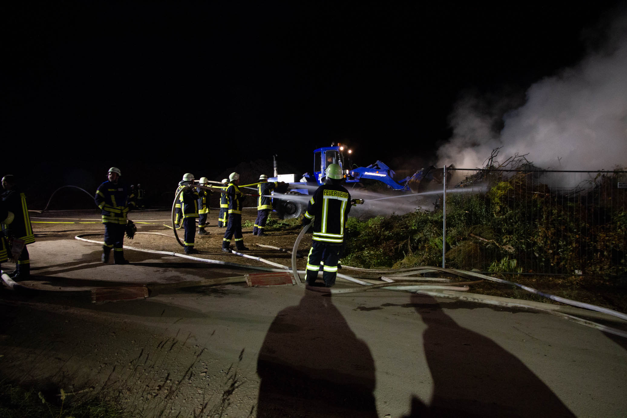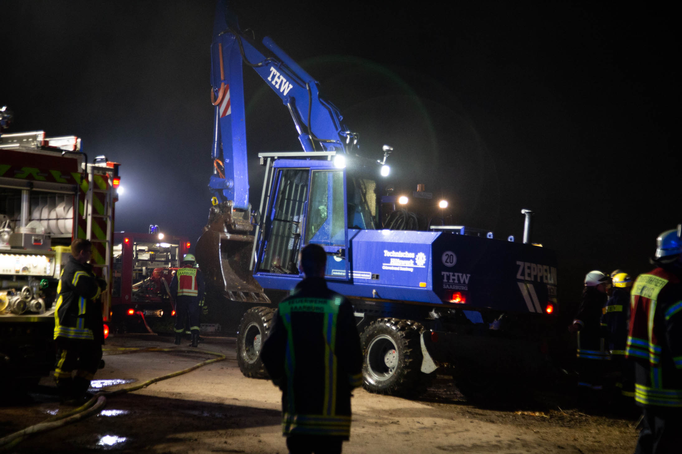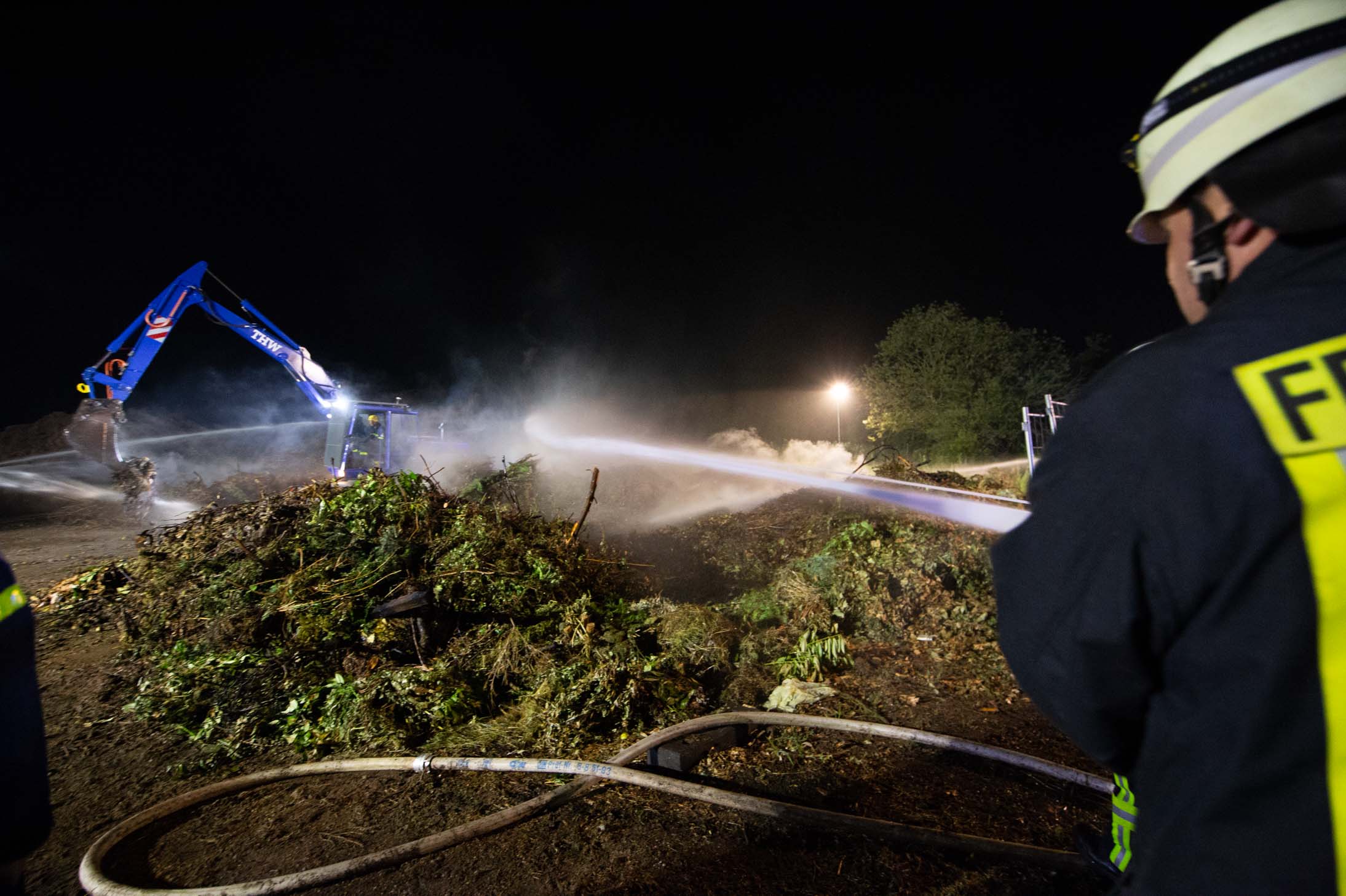 Zwischen 800 und 1000 Kubikmeter Grünschnitt brannten. Mit schwerem Gerät wurde der Grünschnitt auseinander gezogen und abgelöscht. Hier kamen ein Radlader und der Bagger des THW Ortsverbands Saarburg zum Einsatz.