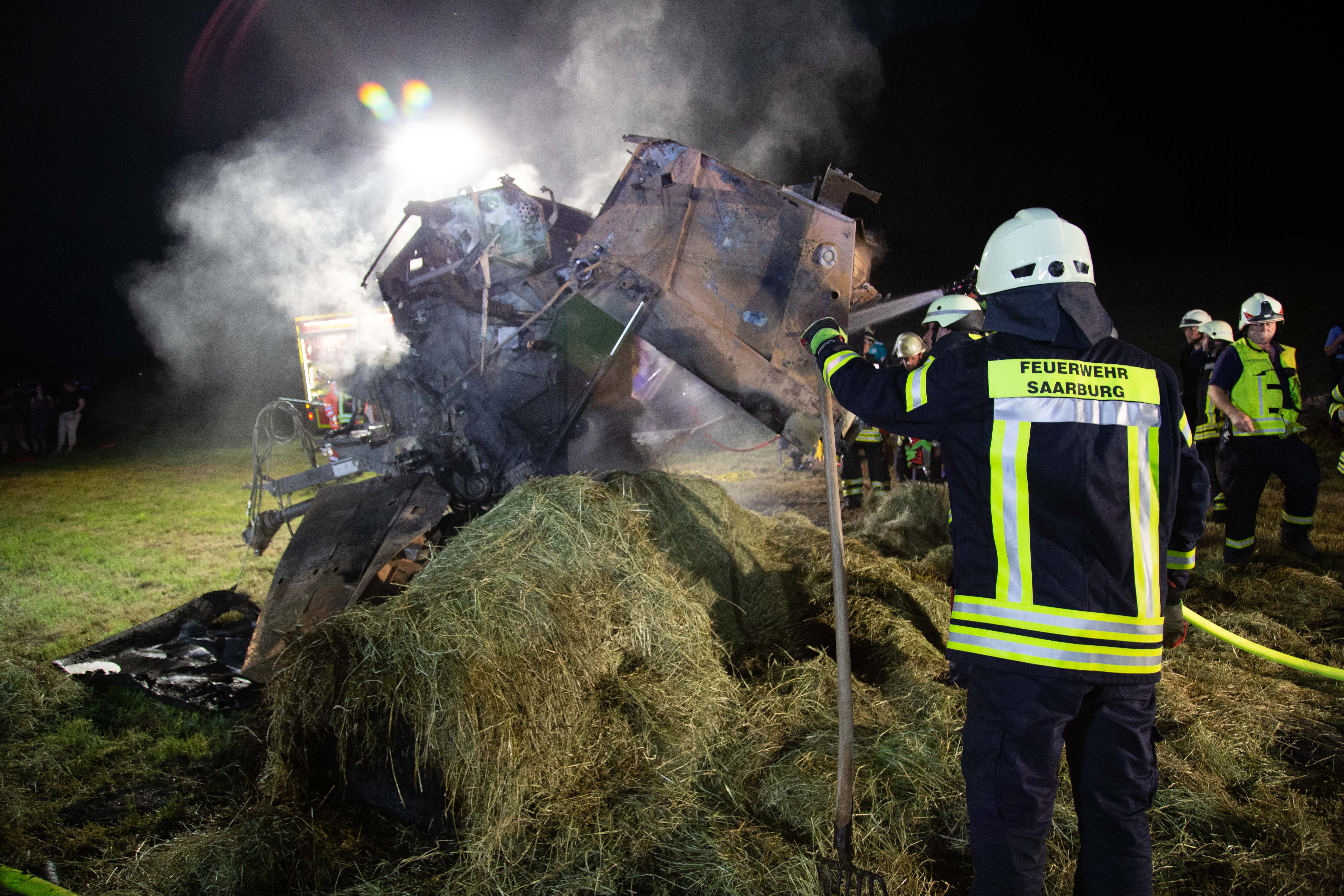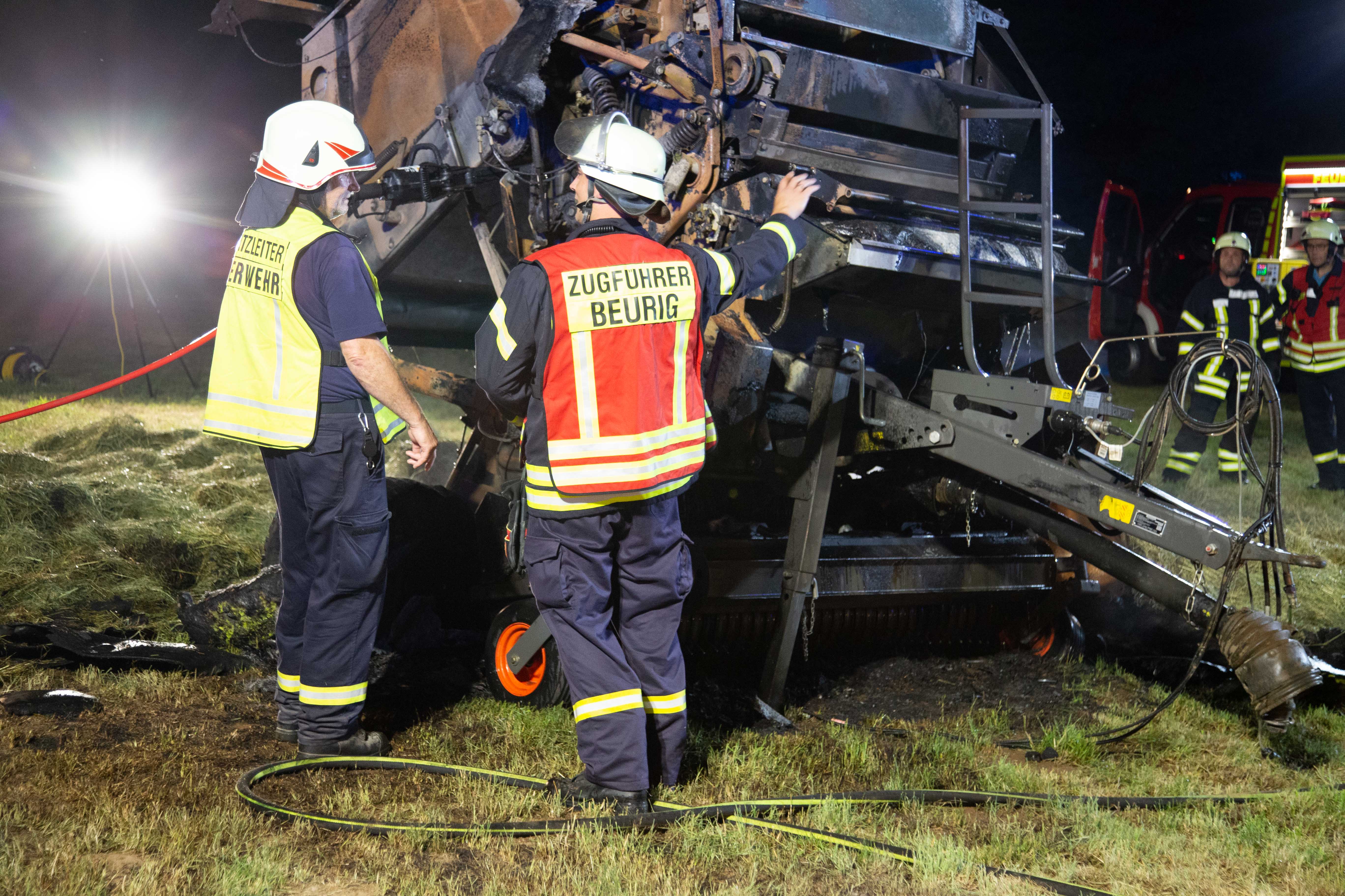 Trassem. Kurz nach 22 Uhr geriet auf einem Feld zwischen Trassem und Kirf eine Heuballenpresse in Brand. Der Fahrer des Gespann konnte seinen Traktor noch retten. Die Heuballenpresse brannte komplett aus. Es entstand ein Schaden von rund 30.000 €.