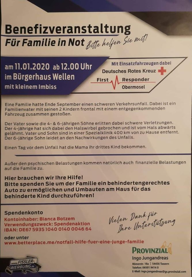 11.01.2020 ( ab 12 Uhr) Große Benefizveranstaltung (Familien in Not) im Bürgerhaus Wellen.