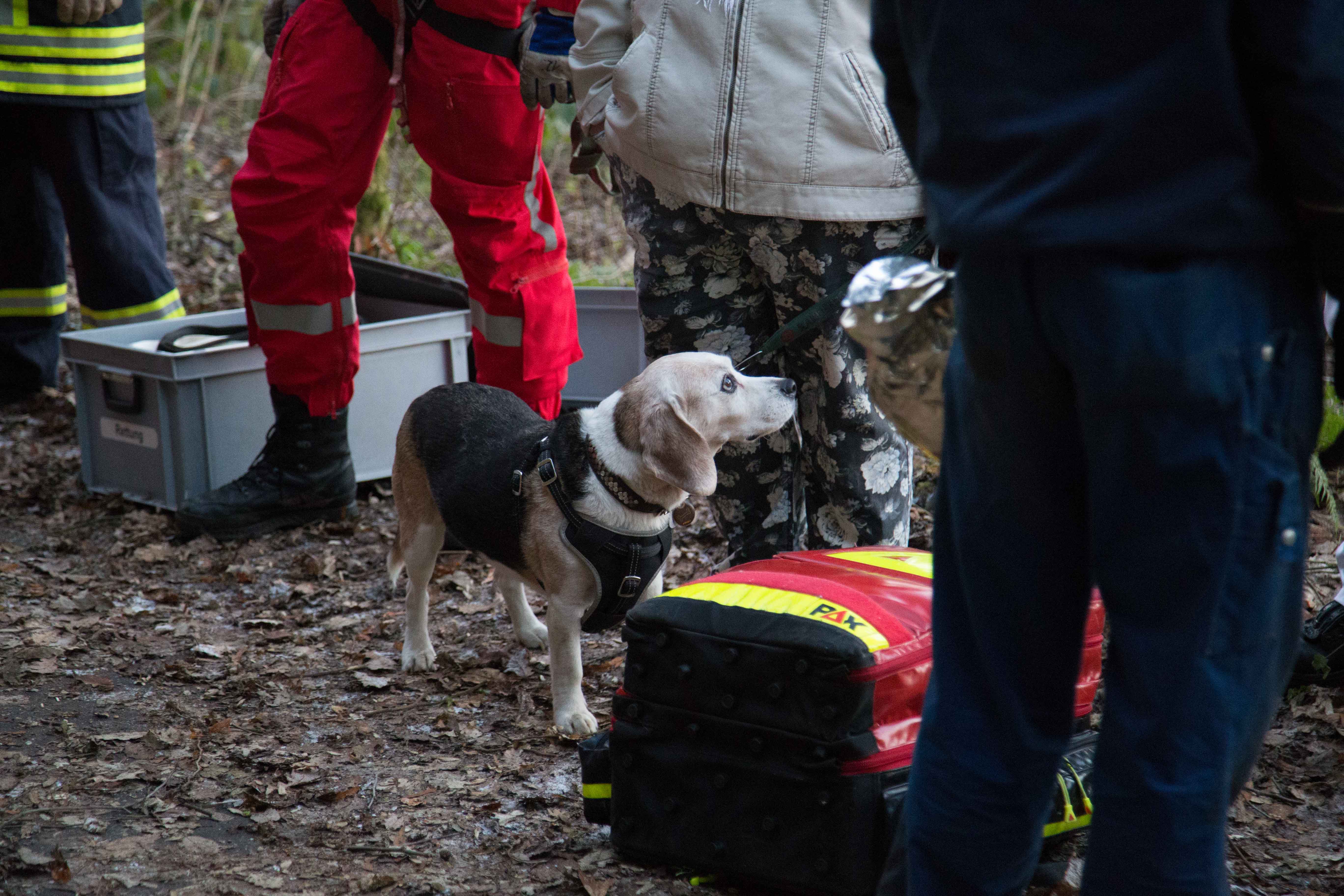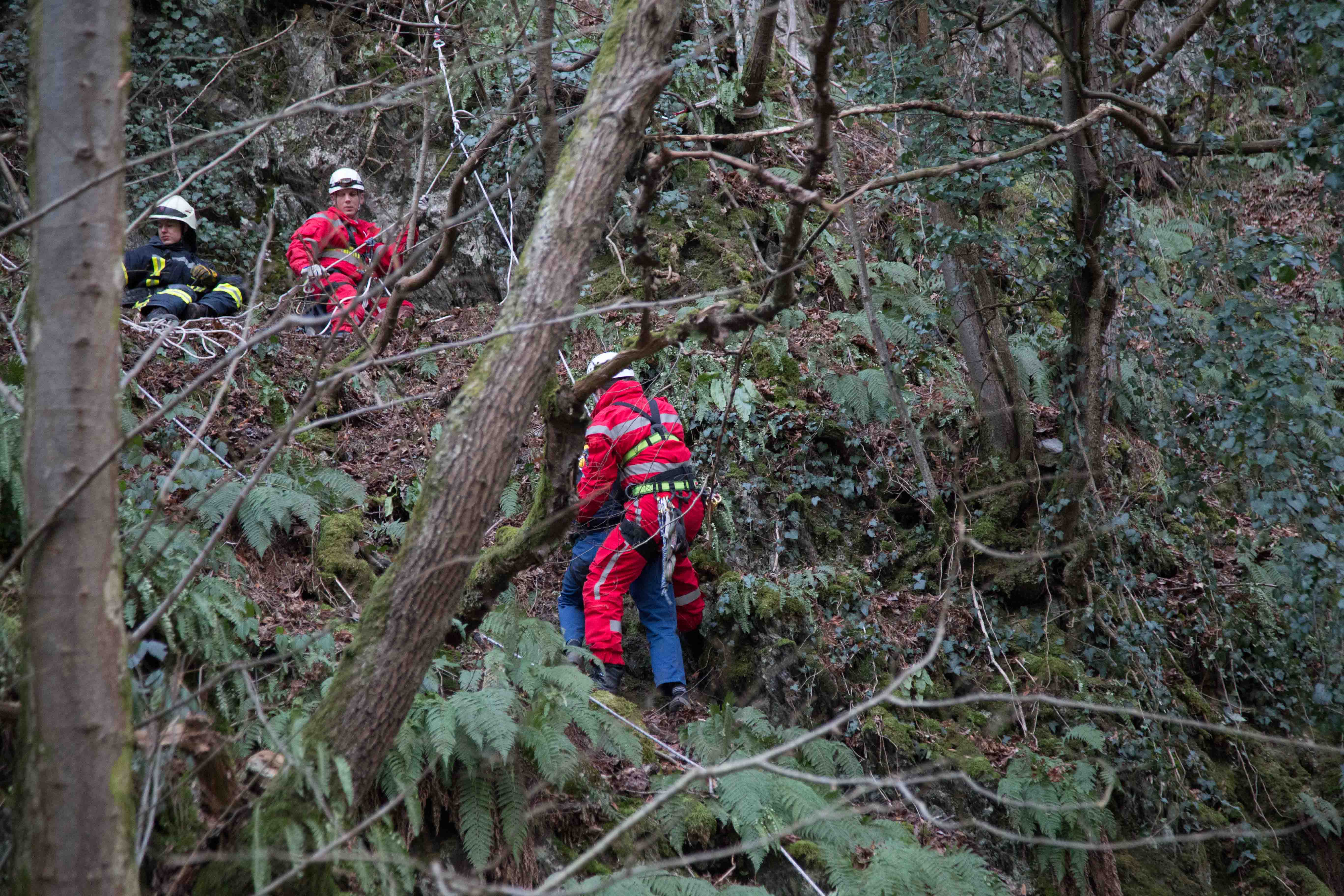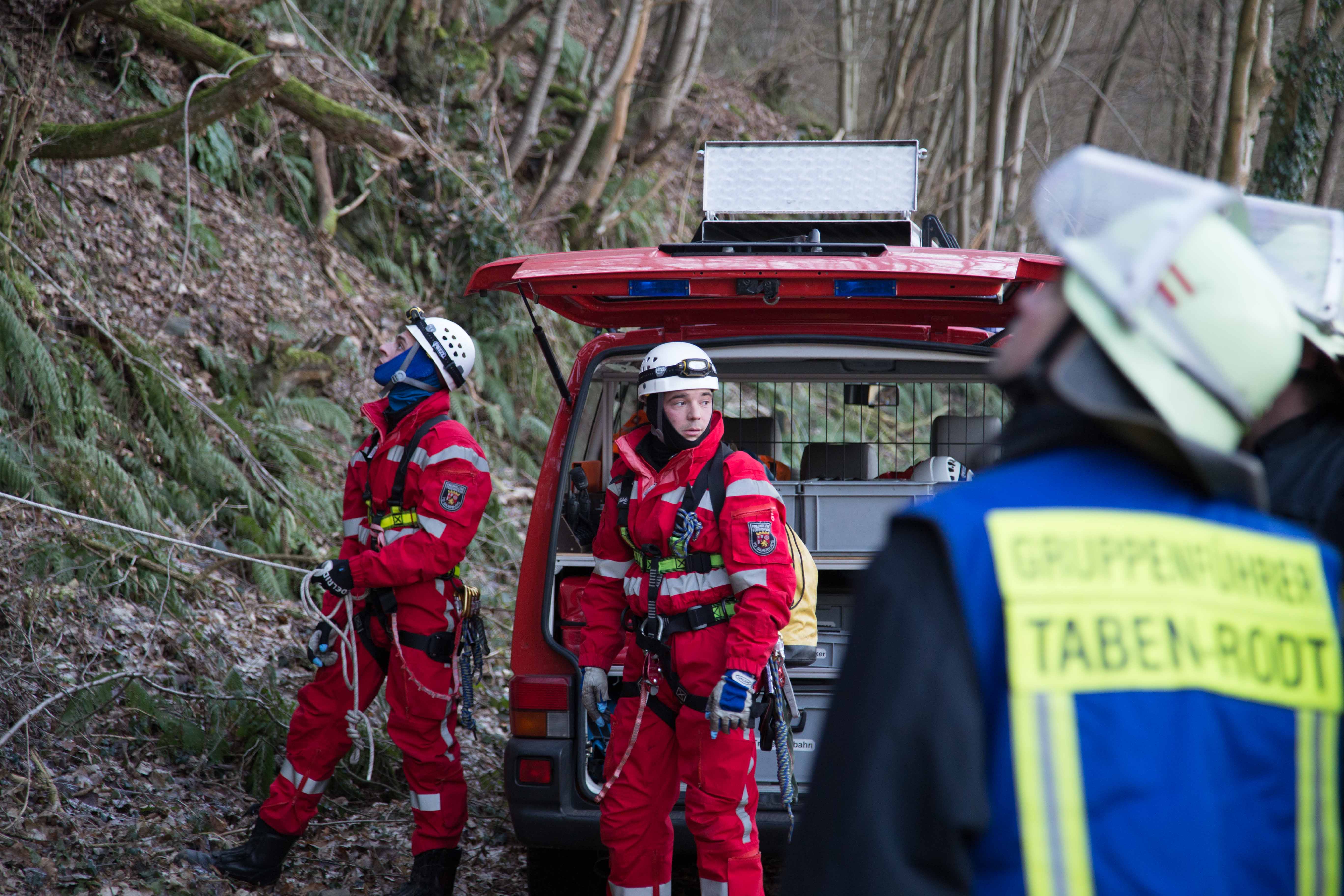 Der Beagle, ein instinktiver Jagdhund, war mit seinem Frauchen spazieren. Als er etwas witterte, lief er den Felshang hoch, kam allerdings nicht mehr runter. Aus Verzweiflung rief die Hundeführerin ihren Mann an. Dieser kam und wollte den Hund selbständig retten, dies misslang ihm aber , so das beide in der Felswand festhingen. Daraufhin wurde die Feuerwehr Taben-Rodt und die Höhenrettung der Feuerwehr Beurig alarmiert. Die Männer der Höhenretter haben nach Absprache mit dem Hundehalter zuerst den Hund abgeseilt und dann den Hundehalter. Beide blieben unverletzt,wurden allerdings kurz vom Rettungsdienst betreut, da sie bei minus zwei Grad leicht unterkühlt waren.