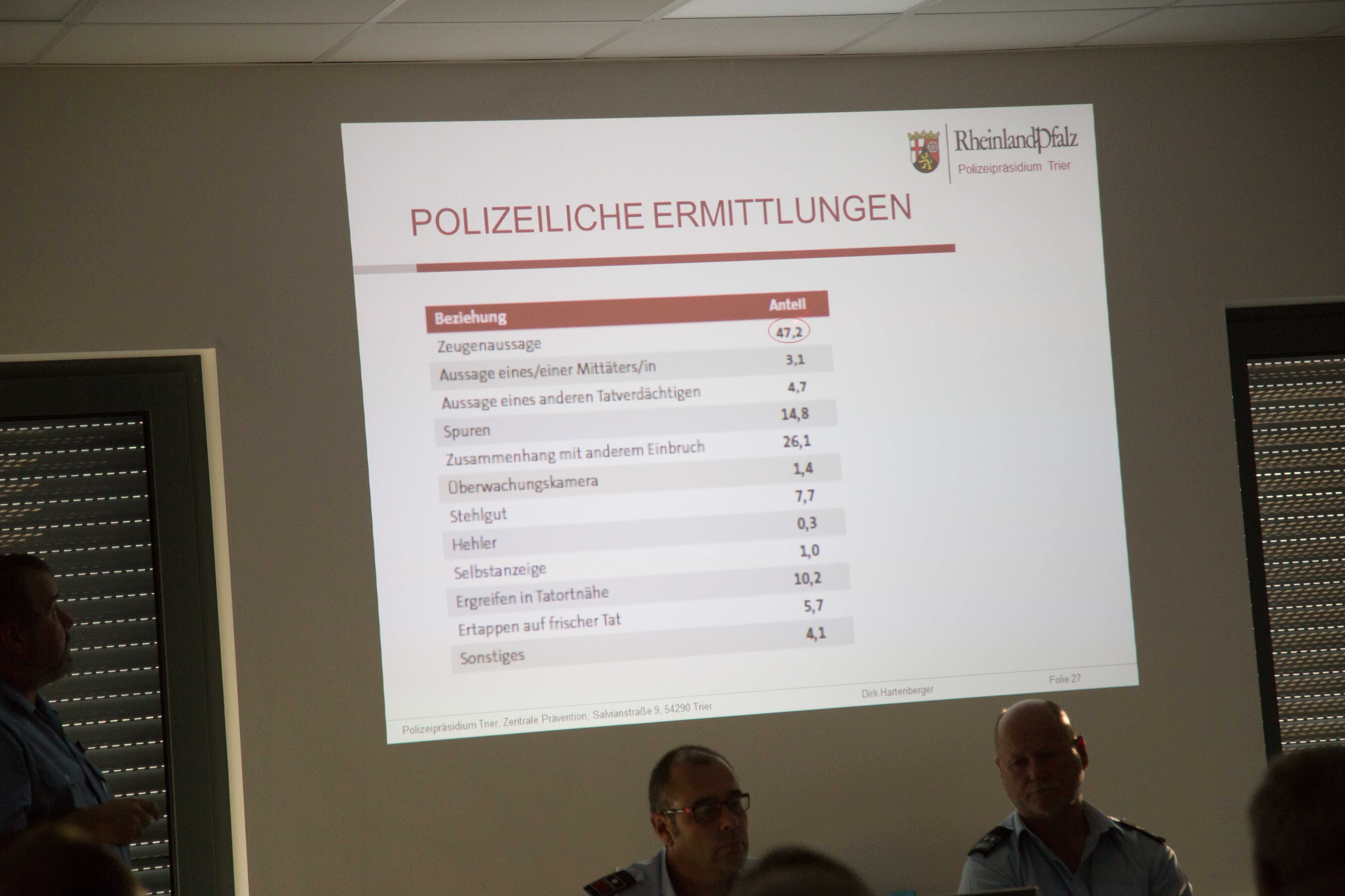 Harald Lahr, stellvertretender Leiter der Polizeiinspektion Saarburg, stellte zunächst detailliert die Kriminalitäts- und Unfallstatistik des vergangenen Jahres im Dienstbezirk der PI Saarburg vor. Er betonte, dass gerade die Hinweise aus der Bevölkerung, sowie direkte Meldung von Straftaten oft zum schnellen Ermittlungserfolg führen.