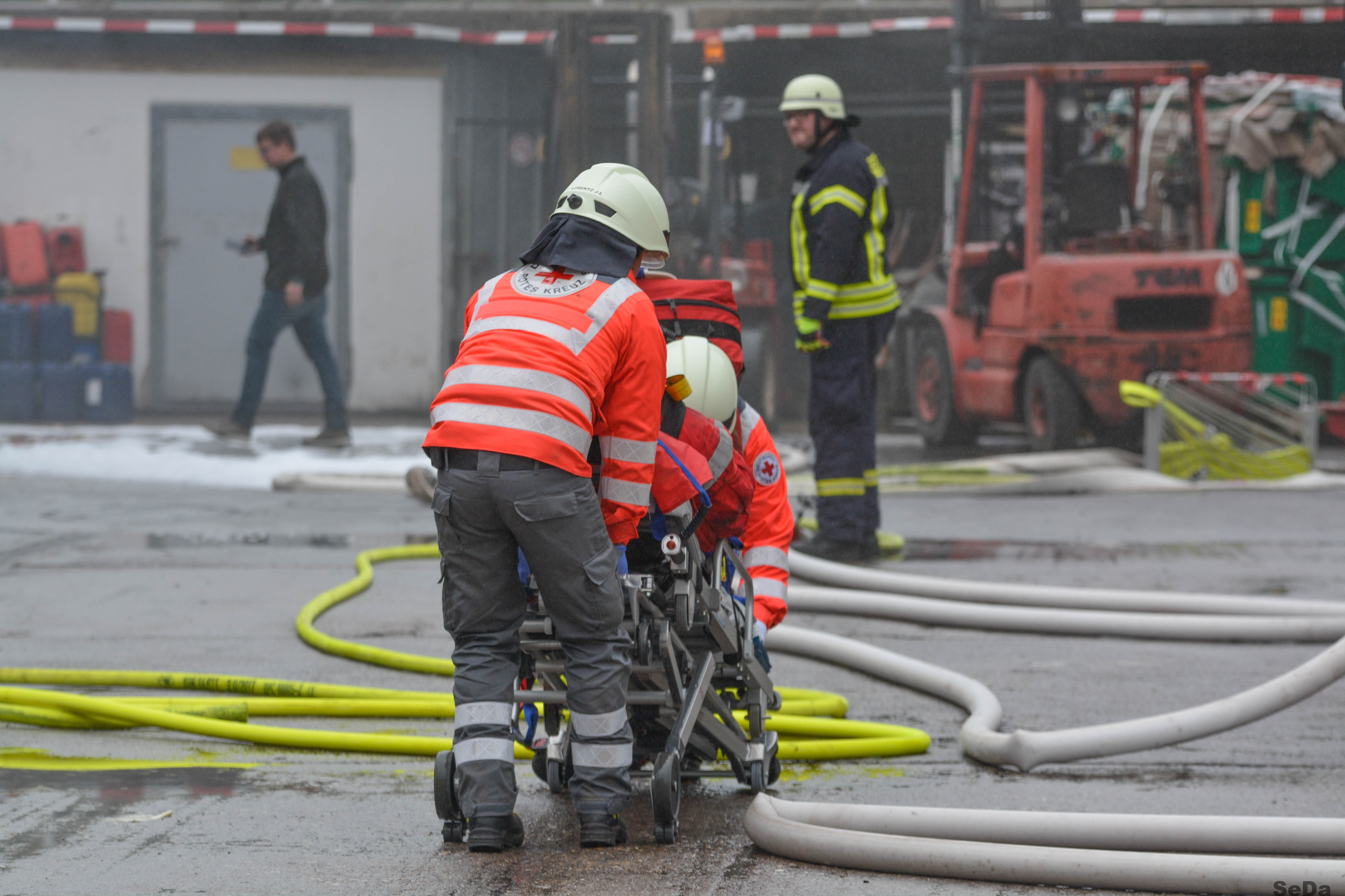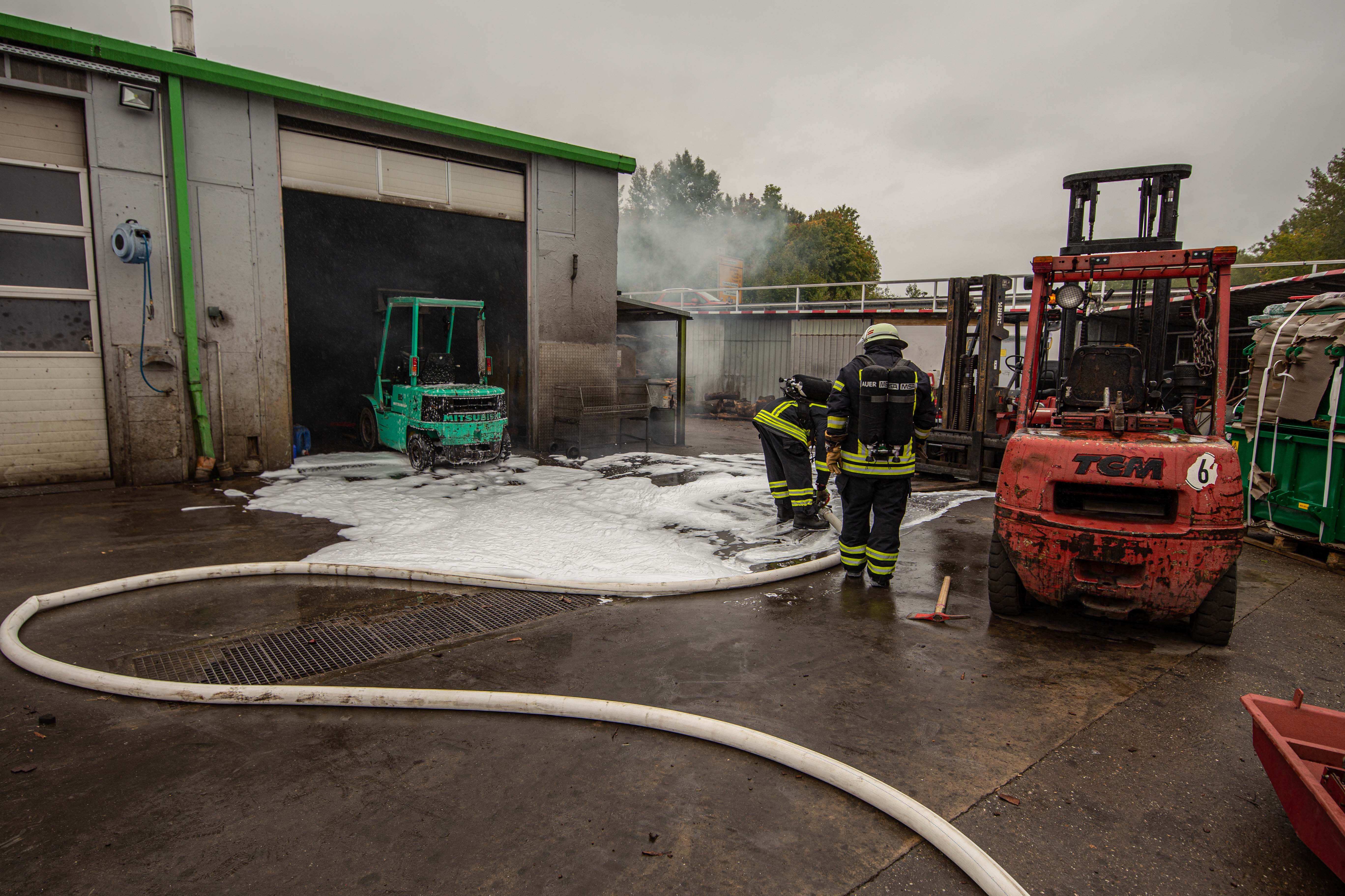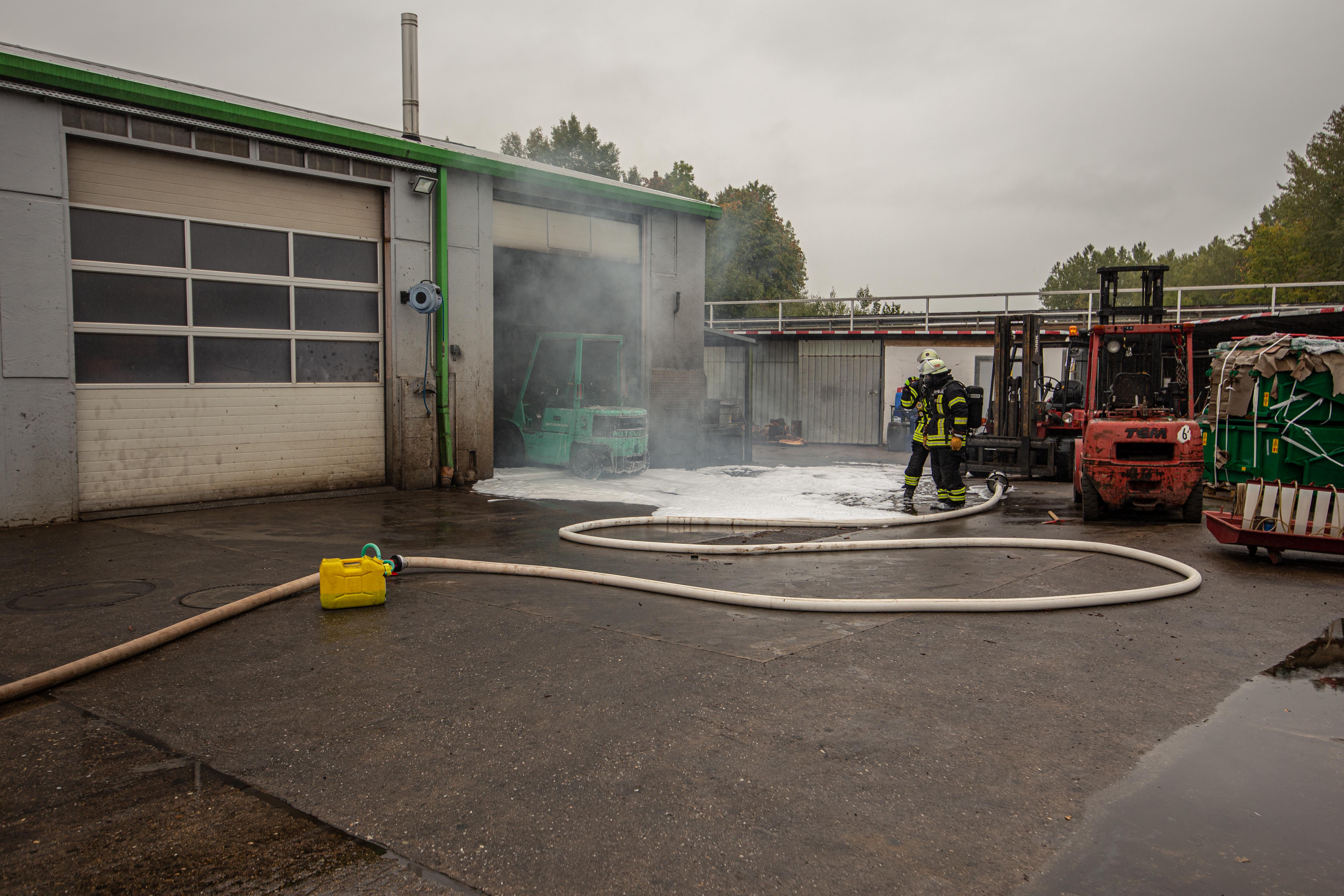 Ein Weiterer Trupp unter Atemschutz löschte den brennenden Gabelstapler und ging anschließend zur Brandbekämpfung in das Gebäude vor.