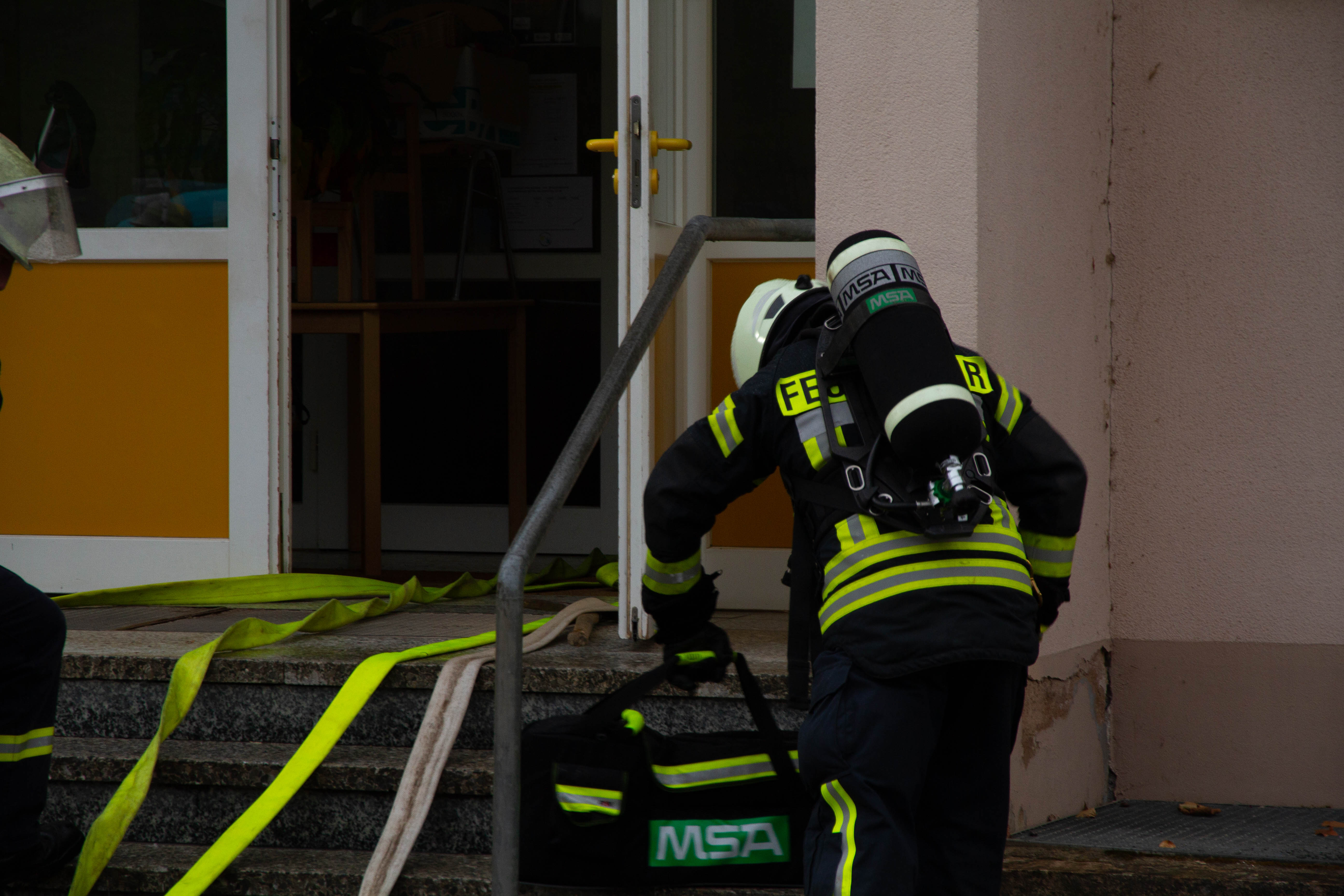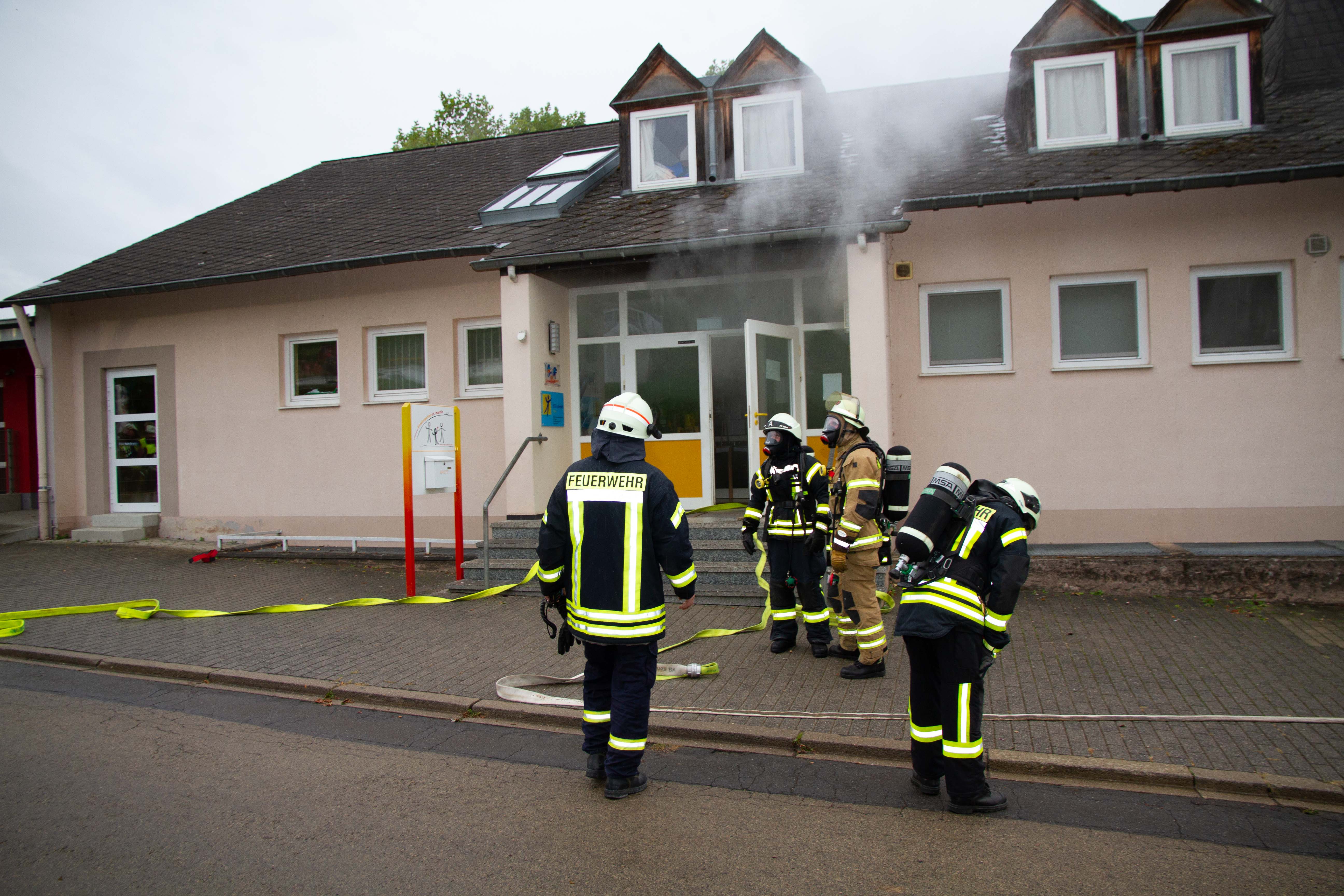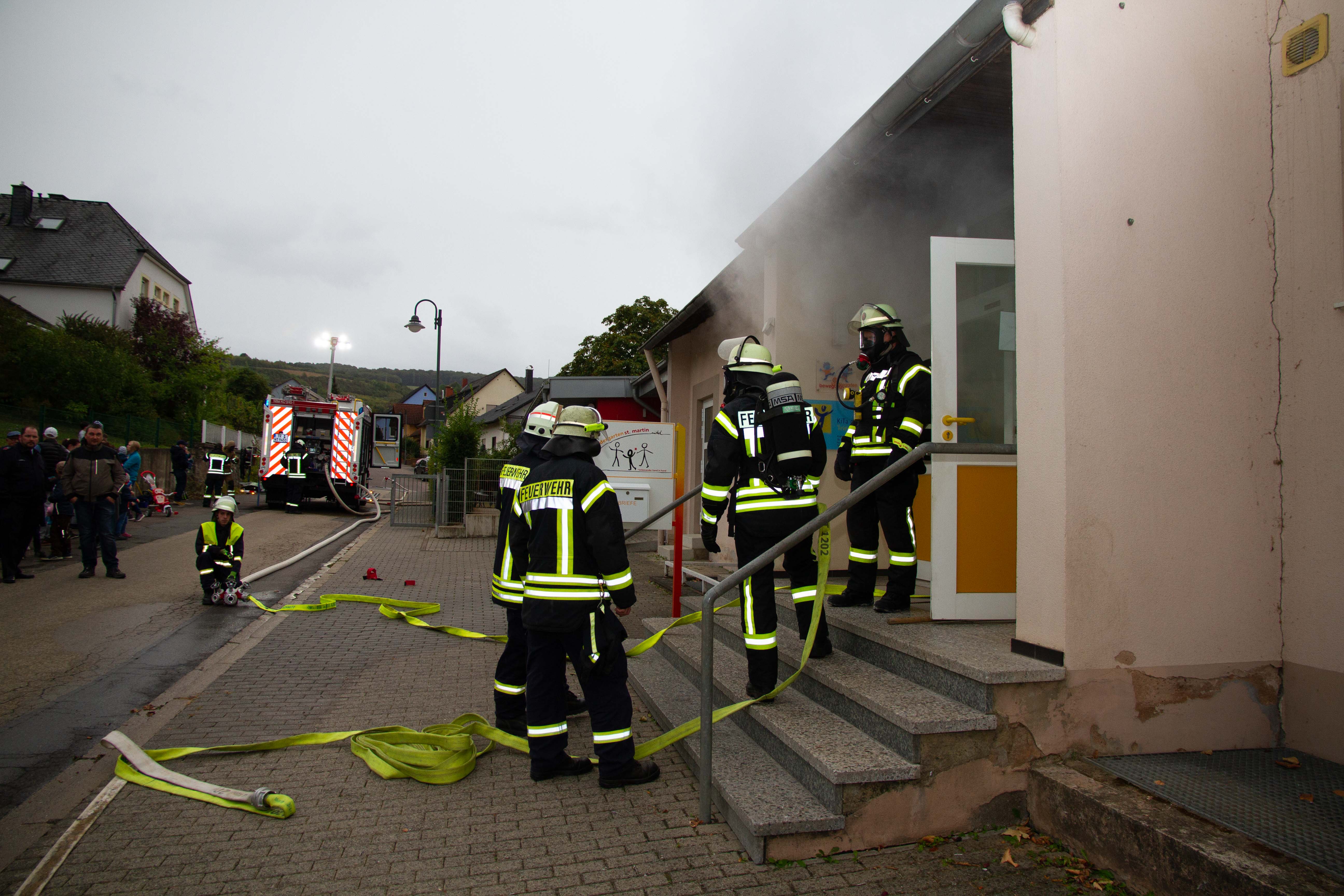 Beim öffnen der Eingangstür trat ein starker Rauch aus dem Gebäude. Nach Aufbau der Wasserversorgung begaben sich nach Ersterkundung die AGT Träger in das Gebäude. Über eine Steckleiter wurden zwei Kinder aus dem ersten Stock gerettet, während die anderen Kinder über den Haupteingang gerettet wurden.