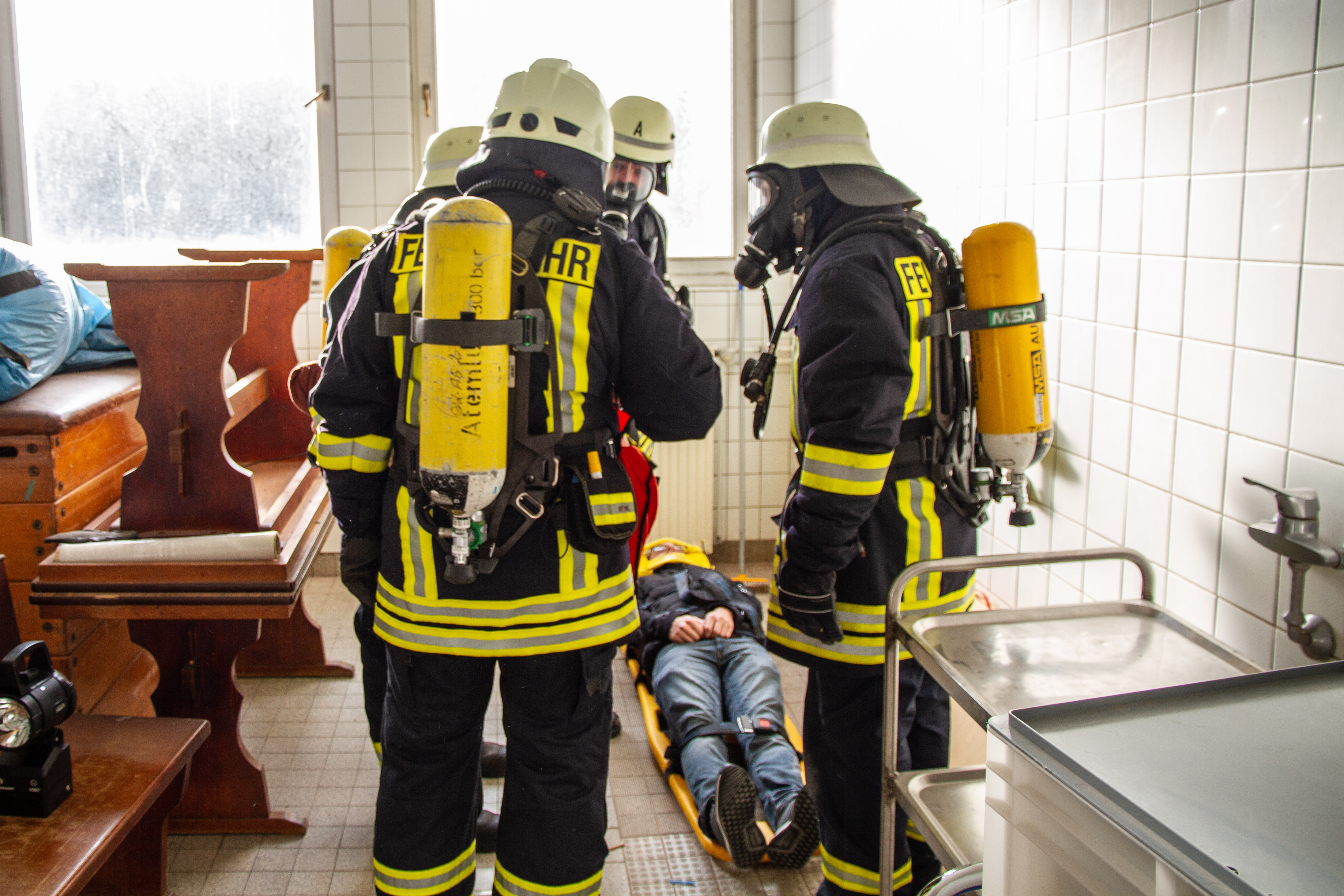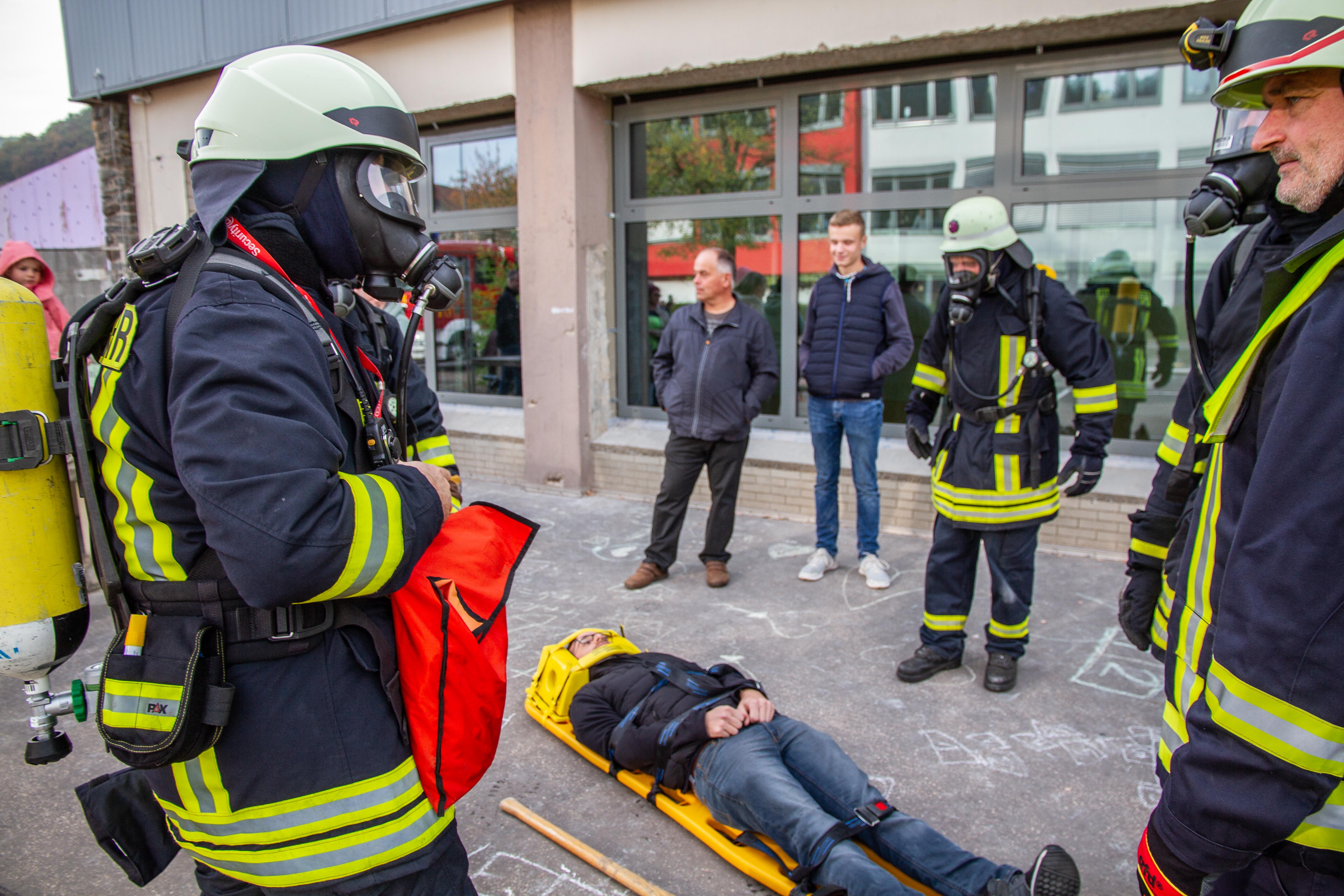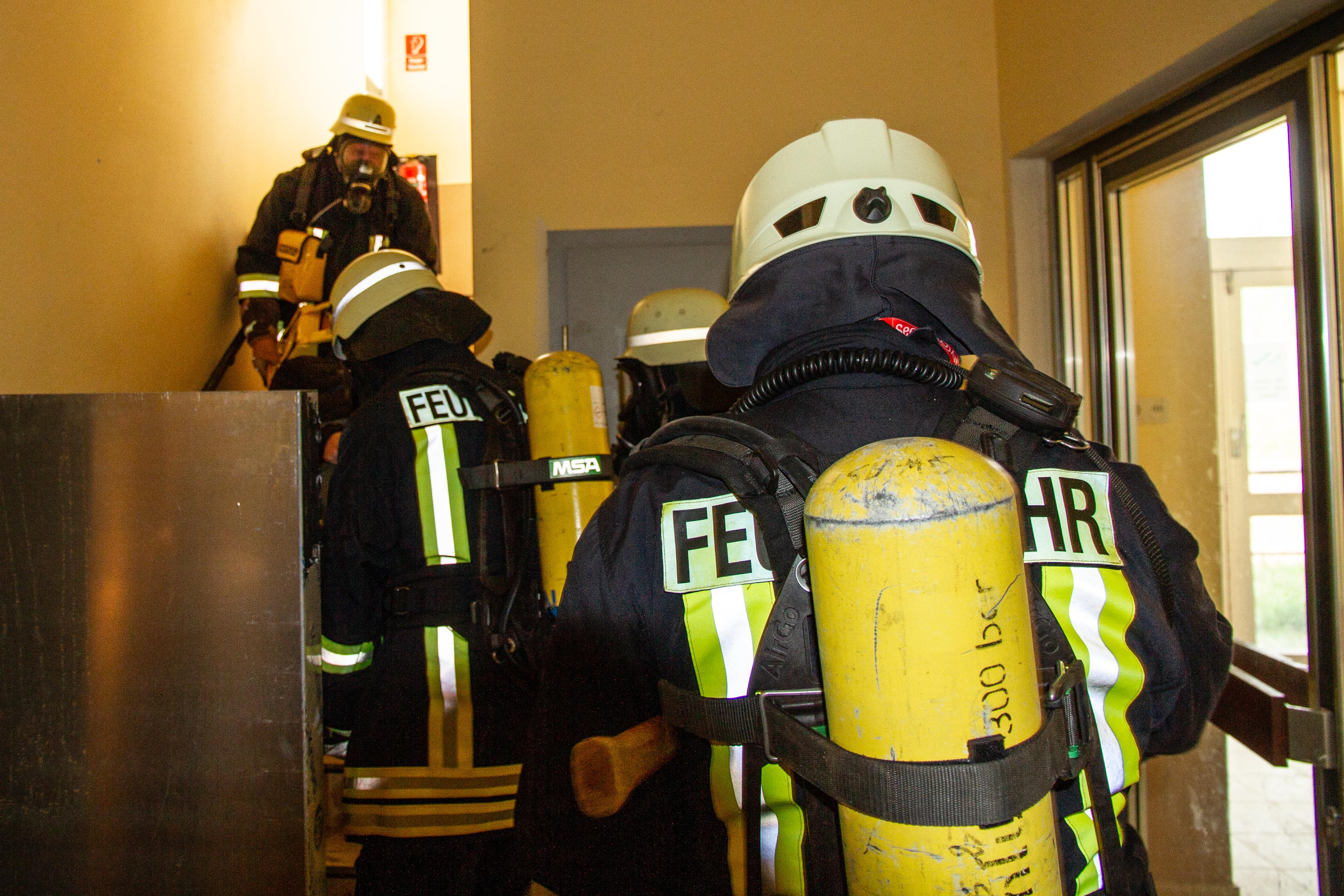 Das Übungsszenario begann zunächst mit dem Aufbau der Wasserversorgung und Brandbekämpfung in Seitentrakt des Gebäudekomplex. Drei Personen wurden im Bereich der im Umbau befindlichen Turnhalle als vermisst gemeldet. Ein Trupp von vier Atemschutzgeräteträger begann mit der Suche der Vermissten im Erdgeschoss des Gebäudes. Hier konnten zwei Personen im Treppenbereich unmittelbar gerettet werden. Weiterhin wurde ein Bauarbeiter im hinteren Bereich gefunden werden. Die Rettung mit einer Schleifkorbtrage gestaltete sich etwas schwieriger. Ein zusätzlicher Notruf erreichte über Funk die Einsatzkräfte, das bei einen Feuerwehrkamerad im Untergeschoss des Gebäudes der akustischer Warnmelder bei Bewegungslosigkeit ausgelöst wurde. Mittels eines Bergetuch wurde der Kamerad samt Atemschutzgerät über die schmalen Treppen ins Freie gebracht und gerettet werden.