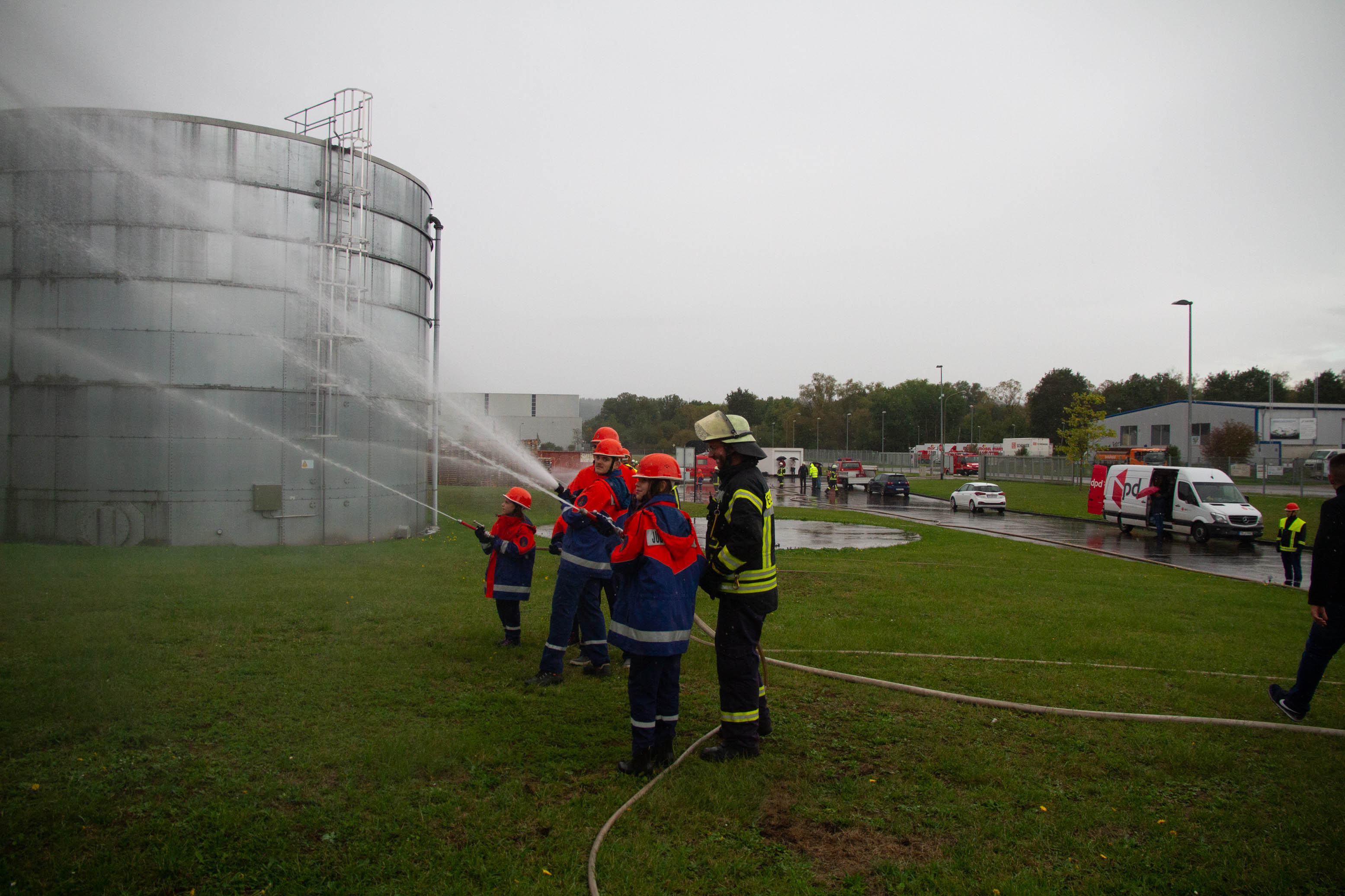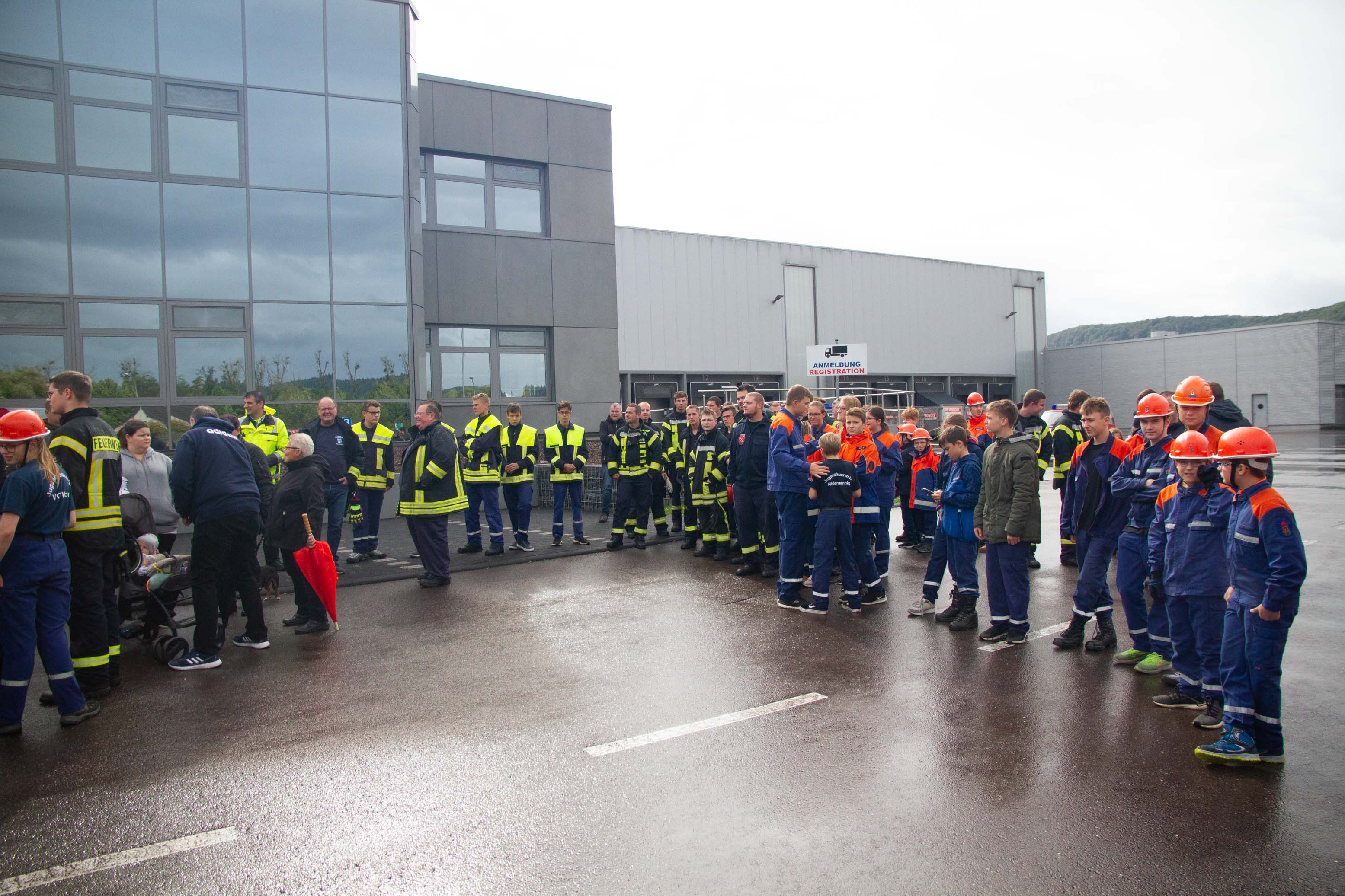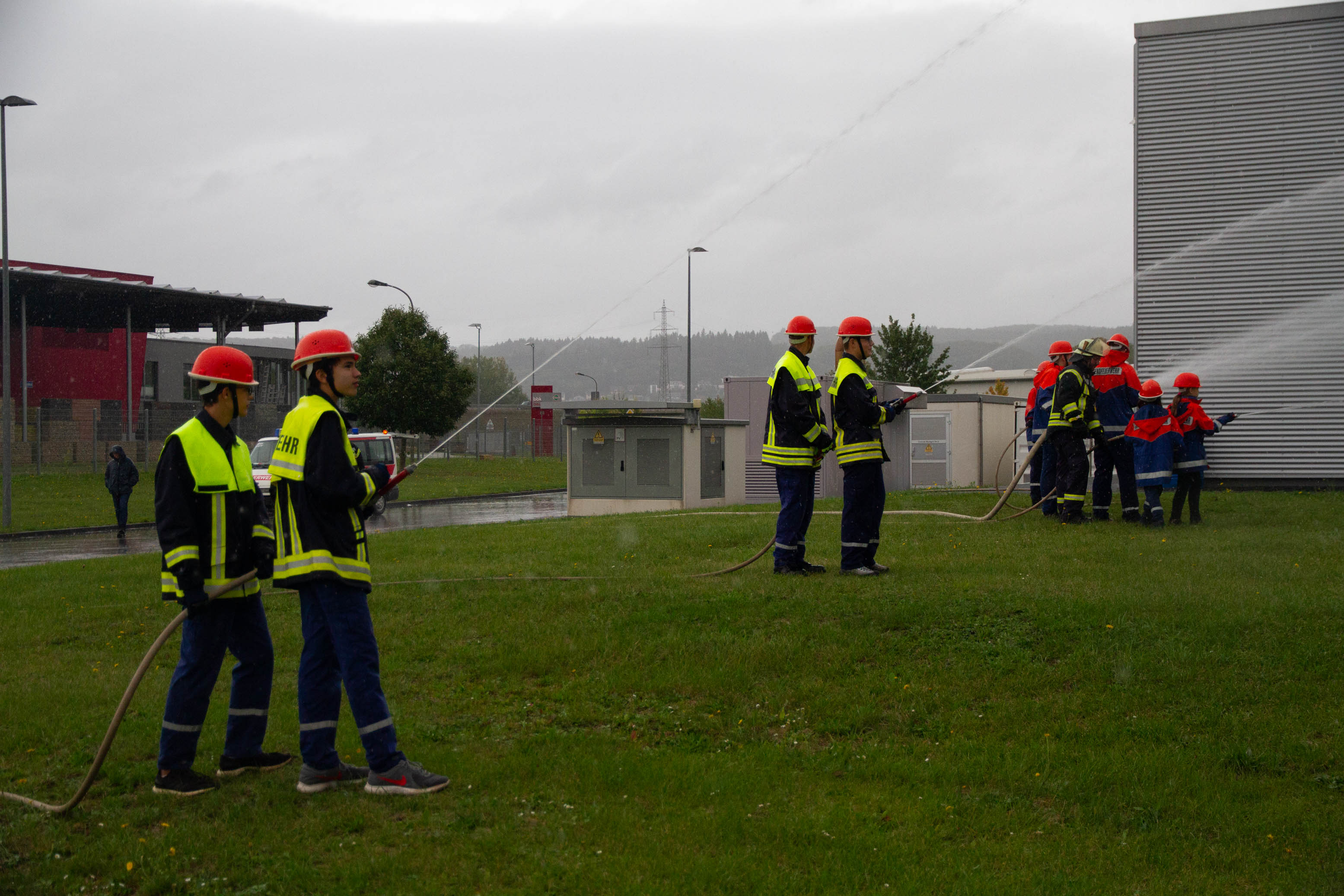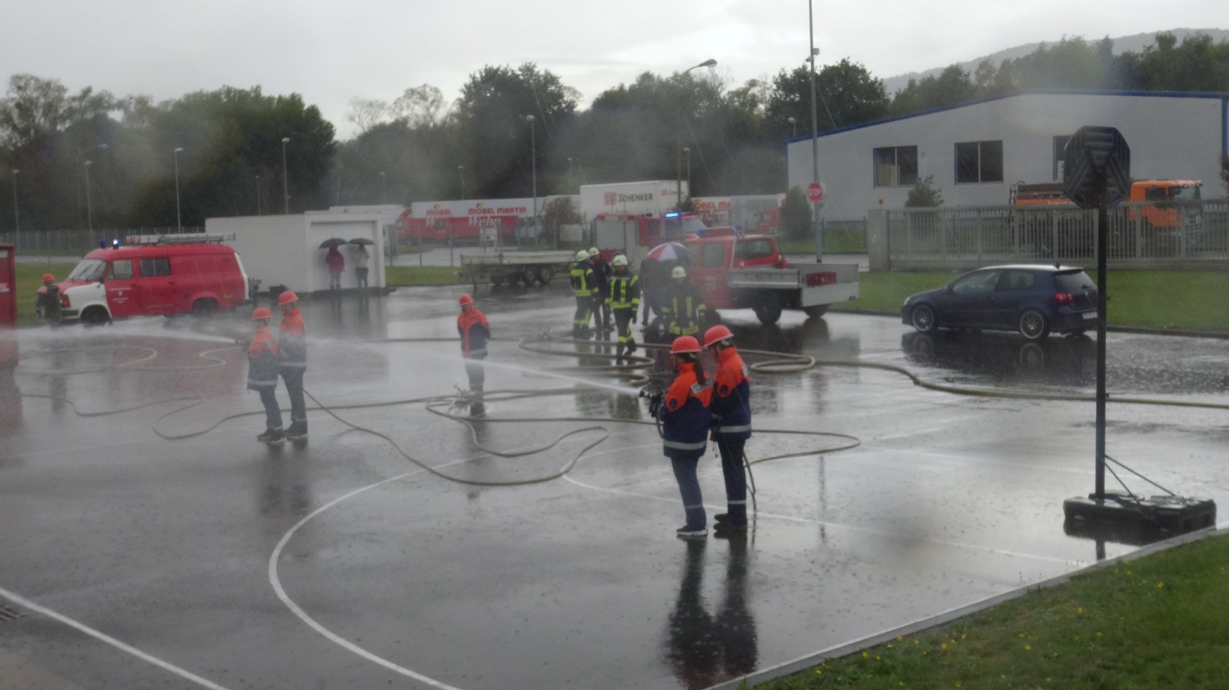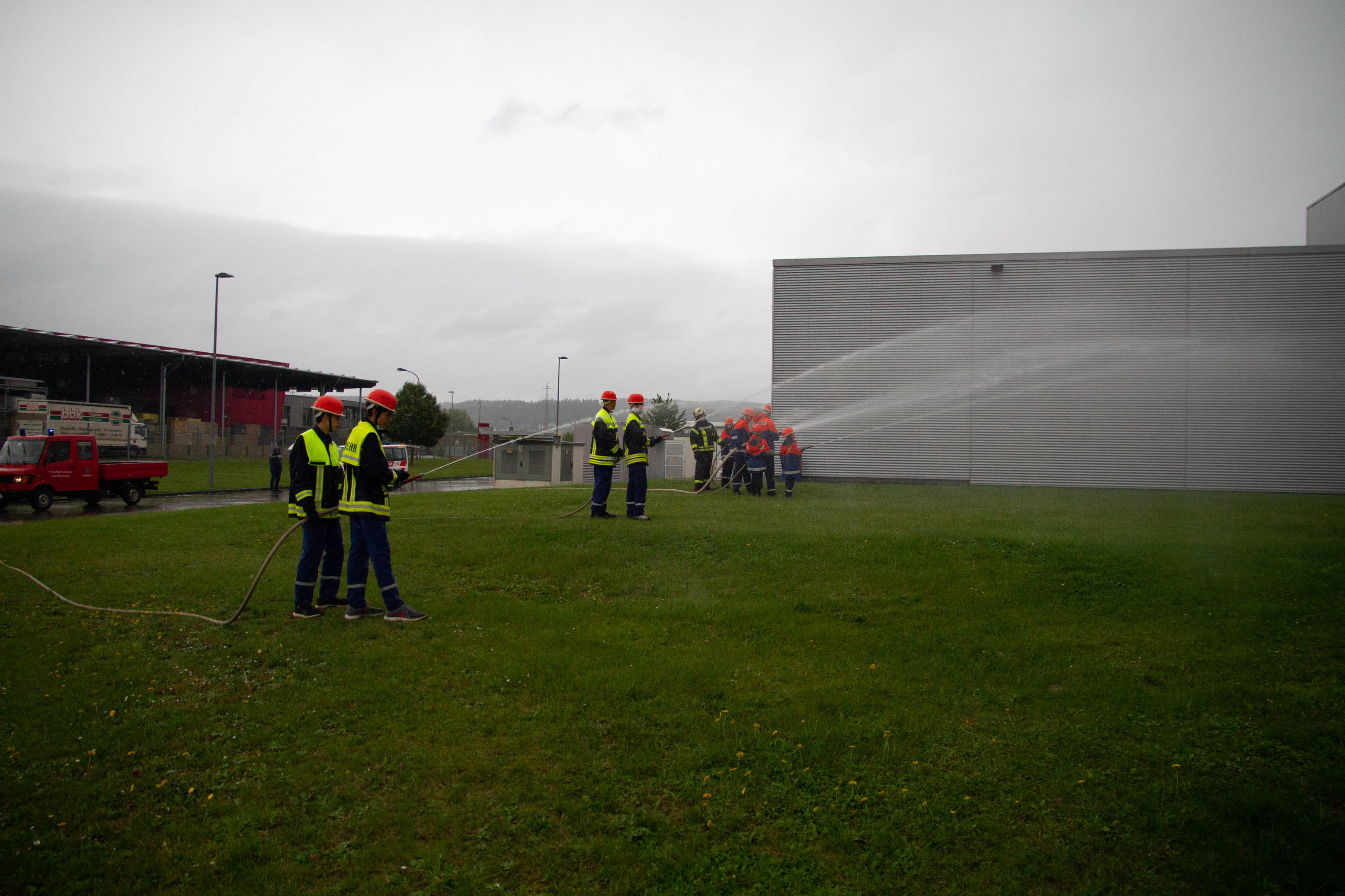 Als Übungsszenario stand das Gebäude in Vollbrand. Pünktlich um 14.00 Uhr trafen an die 14 Fahrzeuge mit Einsatzalarm am Haupteingang des Betriebsgeländes ein. Nach einem kurzen Stopp erfolgte die Zuordnung der Einheiten zum Aufbau der Wasserversorgung und zeitgleich der Angriff an verschieden Standorten rund um das große Gebäude und dies mit tatkräftiger Unterstützung der Betreuer und Jugendwarte. Zum gleichen Zeitpunkt öffnete der Himmel seine Pforten. Dies beeindruckte die circa 90 Jugendliche in keinster Weise, denn Wasser war reichlich vorhanden und die Jugendlichen hatten trotzdem viel Spaß. Die Übung lief sehr konzentriert und kameradschaftlich als Teamarbeit ab. Die circa 50 Betreuer waren sehr zufrieden was die Jugendlichen auch als Teamplayer an Eigenschaften zeigten.