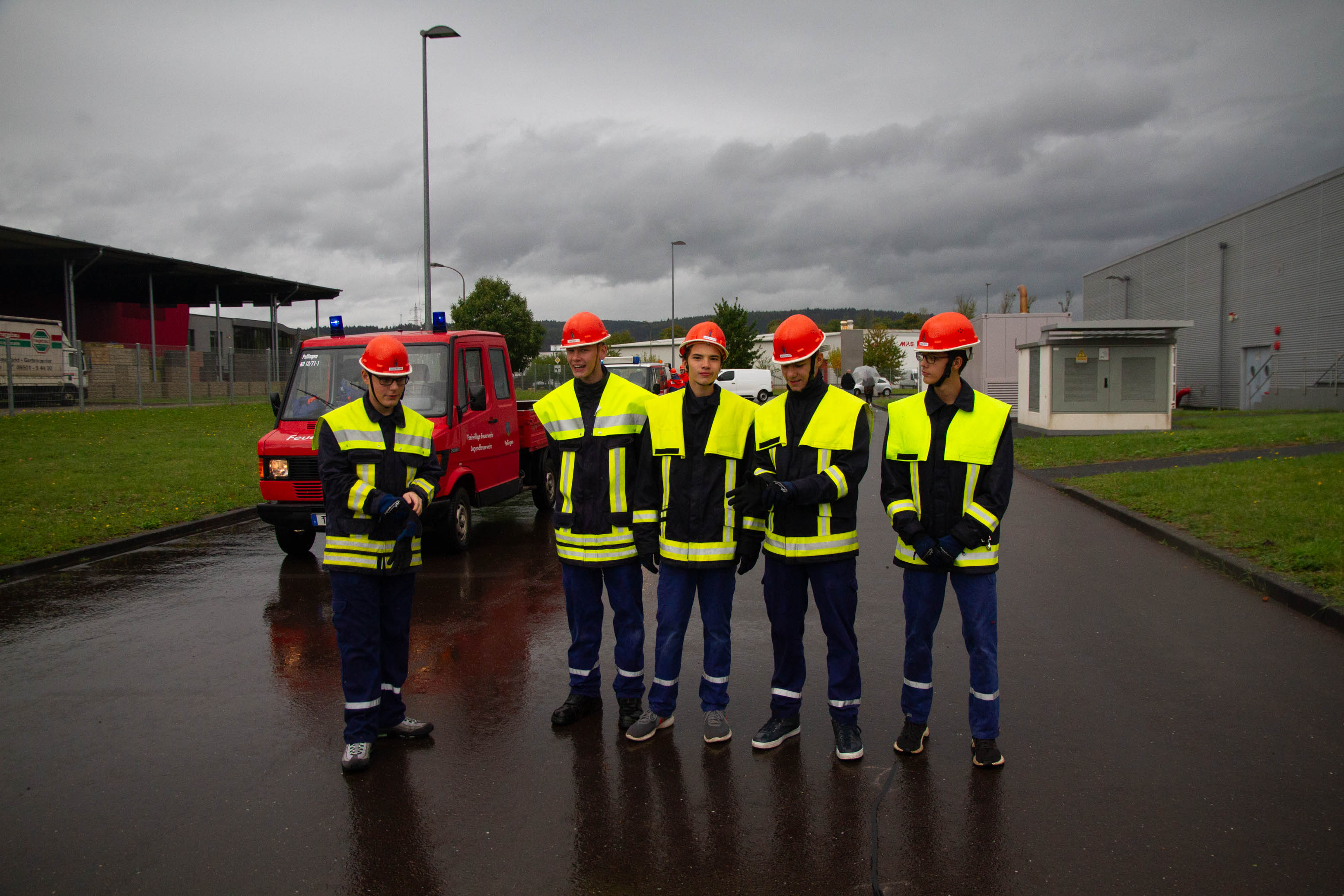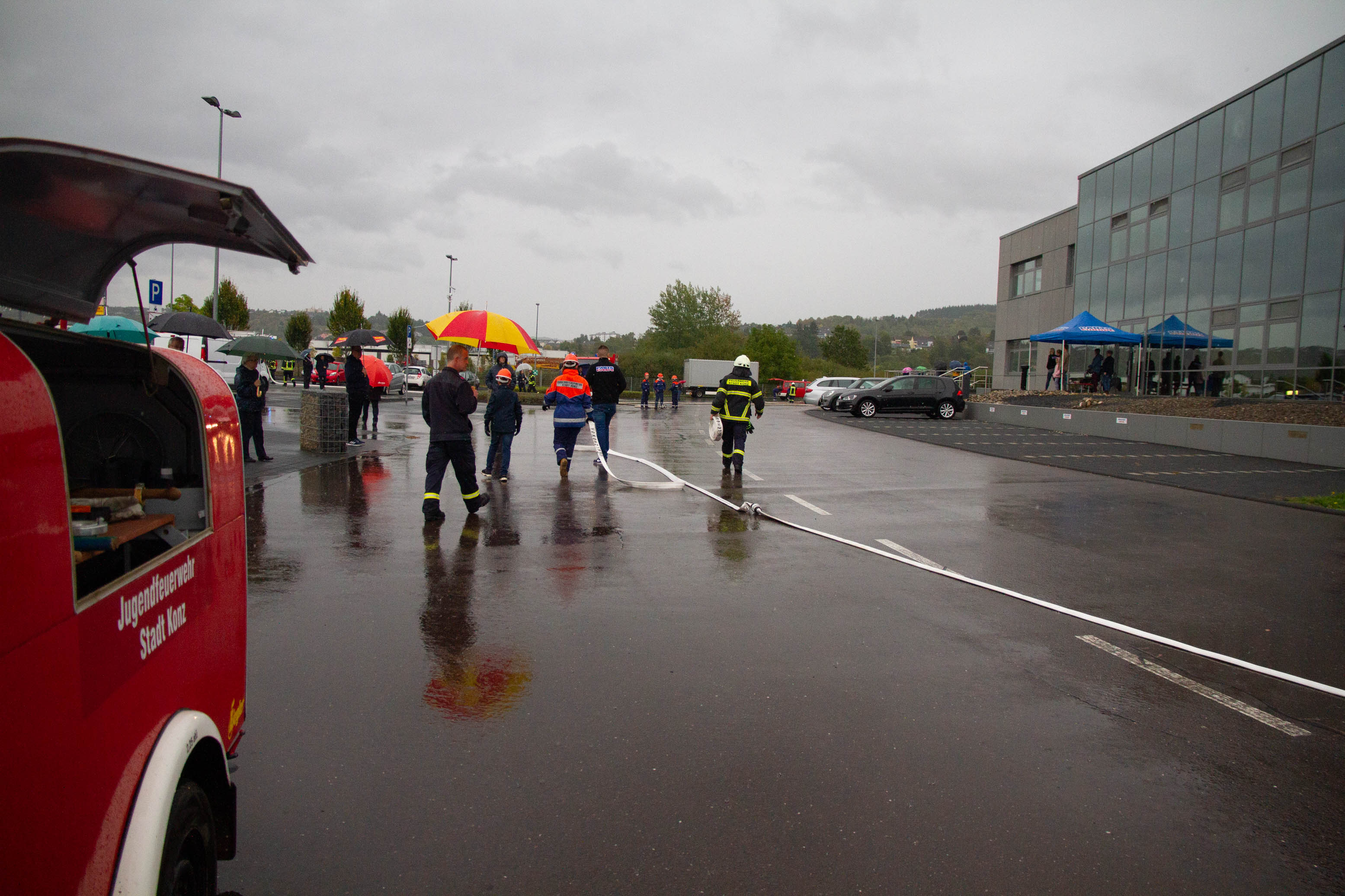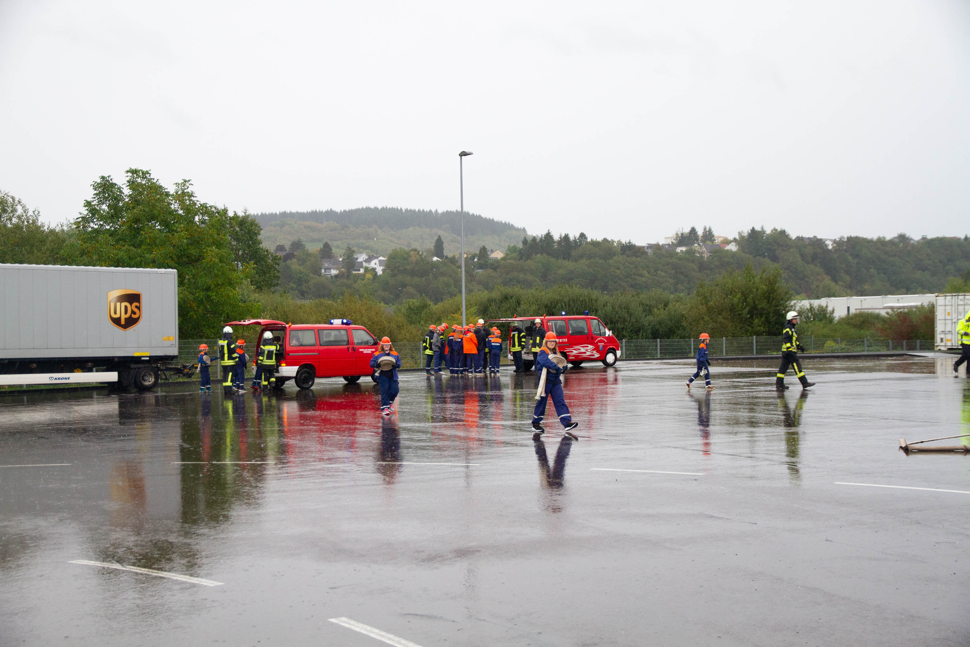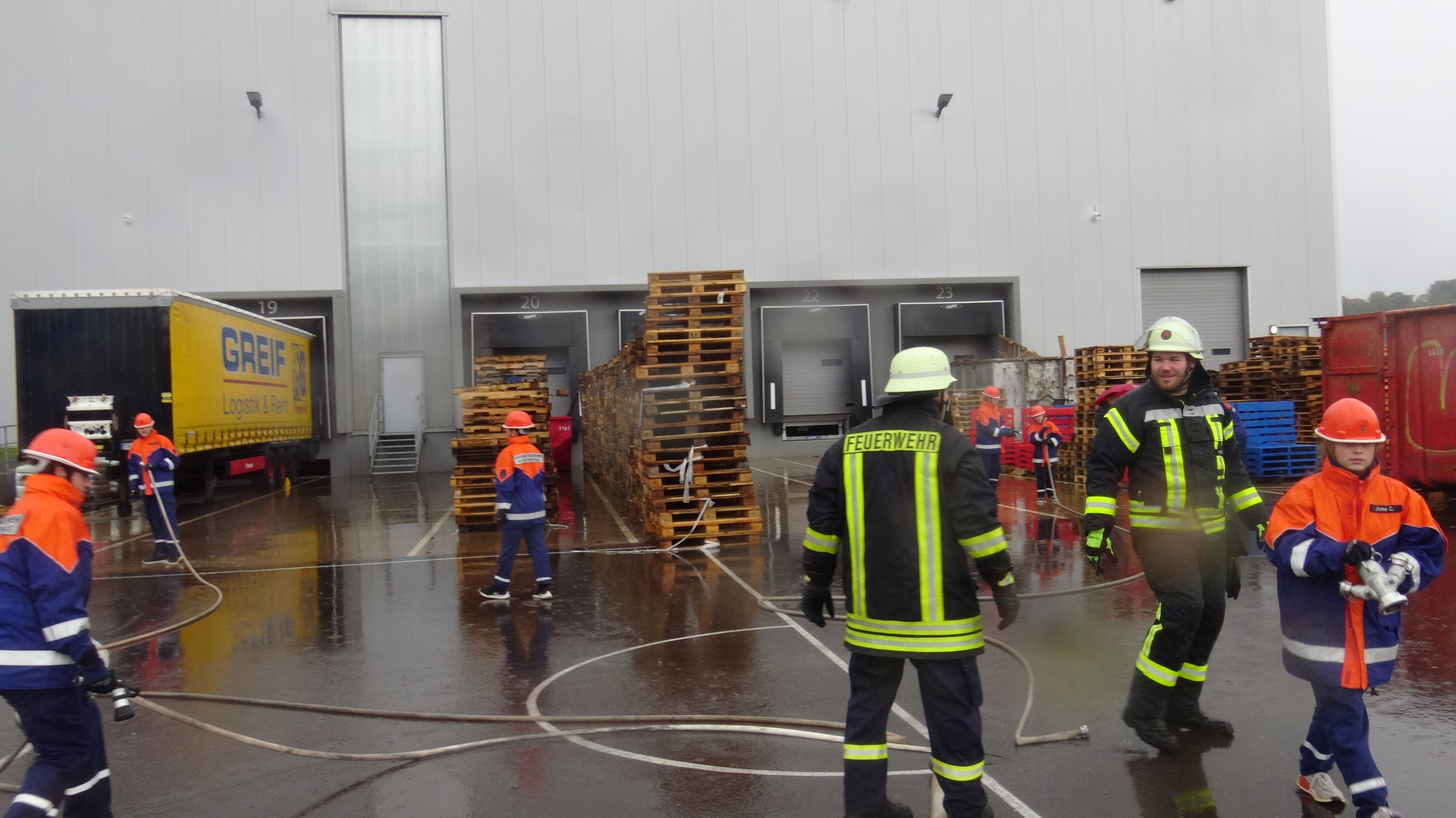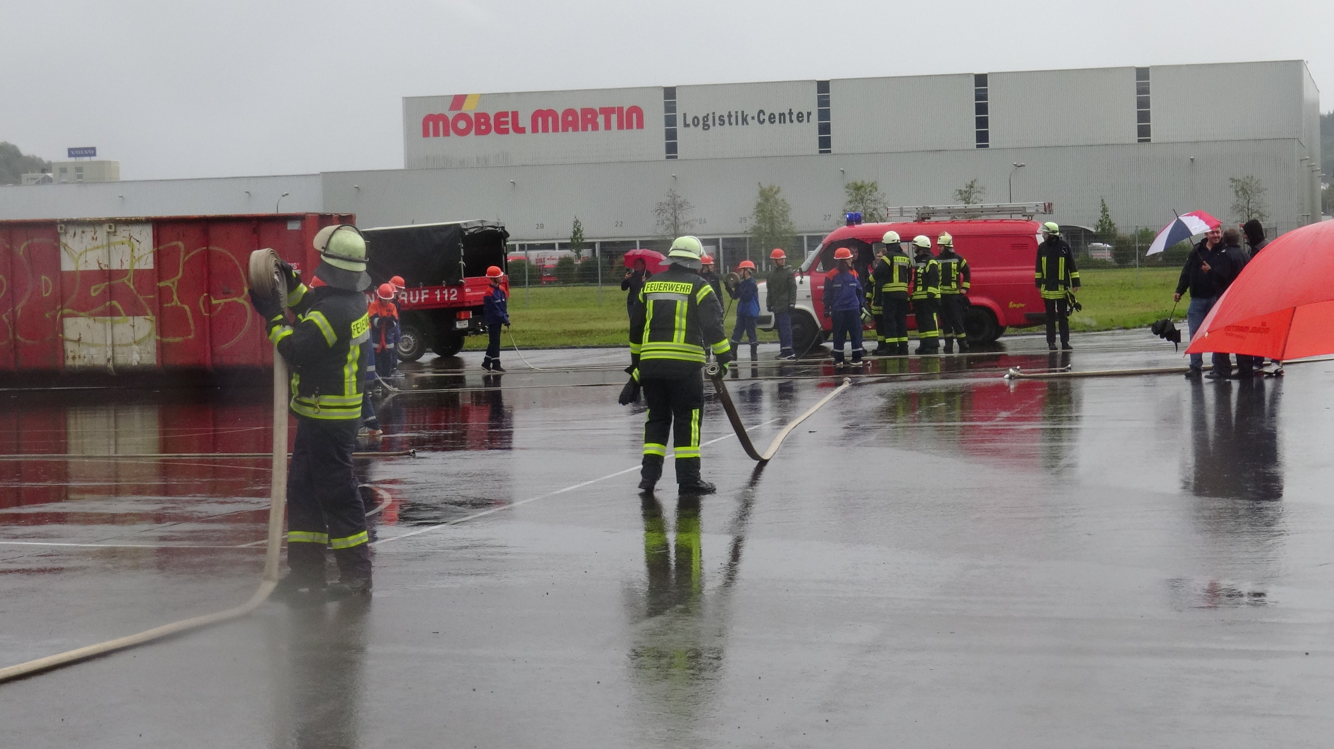 Als Übungsszenario stand das Gebäude in Vollbrand. Pünktlich um 14.00 Uhr trafen an die 14 Fahrzeuge mit Einsatzalarm am Haupteingang des Betriebsgeländes ein. Nach einem kurzen Stopp erfolgte die Zuordnung der Einheiten zum Aufbau der Wasserversorgung und zeitgleich der Angriff an verschieden Standorten rund um das große Gebäude und dies mit tatkräftiger Unterstützung der Betreuer und Jugendwarte. Zum gleichen Zeitpunkt öffnete der Himmel seine Pforten. Dies beeindruckte die circa 90 Jugendliche in keinster Weise, denn Wasser war reichlich vorhanden und die Jugendlichen hatten trotzdem viel Spaß. Die Übung lief sehr konzentriert und kameradschaftlich als Teamarbeit ab. Die circa 50 Betreuer waren sehr zufrieden was die Jugendlichen auch als Teamplayer an Eigenschaften zeigten.