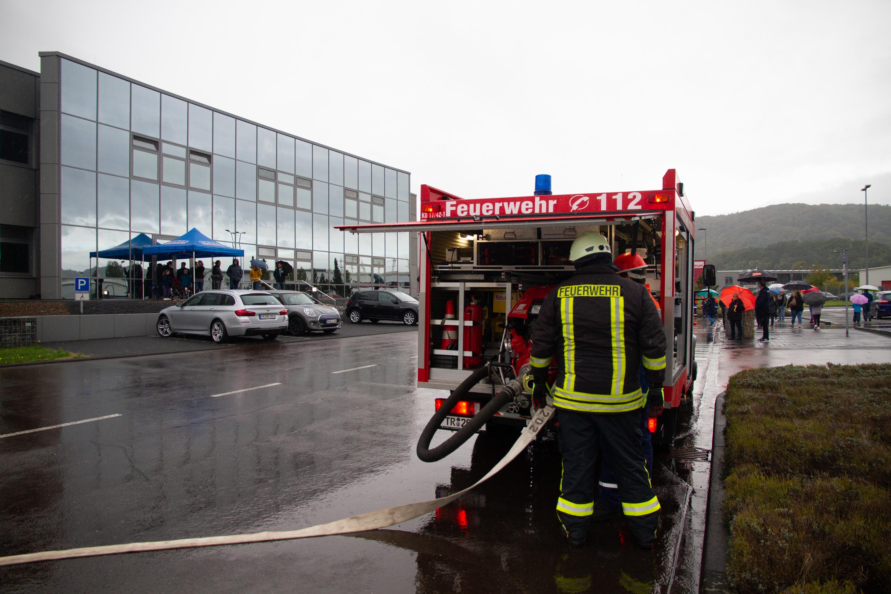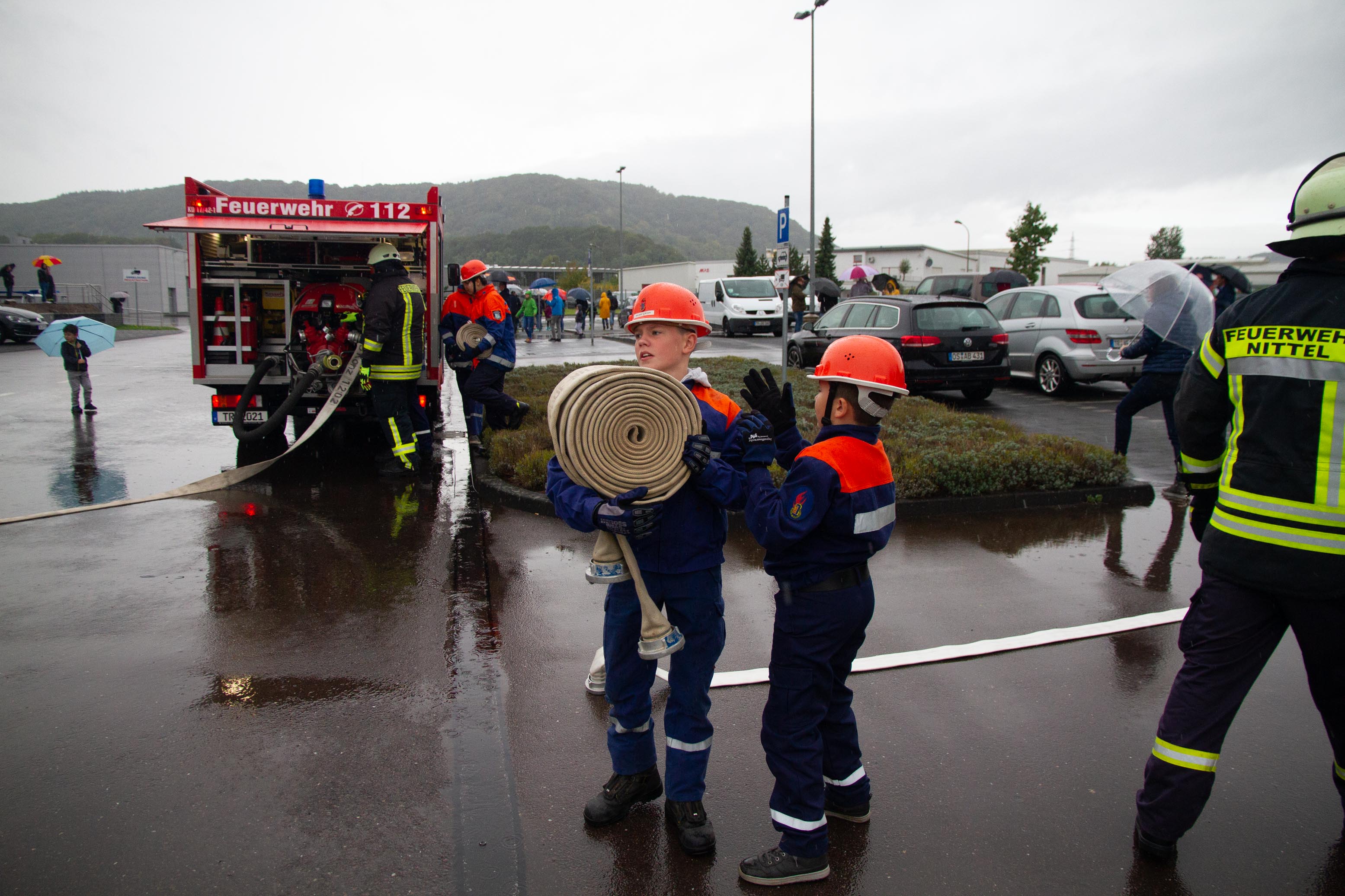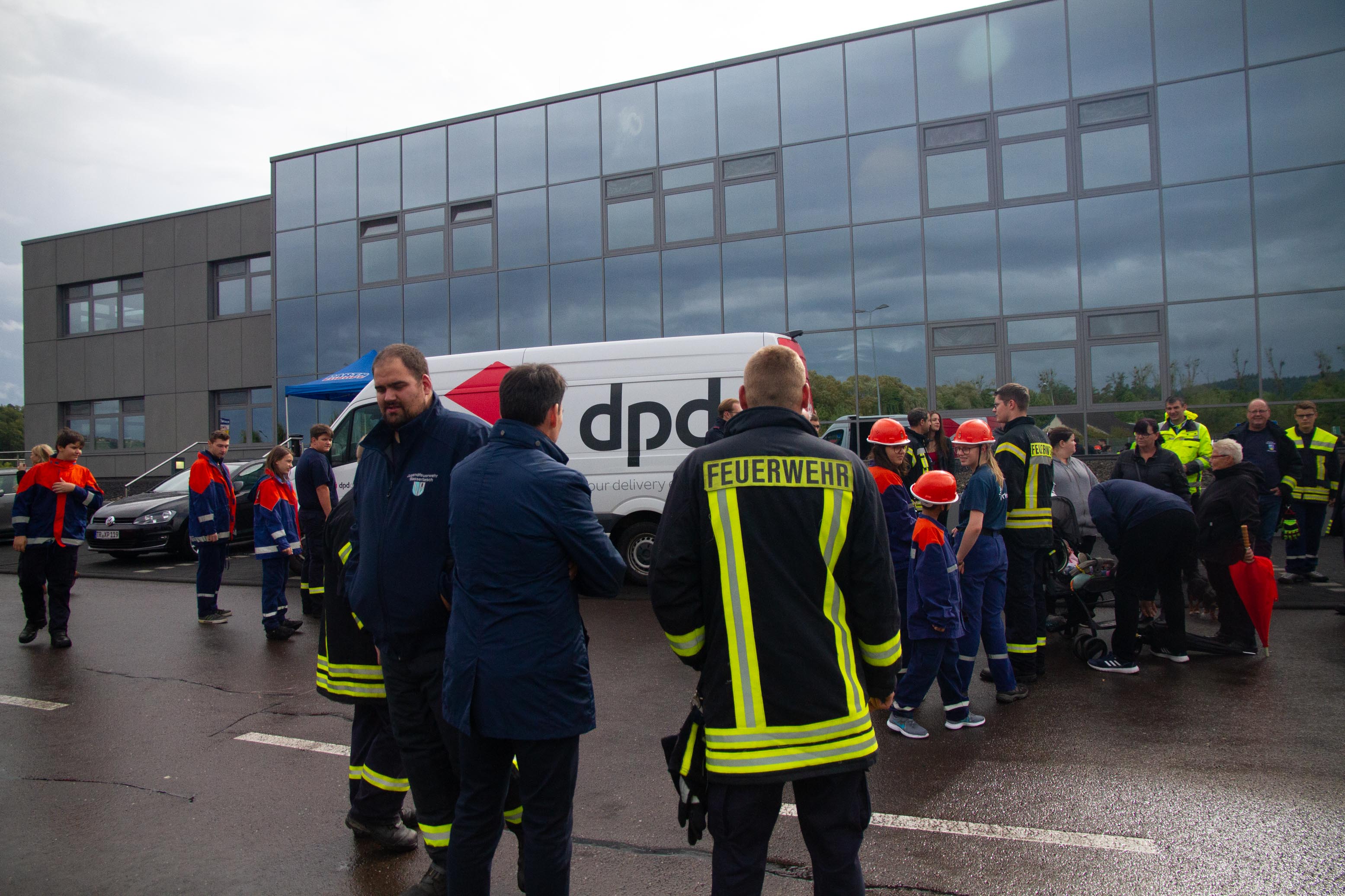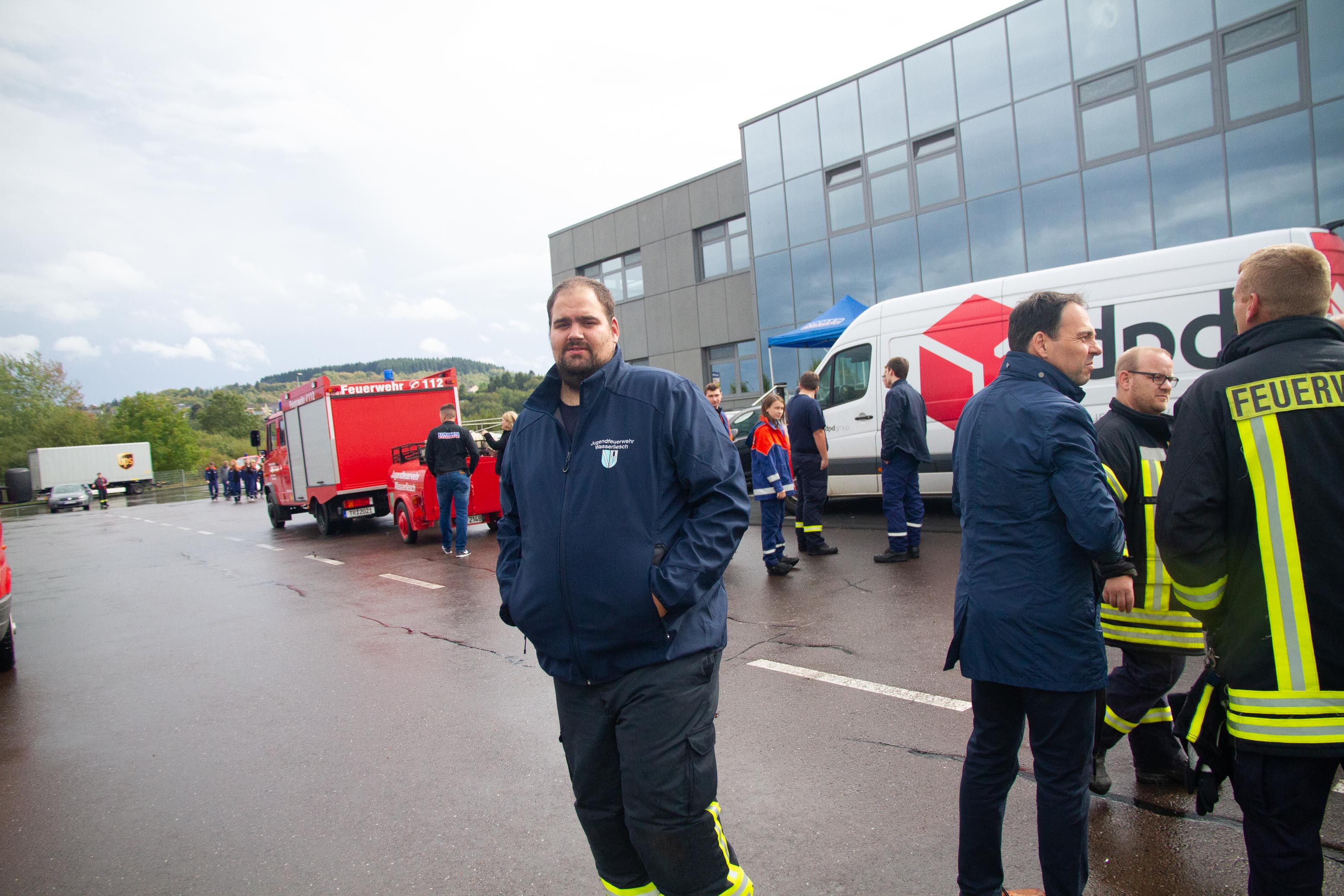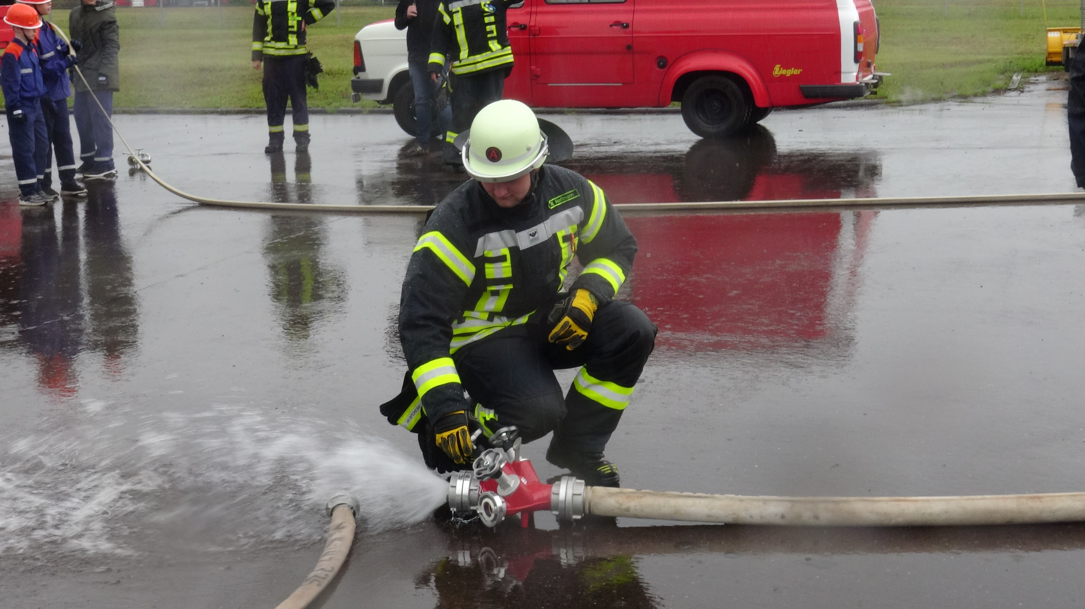 Als Übungsszenario stand das Gebäude in Vollbrand. Pünktlich um 14.00 Uhr trafen an die 14 Fahrzeuge mit Einsatzalarm am Haupteingang des Betriebsgeländes ein. Nach einem kurzen Stopp erfolgte die Zuordnung der Einheiten zum Aufbau der Wasserversorgung und zeitgleich der Angriff an verschieden Standorten rund um das große Gebäude und dies mit tatkräftiger Unterstützung der Betreuer und Jugendwarte. Zum gleichen Zeitpunkt öffnete der Himmel seine Pforten. Dies beeindruckte die circa 90 Jugendliche in keinster Weise, denn Wasser war reichlich vorhanden und die Jugendlichen hatten trotzdem viel Spaß. Die Übung lief sehr konzentriert und kameradschaftlich als Teamarbeit ab. Die circa 50 Betreuer waren sehr zufrieden was die Jugendlichen auch als Teamplayer an Eigenschaften zeigten.