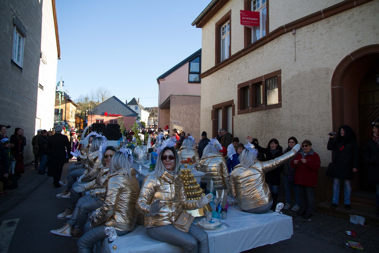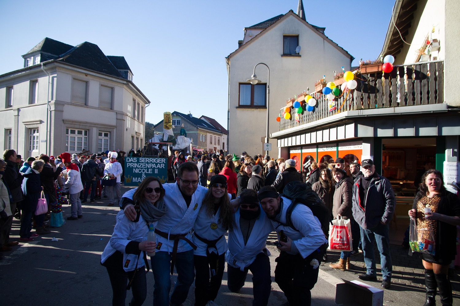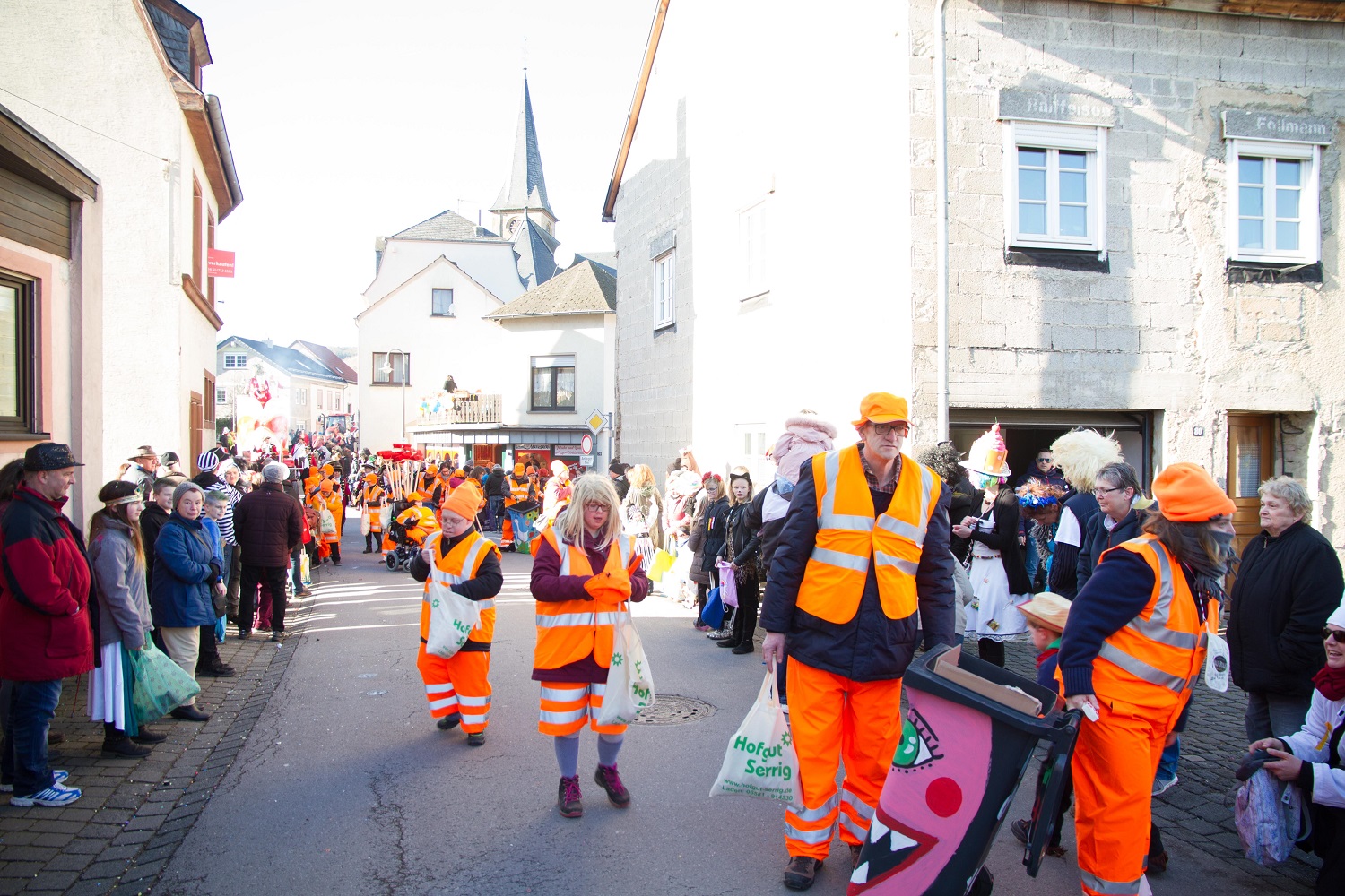 Die flotten Tiger vom Hofgut Serrig sorgten mit reichlich Mülltonnen und Straßenbesen für eine nachträgliche obligatorische Reinigung der Zugstrecke. Da es sich in Serrig köstlich schmausen lässt präsentierte man das restlich verbliebene Tafelsilber mit seinen Köstlichkeiten. Viele Fußgruppen beschäftigten sich mit dem Motto der Serriger Fastnacht „Saus im Braus“,Lachstatar und Sahnebaiser Noun DA JE.