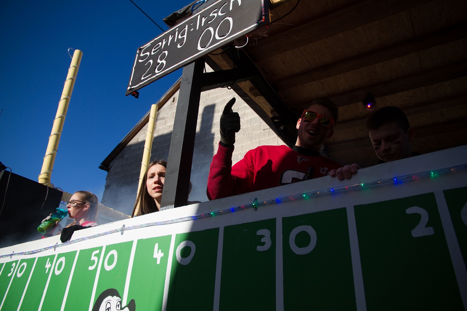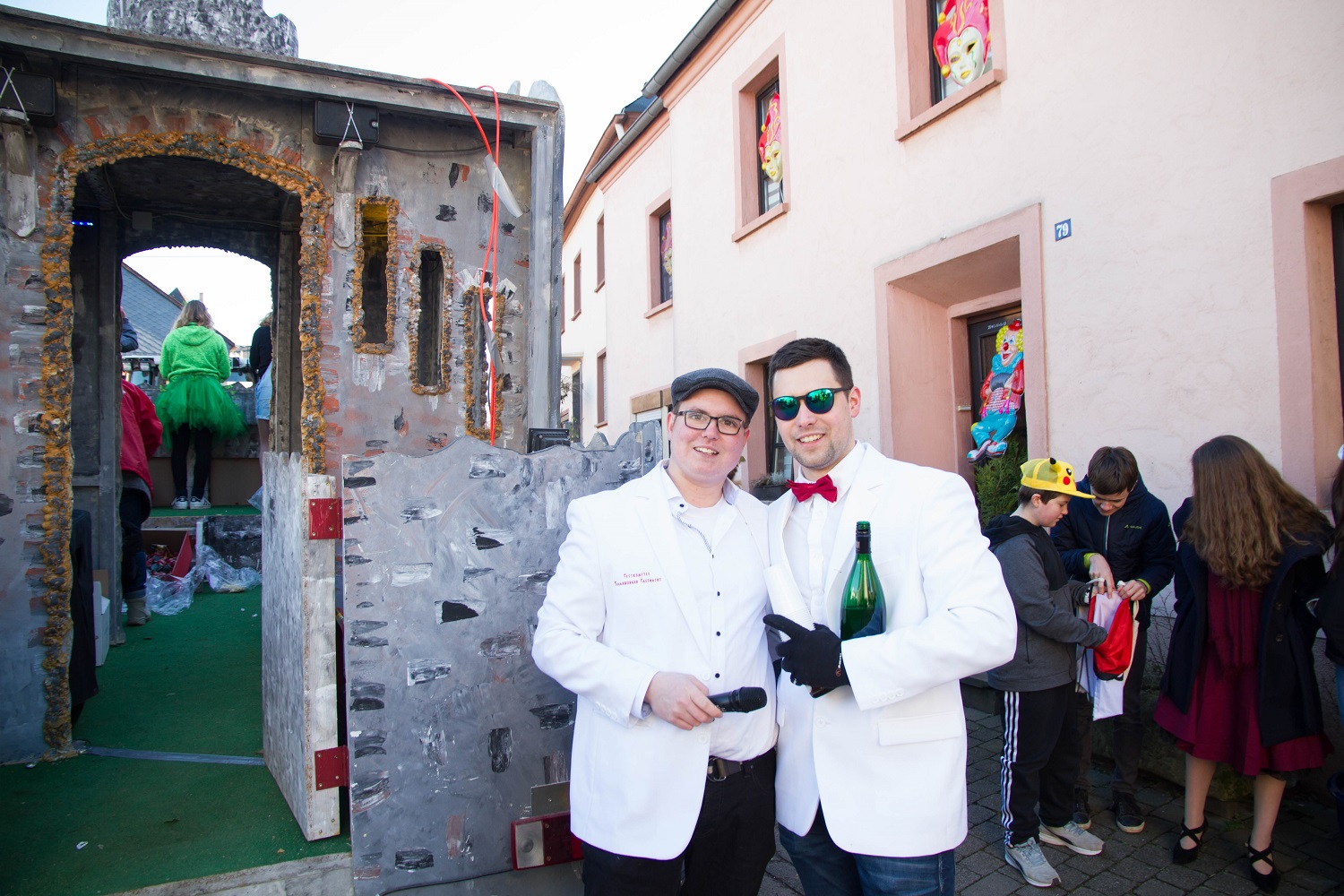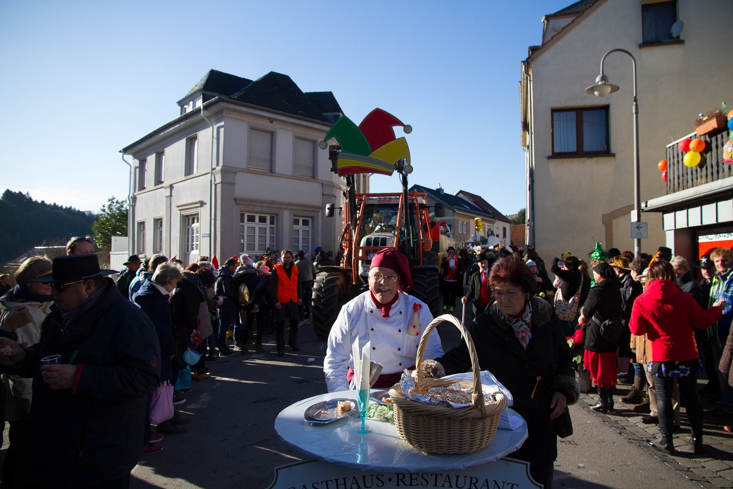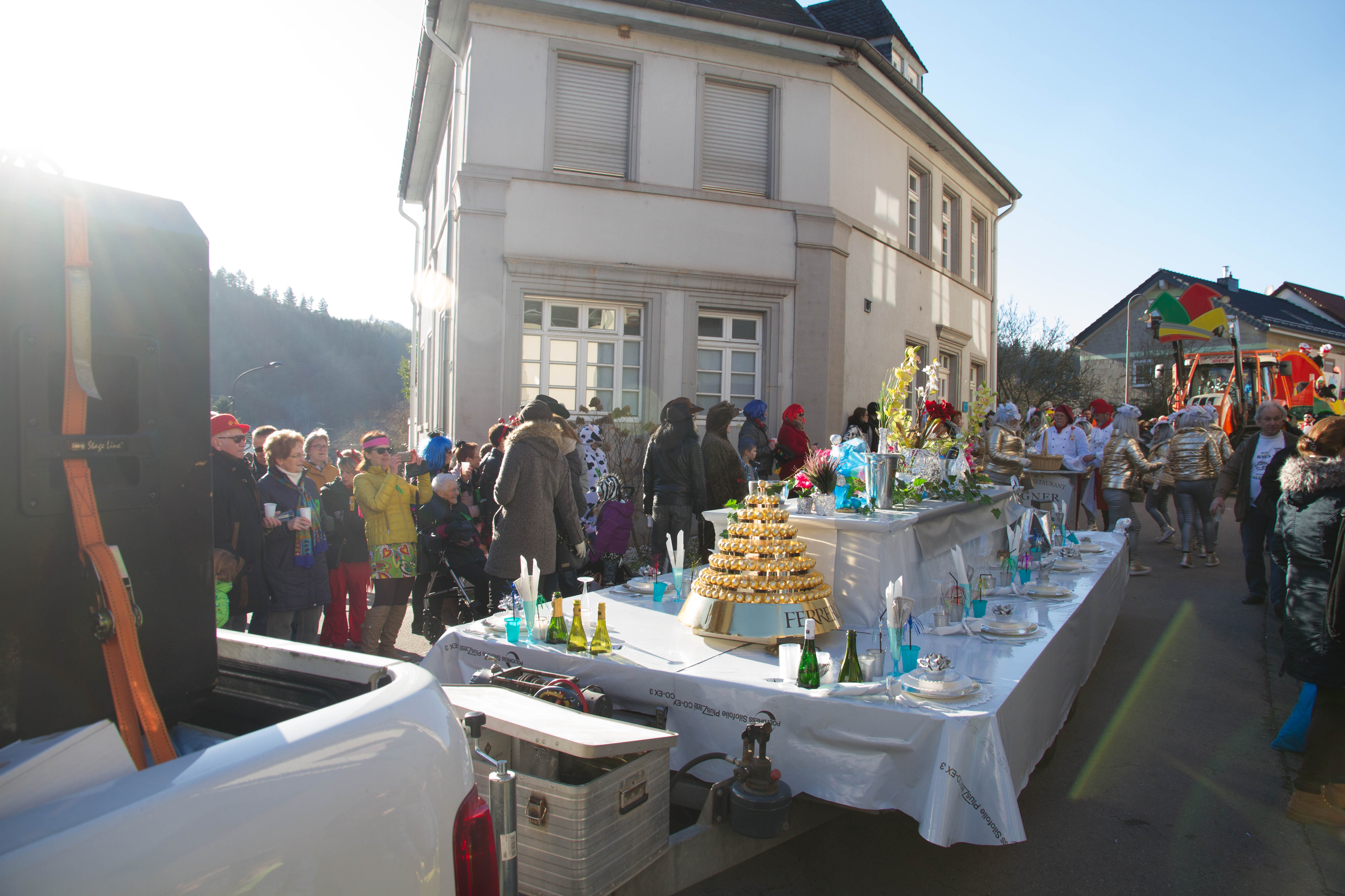 Die flotten Tiger vom Hofgut Serrig sorgten mit reichlich Mülltonnen und Straßenbesen für eine nachträgliche obligatorische Reinigung der Zugstrecke. Da es sich in Serrig köstlich schmausen lässt präsentierte man das restlich verbliebene Tafelsilber mit seinen Köstlichkeiten. Viele Fußgruppen beschäftigten sich mit dem Motto der Serriger Fastnacht „Saus im Braus“,Lachstatar und Sahnebaiser Noun DA JE.