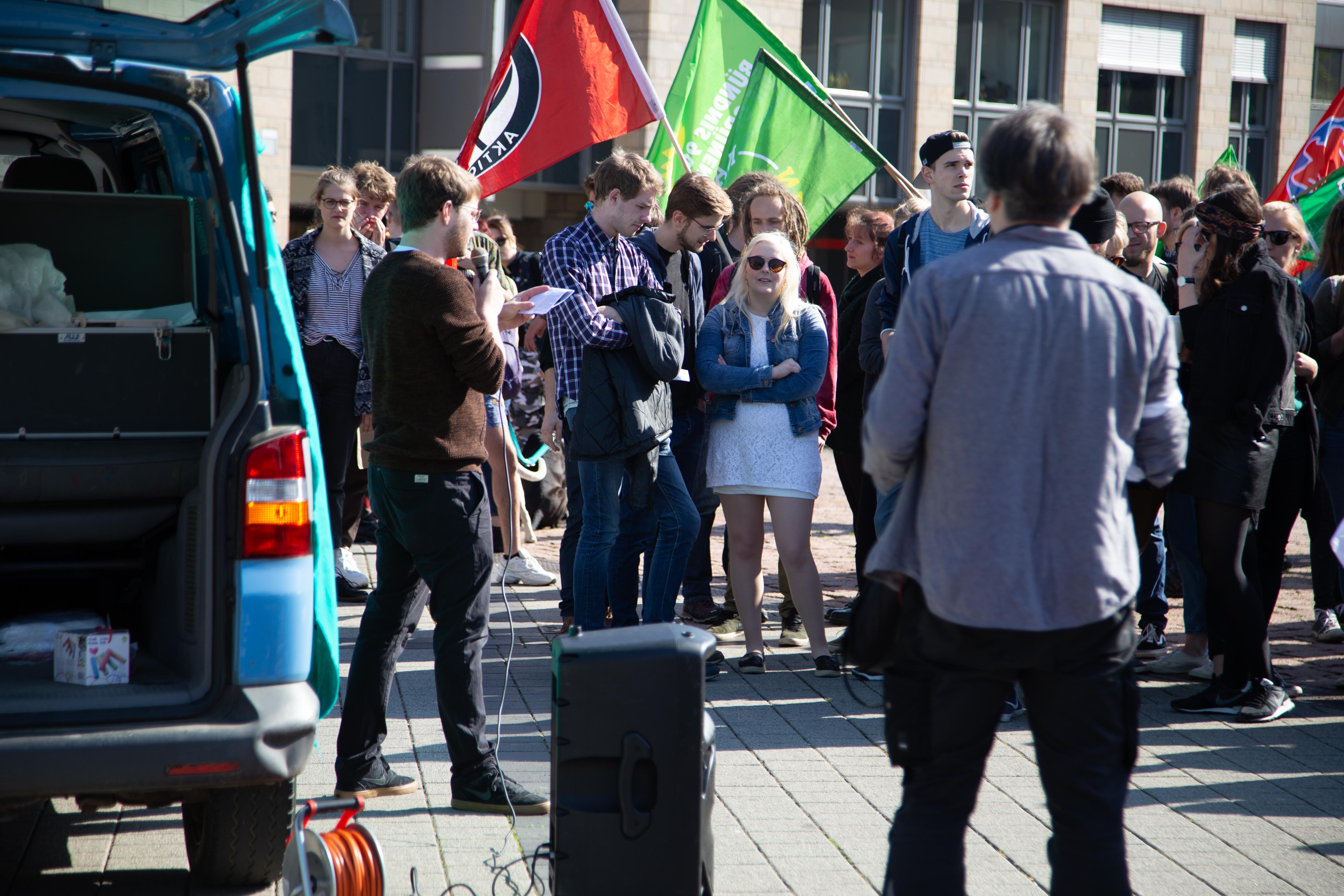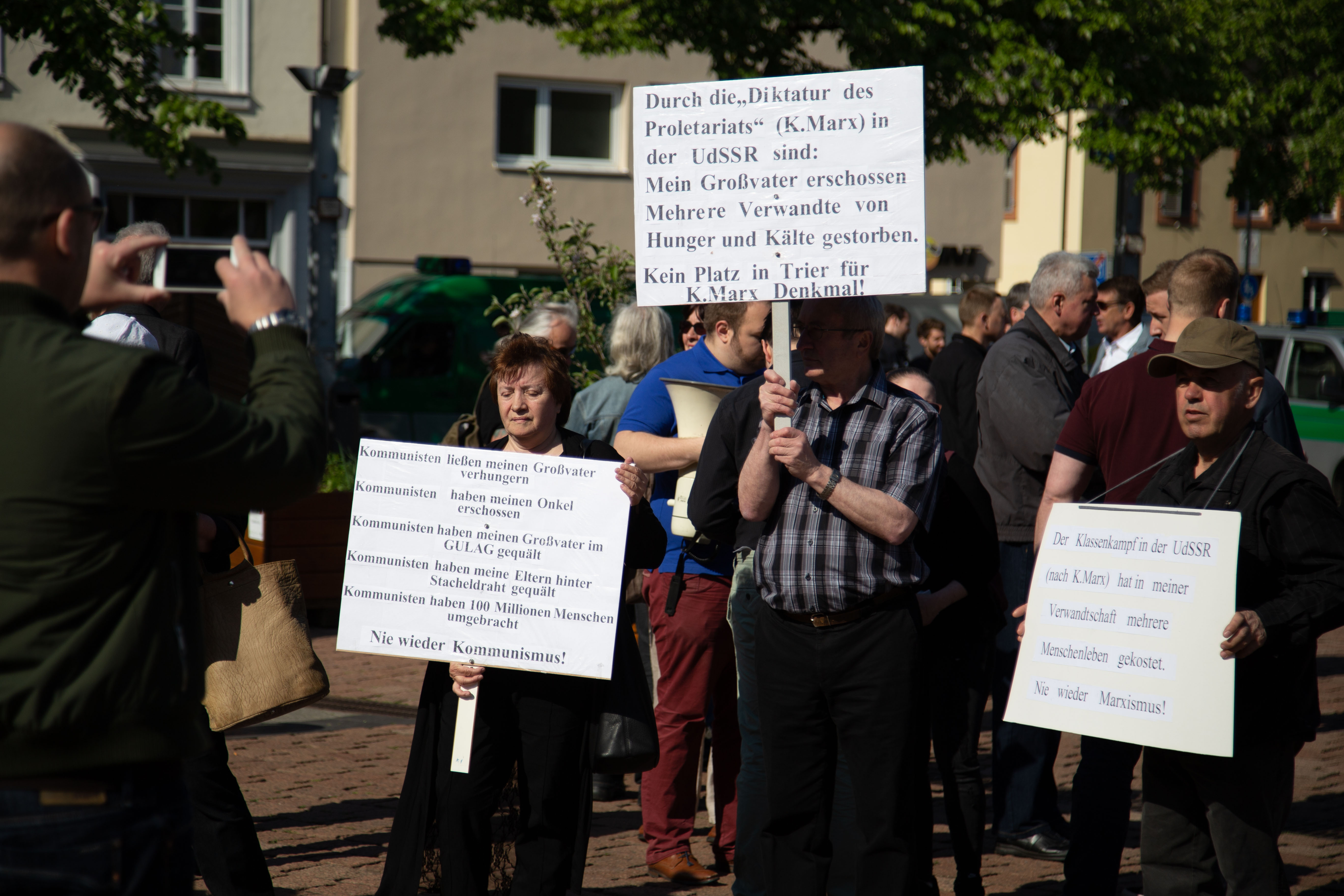 Mit einer anfänglichen Teilnehmerzahl von 250 Personen, die zum Ende im Margarethengässchen auf etwa 500 Personen angewachsen war, stellte das Karl-Marx-Bündnis die größte Gruppe. Die AfD führte etwa 70 Anhänger durch die Stadt in Richtung des Festaktes, das Multikulturelle Zentrum Trier setzte diesen etwa 150 Demonstranten entgegen. Erwartungsgemäß gab es gegenseitige verbale Anwürfe, jedoch keinerlei Zusammenstöße.