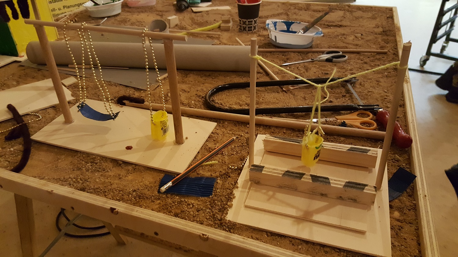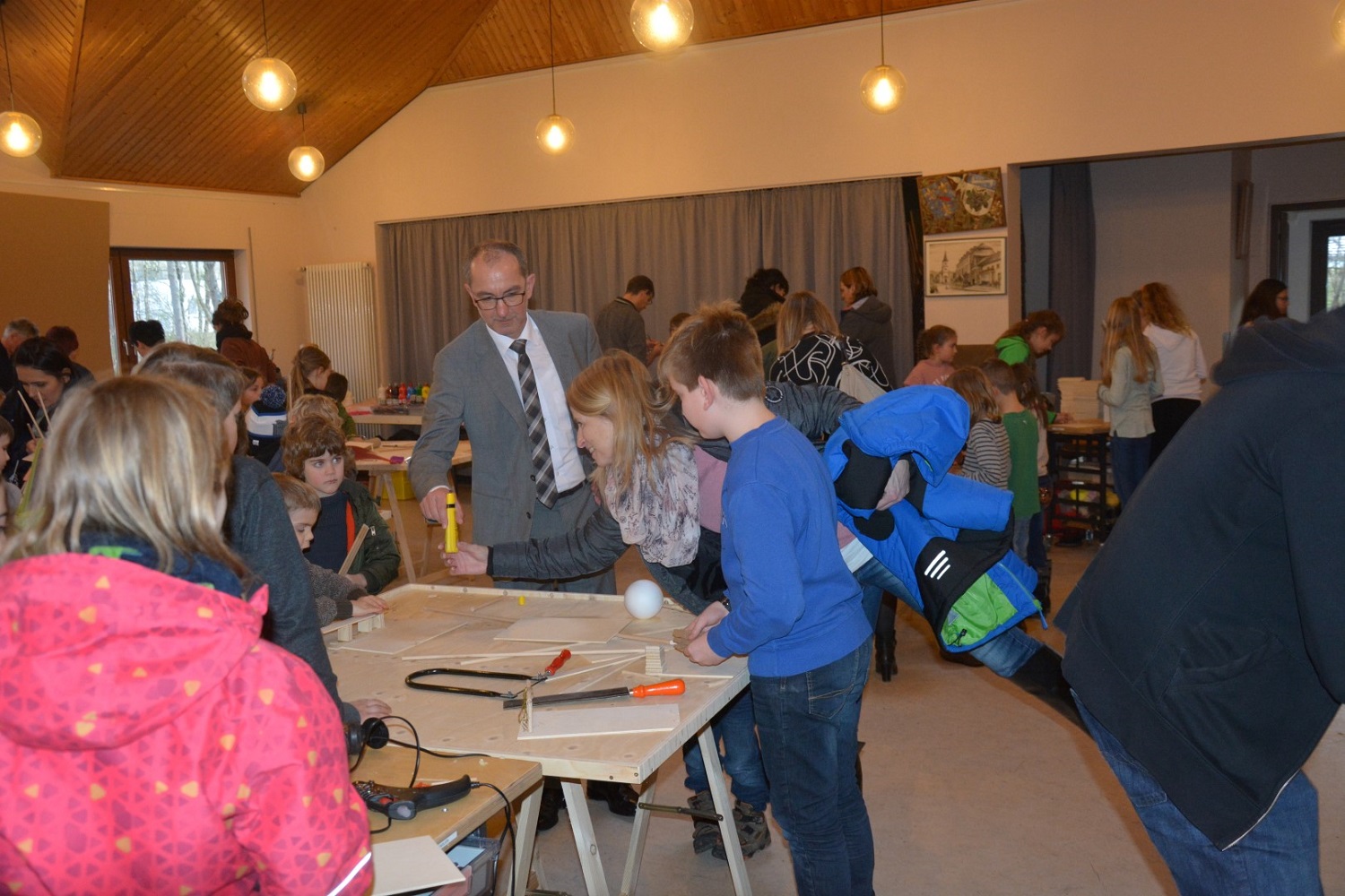 „Ich freue mich sehr darüber, dass ihr so zahlreich gekommen seid. Wir brauchen Eure Hilfe.“, sagte Bürgermeister Weber. „Hier soll ein neuer schöner Spielplatz gebaut werden. Dazu brauchen wir einen Plan. Und an diesem Plan sollt ihr mitarbeiten, damit der Spielplatz auch Euren Wünschen entspricht.“ Nach der Begrüßung gab Dietmar Grundheber noch ein paar Anweisungen über den Tagesablauf und dann ging es auch schon los. Die Kinder fanden sich an den Tischgruppen zusammen und planten ihren Spielplatz. Dafür wurde gebastelt, gesägt, gebaut und gemalt. Immer wieder ergaben sich daraus völlig neue Ideen und Vorschläge. Unterstützt wurden die Kinder von Moderatorinnen und Moderatoren des Jugendnetzwerkes Konz sowie von einigen Eltern. Deren Aufgabe war es die Kinder zu motivieren, Hilfestellungen zu geben und auch sonst mit Rat und Tat zur Seite zu stehen. Alle Werke und Ideen wurden dokumentiert.