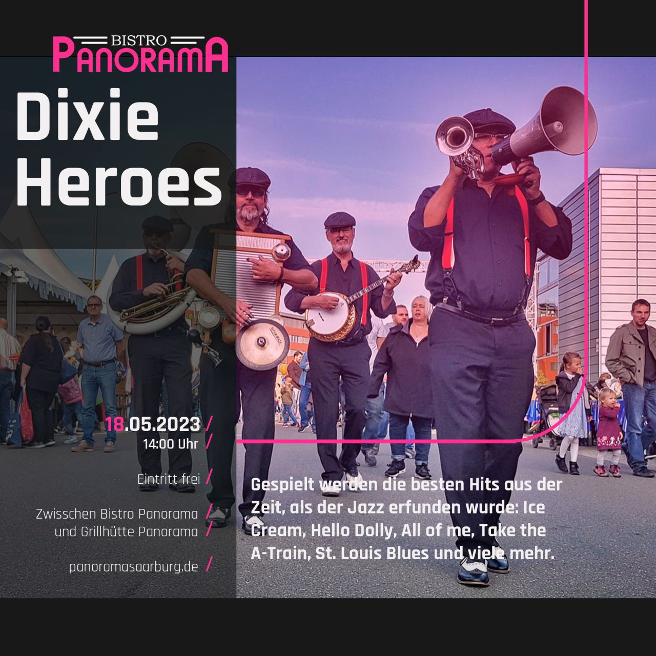 Zwischen Bistro Panorama und der angrenzenden Grillhütte spielt die Dixie Heroes aus der Zeit, als der Jazz erfunden wurde. Das Potpurie reicht von Ice Cream,Hello Dolym,All of me,Take the A-Train. St.Louis Blues u.v.m. Termin: 18.5.23 14.00Uhr Eintritt frei.