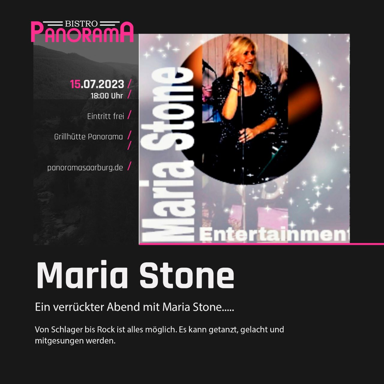 Wer kennt Sie nicht – Maria Stone, Entertainerin mit kraftvoller Stimme. Im Wirtshaus mit Herz in Saarburg hat Sie in vergangener Zeit insbesondere am Festivalabend im November 2022 Ihr Publikum mitgerissen. Von Schlager bis Rock; alles ist möglich. Genießen Sie einen verrückten Abend mit Maria Stone. Es kann gelacht, getanzt und mitgesungen werden. Termin Grillhütte Panorama 15.7.23 18.00 Uhr. und am 19.8.23 um 18.00 Uhr. Eintritt frei,