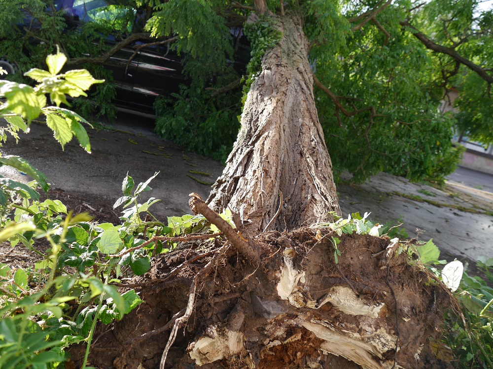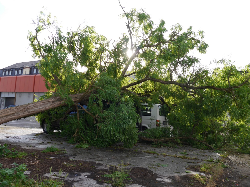 In der Schönbornstraße stürzte ein Baum auf zwei parkende Transporter einer Firma. Die Autos wurden unter dem entwurzelten Baum begraben, Scheiben gingen zu Bruch. Es entstand hoher Sachschaden.
