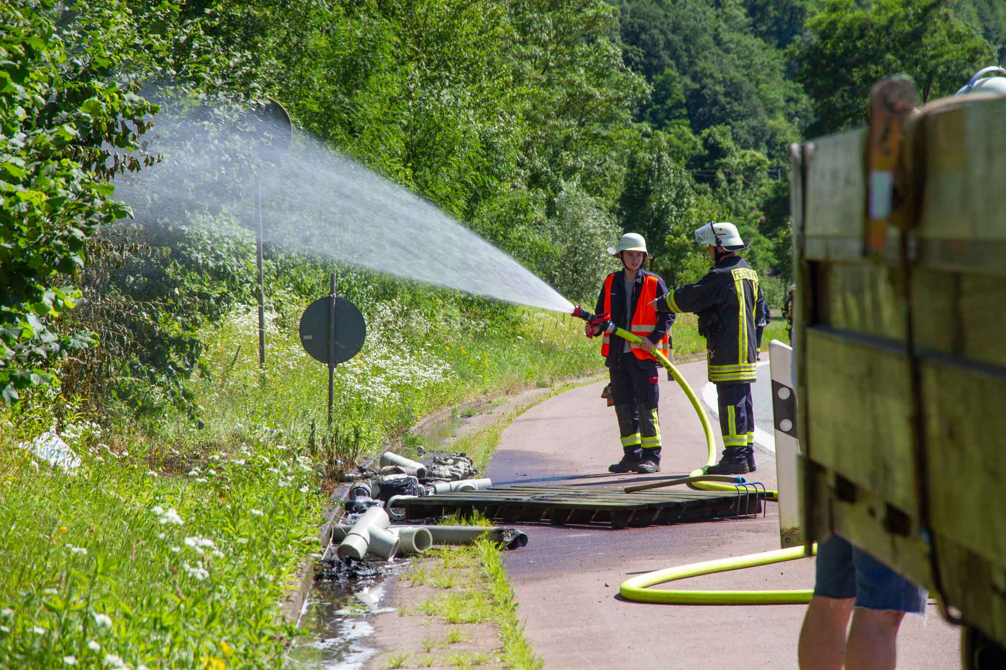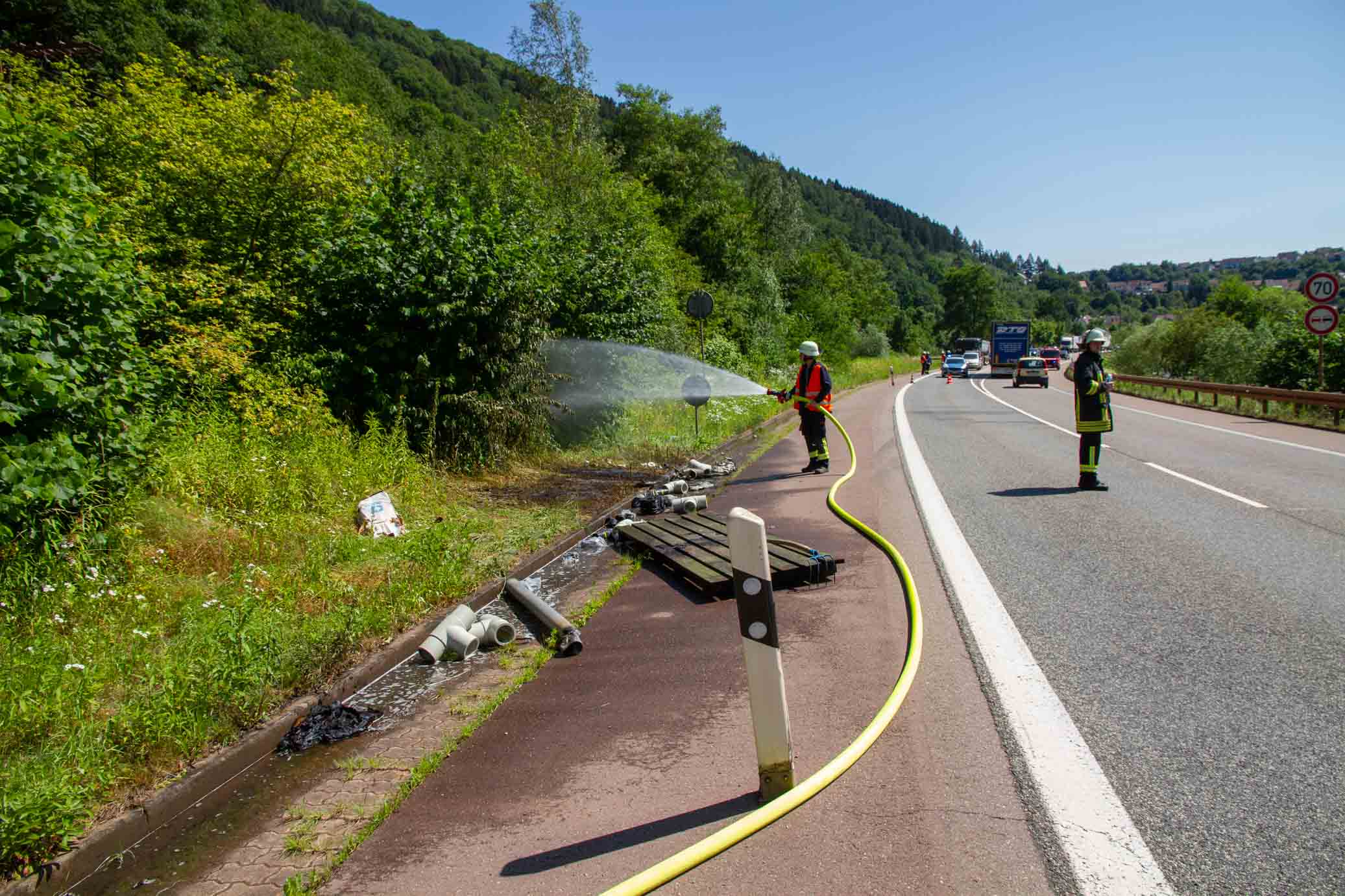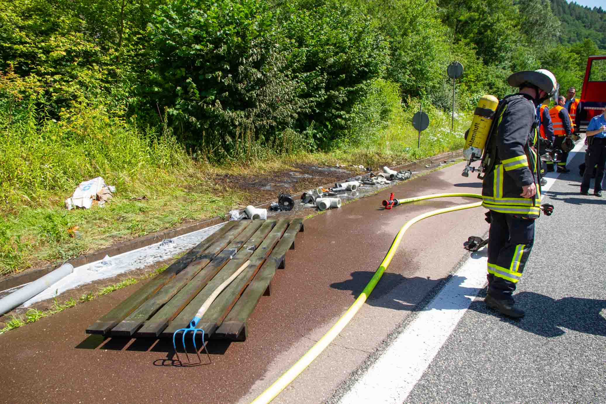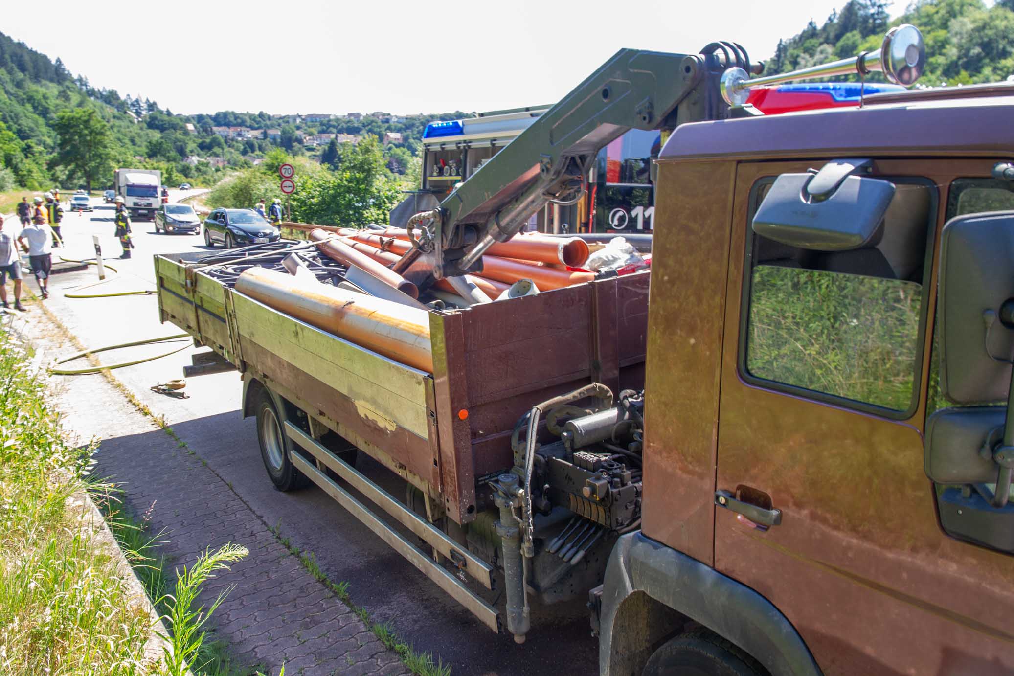 In Höhe der Ortschaft Saarhölzbach fing die Ladung von Baumaterialien und Kurstoffrohren plötzlich Feuer. Der Fahrer handelte schnell und konnte noch rechtzeitig den brennenden Teil der Ladung von der Pritsche auf den Randstreifen runter ziehen.