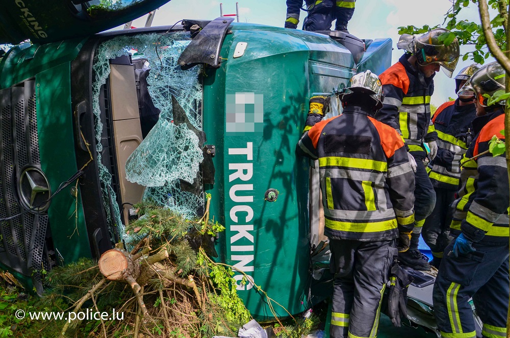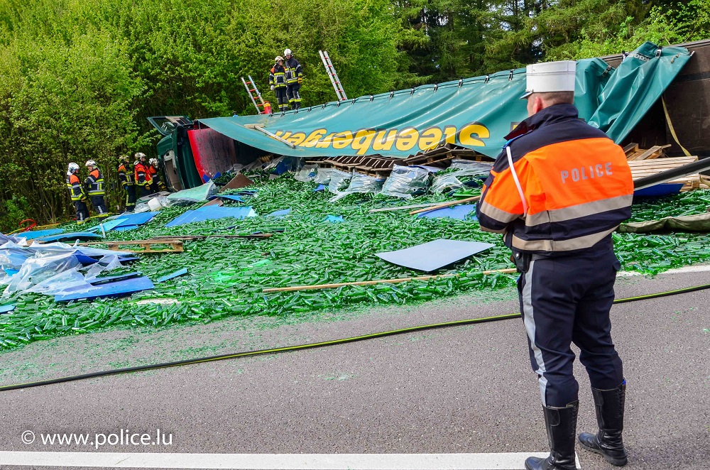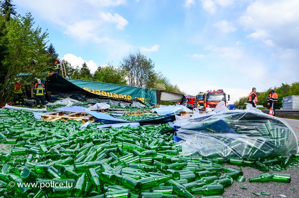 Etwa 500 Meter vor der Auffahrt Flaxweiler wollte sich ein Lastwagenfahrer nach einem missglückten Überholmanöver wieder auf der rechten Spur einreihen. Hierbei übersah er einen Pkw, welcher auf der rechten Spur fuhr. Als der Lastwagenfahrer den Pkw bemerkte, riss er am Lenkrad, sodass der Lastwagen zu schlingern begann und schlussendlich rechtsseitig in die Böschung geriet und umstürzte. Die Ladung, welche aus leeren Bierflaschen bestand wurde hierbei über die gesamte Fahrbahn verteilt. Der Fahrer des Lastwagens wurde beim Unfall verletzt und ins Krankenhaus gebracht. Die Autobahn muss für die Dauer der Aufräumarbeiten gesperrt bleiben, eine Umleitung über die Parallelstrasse CR 142 ist eingerichtet.