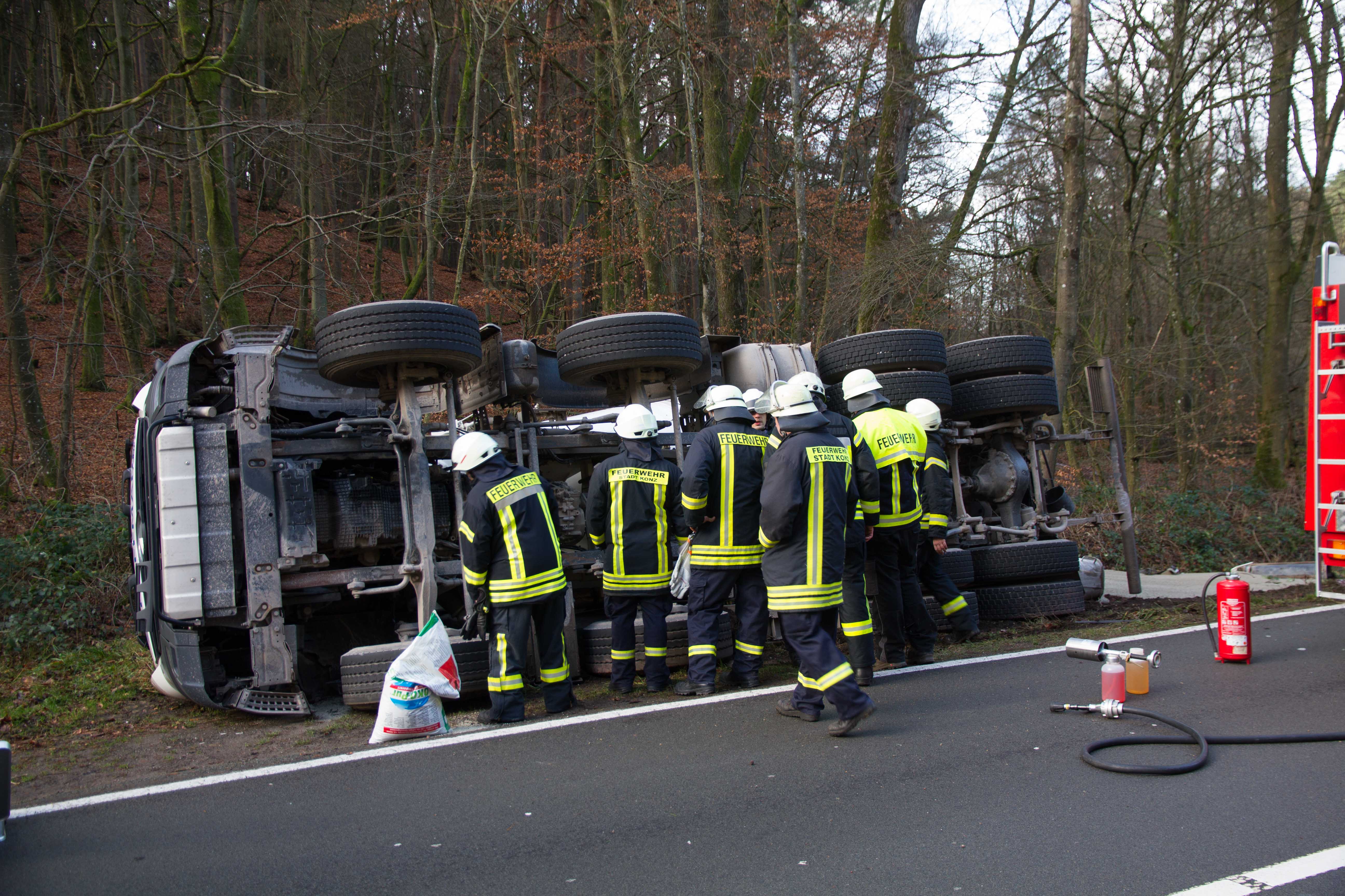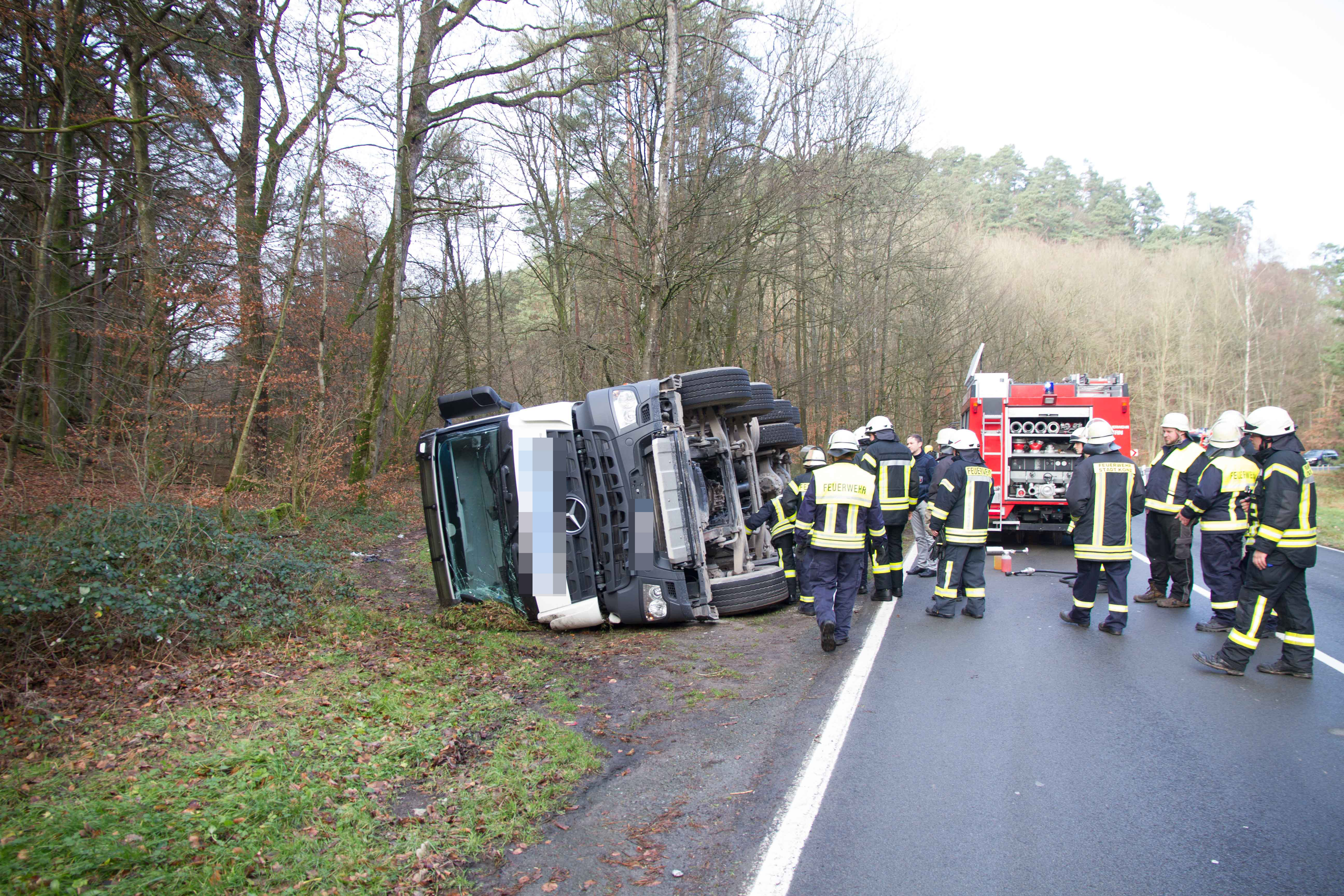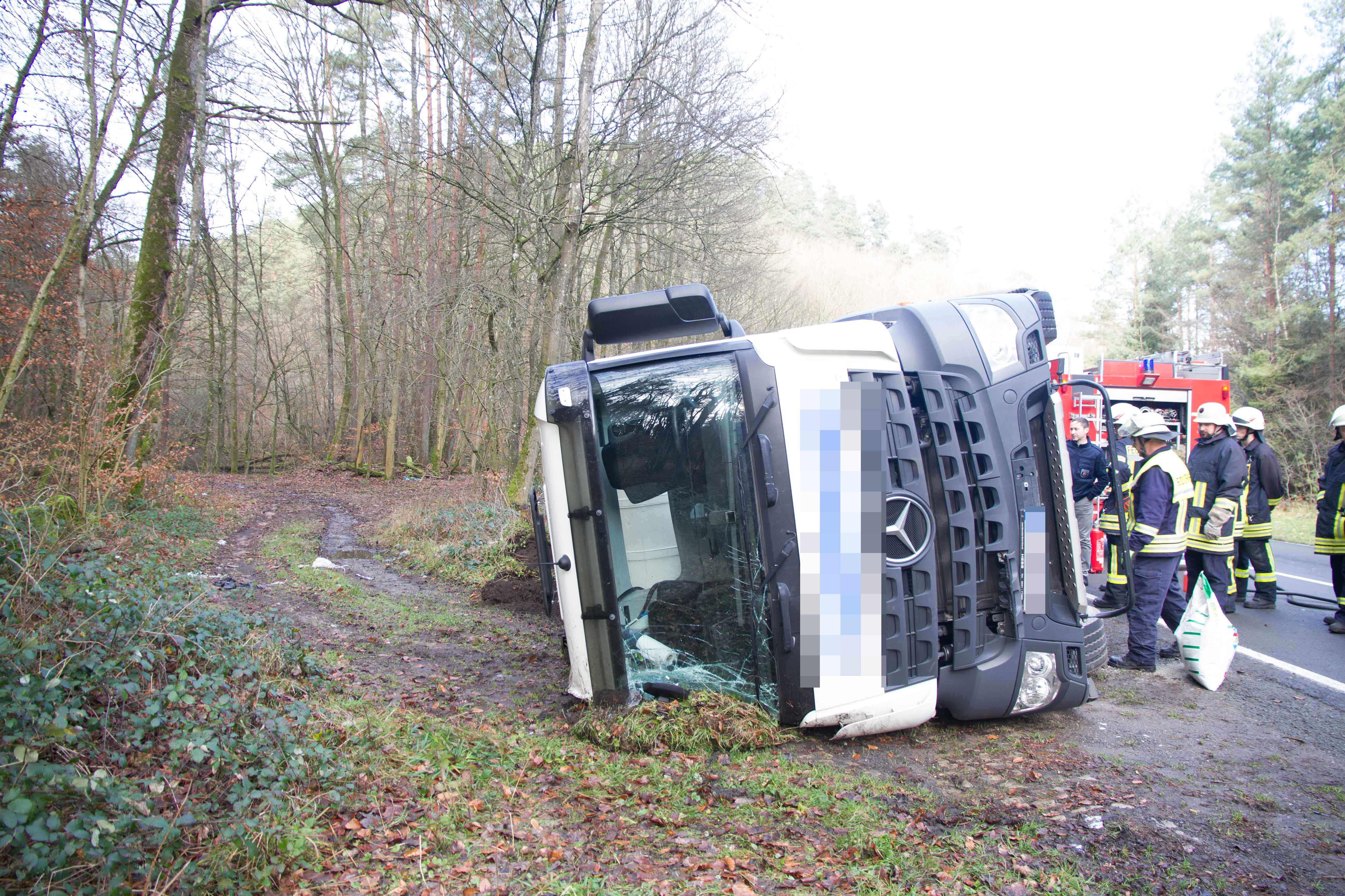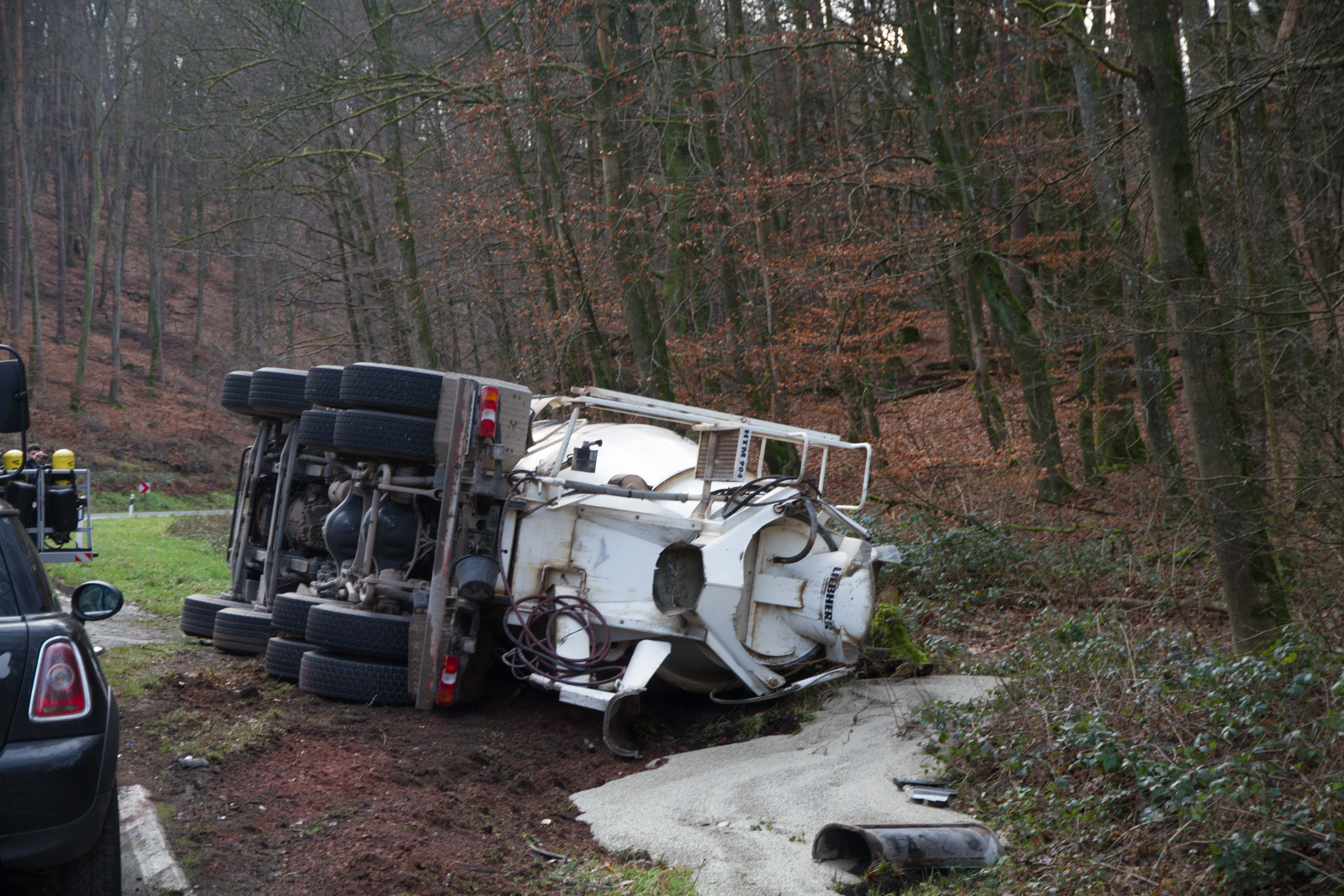 Dabei stürzte das Fahrzeug in die Böschung. Eine nicht unerhebliche Menge des flüssigen Beton lief dabei aus.
