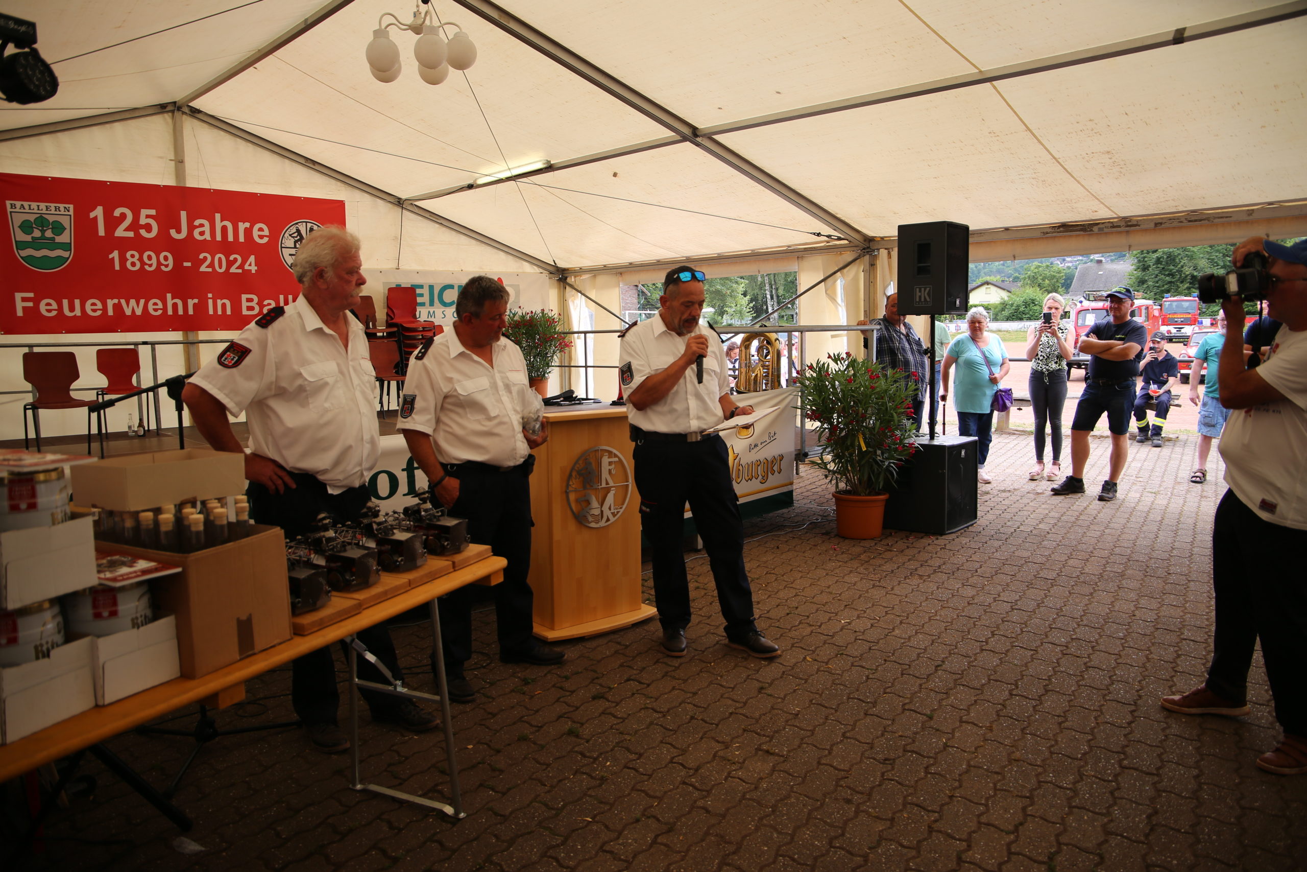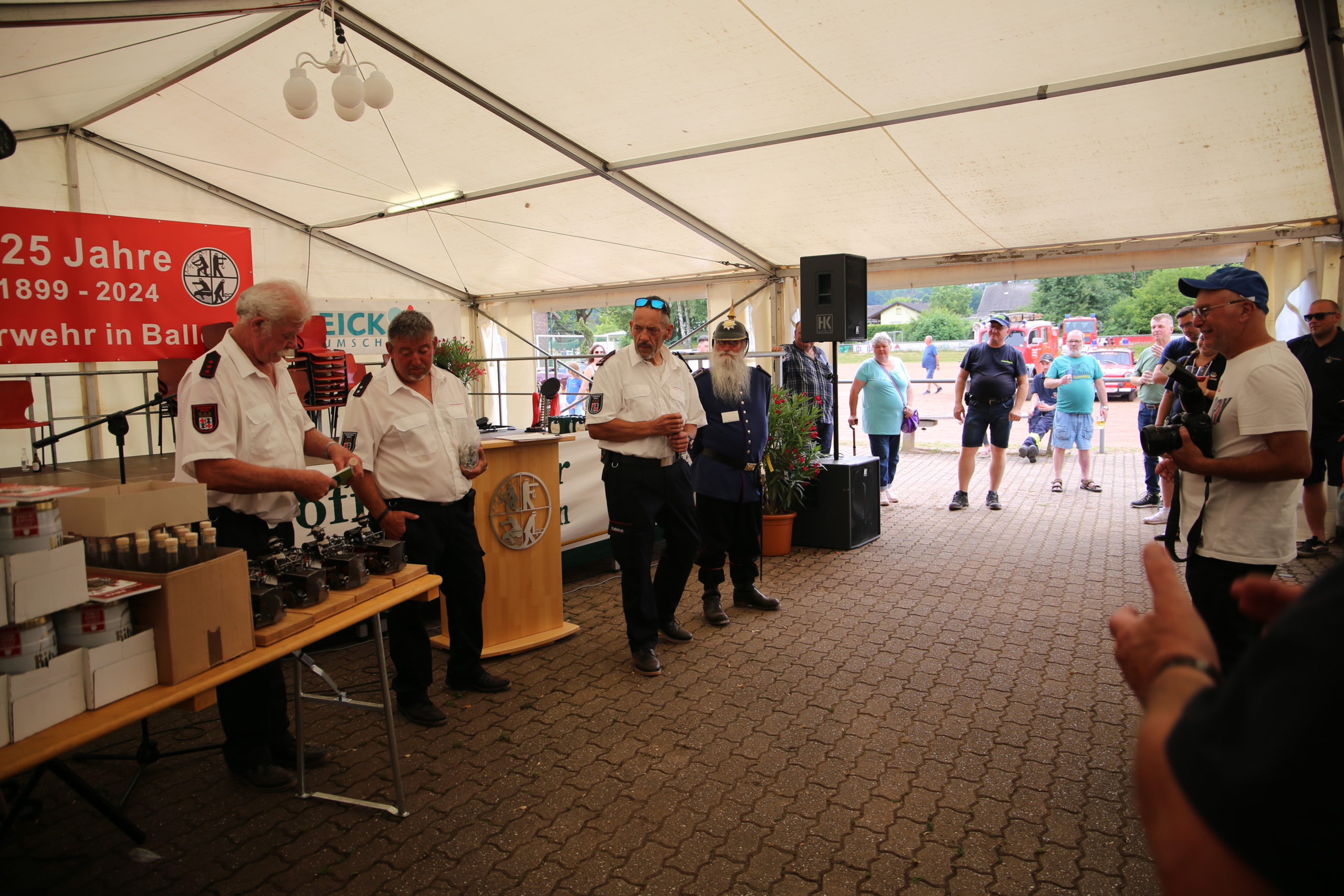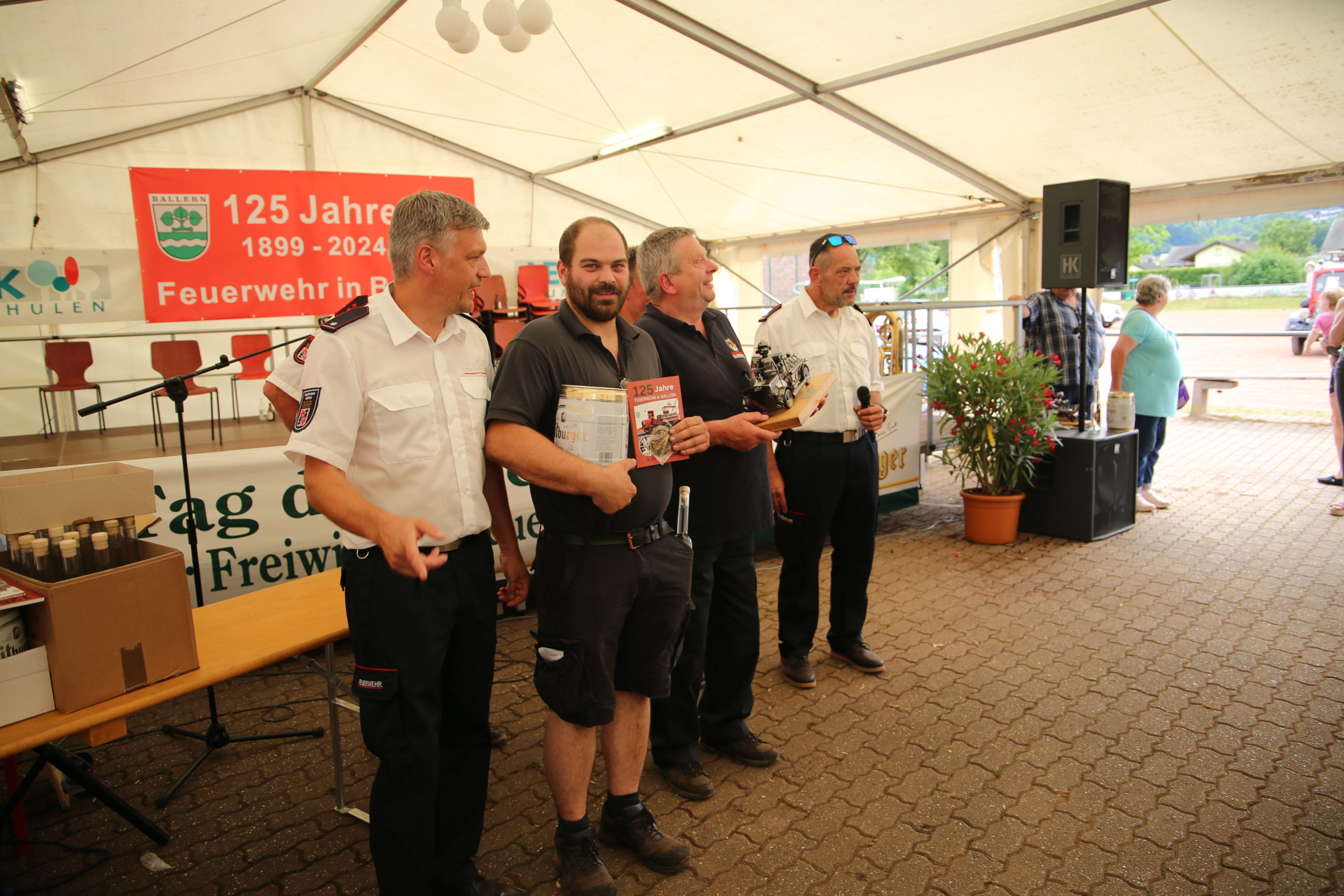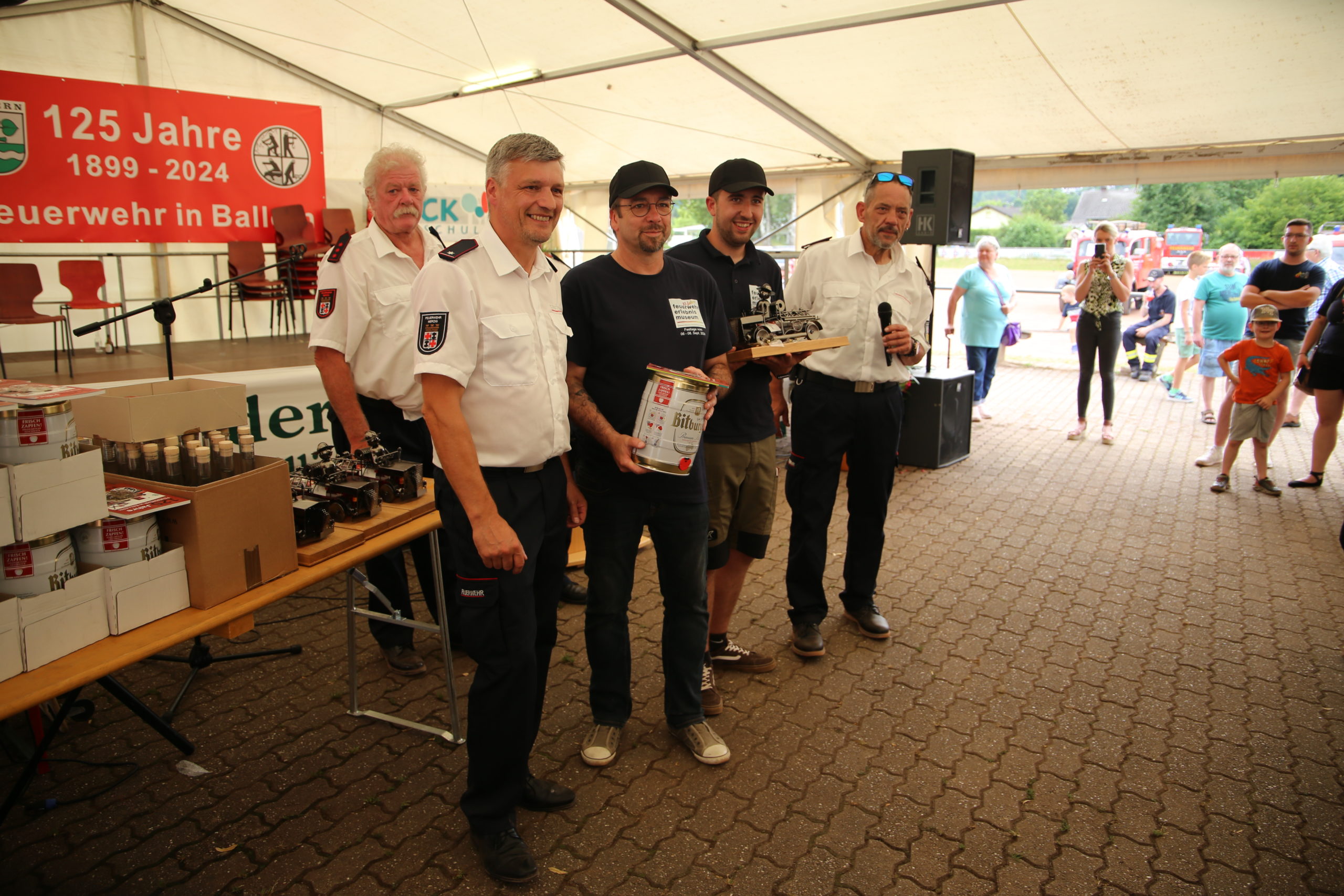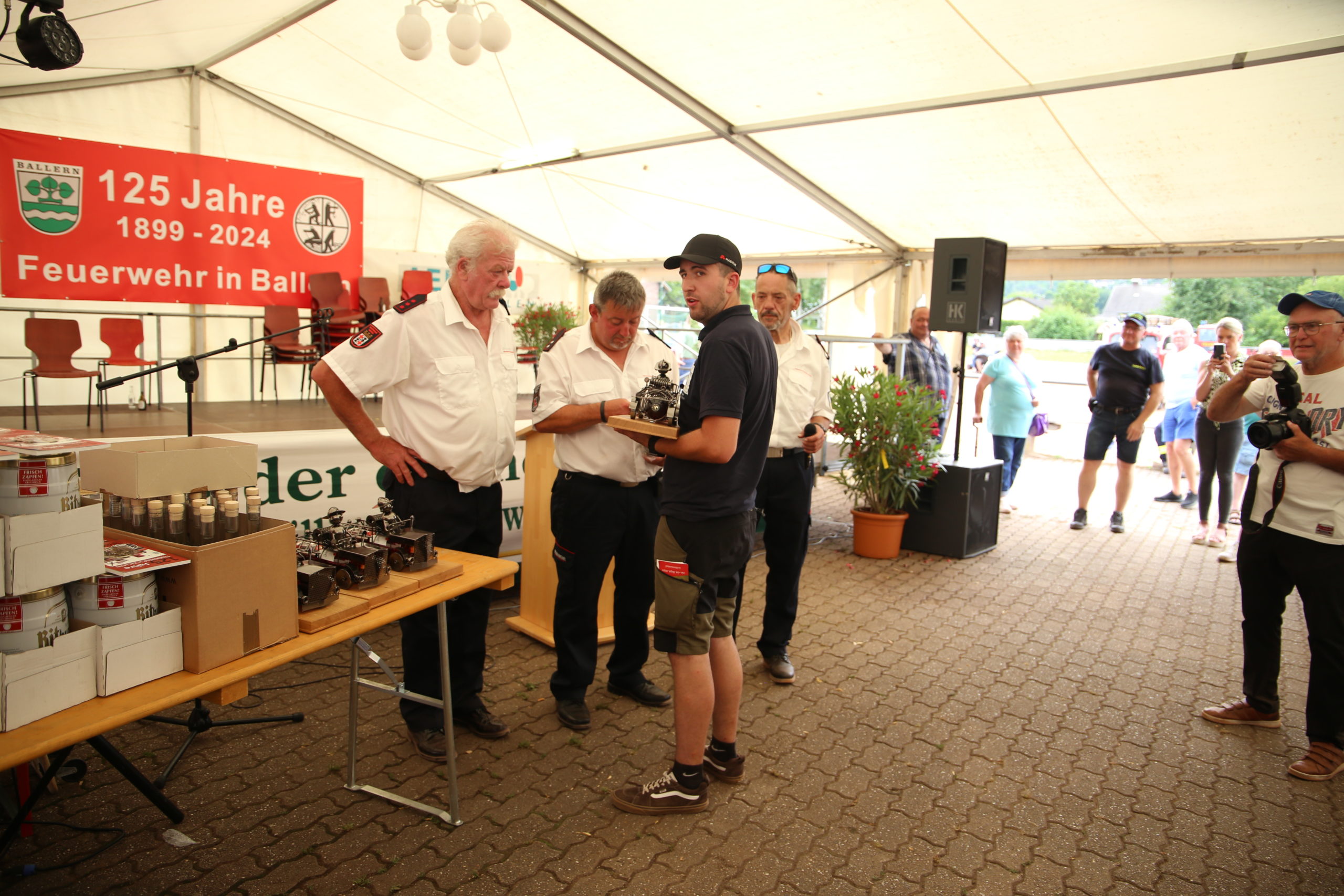Zum Highlight am folgenden Sonntagnachmittag fand in der ca. 1300 Einwohnergemeinde Ballern die historische Oltimerparade durch Ballern mit zahlreichen Teilnehmer aus der Großregion und dem benachbarten Rheinland-Pfalz statt. Besonderes Aufsehen errangen die Zuschauer der 112 Jahre DELAHAYE AP 59 aus Privatbesitz. Ihr Einsatzgebiet war in Grenoble und stand viele Jahre in einer Garage in der Nähe von Paris. Mit viel Liebe und Arrangement wurde das Löschfahrzeug mit der Alterswehr und dem Löschbezirk Fitten restauriert. Auch die legendäre und liebevoll genannte „Santa Maria“; der Feuerwehr Saarburg -Löschzug Mitte- fuhr mit ihren 75 Jahren auf dem Rad nach Ballern. Auch Vertreter des Feuerwehr Erlebnis Museum aus Hermeskeil nahm mit einigen Oldtimern teil.( Hinweis: Am 6.9.24 findet in Hermeskeil das Oltimertreffen der Blaulichtfamilie und Nutzfahrzeuge statt) Zum Abschluss der Parade fand die Siegerehrung der Oltimer mit ihren Fahrer im Festzelt durch Übergabe von Präsenten statt.