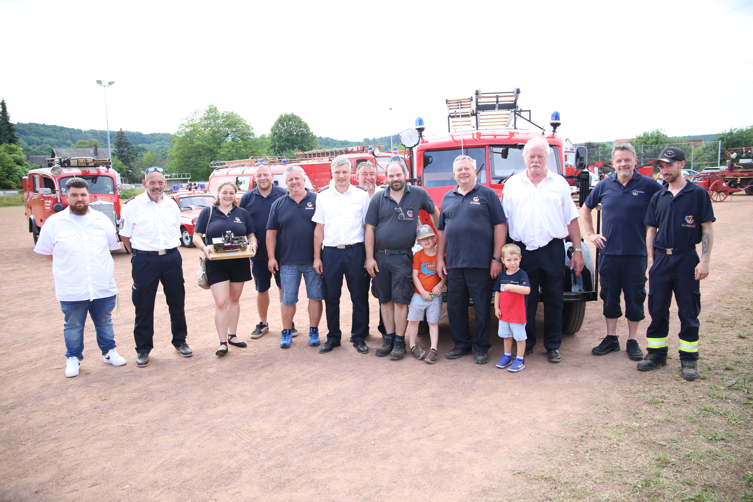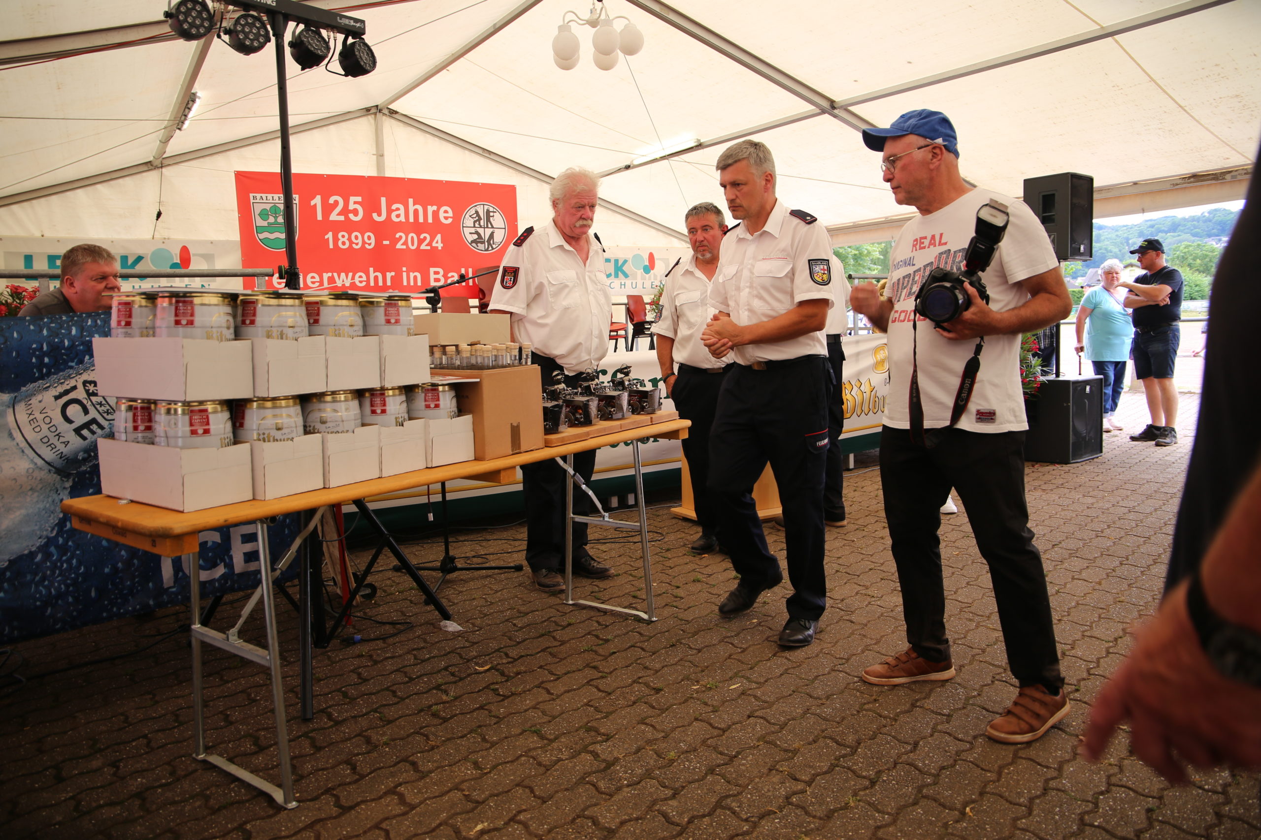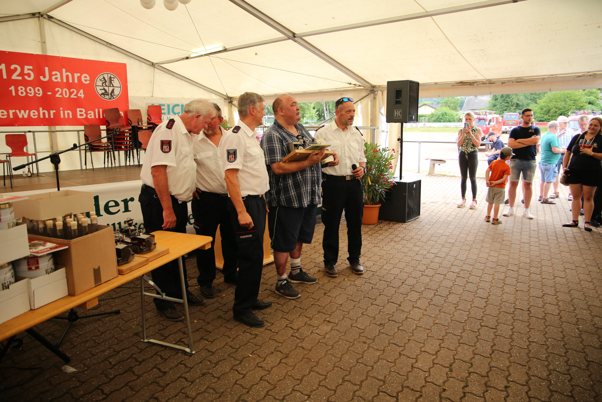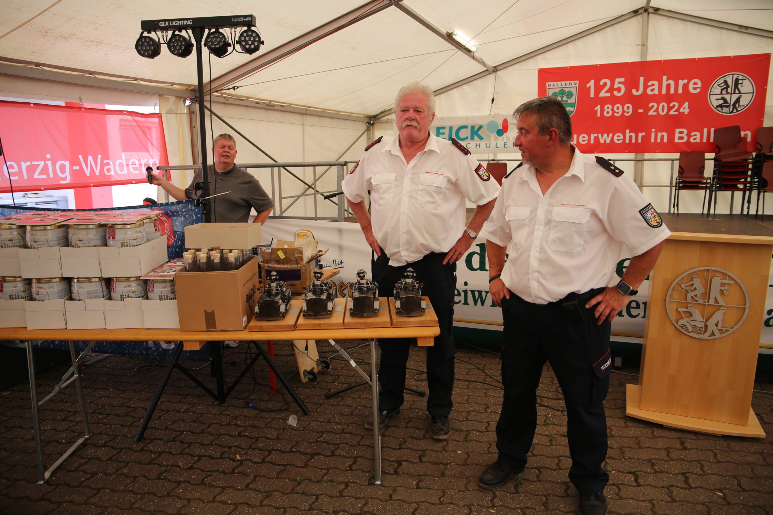 Zum Highlight am folgenden Sonntagnachmittag fand in der ca. 1300 Einwohnergemeinde Ballern die historische Oltimerparade durch Ballern mit zahlreichen Teilnehmer aus der Großregion und dem benachbarten Rheinland-Pfalz statt. Besonderes Aufsehen errangen die Zuschauer der 112 Jahre DELAHAYE AP 59 aus Privatbesitz. Ihr Einsatzgebiet war in Grenoble und stand viele Jahre in einer Garage in der Nähe von Paris. Mit viel Liebe und Arrangement wurde das Löschfahrzeug mit der Alterswehr und dem Löschbezirk Fitten restauriert. Auch die legendäre und liebevoll genannte „Santa Maria“; der Feuerwehr Saarburg -Löschzug Mitte- fuhr mit ihren 75 Jahren auf dem Rad nach Ballern. Auch Vertreter des Feuerwehr Erlebnis Museum aus Hermeskeil nahm mit einigen Oldtimern teil.( Hinweis: Am 6.9.24 findet in Hermeskeil das Oltimertreffen der Blaulichtfamilie und Nutzfahrzeuge statt) Zum Abschluss der Parade fand die Siegerehrung der Oltimer mit ihren Fahrer im Festzelt durch Übergabe von Präsenten statt.