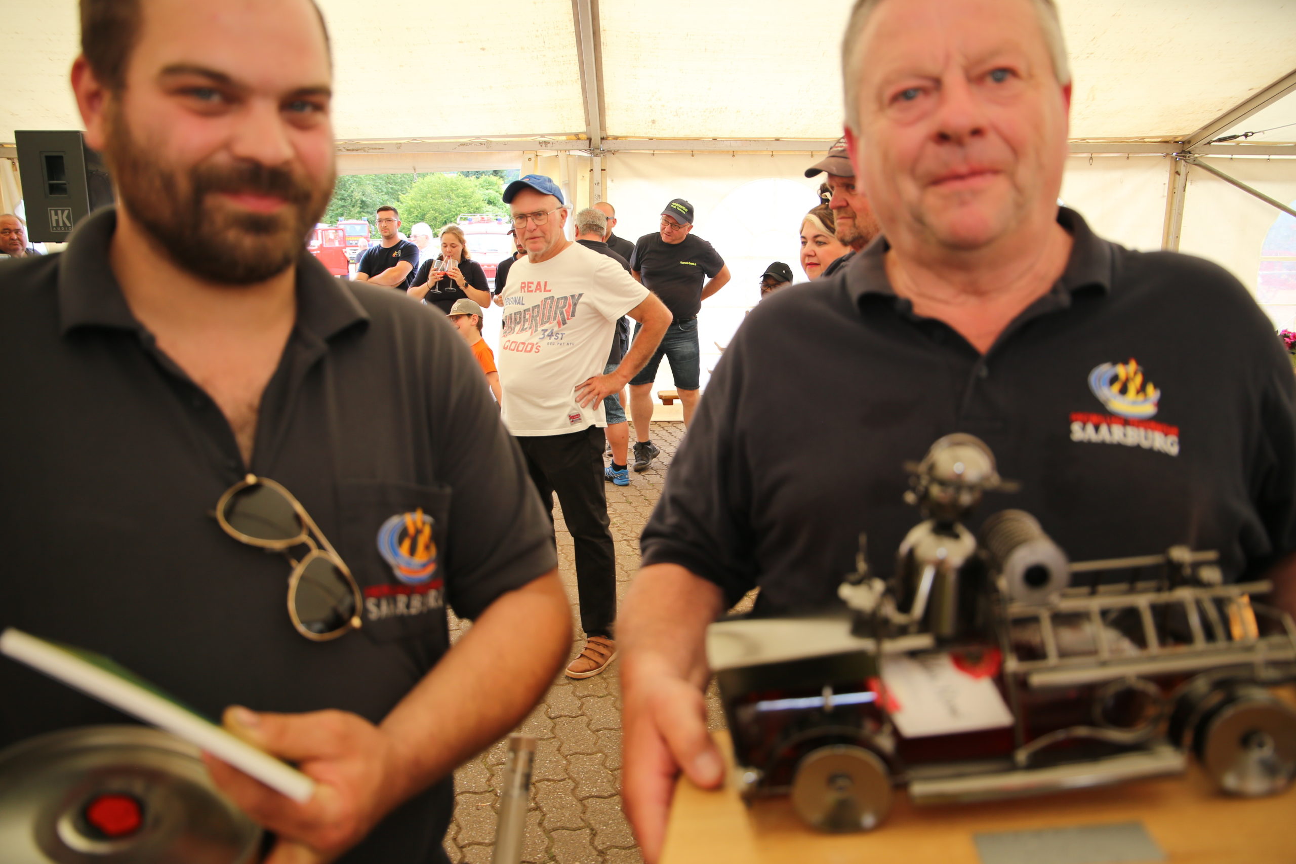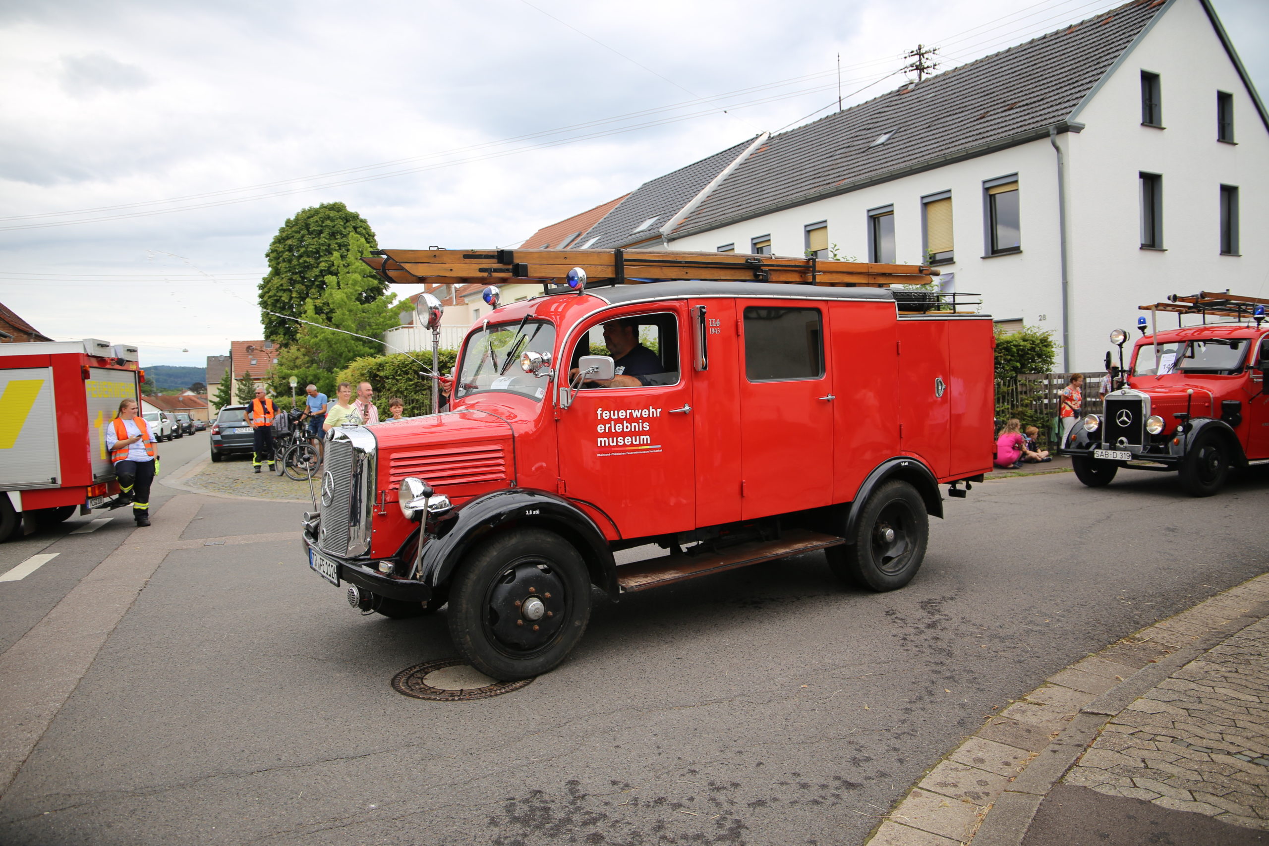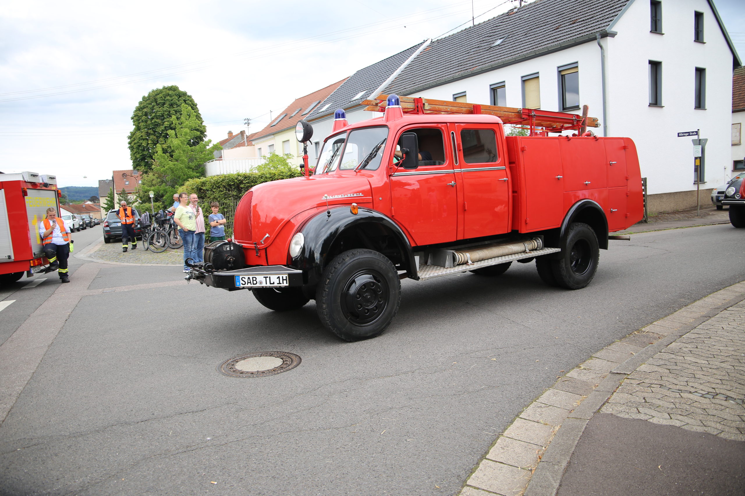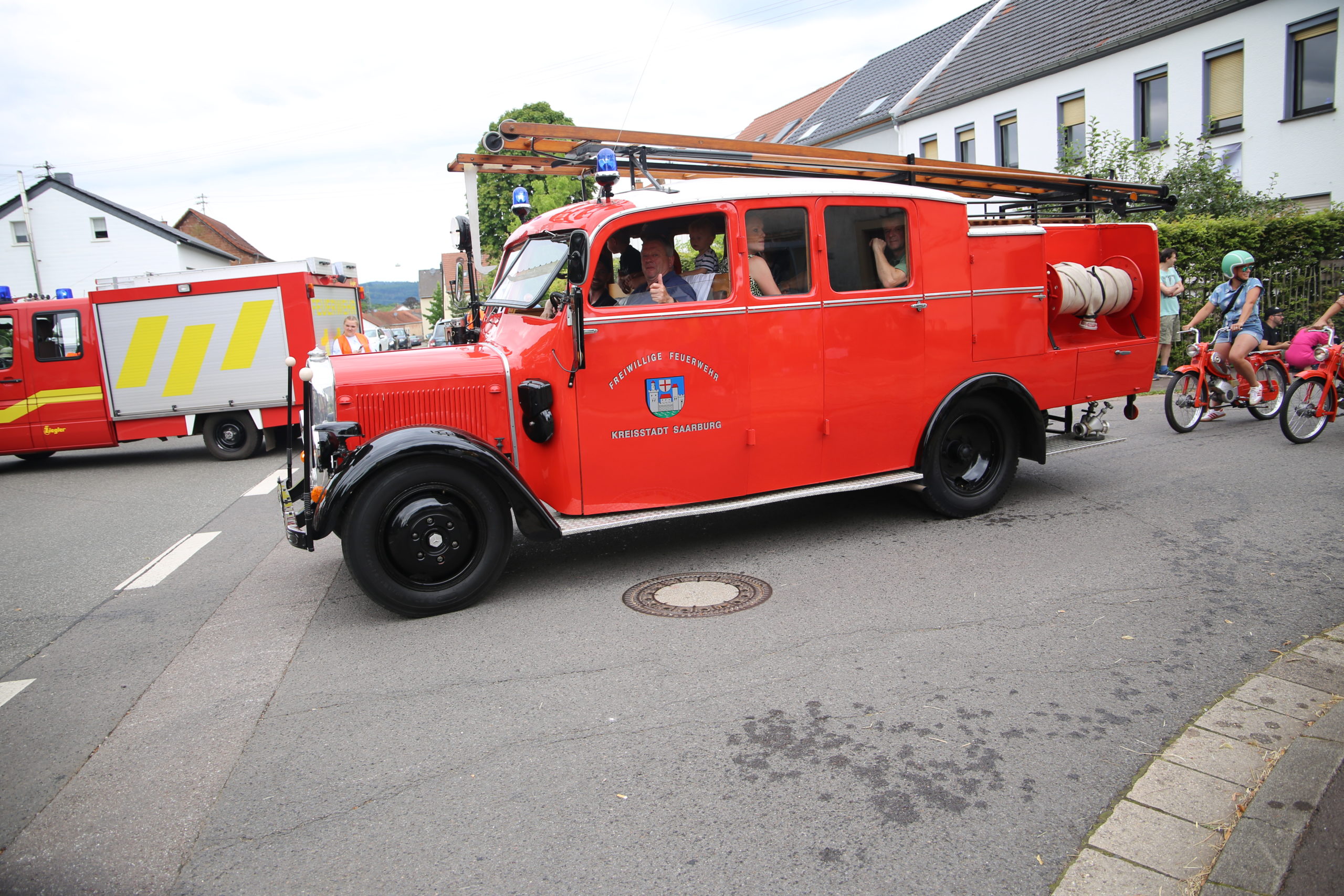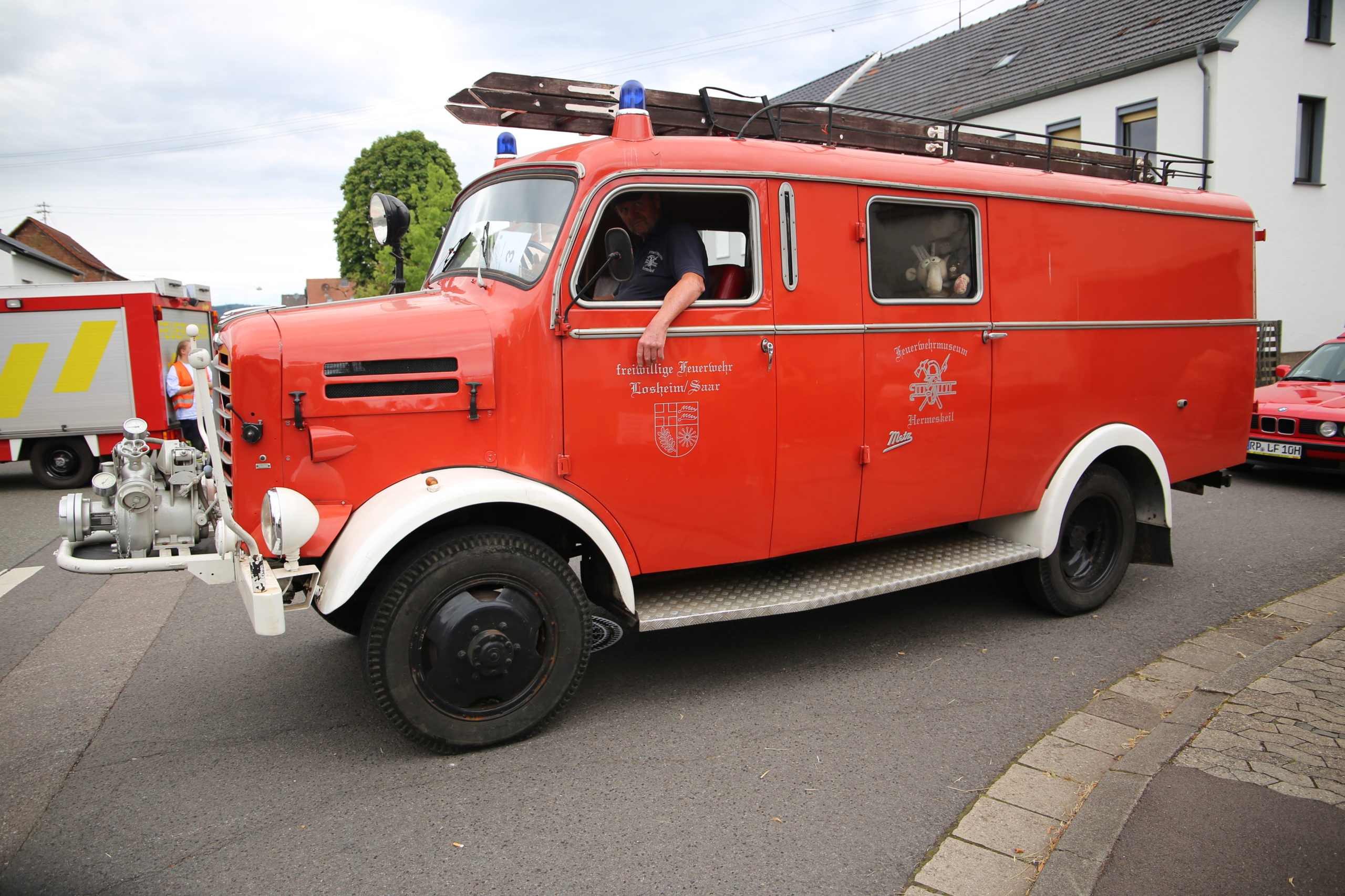 Zum Highlight am folgenden Sonntagnachmittag fand in der ca. 1300 Einwohnergemeinde Ballern die historische Oltimerparade durch Ballern mit zahlreichen Teilnehmer aus der Großregion und dem benachbarten Rheinland-Pfalz statt. Besonderes Aufsehen errangen die Zuschauer der 112 Jahre DELAHAYE AP 59 aus Privatbesitz. Ihr Einsatzgebiet war in Grenoble und stand viele Jahre in einer Garage in der Nähe von Paris. Mit viel Liebe und Arrangement wurde das Löschfahrzeug mit der Alterswehr und dem Löschbezirk Fitten restauriert. Auch die legendäre und liebevoll genannte „Santa Maria“; der Feuerwehr Saarburg -Löschzug Mitte- fuhr mit ihren 75 Jahren auf dem Rad nach Ballern. Auch Vertreter des Feuerwehr Erlebnis Museum aus Hermeskeil nahm mit einigen Oldtimern teil.( Hinweis: Am 6.9.24 findet in Hermeskeil das Oltimertreffen der Blaulichtfamilie und Nutzfahrzeuge statt) Zum Abschluss der Parade fand die Siegerehrung der Oltimer mit ihren Fahrer im Festzelt durch Übergabe von Präsenten statt.