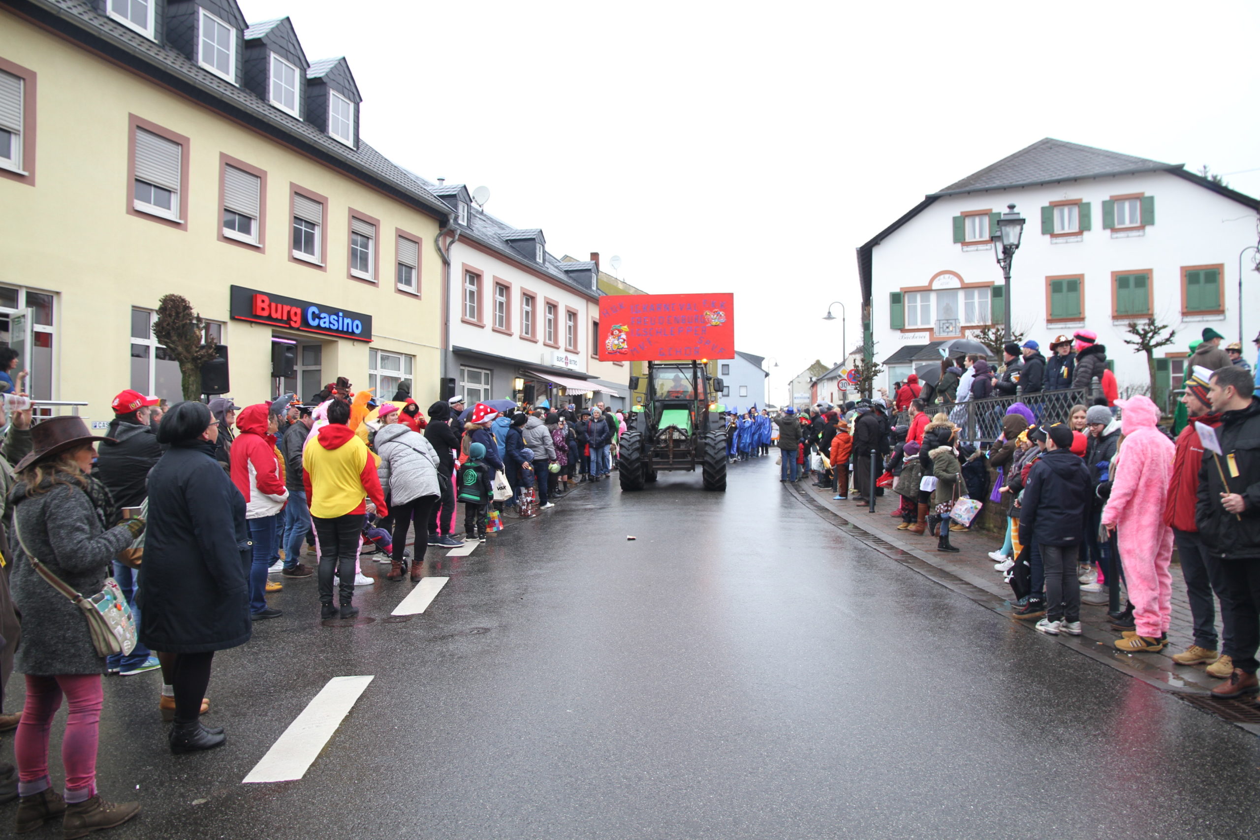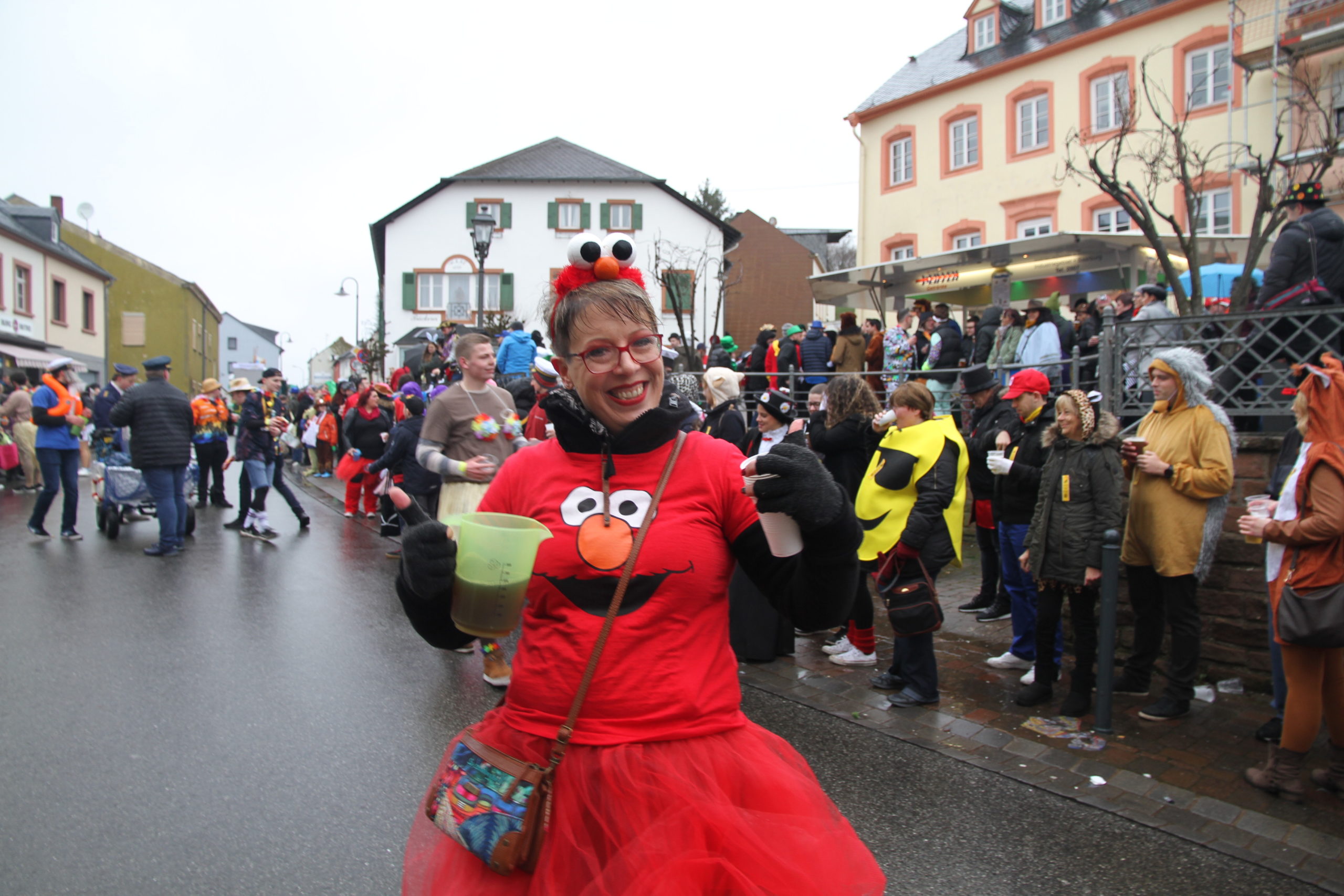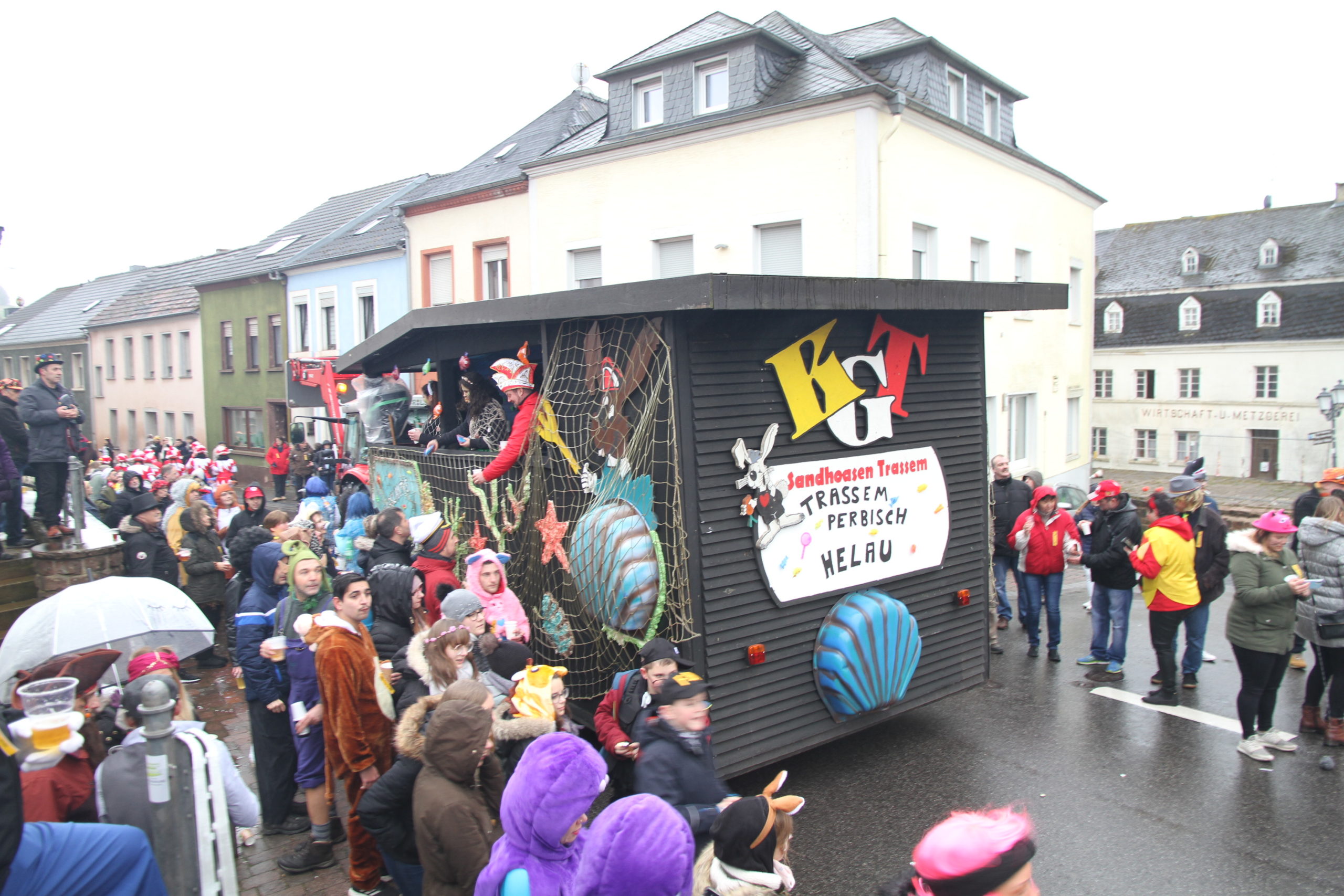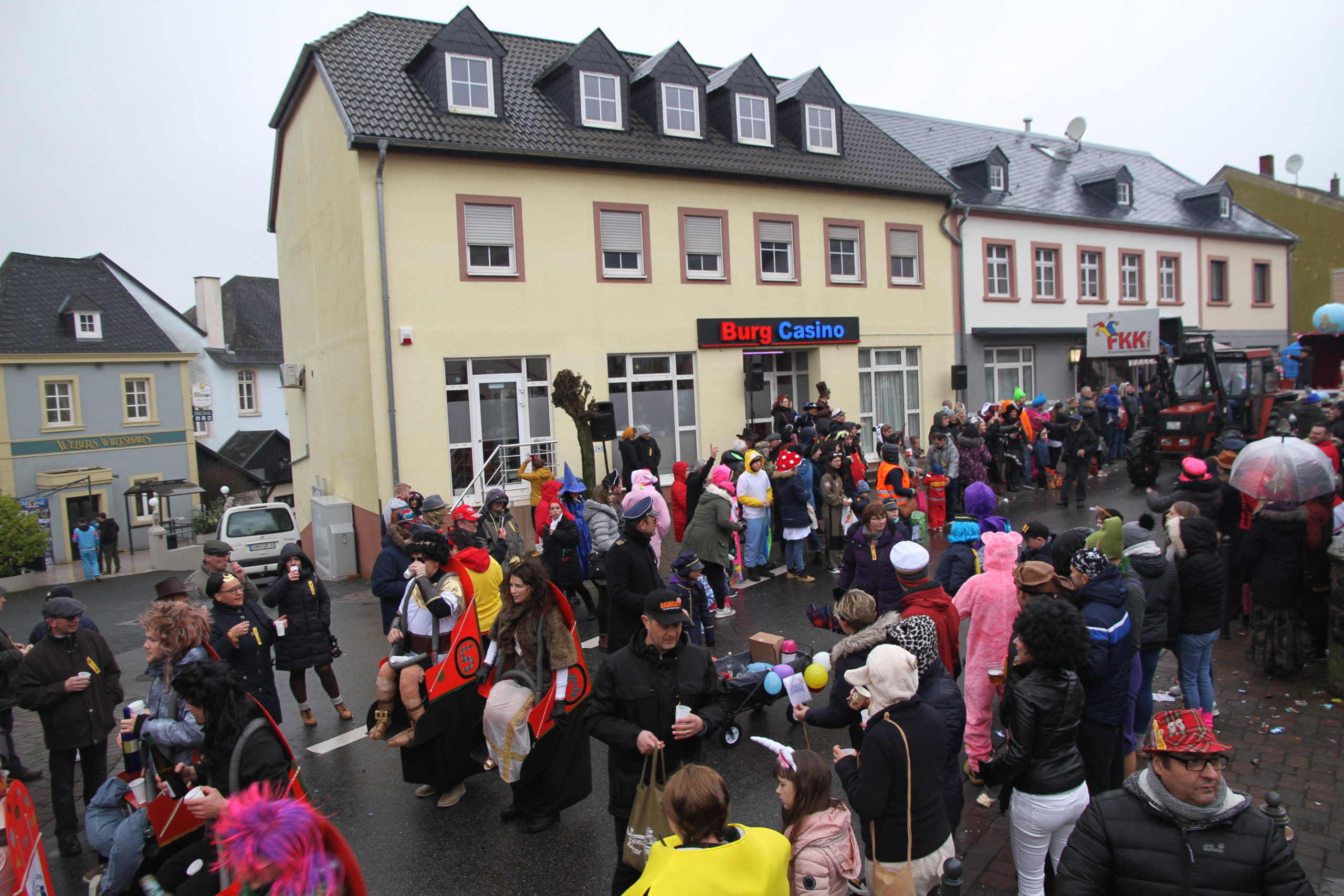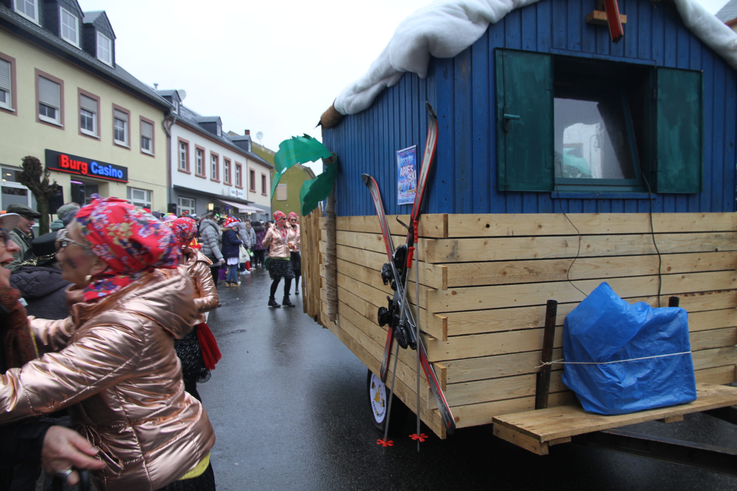 Freudenburg. Zehn Wagen und zwölf Fußgruppen, darunter zwei Musikvereine beteiligten sich am Umzug in Freudenburg. Viele Besucher trotzten den ungemütlichen Witterungsbedingungen , insbesondere füllte sich der Marktplatz von Narren schon lange vor Eintreffen des Umzugs.