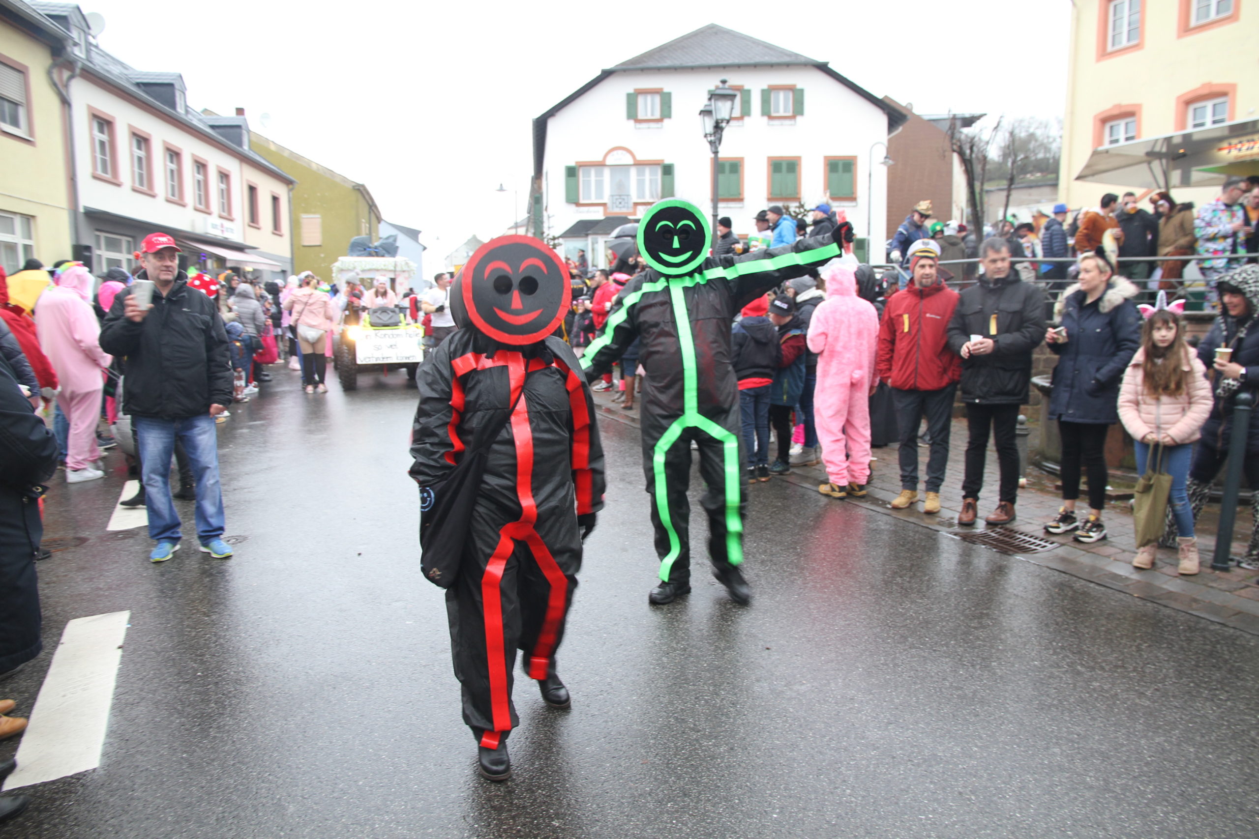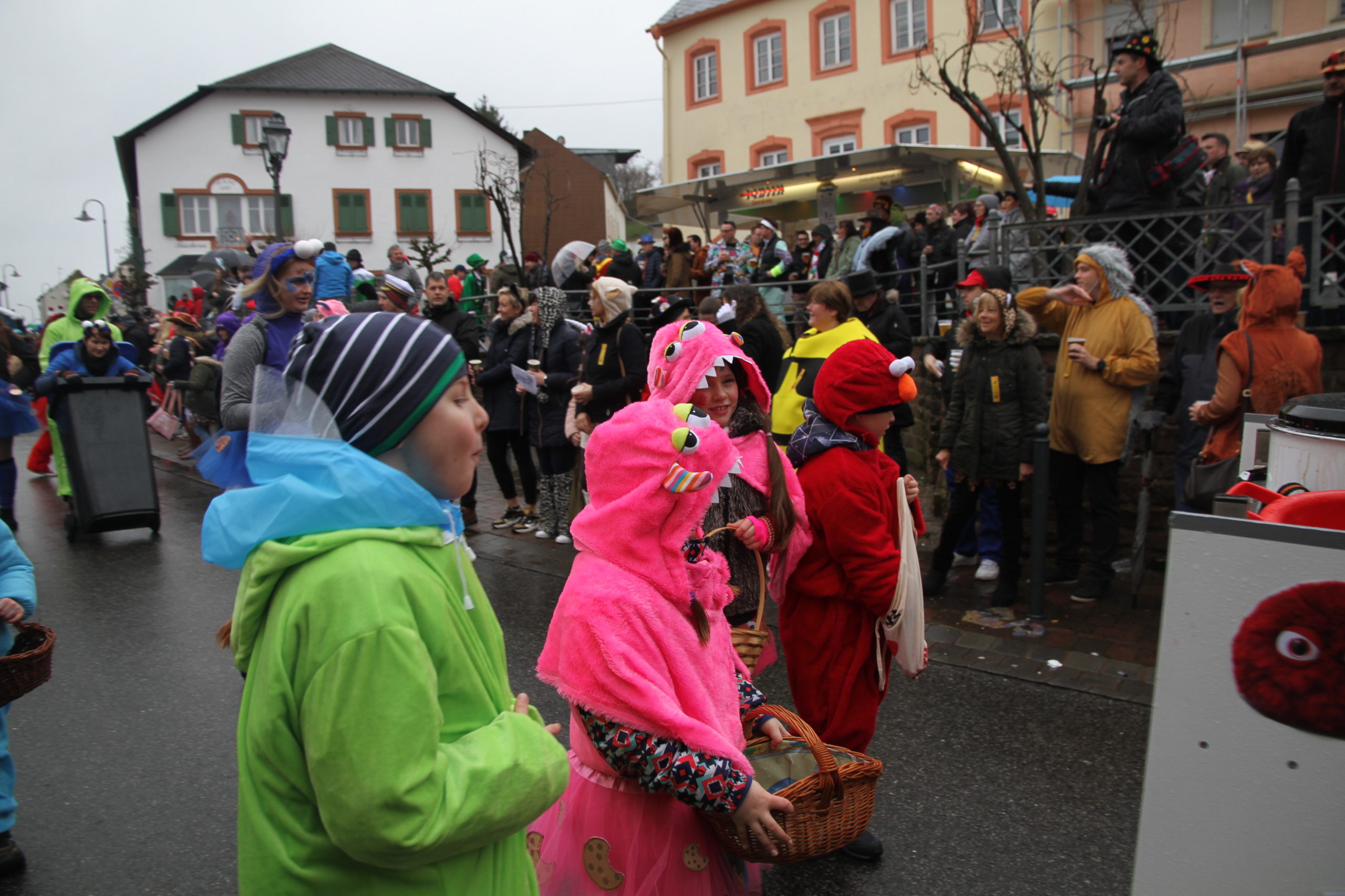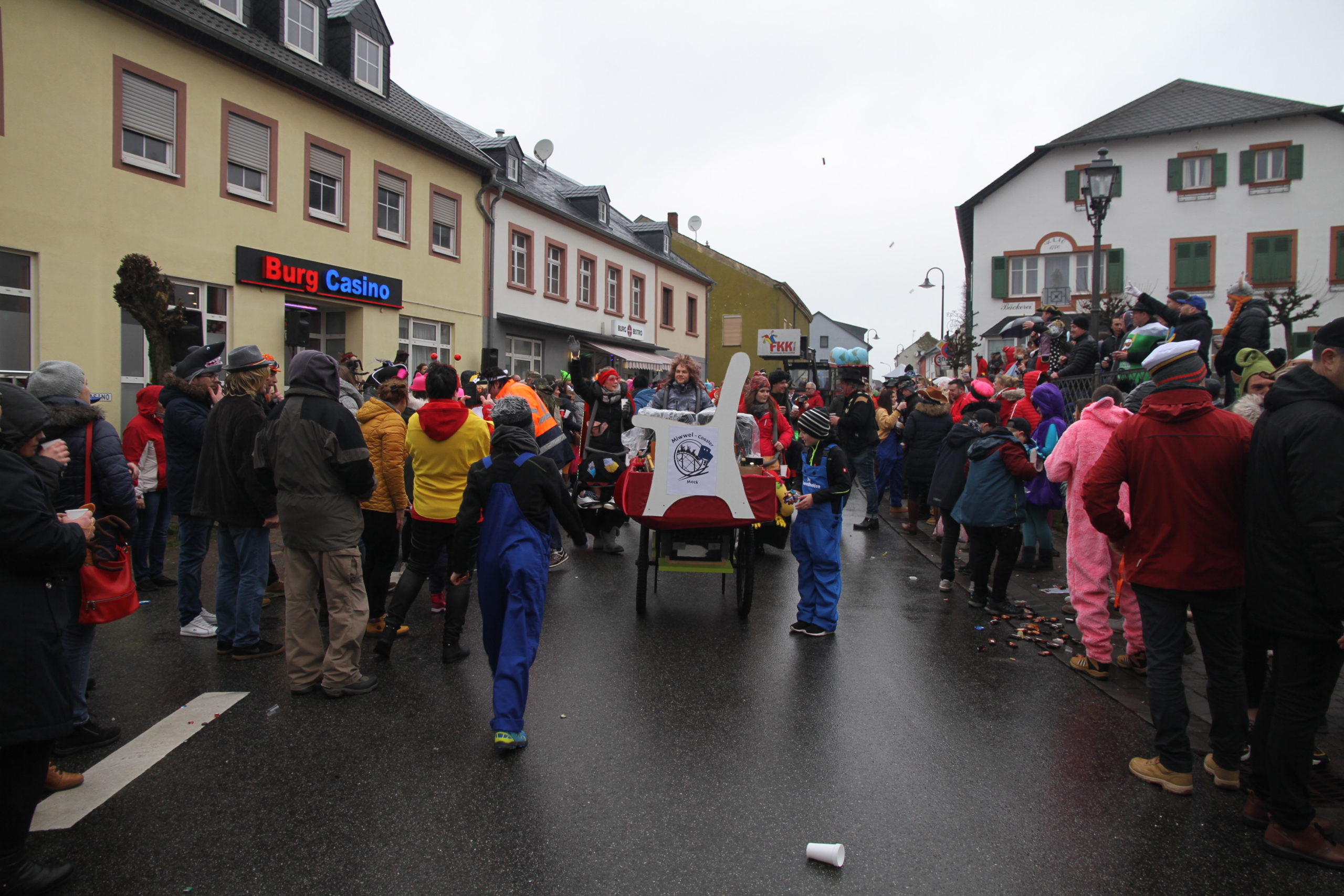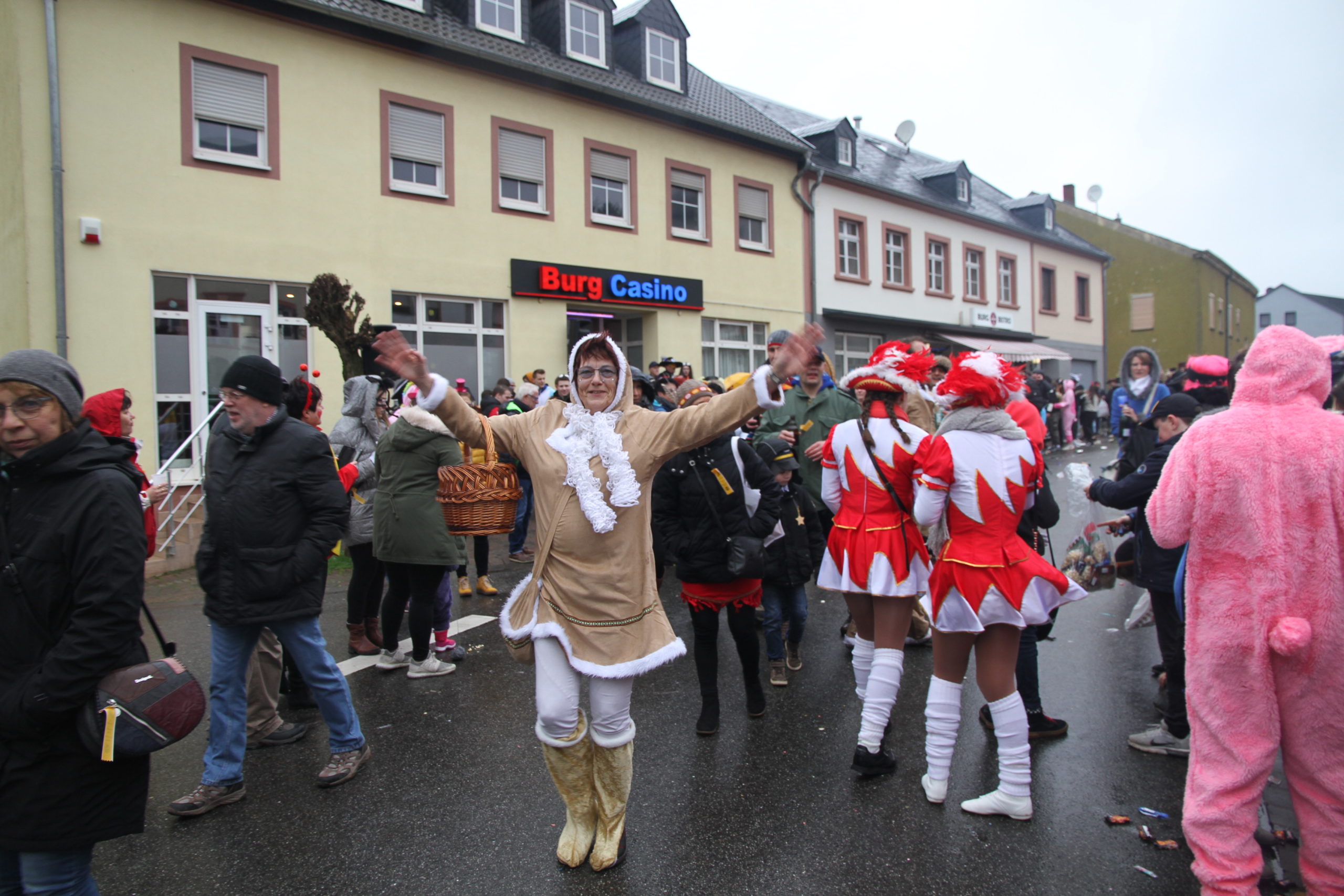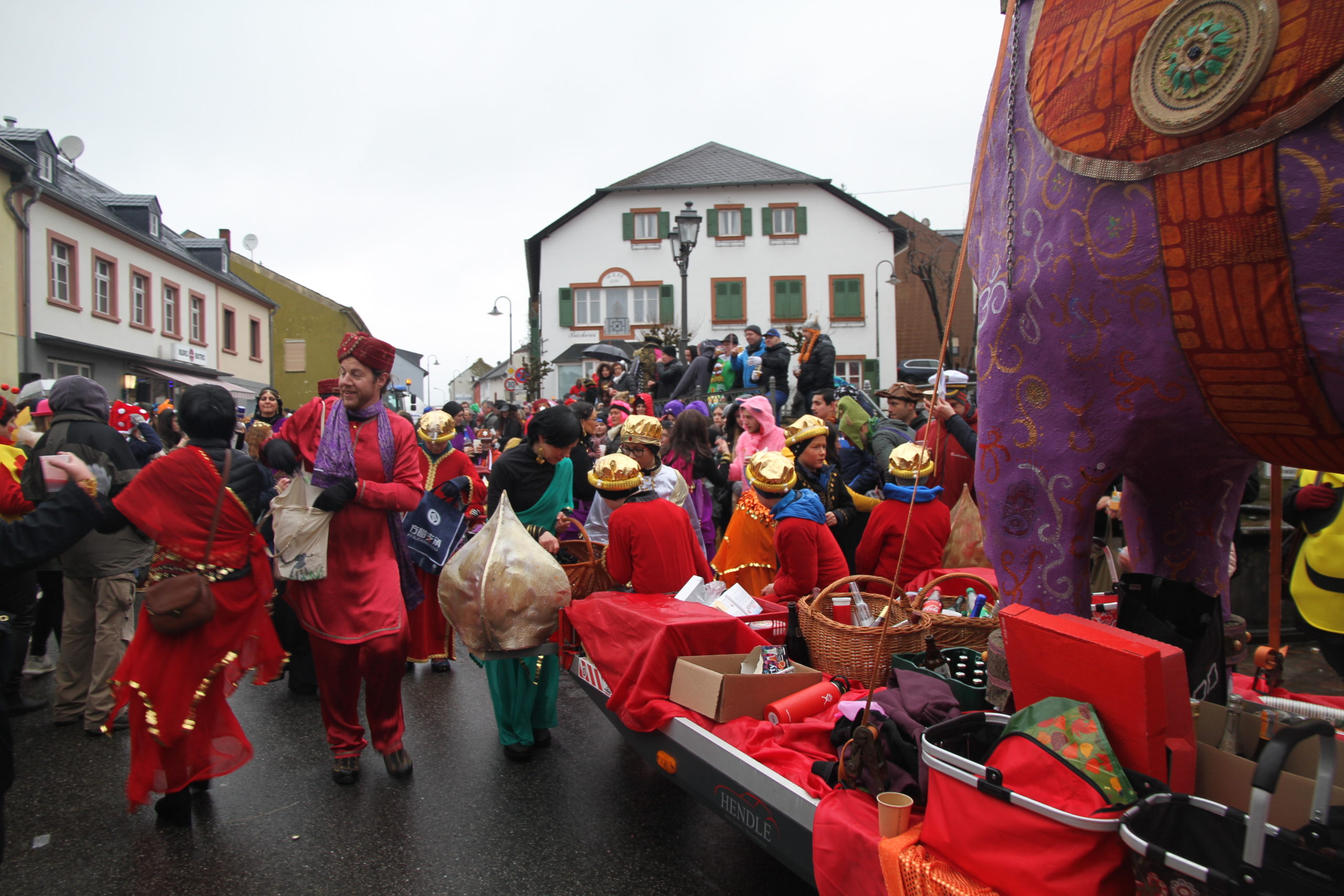 Freudenburg. Zehn Wagen und zwölf Fußgruppen, darunter zwei Musikvereine beteiligten sich am Umzug in Freudenburg. Viele Besucher trotzten den ungemütlichen Witterungsbedingungen , insbesondere füllte sich der Marktplatz von Narren schon lange vor Eintreffen des Umzugs.