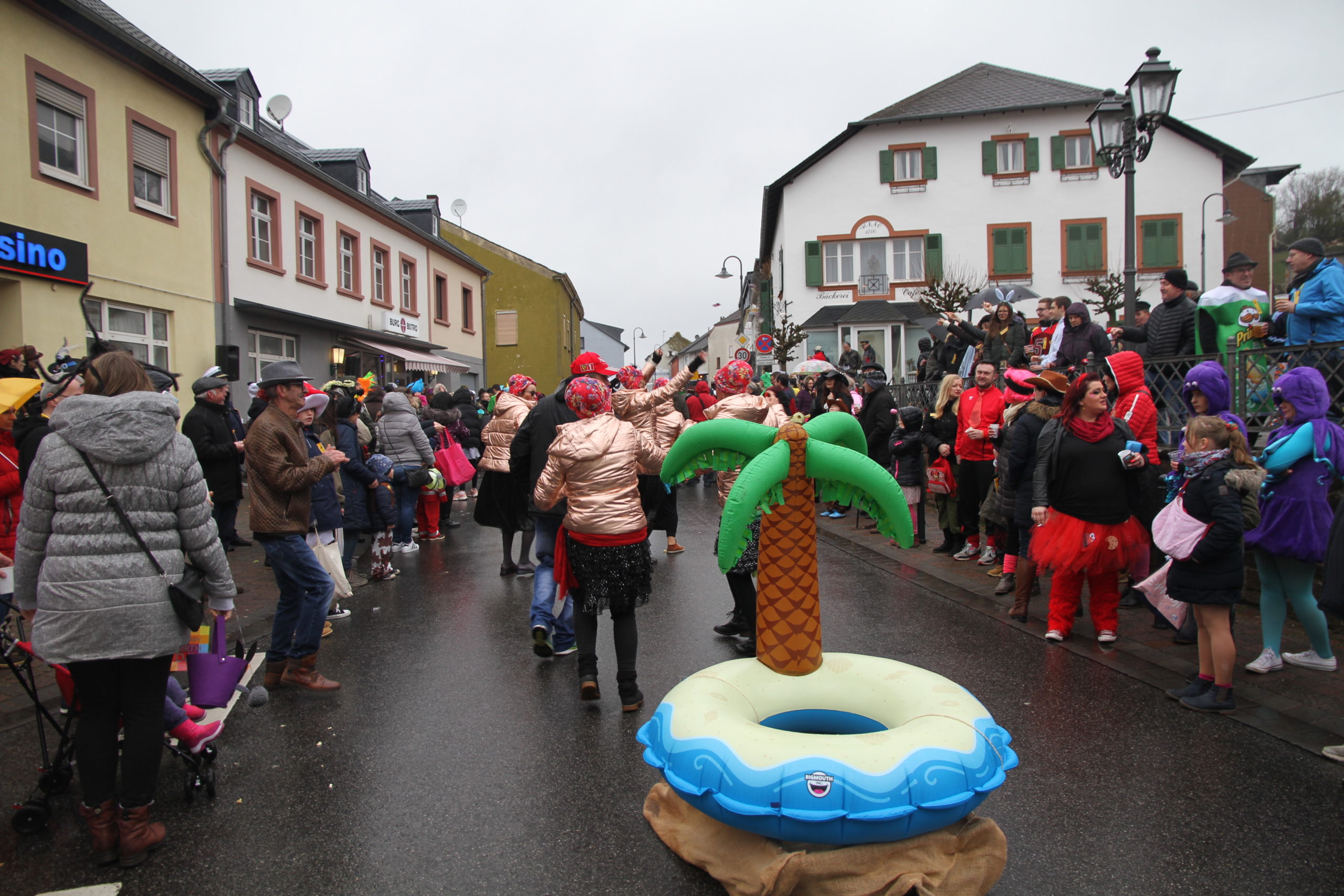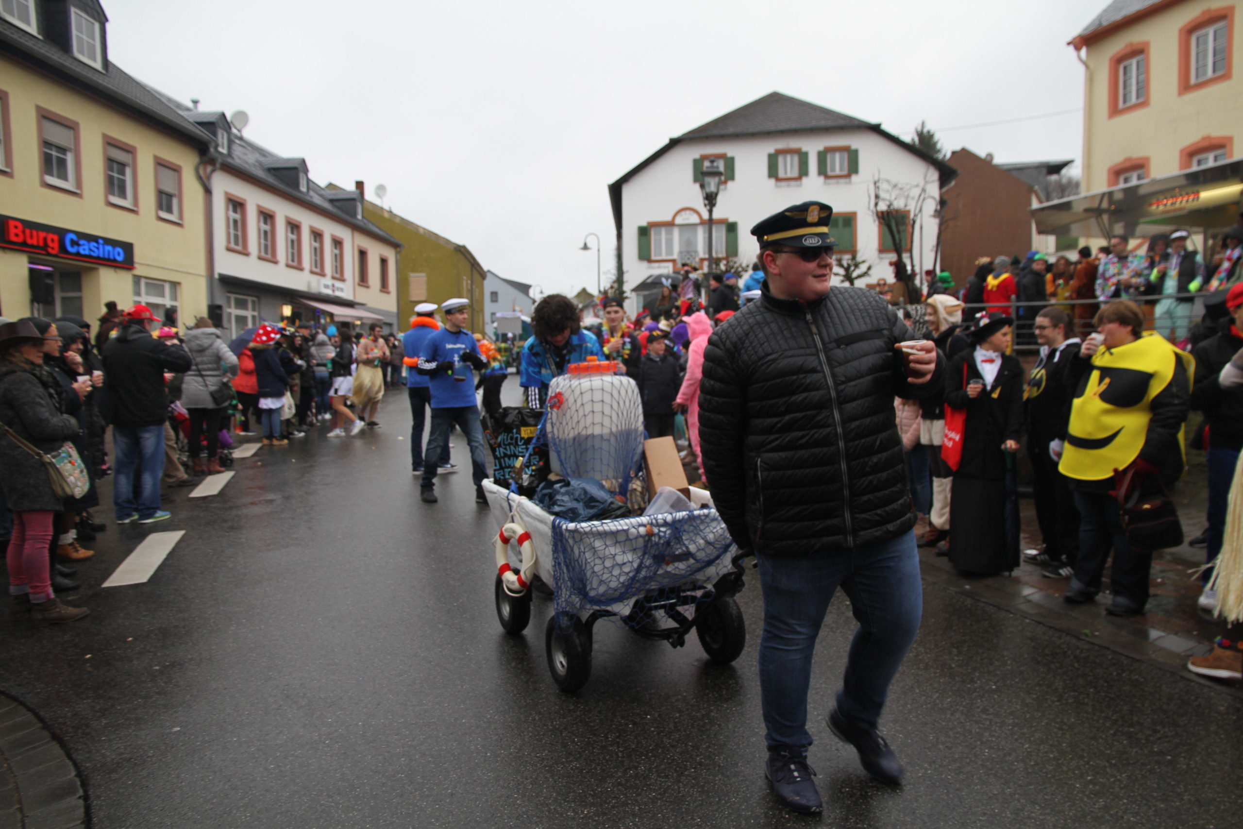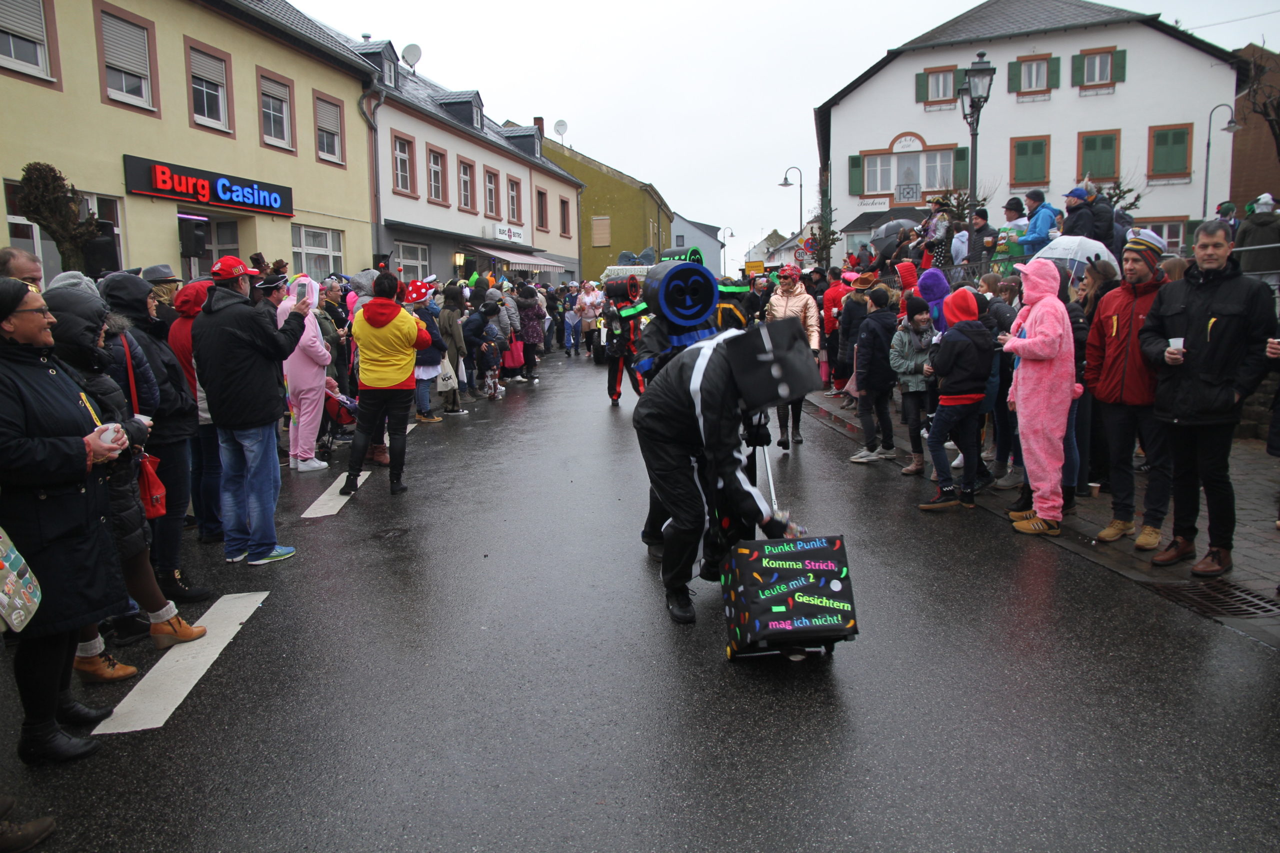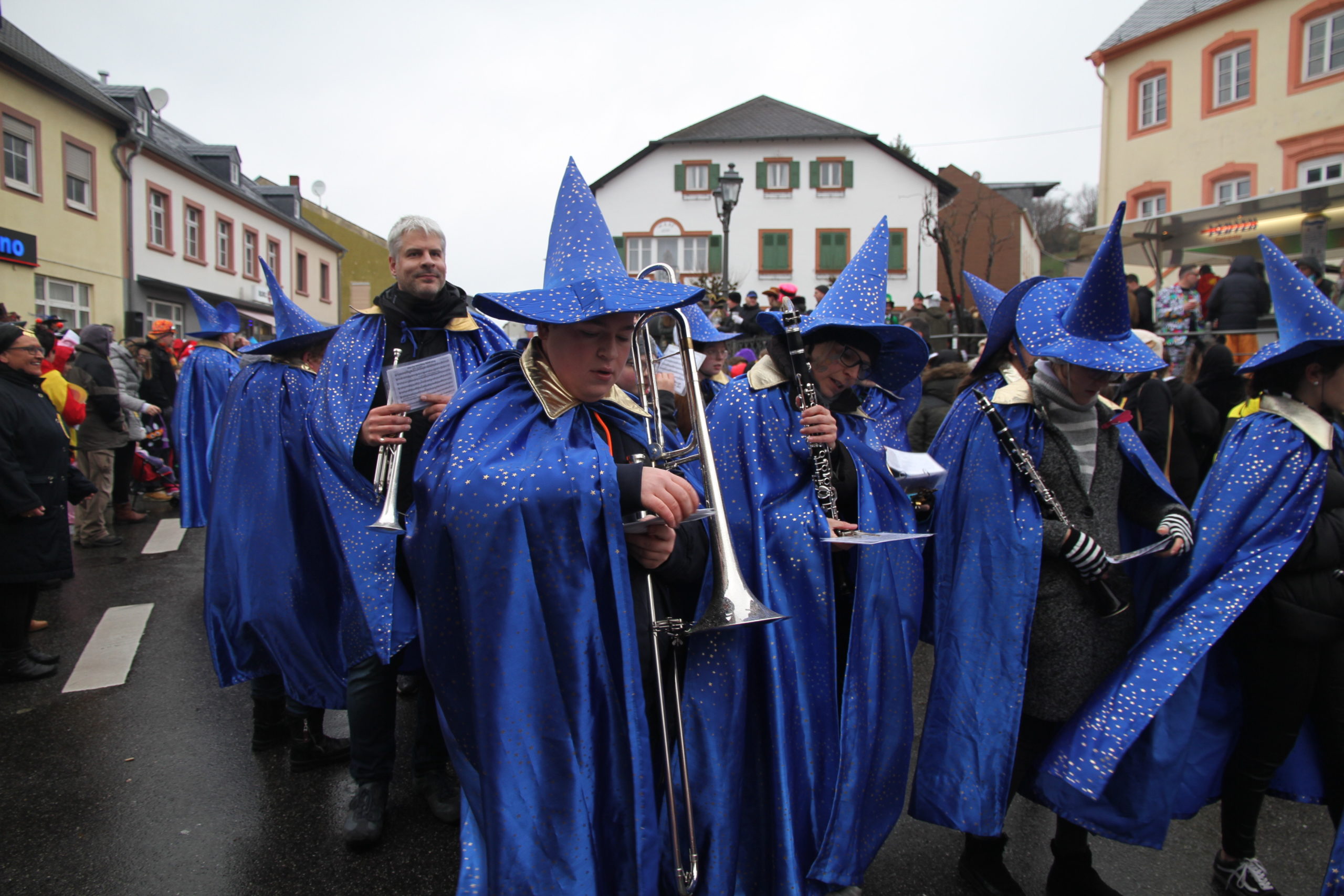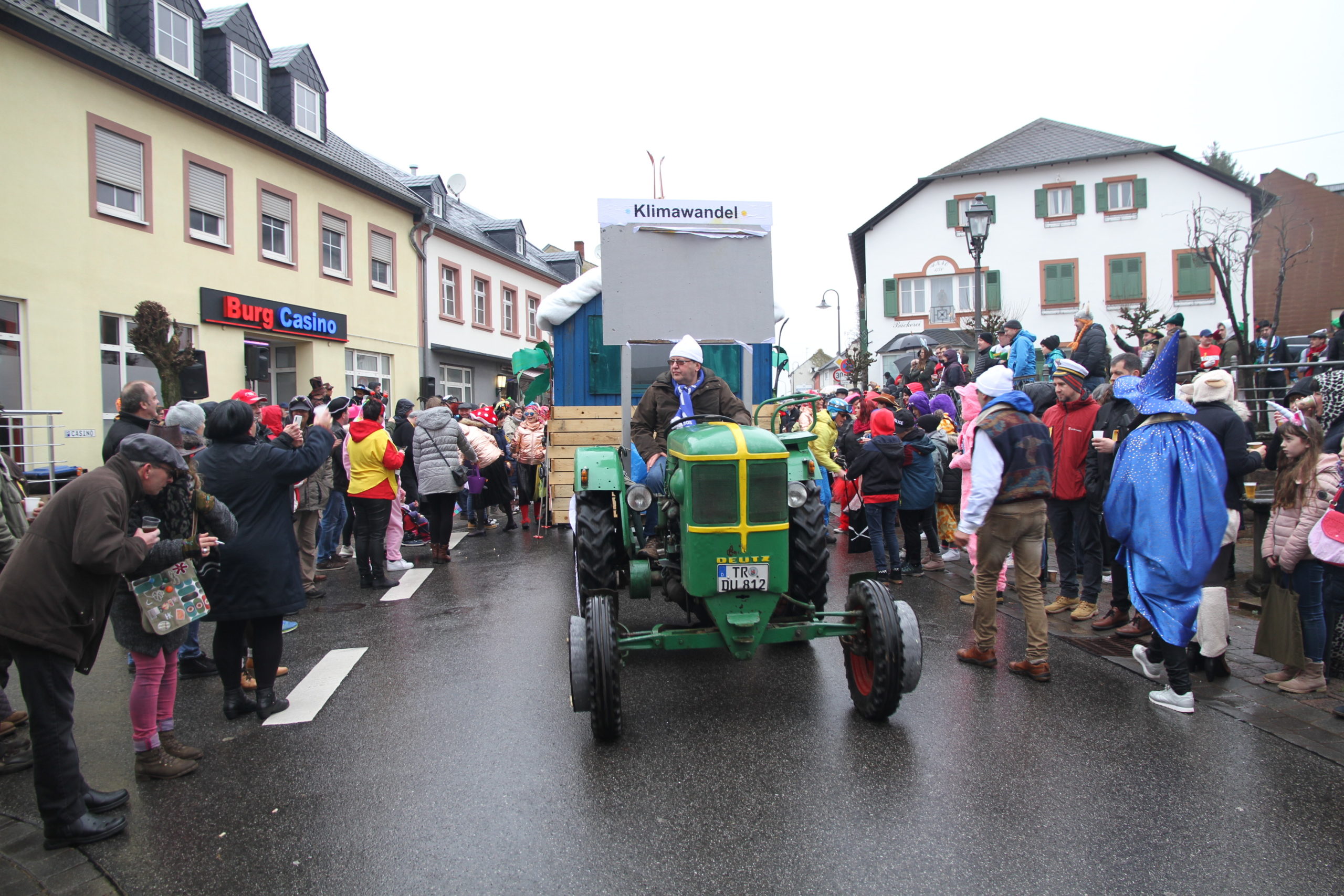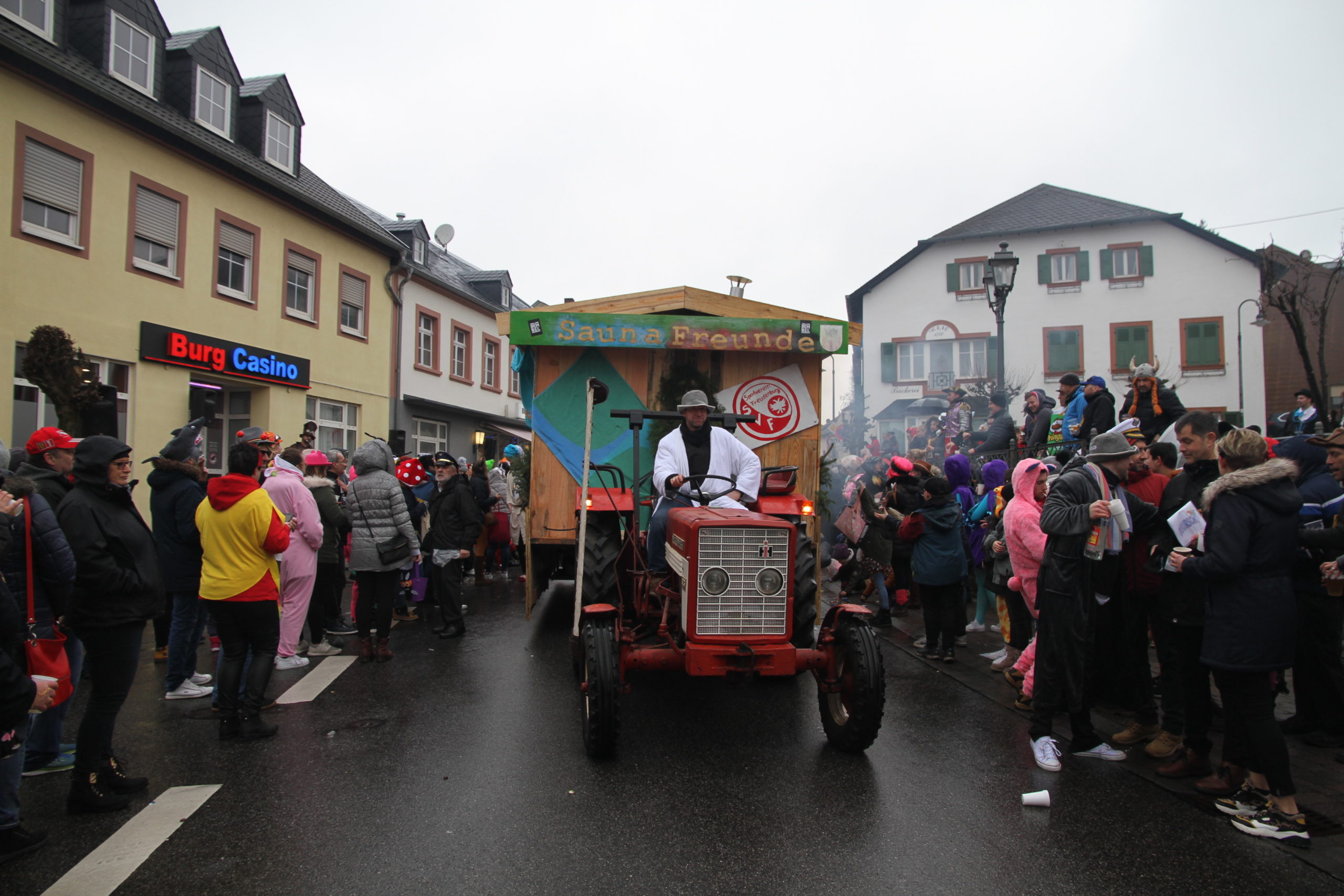 Freudenburg. Zehn Wagen und zwölf Fußgruppen, darunter zwei Musikvereine beteiligten sich am Umzug in Freudenburg. Viele Besucher trotzten den ungemütlichen Witterungsbedingungen , insbesondere füllte sich der Marktplatz von Narren schon lange vor Eintreffen des Umzugs.