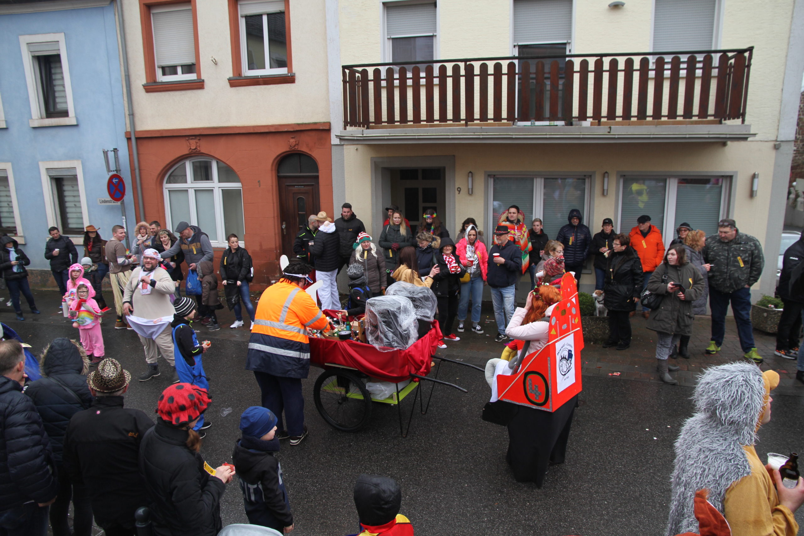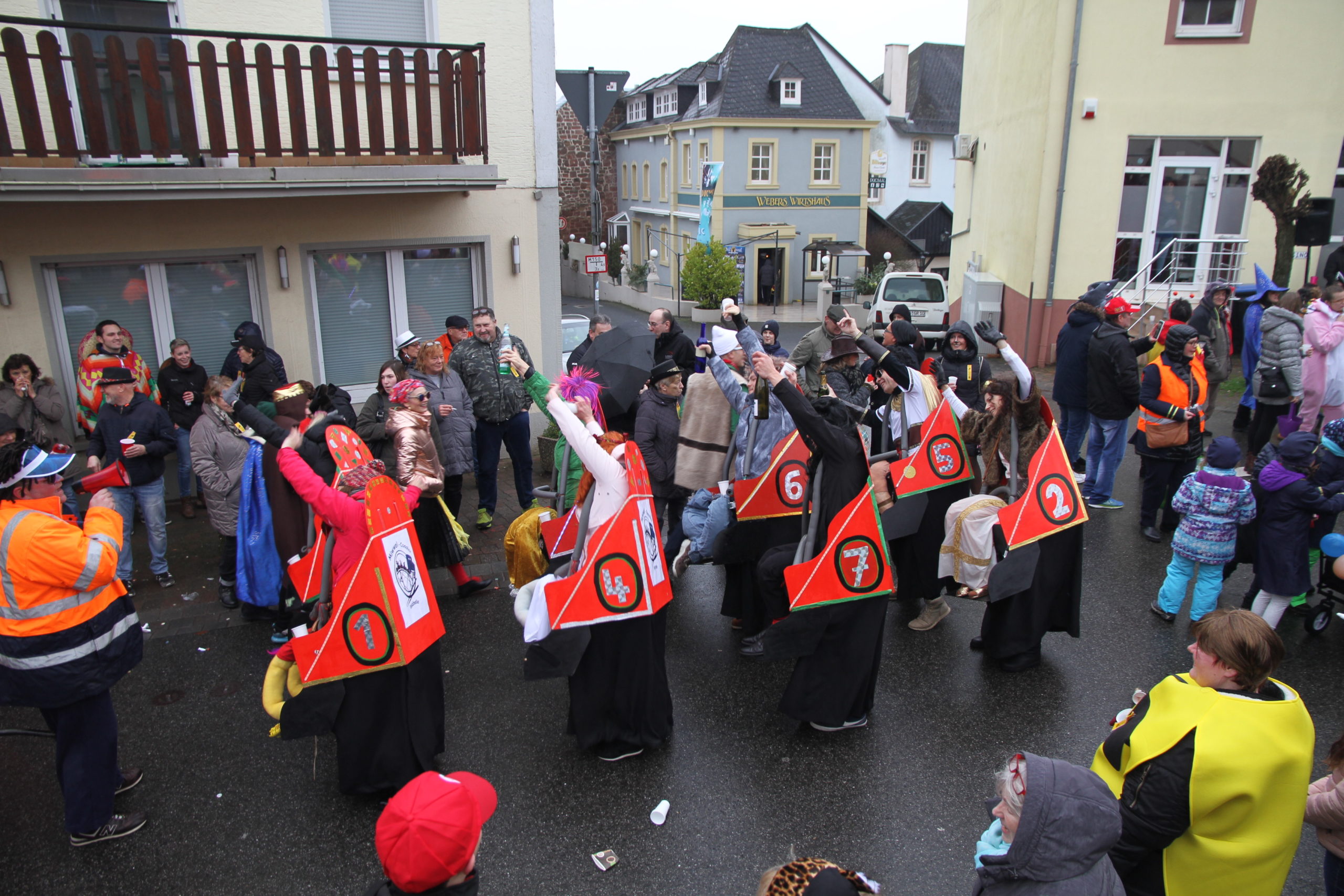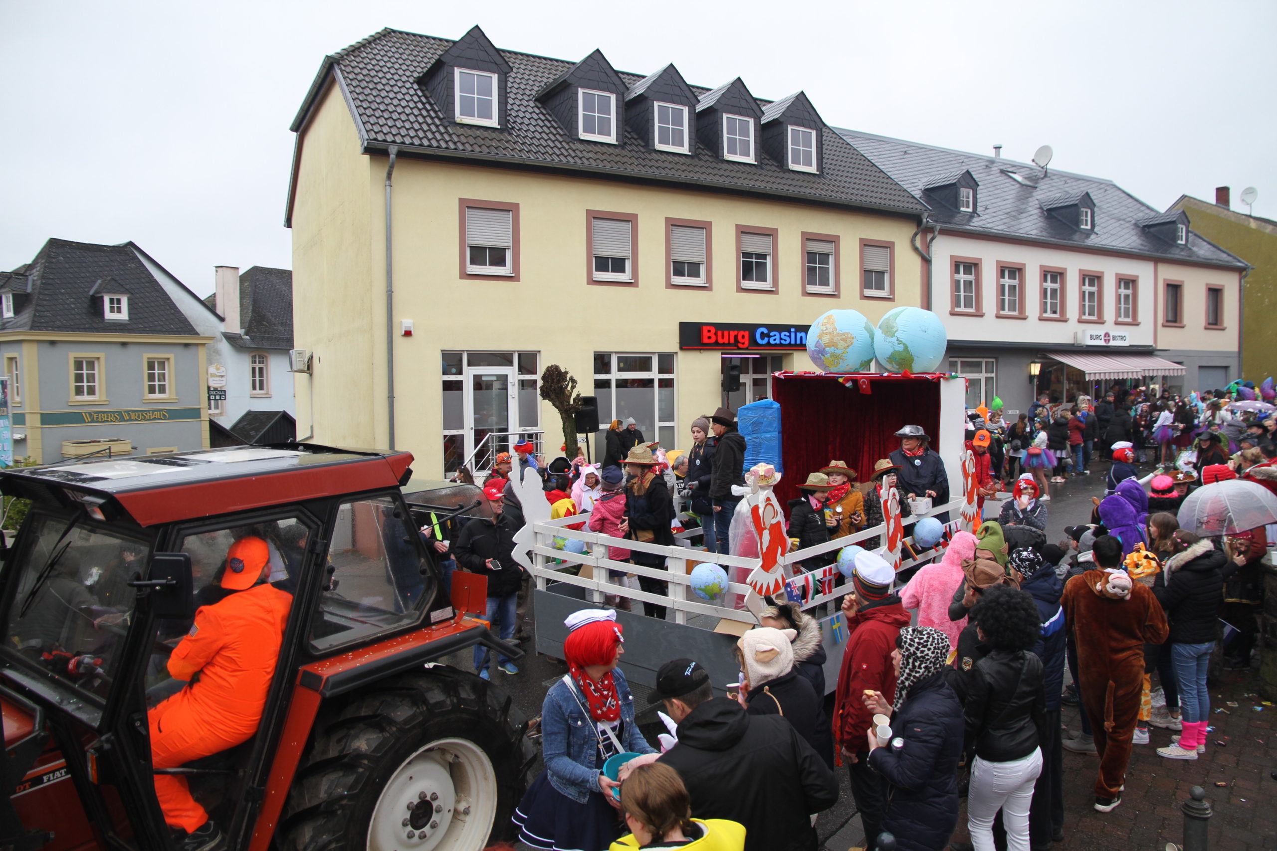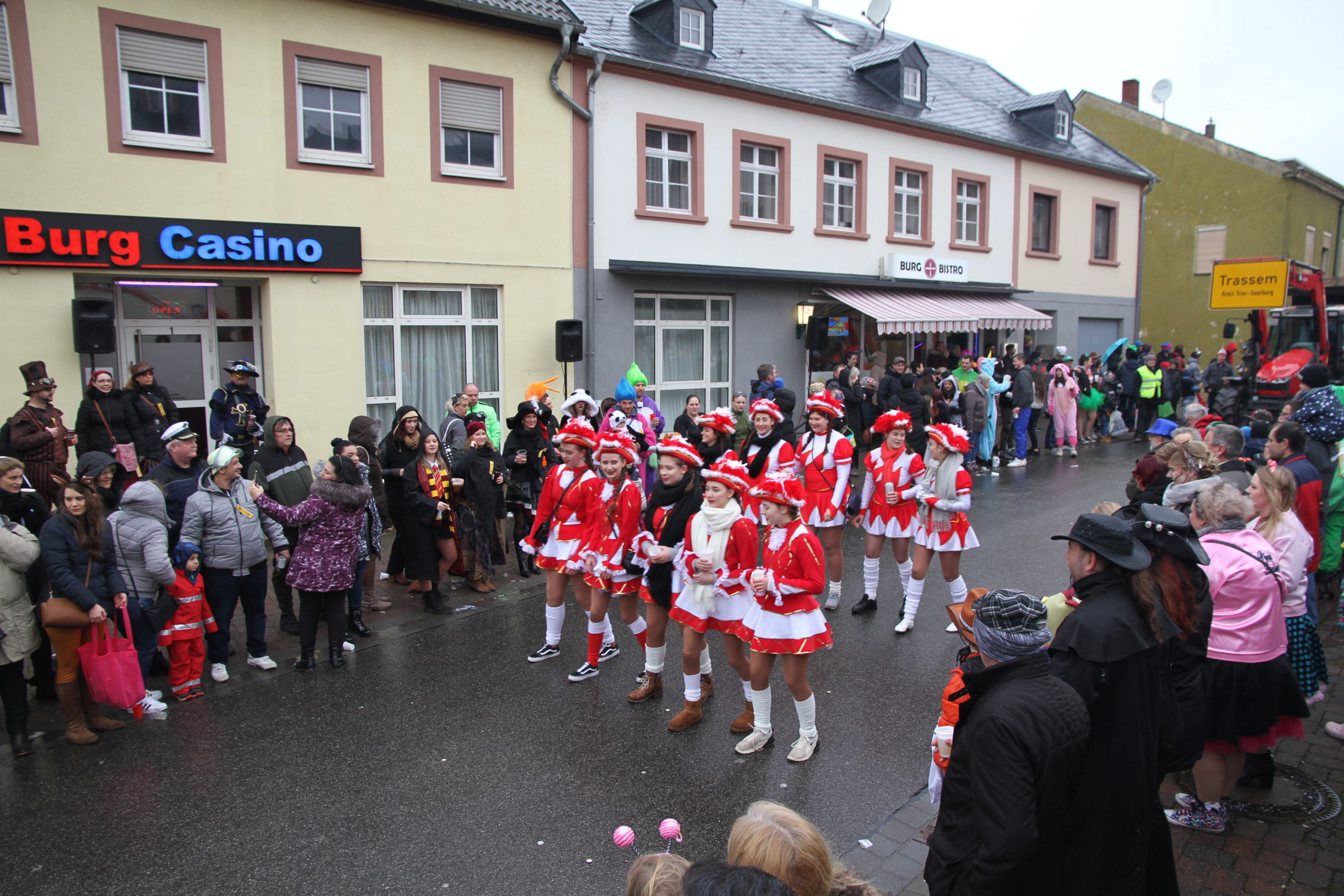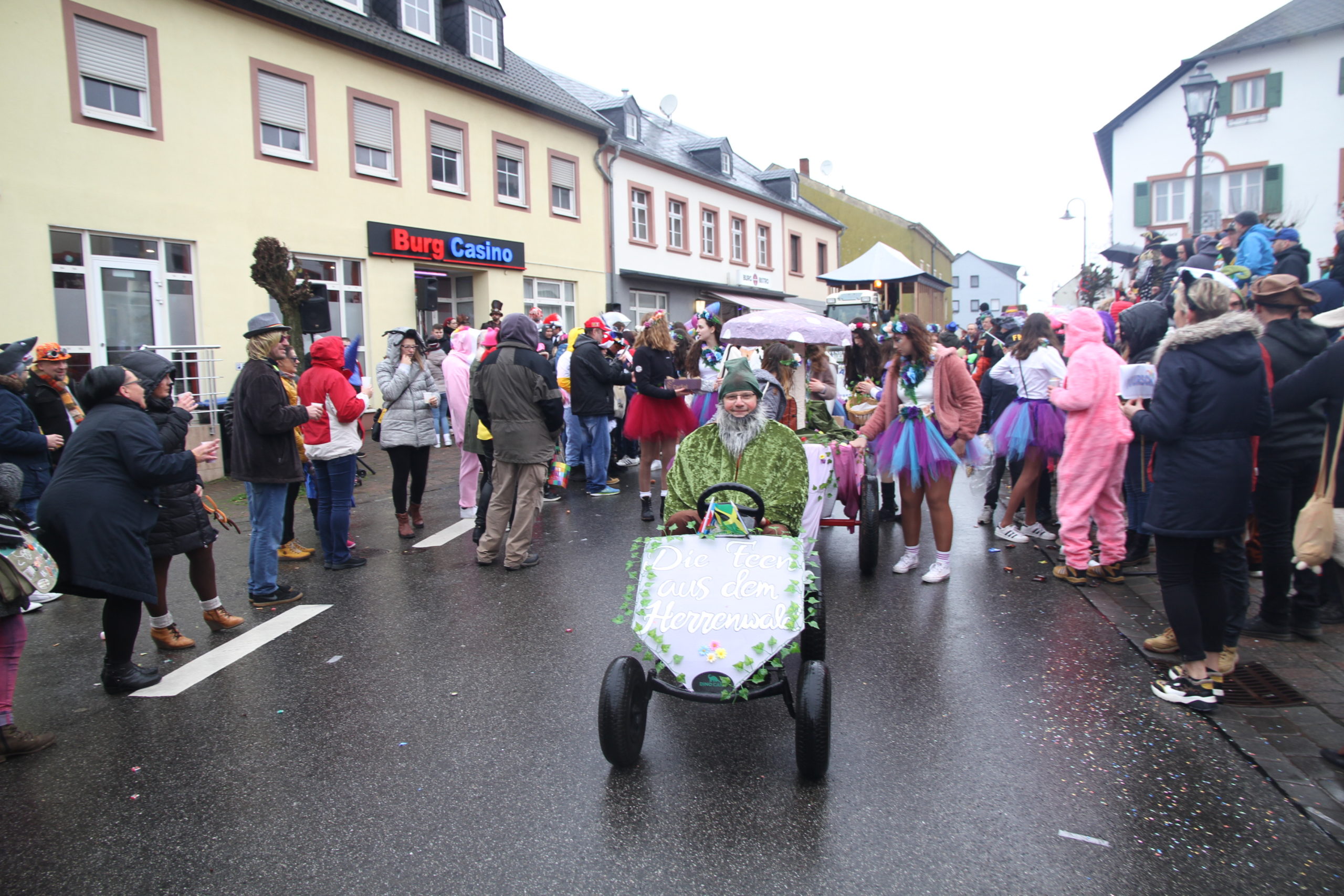 Freudenburg. Zehn Wagen und zwölf Fußgruppen, darunter zwei Musikvereine beteiligten sich am Umzug in Freudenburg. Viele Besucher trotzten den ungemütlichen Witterungsbedingungen , insbesondere füllte sich der Marktplatz von Narren schon lange vor Eintreffen des Umzugs.