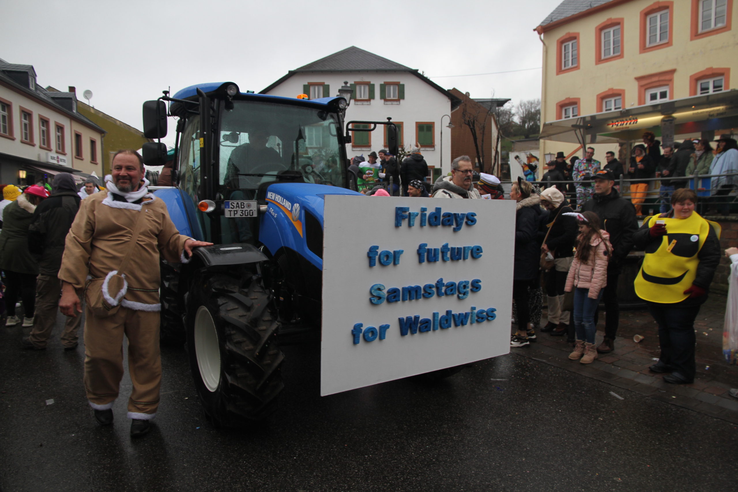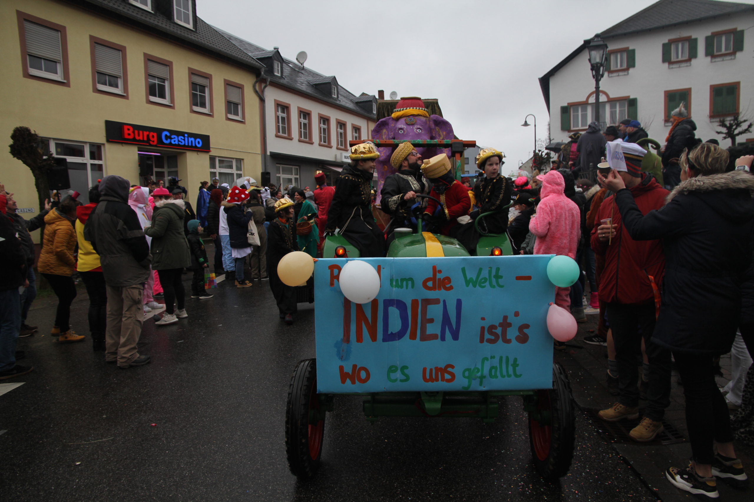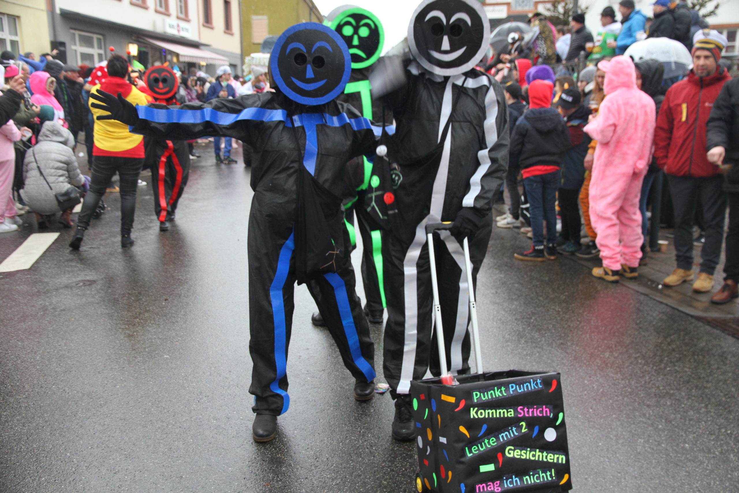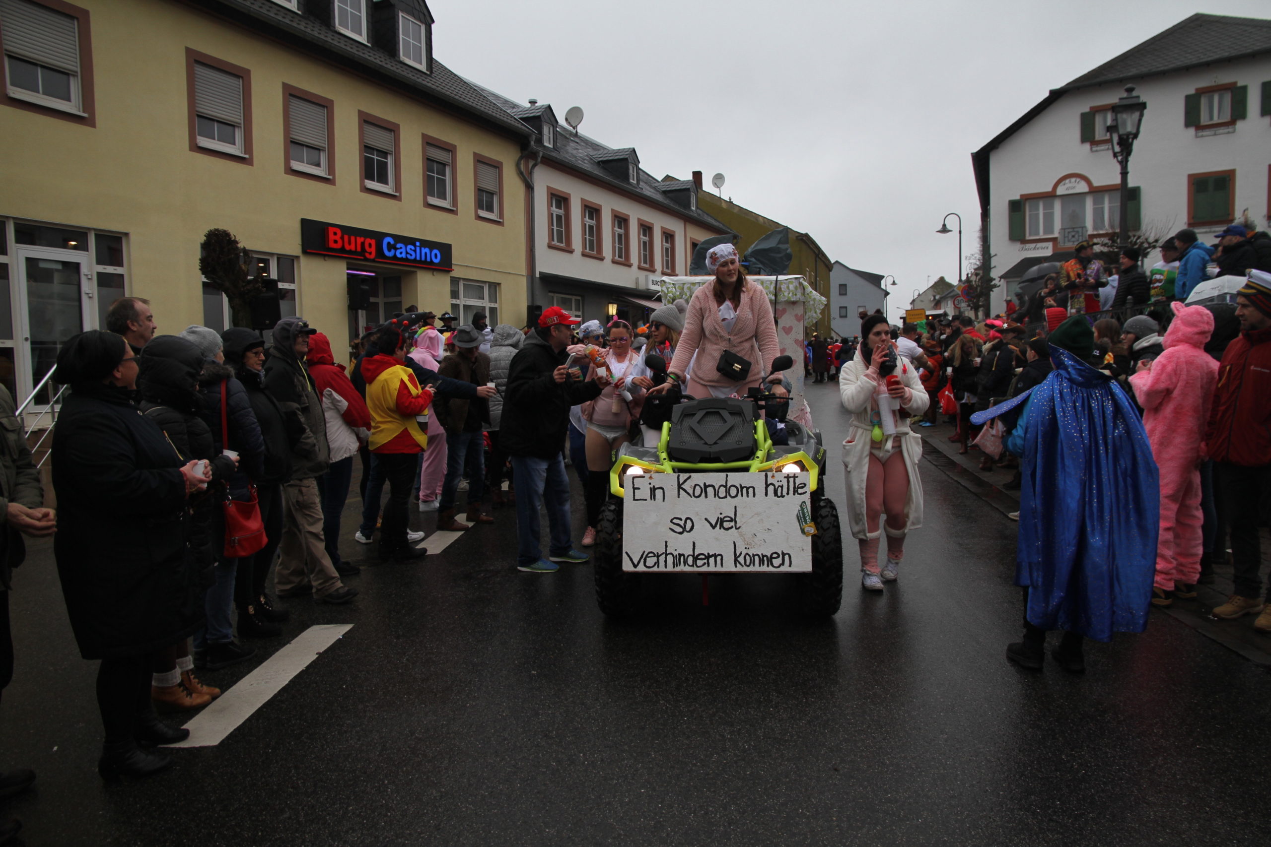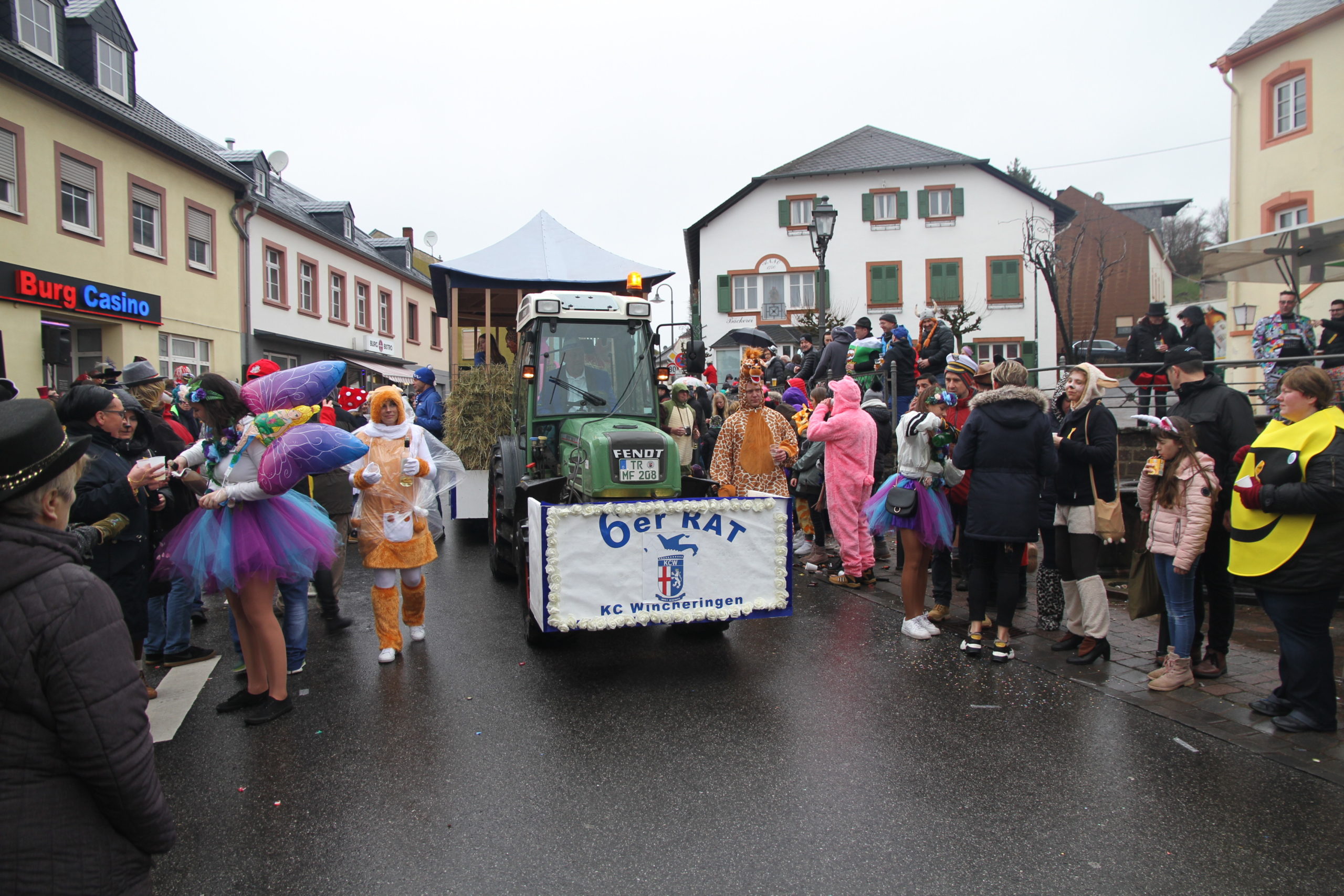 Freudenburg. Zehn Wagen und zwölf Fußgruppen, darunter zwei Musikvereine beteiligten sich am Umzug in Freudenburg. Viele Besucher trotzten den ungemütlichen Witterungsbedingungen , insbesondere füllte sich der Marktplatz von Narren schon lange vor Eintreffen des Umzugs.