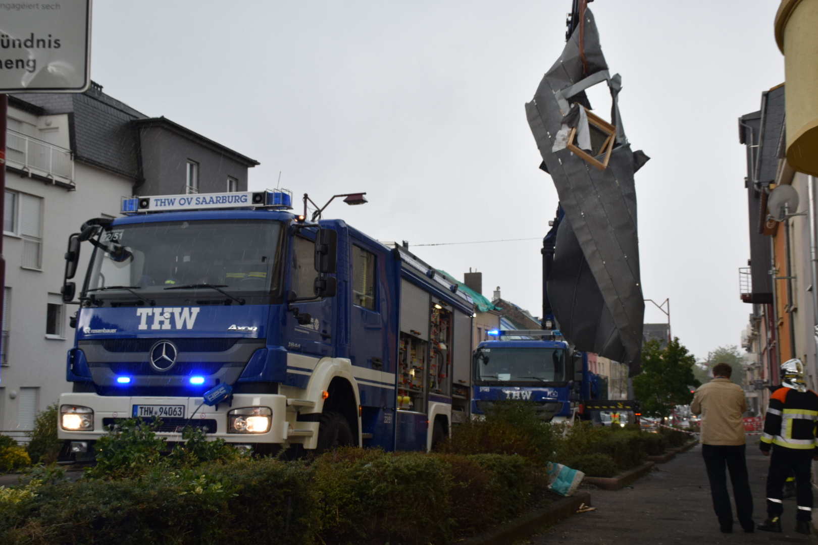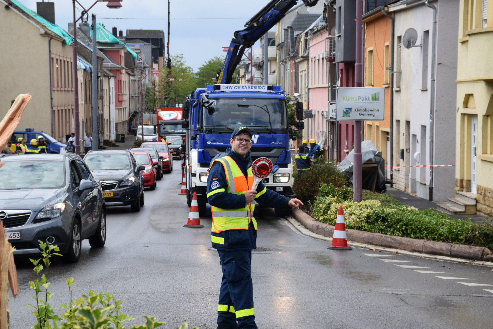 Luxemburg,   Am Freitagabend beschädigte ein Tornado mehr als 100 Häuser im Süden Luxemburgs schwer. Das Großherzogtum Luxemburg forderte gestern Abend THW-Kräfte zur Unterstützung an. Seit heute sind mehr als 80 ehrenamtliche THW-Kräfte im Einsatz, um die abgedeckten Dächer zu reparieren und fachlich zu beraten.