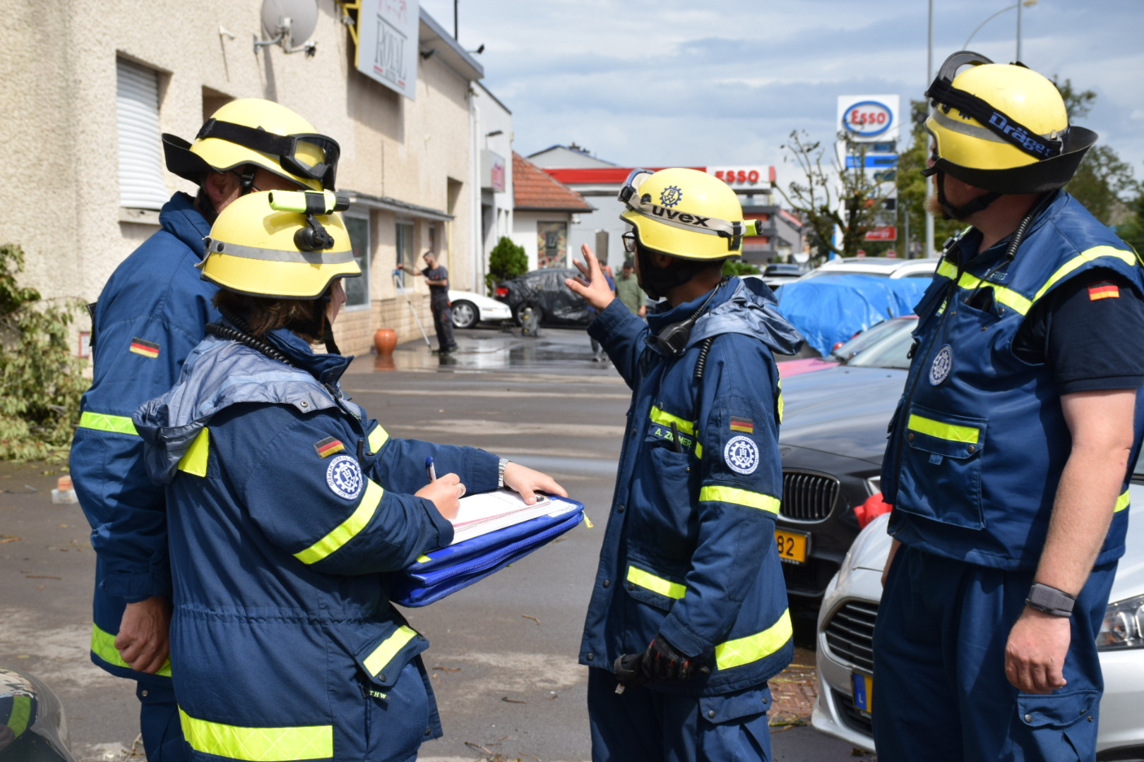 Besonders stark sind die Ortschaften Petingen und Bascharage von den Tornadoschäden getroffen. Die Ehrenamtlichen aus elf THW-Ortsverbänden aus dem Saarland und Rheinland-Pfalz reparieren die teils schwer beschädigten Dächer in kleinen Teams von bis zu fünf Einsatzkräften. Zu jedem dieser Teams gehört eine Baufachberaterin oder ein Baufachberater.