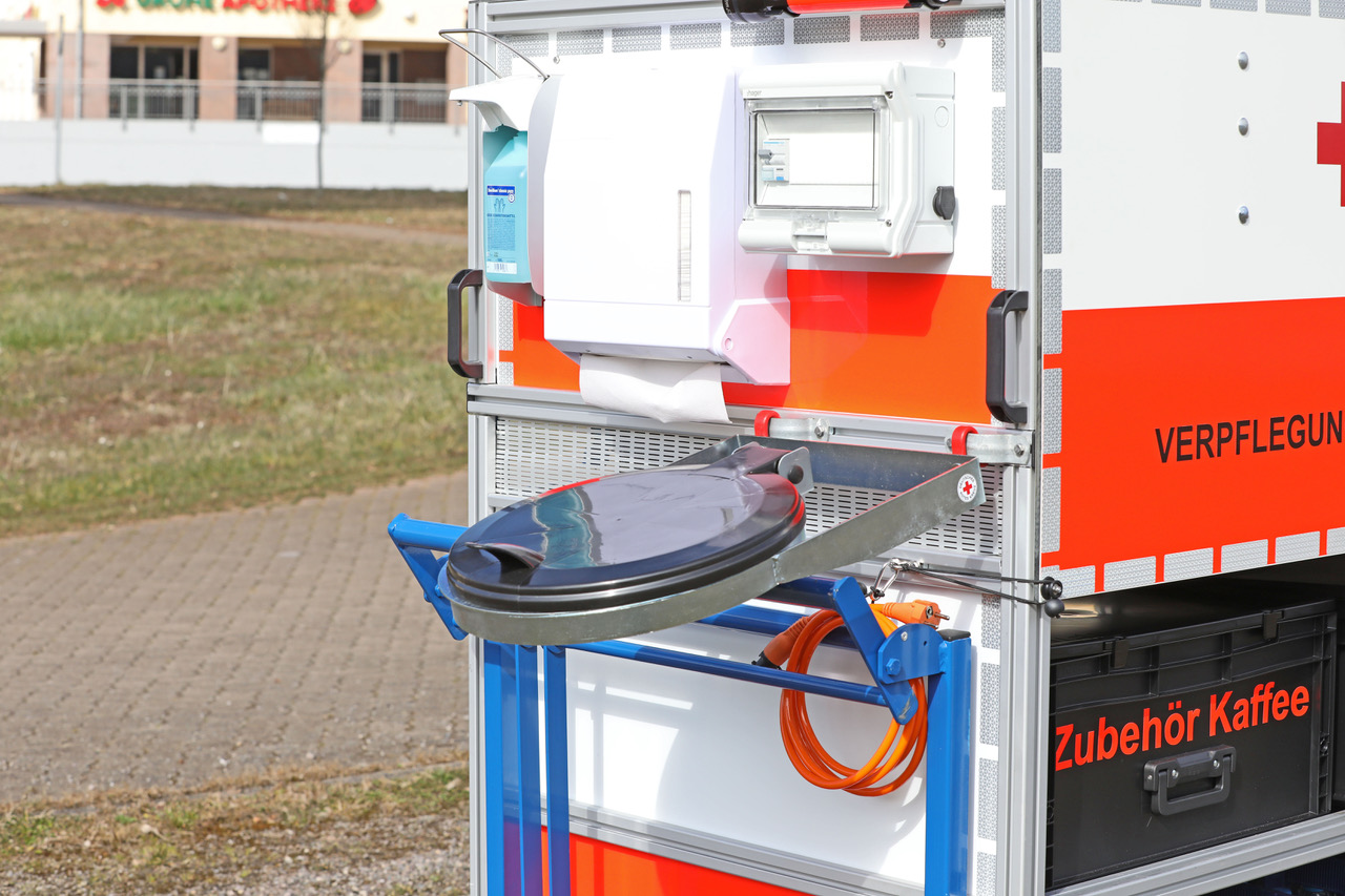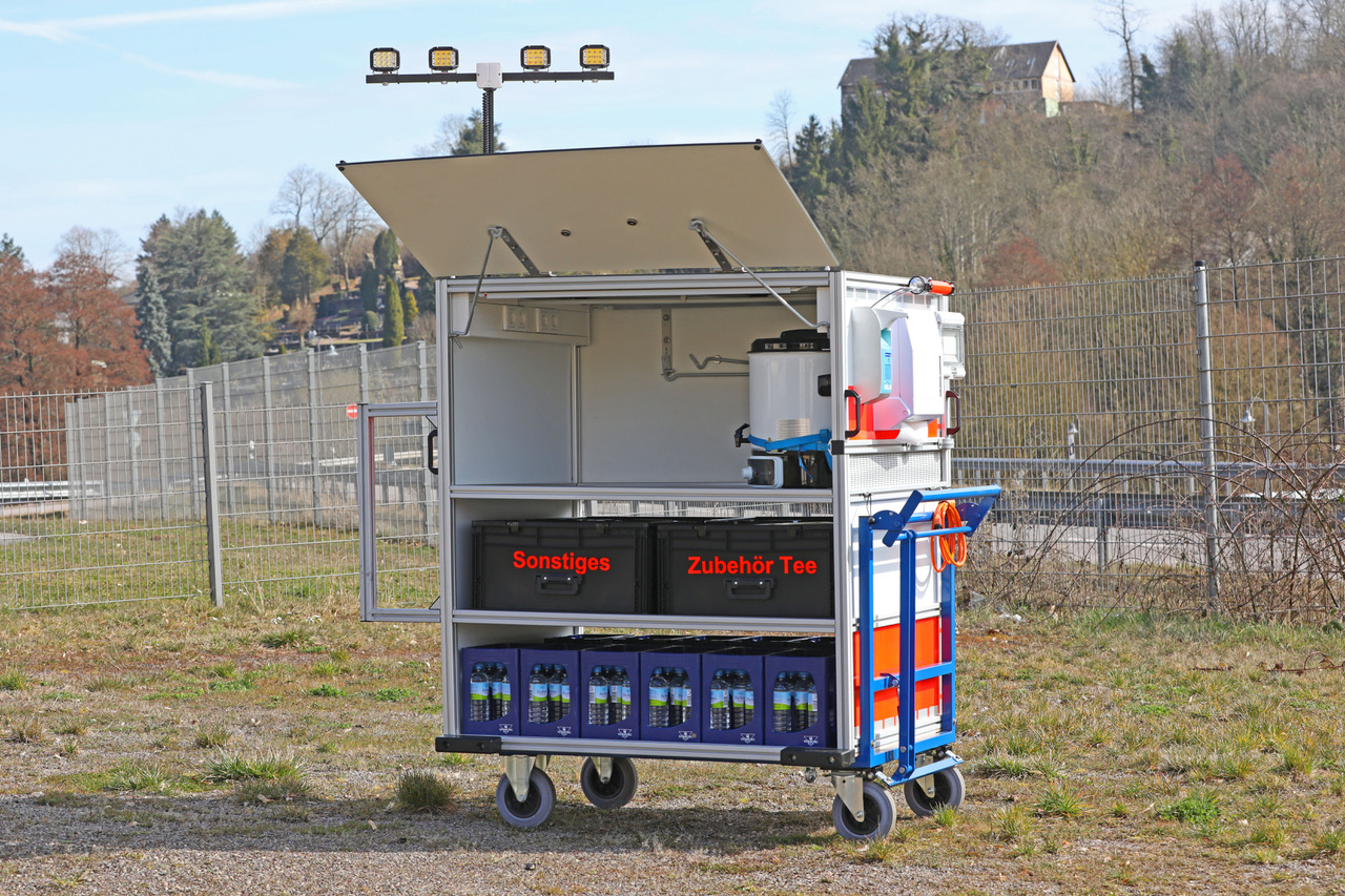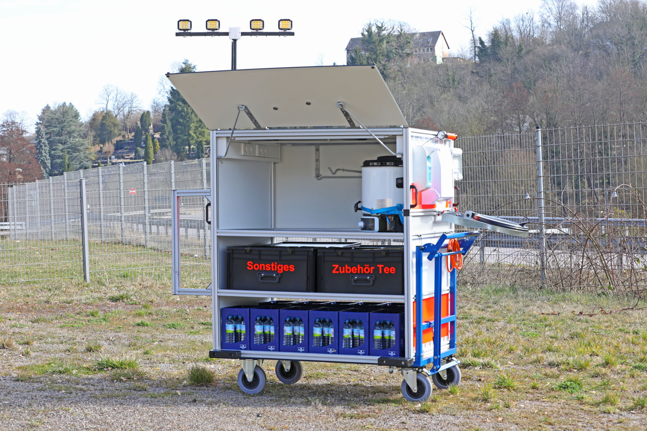 Eins der Highlights ist ein Lichtmast mit vier Arbeitsscheinwerfern und 2,5m Auszughöhe. Ausgestattet mit einer Kaffeemaschine, einem Einkochautomat inkl. zwei Thermoskannen, einem Wasserkocher, einem Papierspender, einem Desinfektionsmittelspender, einem Abfallbehälter und vier Mehrzweckkisten haben unsere Helfer alle Materialien für die Verpflegung der Einsatzkräfte mit im Einsatz dabei. Der erste Einsatz wurde bereits erfolgreich gemeistert.