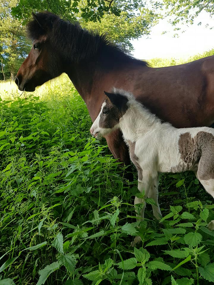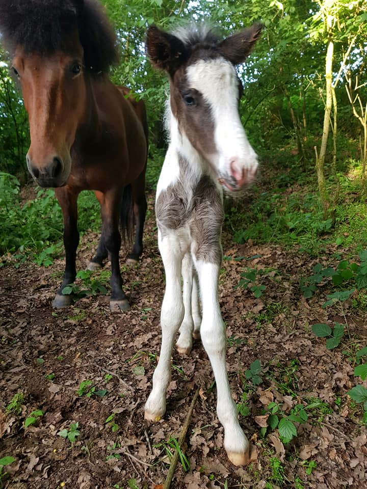 Es handelt sich um das Isländerfohlen Safir. Männlich, Braunschecke mit einem Sichel im Auge oder einem komplett blauen Auge.