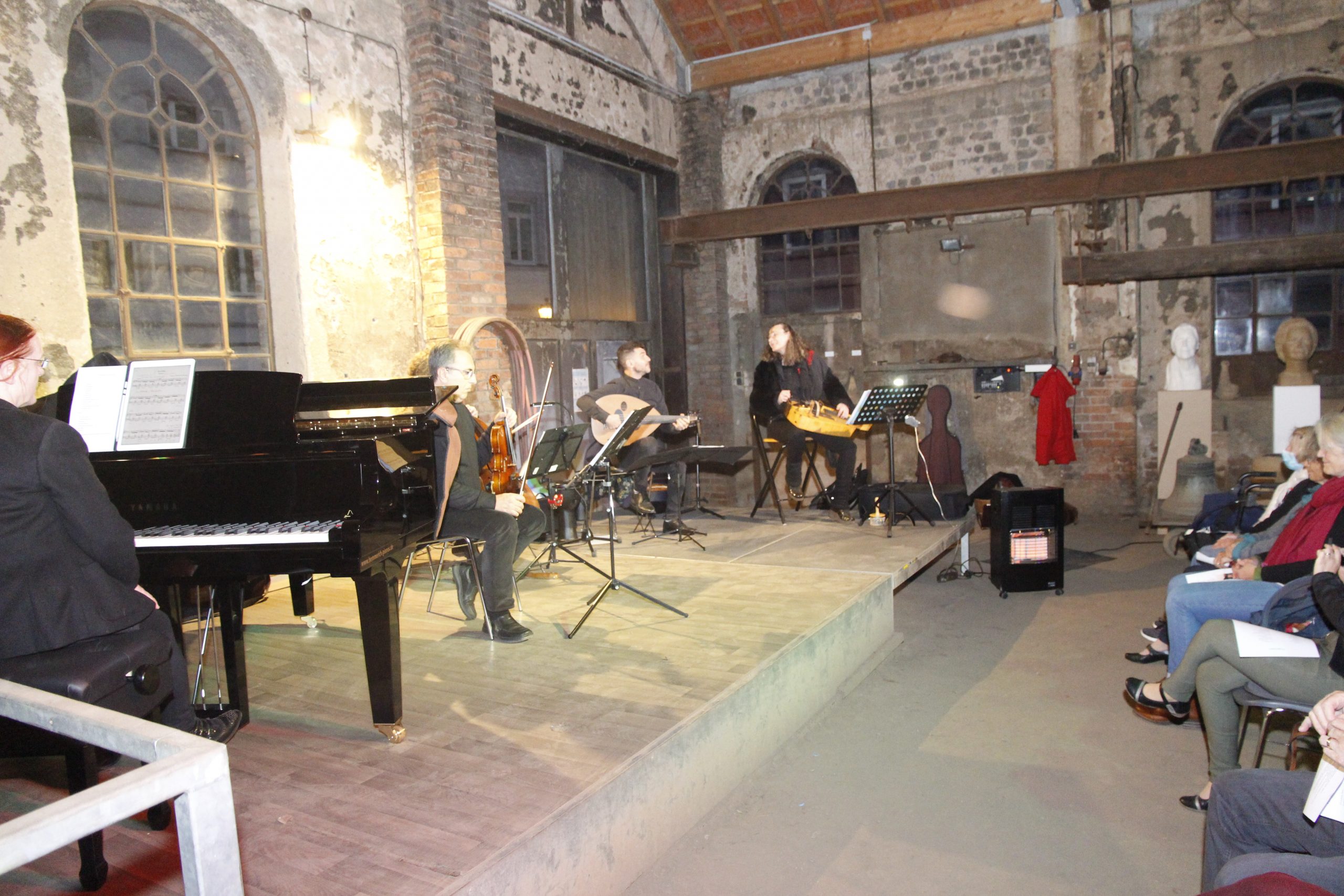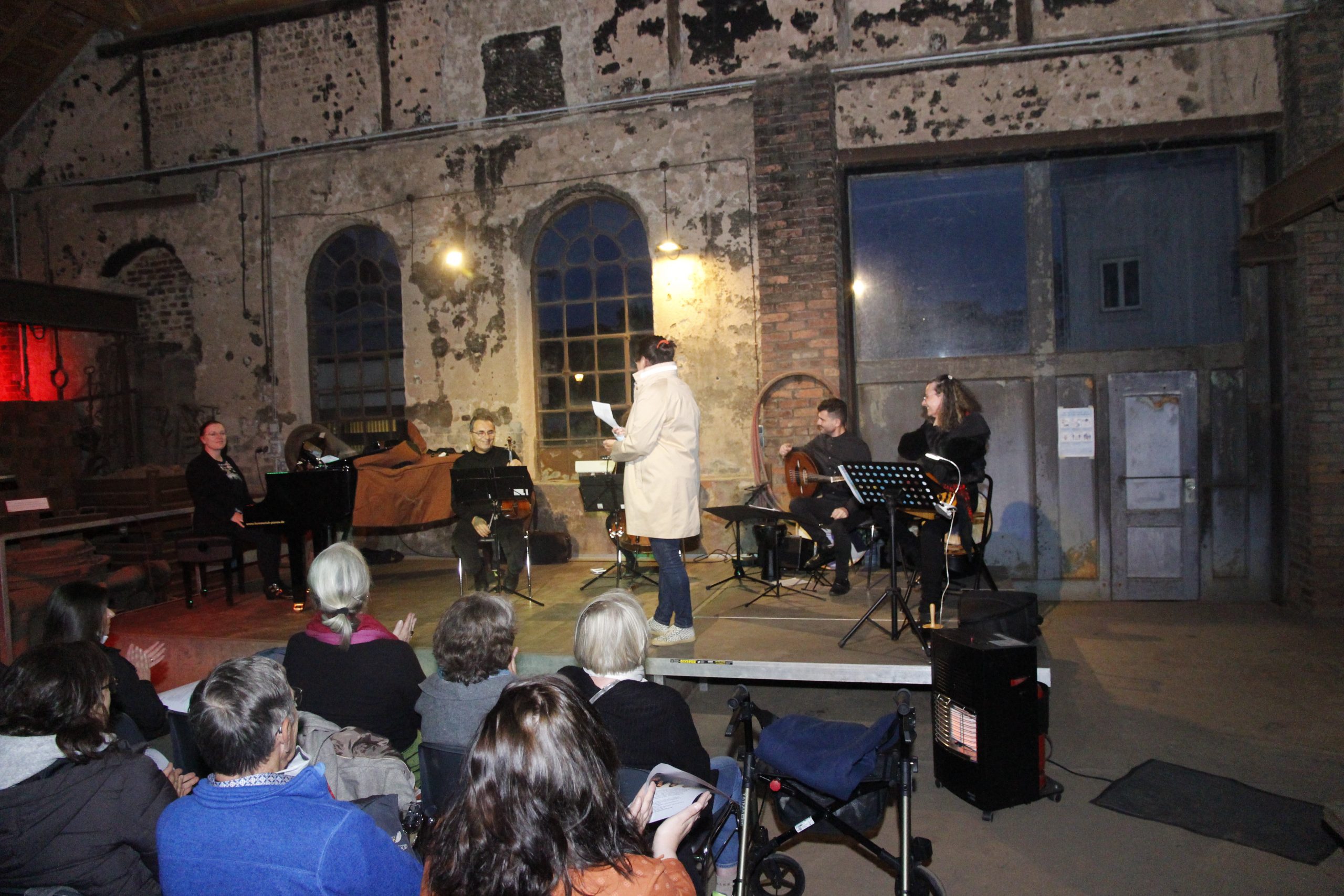 Zunächst begrüßte Dr. Anette Barth, Geschäftsführerin Lokales Bündnis für Familie e.V Saarburg am vergangenen Samstag das Ensemble und die etwa 35 Besucher in der Kulturgießerei Mabilon. Wegen der aktuellen Corona Krise waren nach der 2 G Regel nicht mehr als 50 Personen zugelassen. Die hatte während der letzten Veranstaltung dieser Art im Kultursommer 2021in der kalten Gießhalle keinen Einfluss auf die Begeisterung und überraschende Momente der Freude, des Mitfühlens und der Sinneslust bei den Zuhörern keinen Einfluss. Vielmehr hatte Claudia Dylla mit Ihrem mittelalterlichen Saiteninstrument (Vielle) immer ein motivierenden Lächeln auf den Lippen und konnte so die Zuhörer immer wieder auf,s neue mit dem Ensemble motivieren. Auch nach der Pause gelang es dem Ensemble die Zuschauer zu bewegen und zu überraschen, im Stehen und Klatschen dem Repertoire der Melodien aus Osteuropa zu folgen; so trotze man der Kälte.