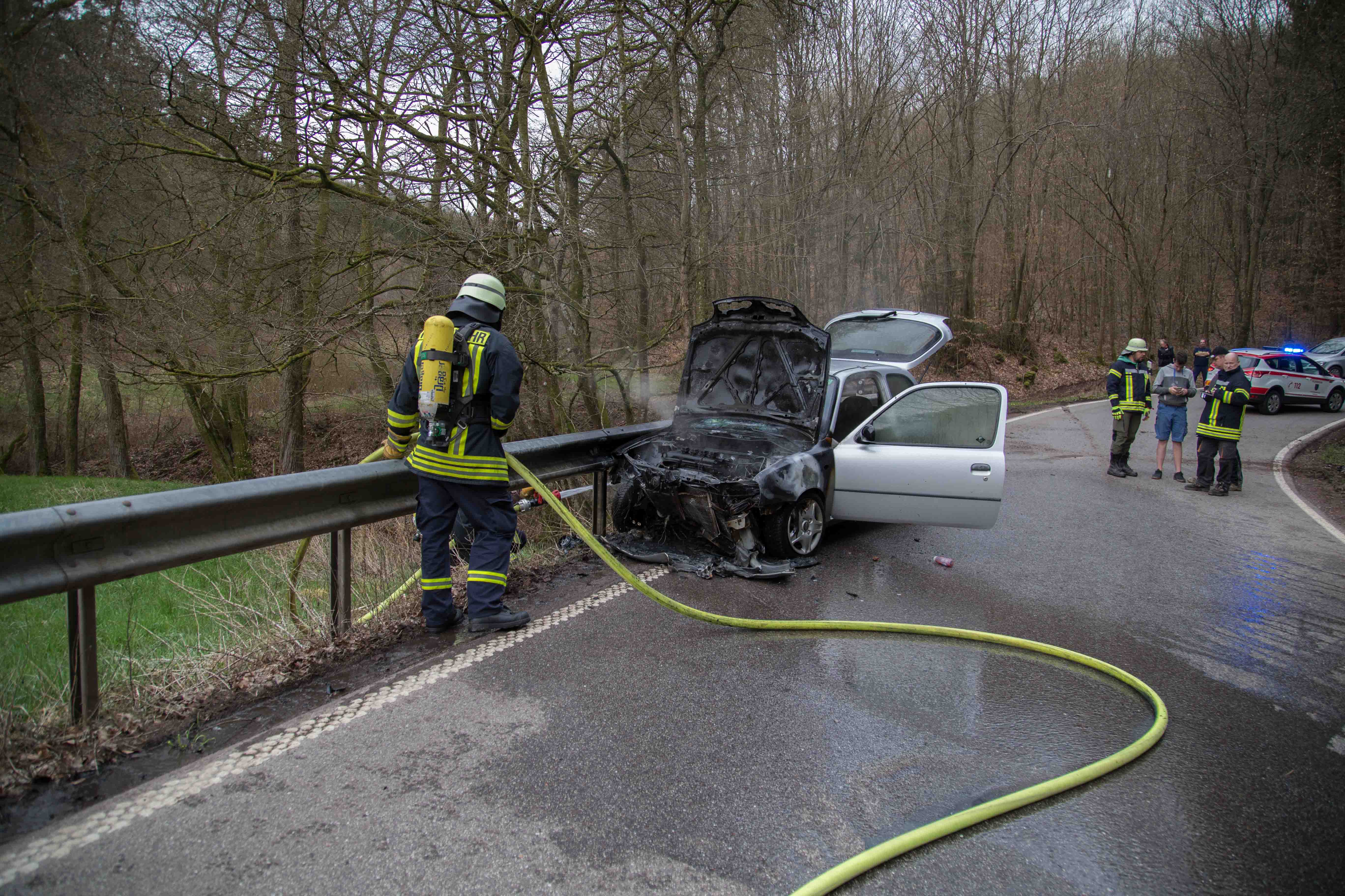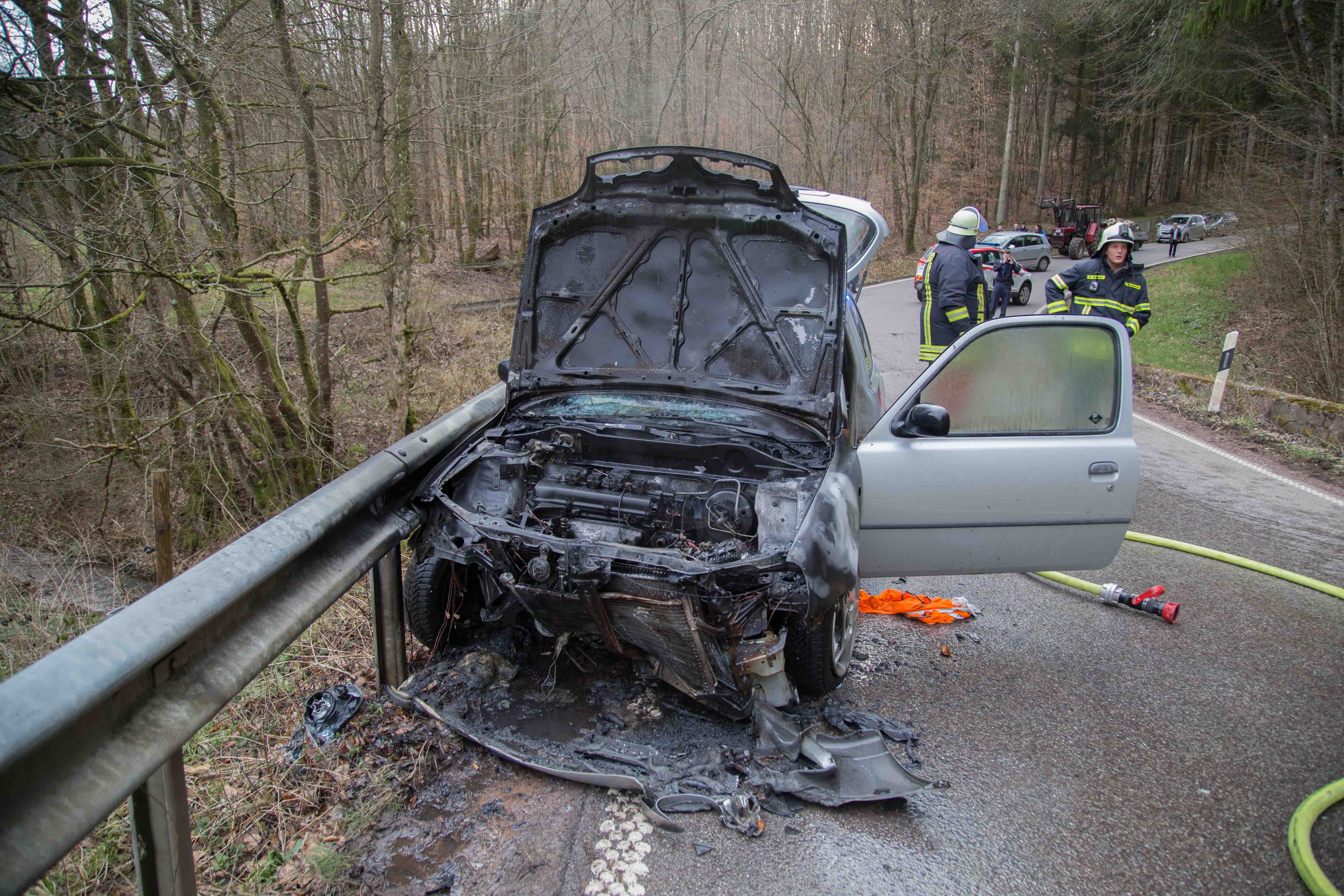 Hier fing der Nissan sofort Feuer im Motorbereich. Der Fahrer wurde leicht verletzt, und vorsorglich in ein Krankenhaus gebracht. Die Feuerwehren hatten den Brand schnell unter Kontrolle.