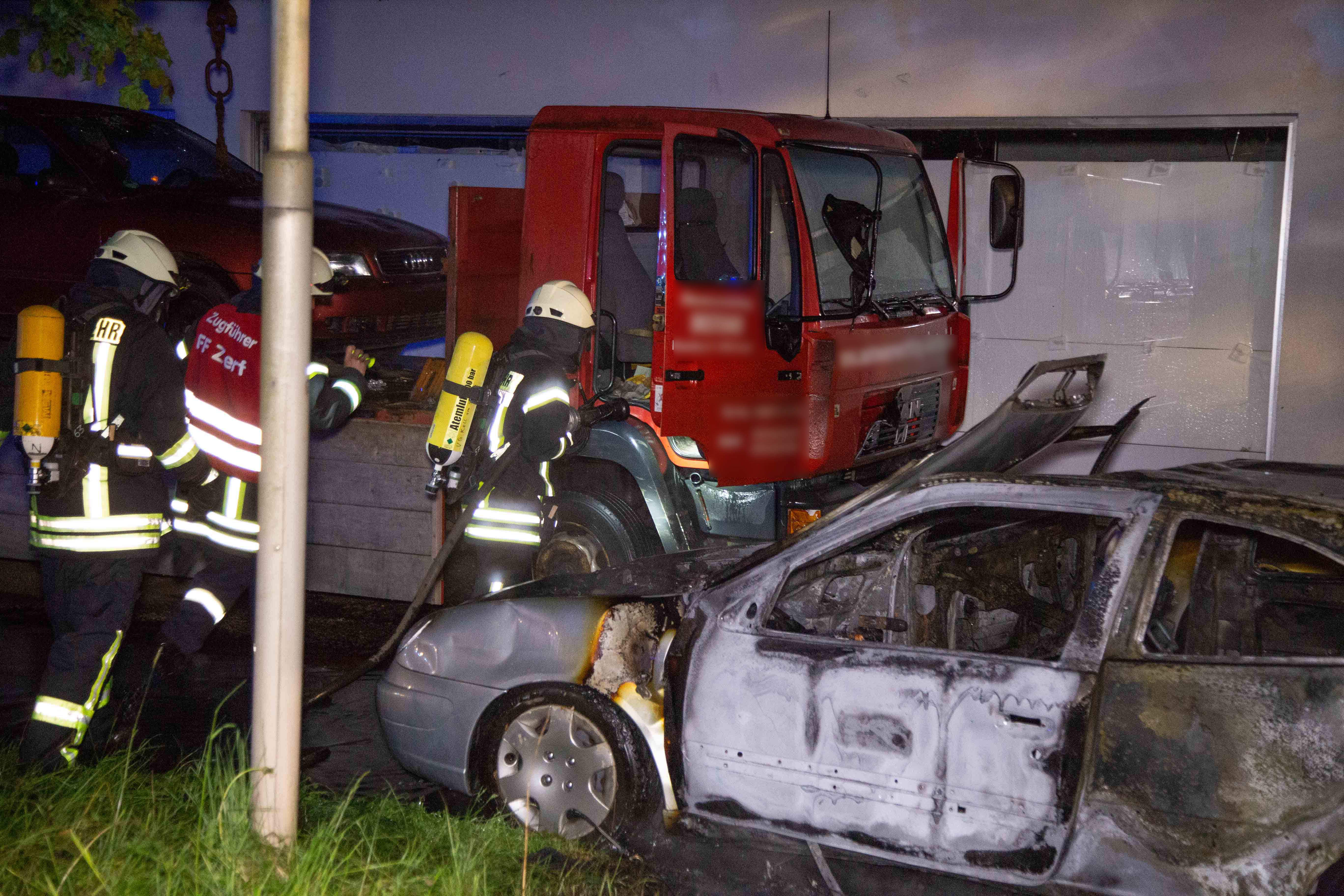 Ein LKW und ein weiteres Fahrzeug, welche unmittelbar neben dem brennenden Auto geparkt waren wurden ebenfalls erheblich beschädigt. Auch die zwei Fensterscheiben des angrenzenden Betriebs wurden beschädigt.