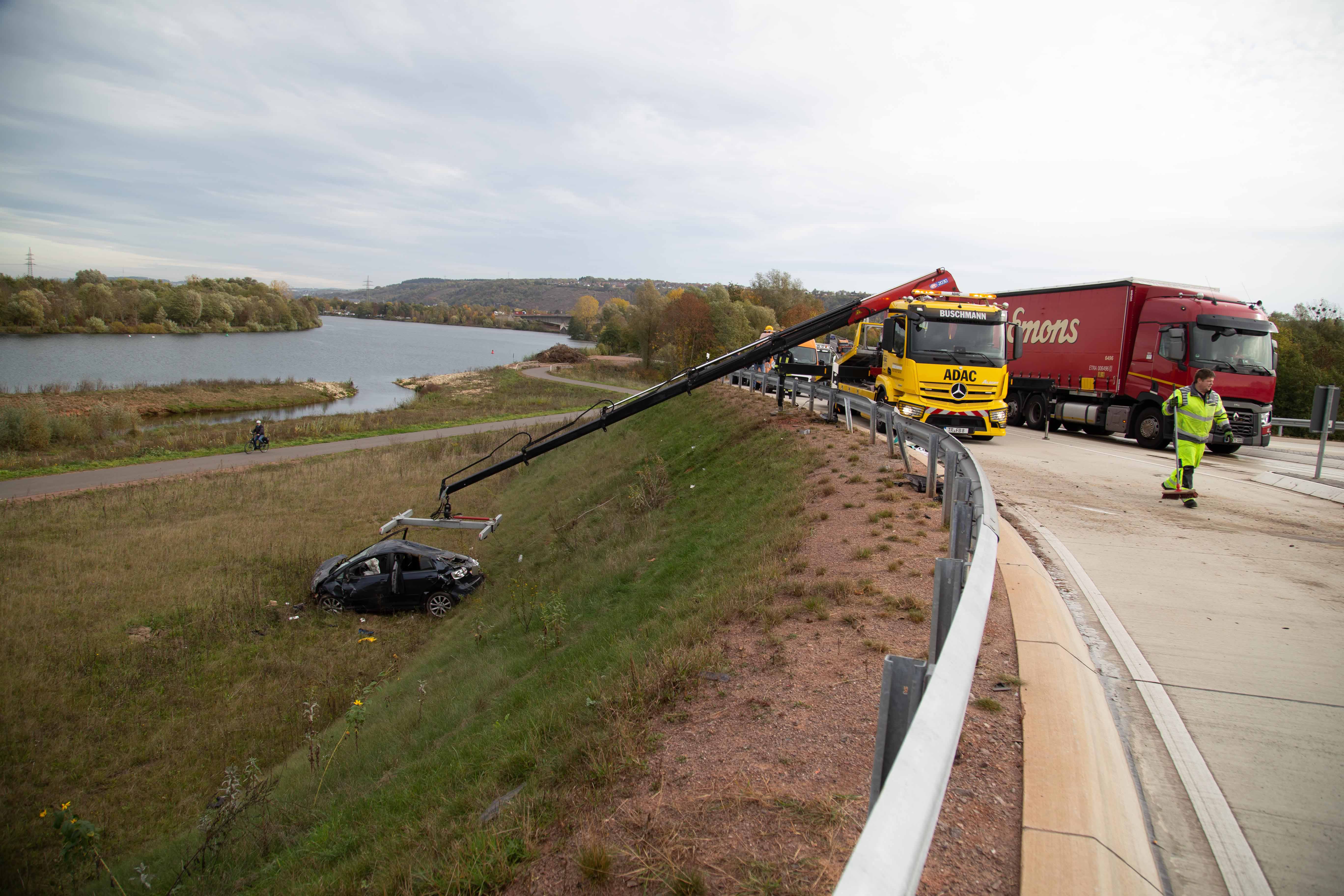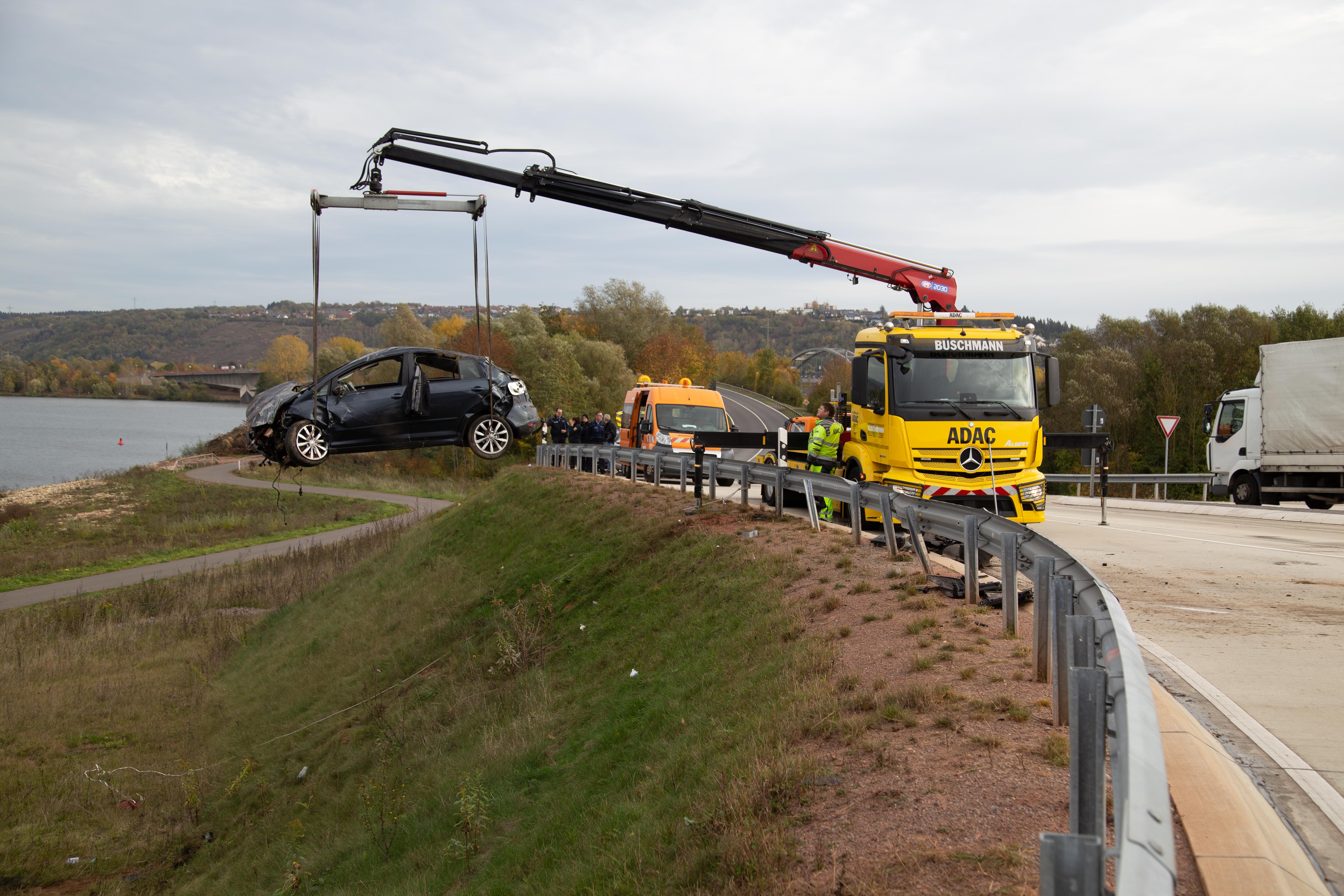 Mit einem Abschleppwagen mit Kran musste das Auto geborgen werden. Der Kreisel war teilweise voll gesperrt.