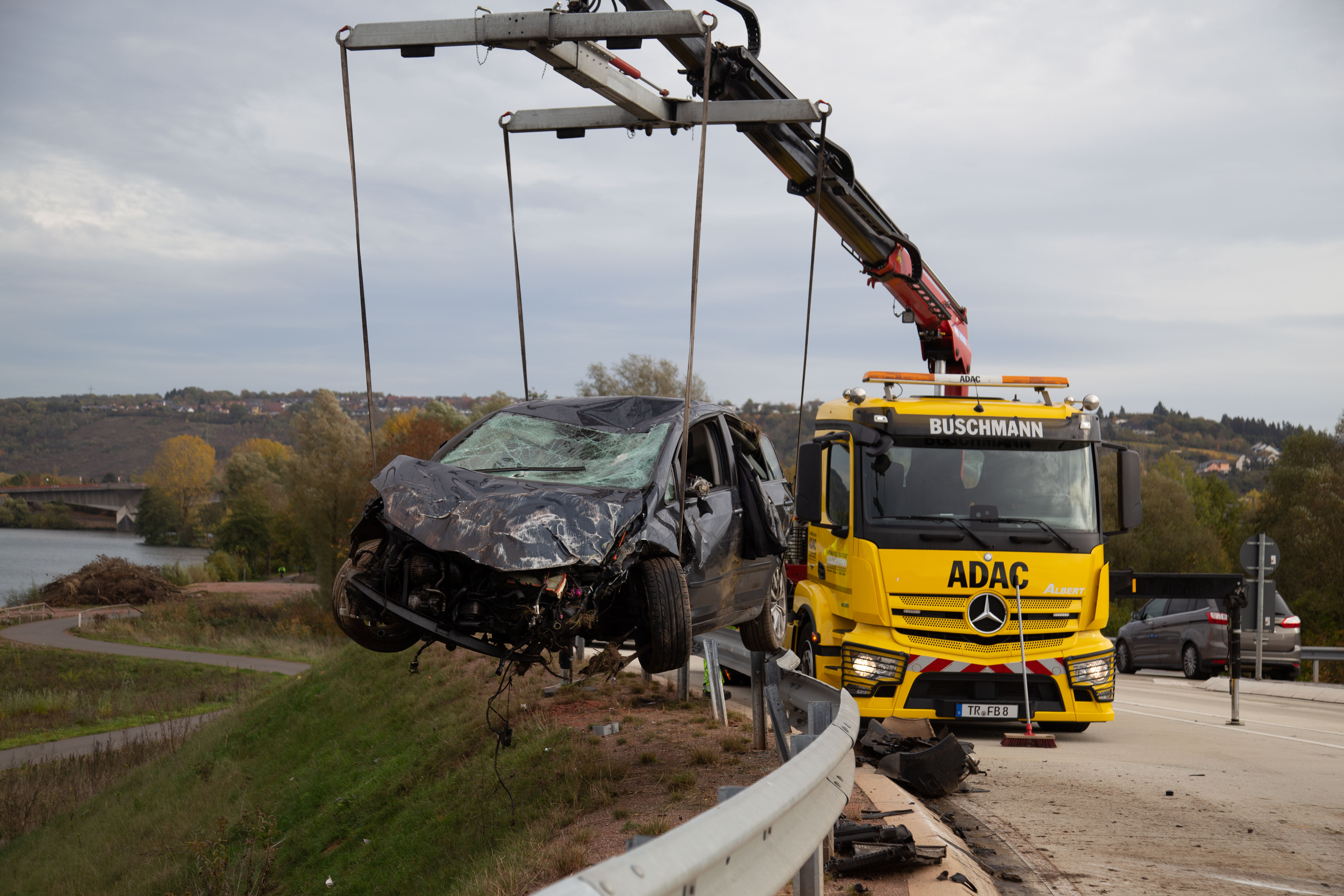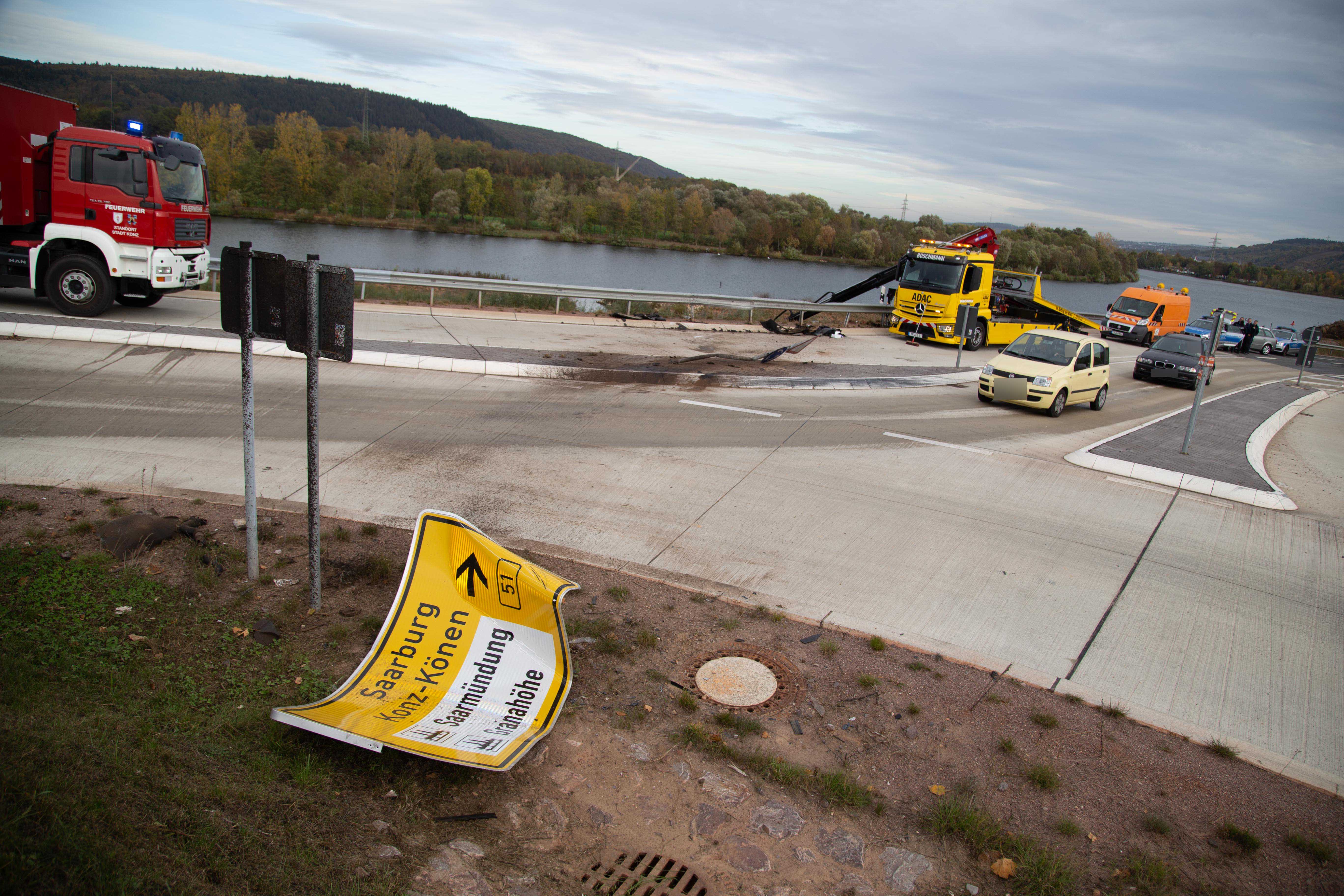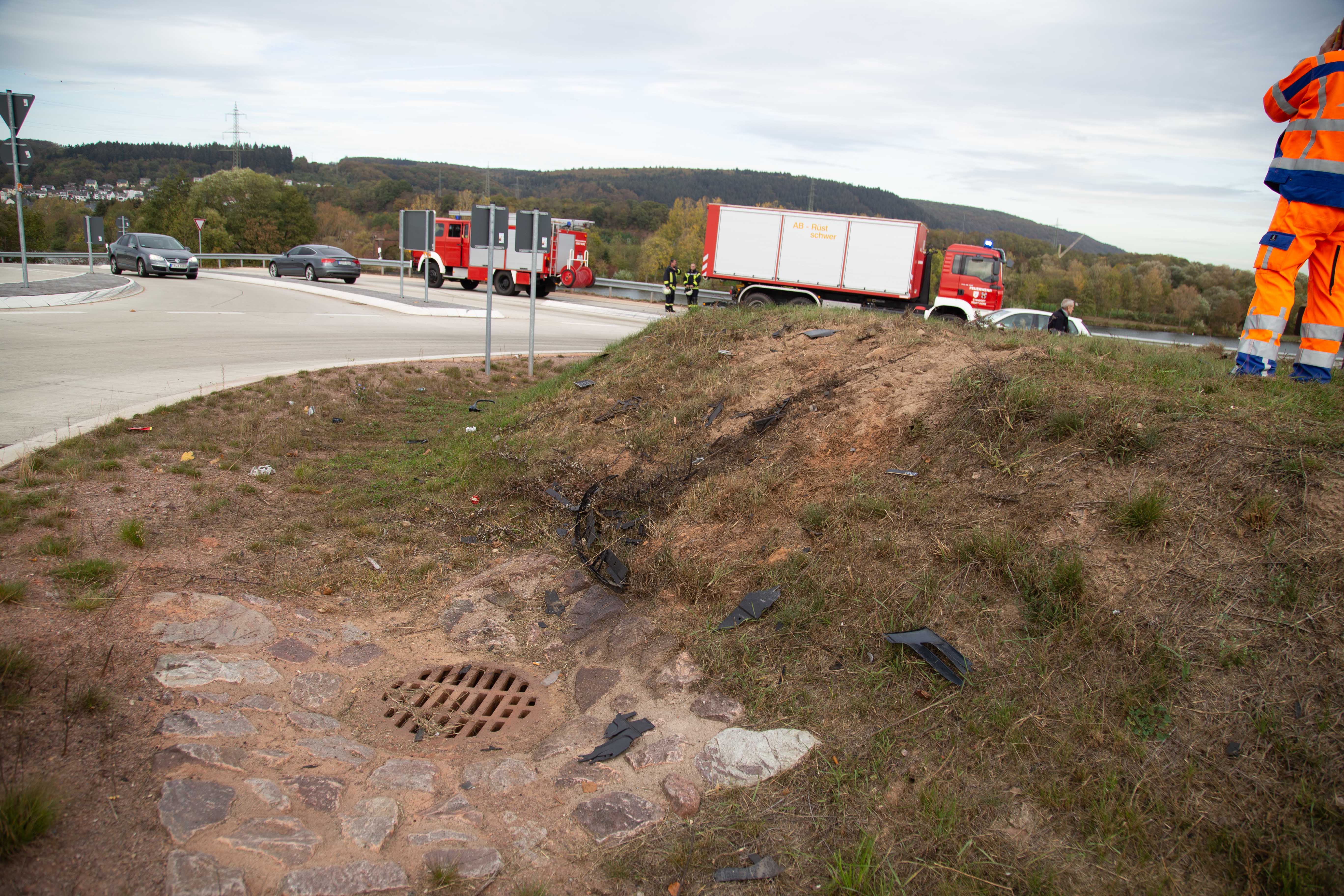 Das Fahrzeug überfuhr zunächst die Verkehrsinsel und fuhr dann frontal in den Kreisel und flog über diesen hinweg. Auf der anderen Seite des Kreisels überschlug sich das Fahrzeug und flog über die Leitplanke in die Moselböschung hinab.