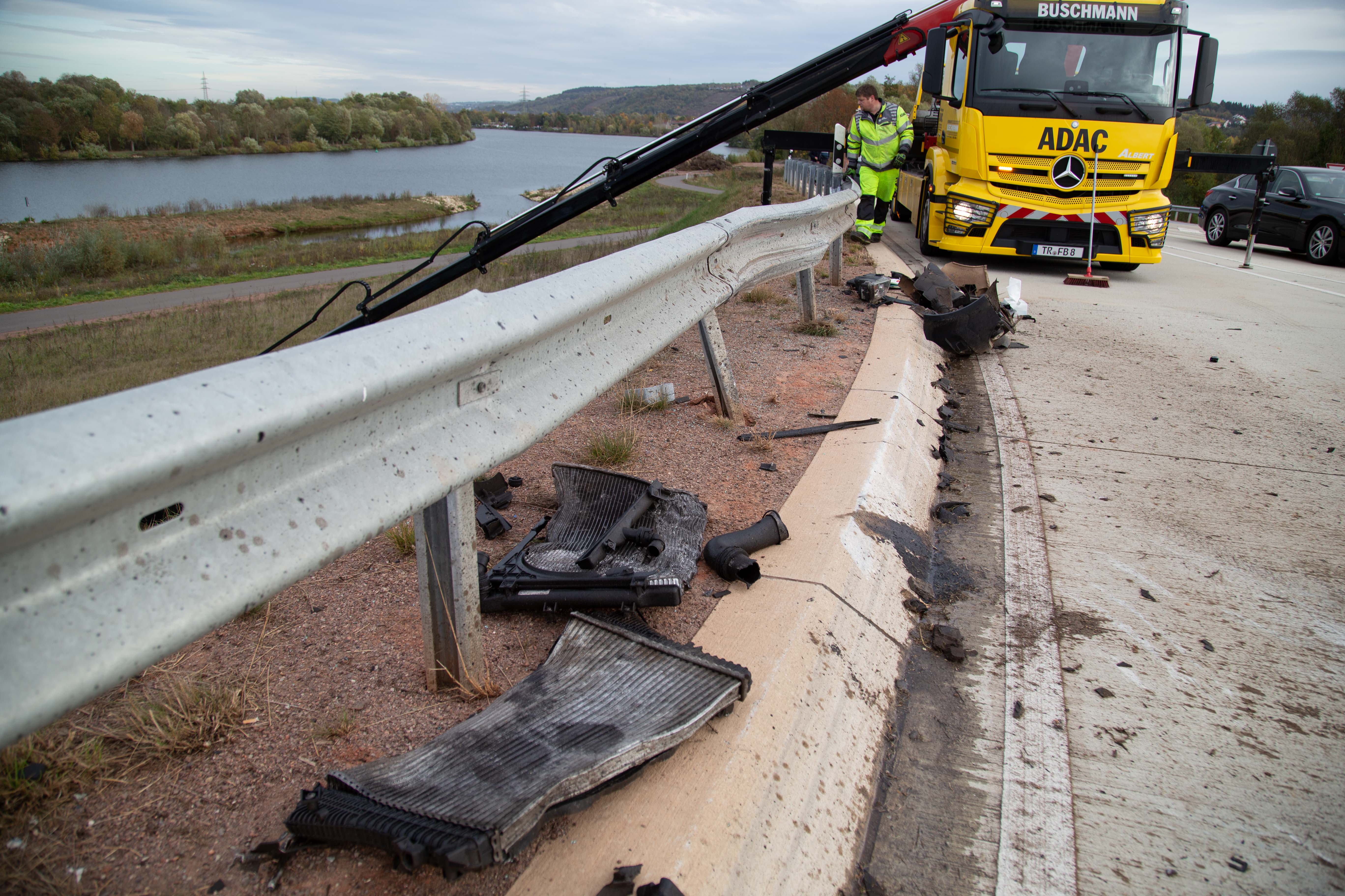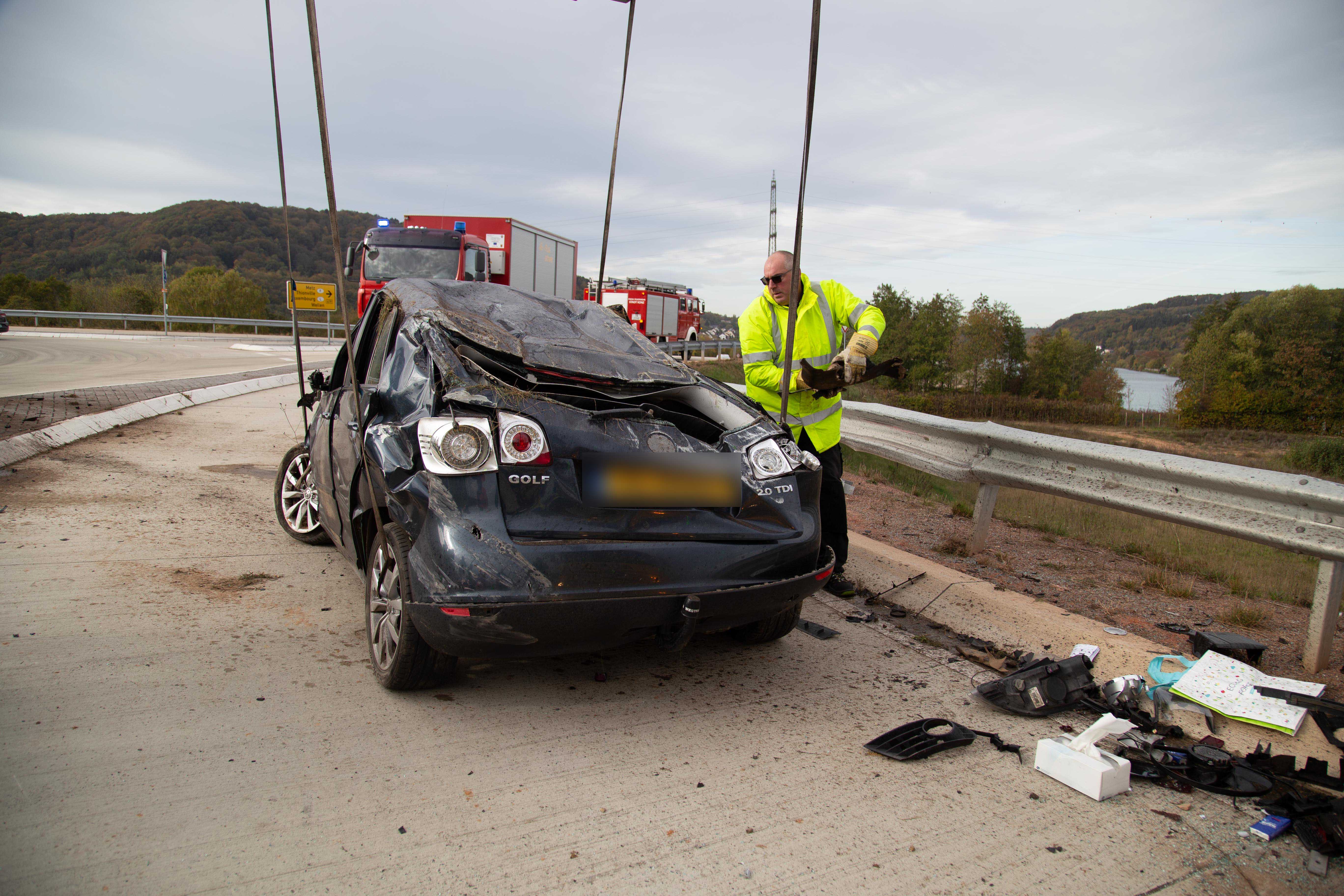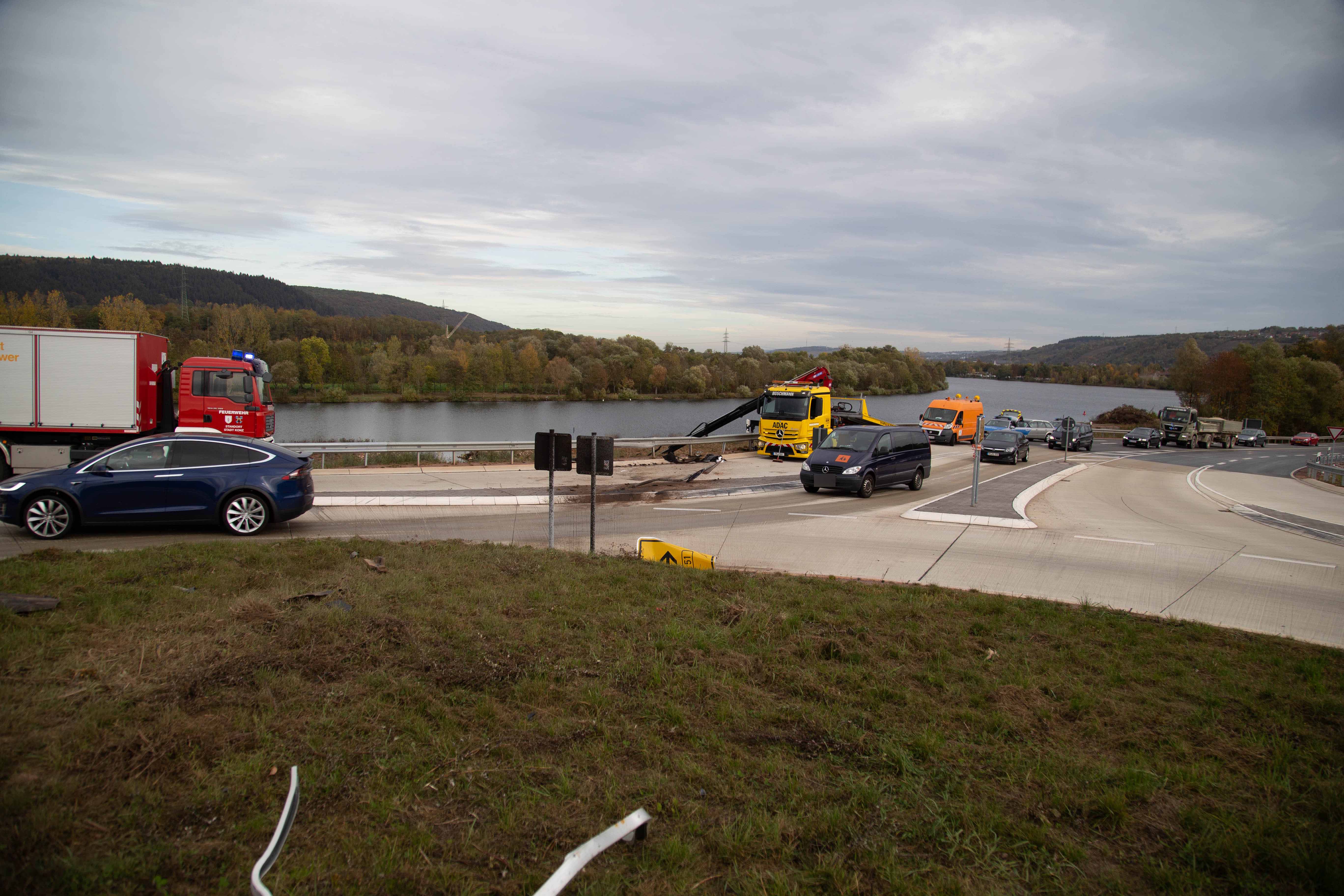 Das Fahrzeug überfuhr zunächst die Verkehrsinsel und fuhr dann frontal in den Kreisel und flog über diesen hinweg. Auf der anderen Seite des Kreisels überschlug sich das Fahrzeug und flog über die Leitplanke in die Moselböschung hinab.