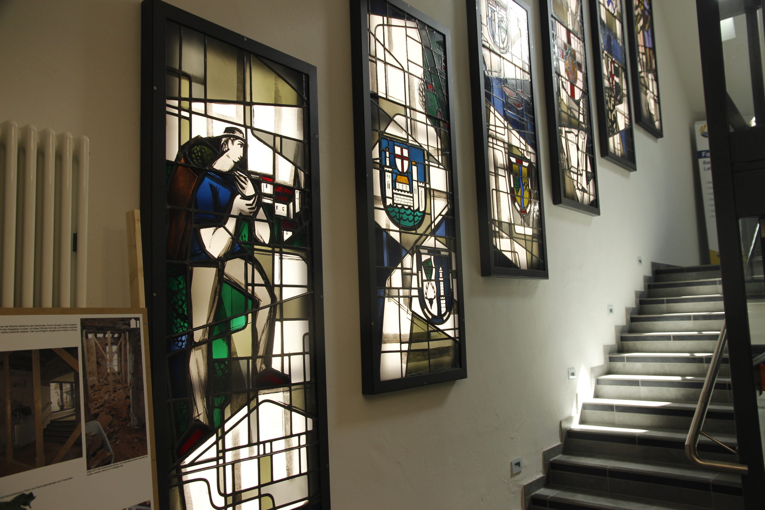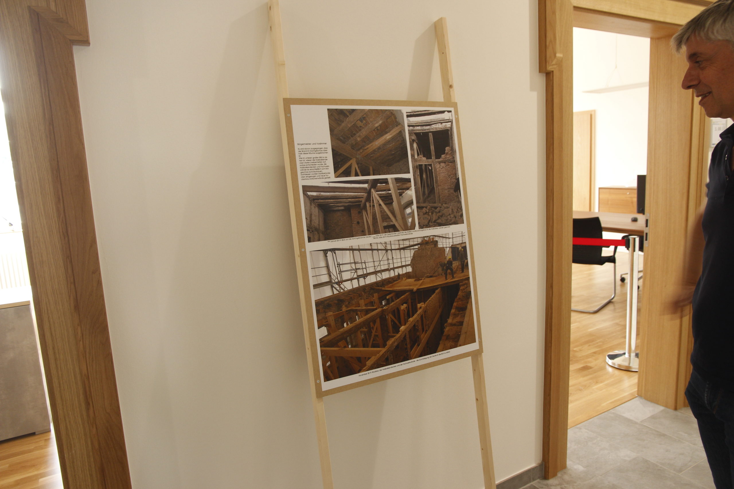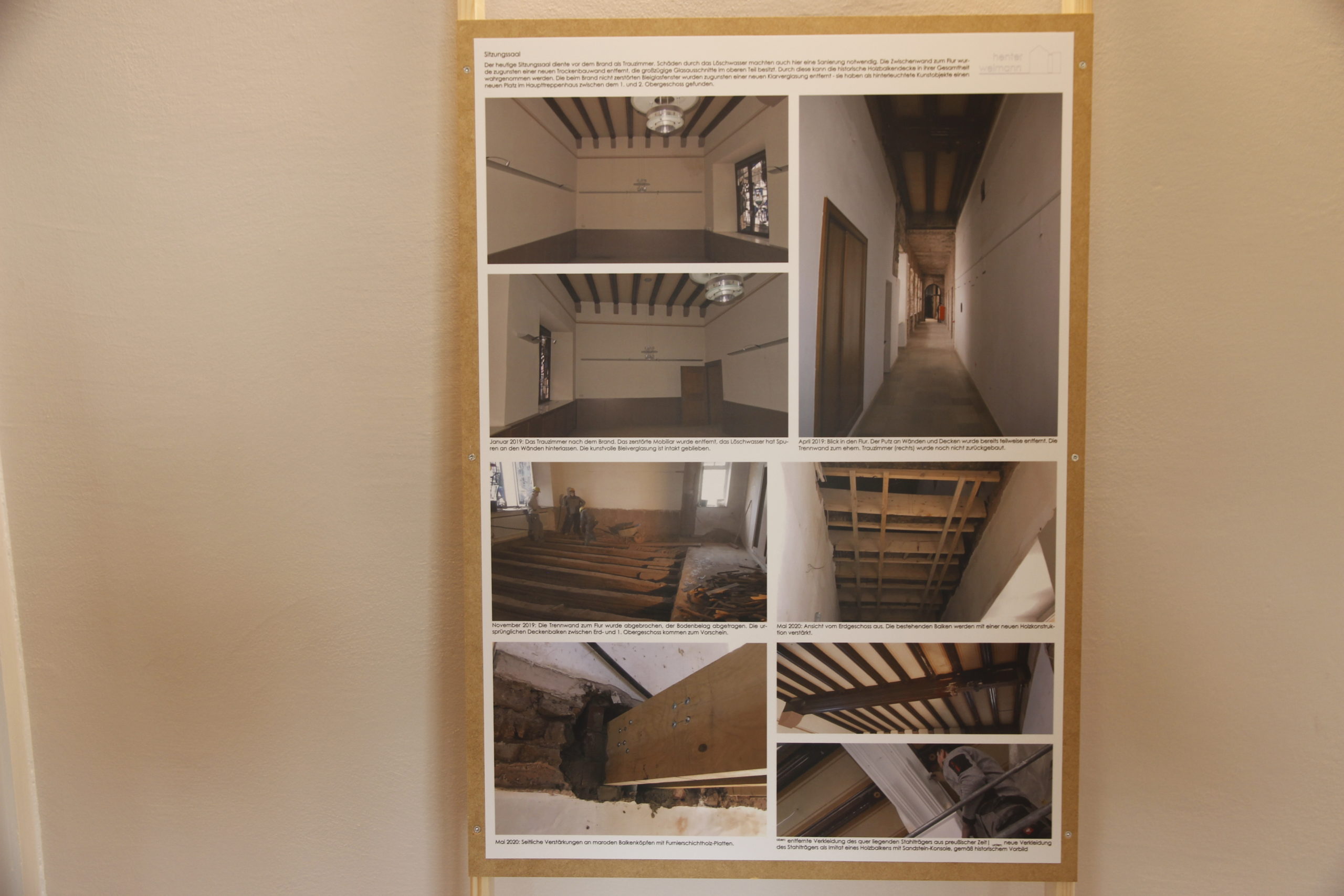 Präsentationstafeln im Gebäude dokumentierten den Brand auf den einzelnen Etagen den Wiederaufbau.