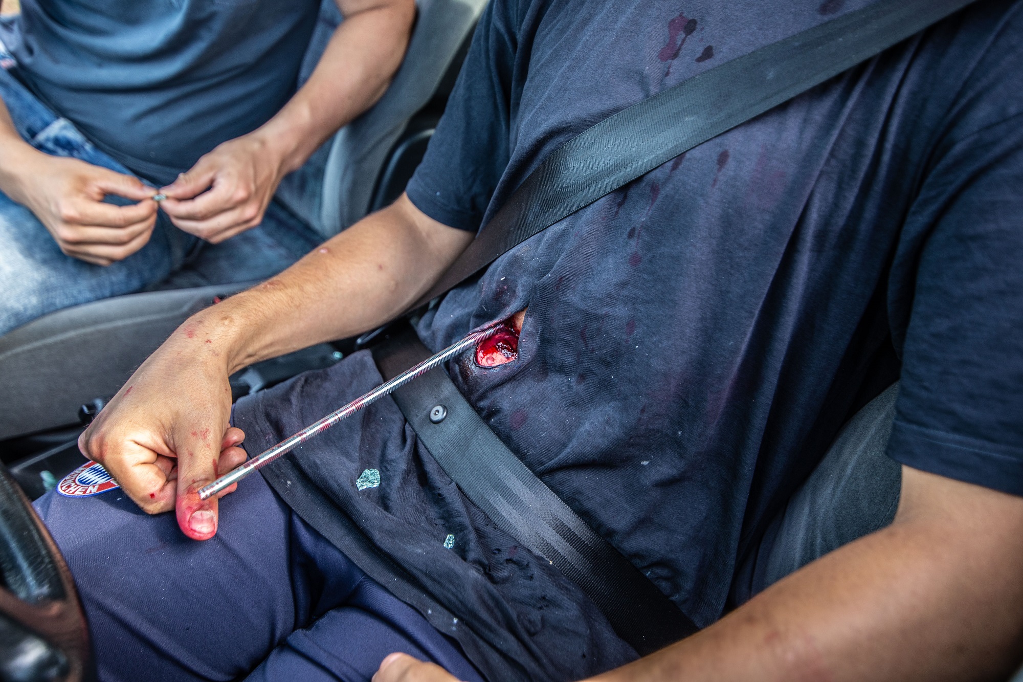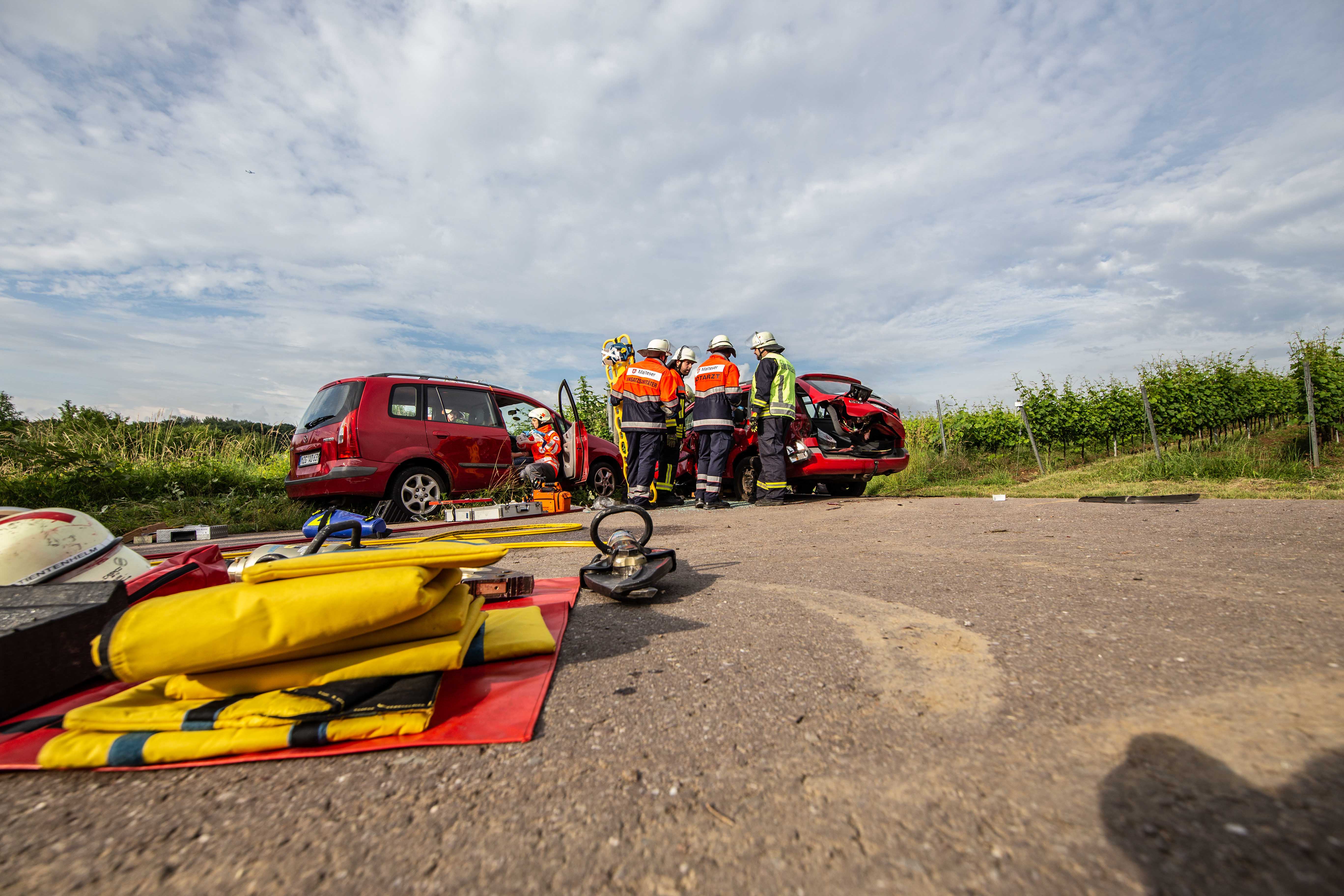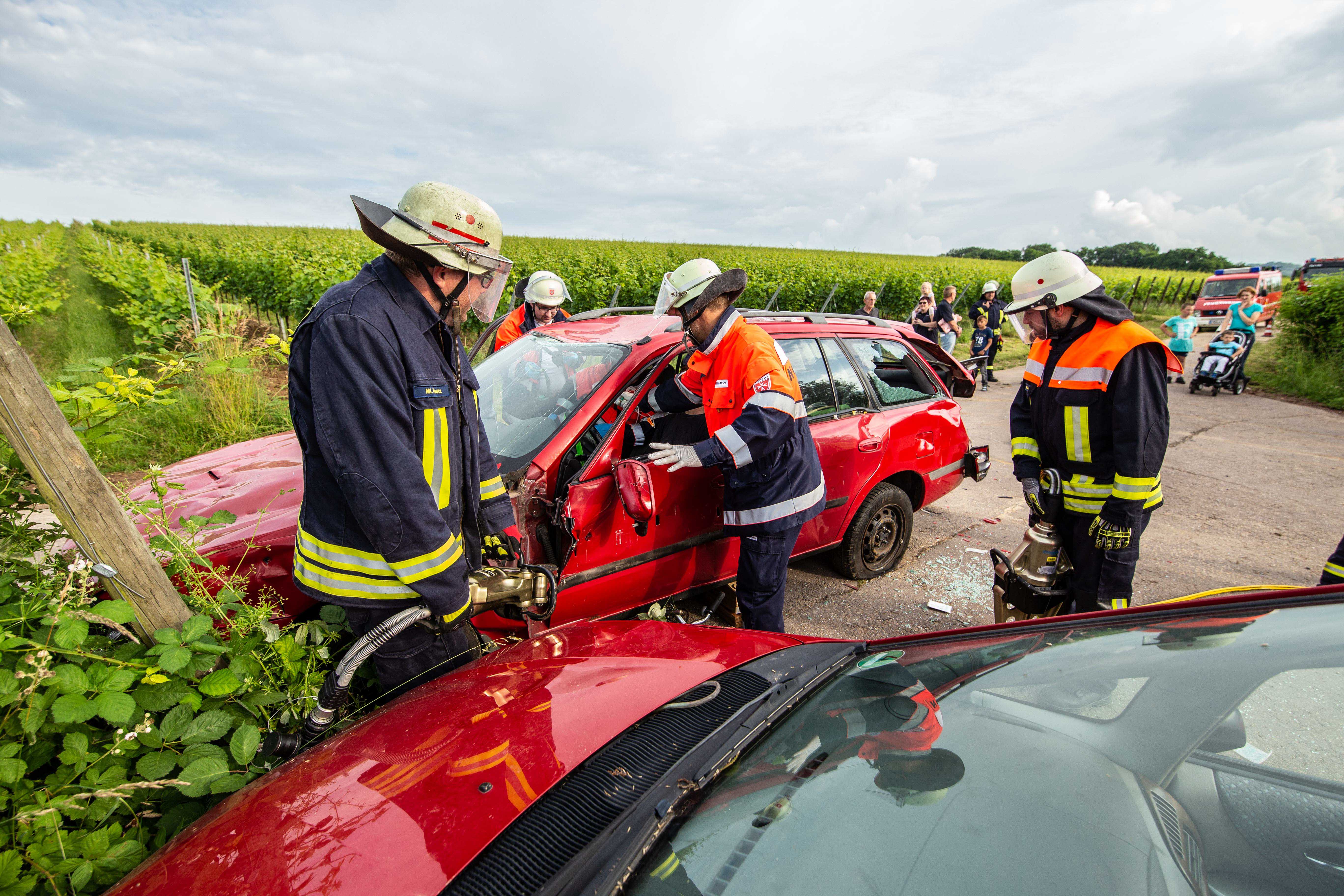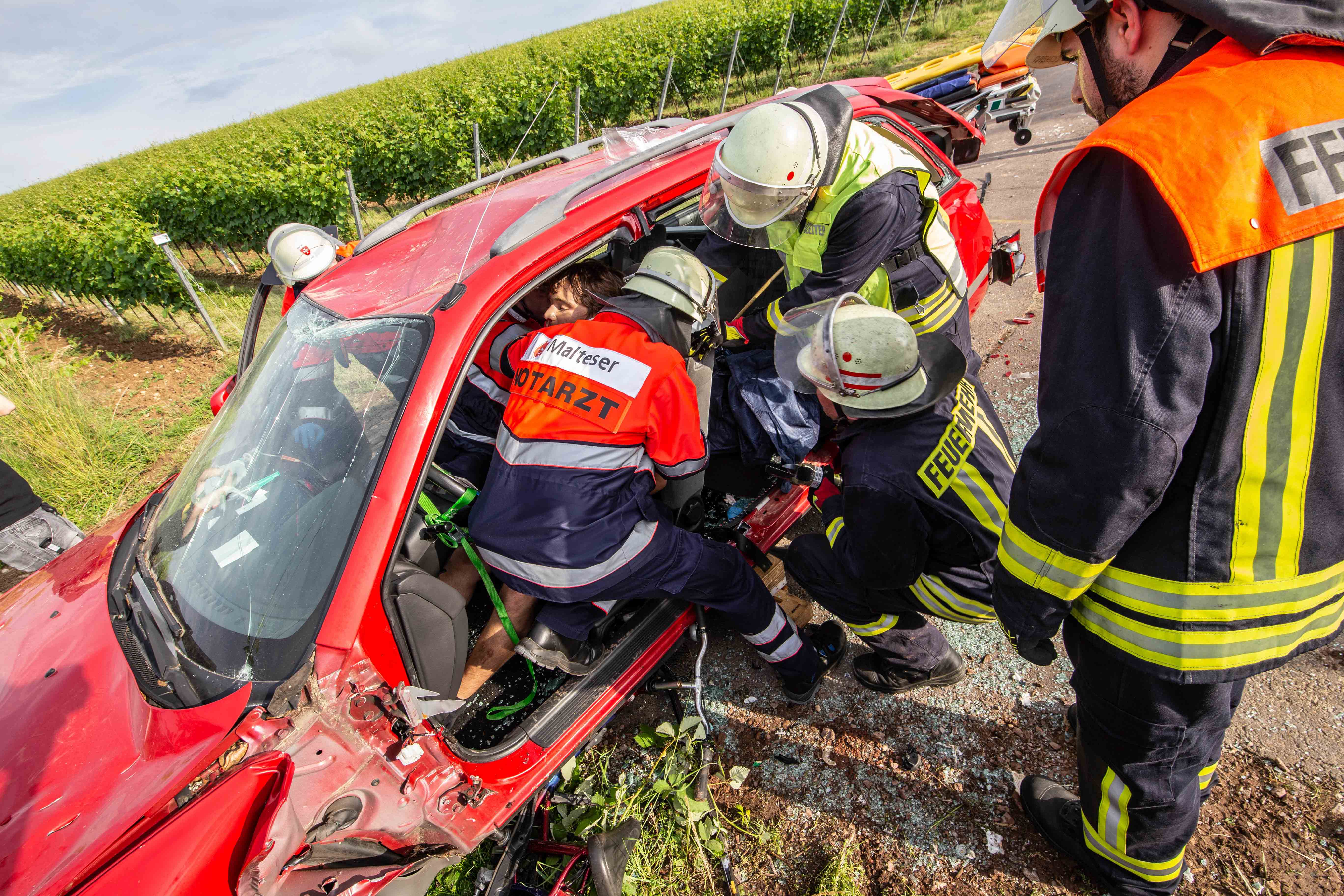 Am gestrigen Donnerstag kam es zu einem schweren Unfall auf einem Feldwirtschaftsweg in den Weinbergen bei Sehndorf. Zwei PKW und ein Radfahrer stoßen zusammen, so das Szenario. Drei Verletzte, davon zwei schwer und einmal mittelschwer. Das besondere Rettungsszenario, bei einem PKW Fahrer hatte sich durch den Aufprall eine Gewindestange durch die Bauchdecke und die Rückenlehne gebohrt. Hier galt es als eine besondere Aufgabe für die Rettungskräfte diesen Schwerverletzten besonders sicher und behutsam zu retten.