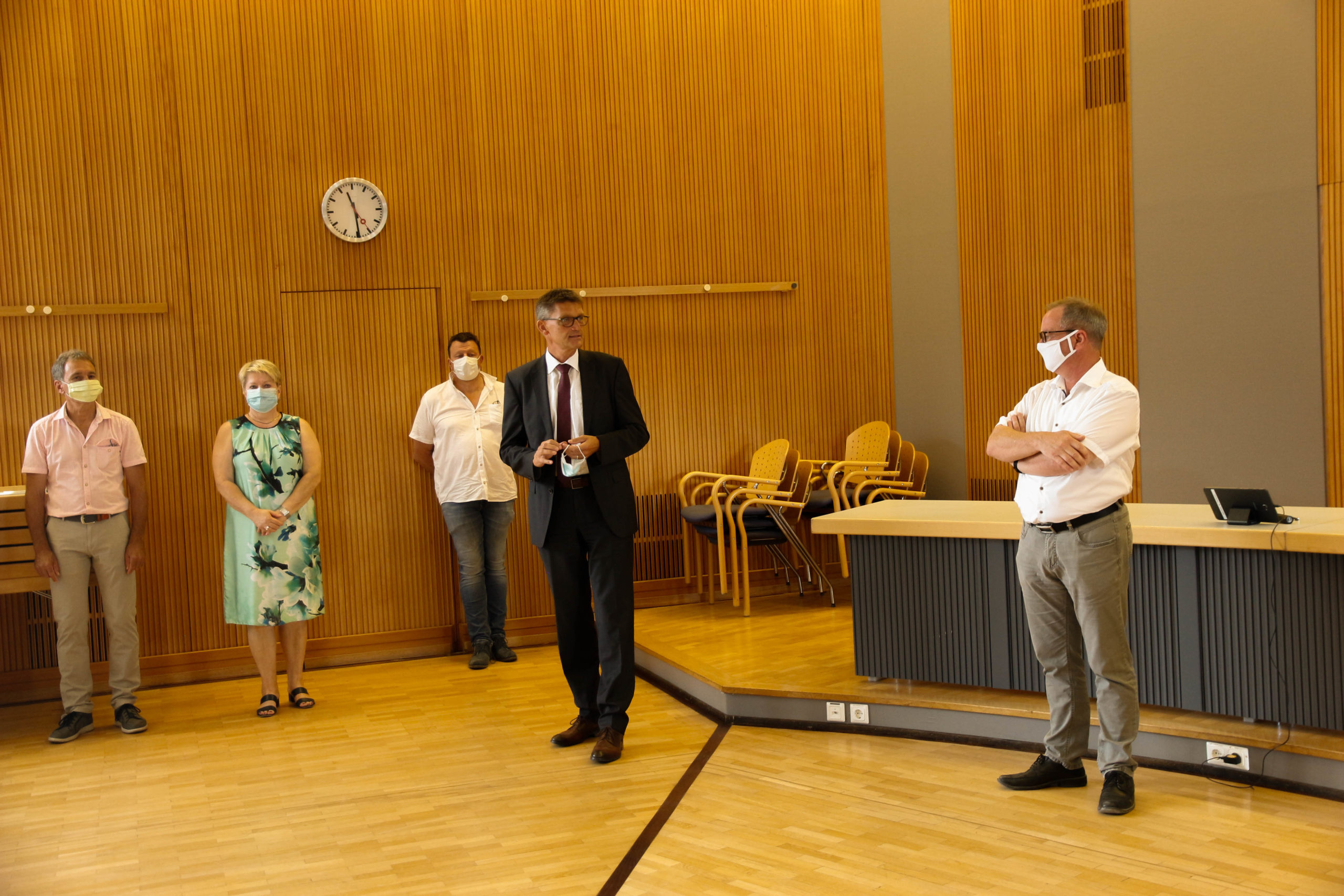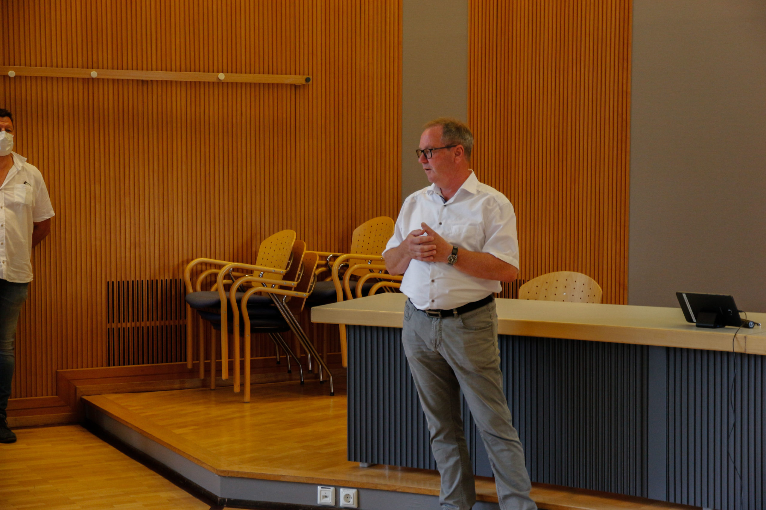 Bürgermeister Dixius begrüßte zunächst unter Einhaltung der Corona Bedingungen und registrierten Besucher im Sitzungssaal. In einer kurzen Zusammenfassung erläuterte er den Verlauf der Arbeiten sowie die Entstehungsgeschichte des Brandes im August 2018. Er dankte der Feuerwehr und vor allen auch den Mitarbeitern der Verwaltung, die in dieser schwierigen Zeit tatkräftig ihm motiviert zur Seite standen und den Geschäftsbetrieb der Verwaltung in den dezentralen Büros gewährleisteten und in relativer kurzer Zeit funktionsfähig waren.