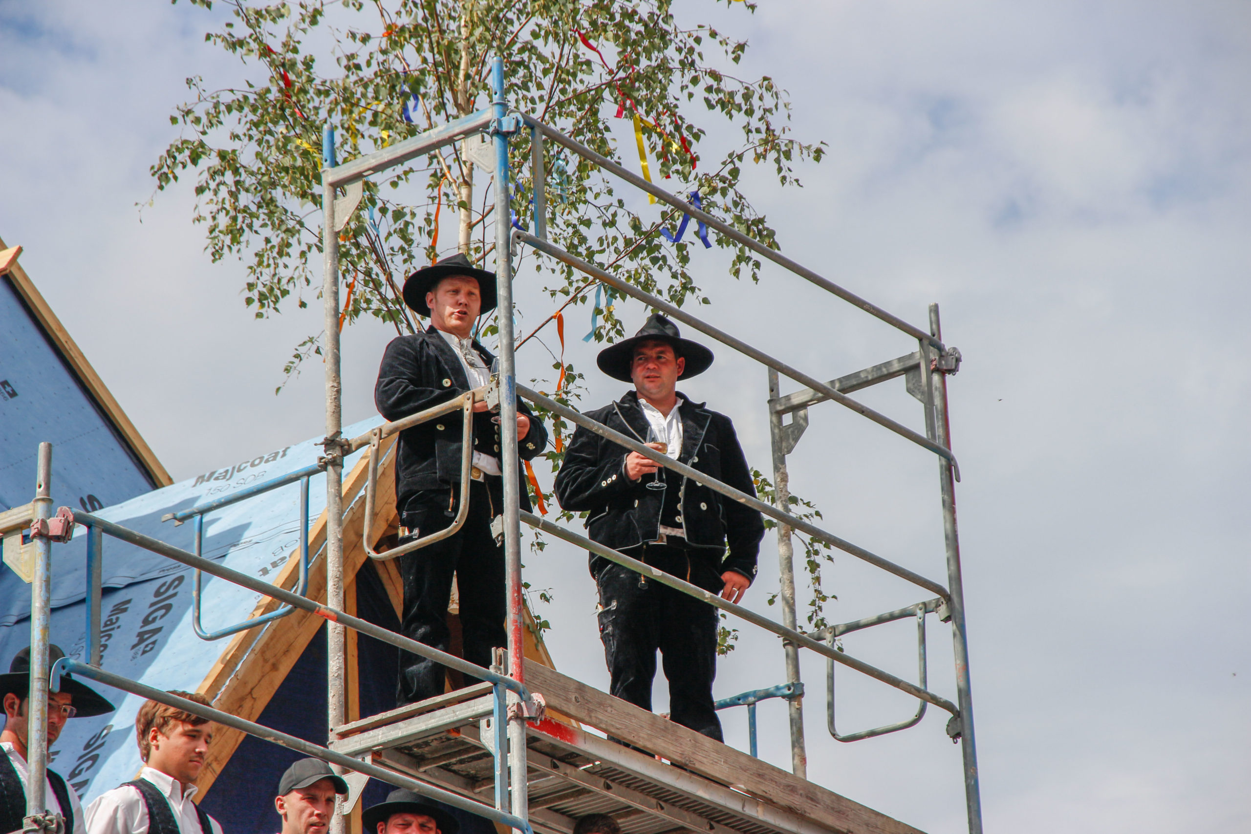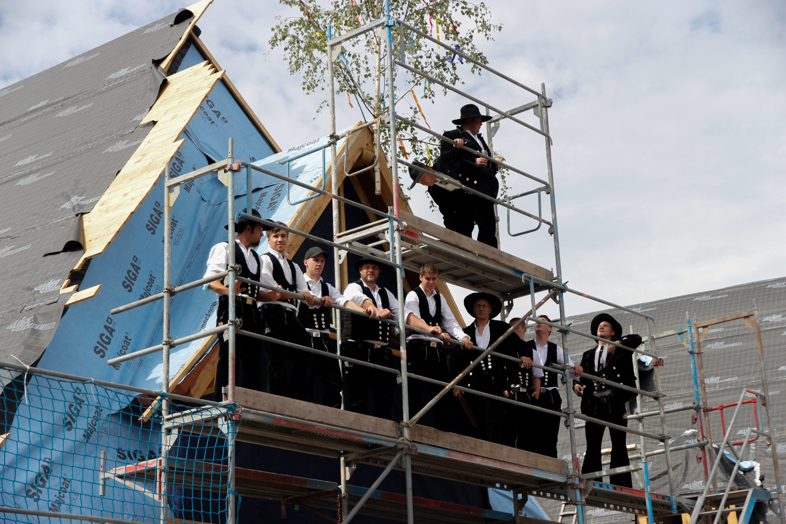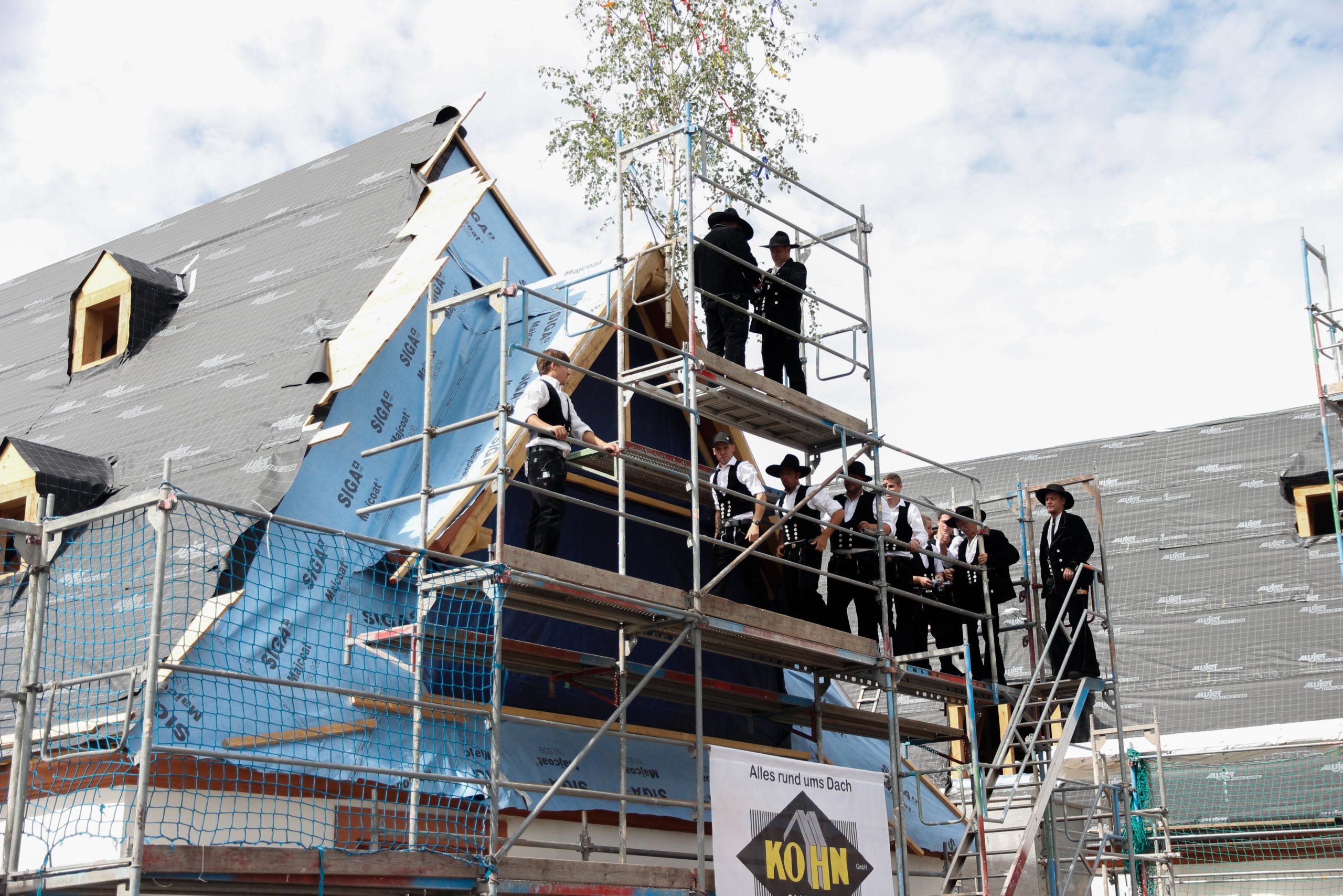 Im Anschluss folgte das Richtfest. Die Zimmerleute der Firma Holzbau Kohn GmbH erkletterten das Gerüst in ihrer traditionellen Kluft und stellten sich unter den Richtbaum. Dann weihten sie das Bauwerk mit Gottes Segen ein und dankten dem Bauherr, den Architekten und allen gegenüber, die zum Gelingen des Bauwerkes beigetragen haben. Bei diesem Ritual wurde vom Geschäftsführer der Fa. Holzbau Kohn GmbH (Sebastian Schubert + Jürgen Rauch) feierlich ein Glas gehoben und anschließend zu Boden geworfen. Aufgrund der Höhe war es gewährleistet, dass das Glas zu Bruch ging und somit nicht zu einem schlechten Omen gewertet kann.