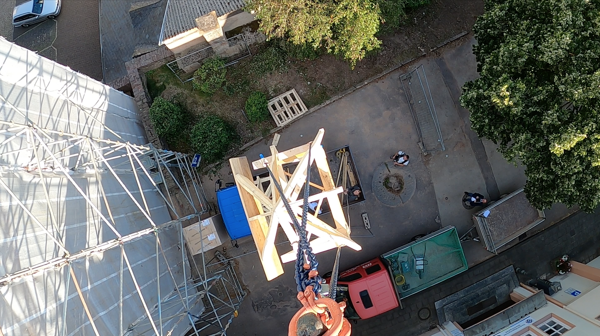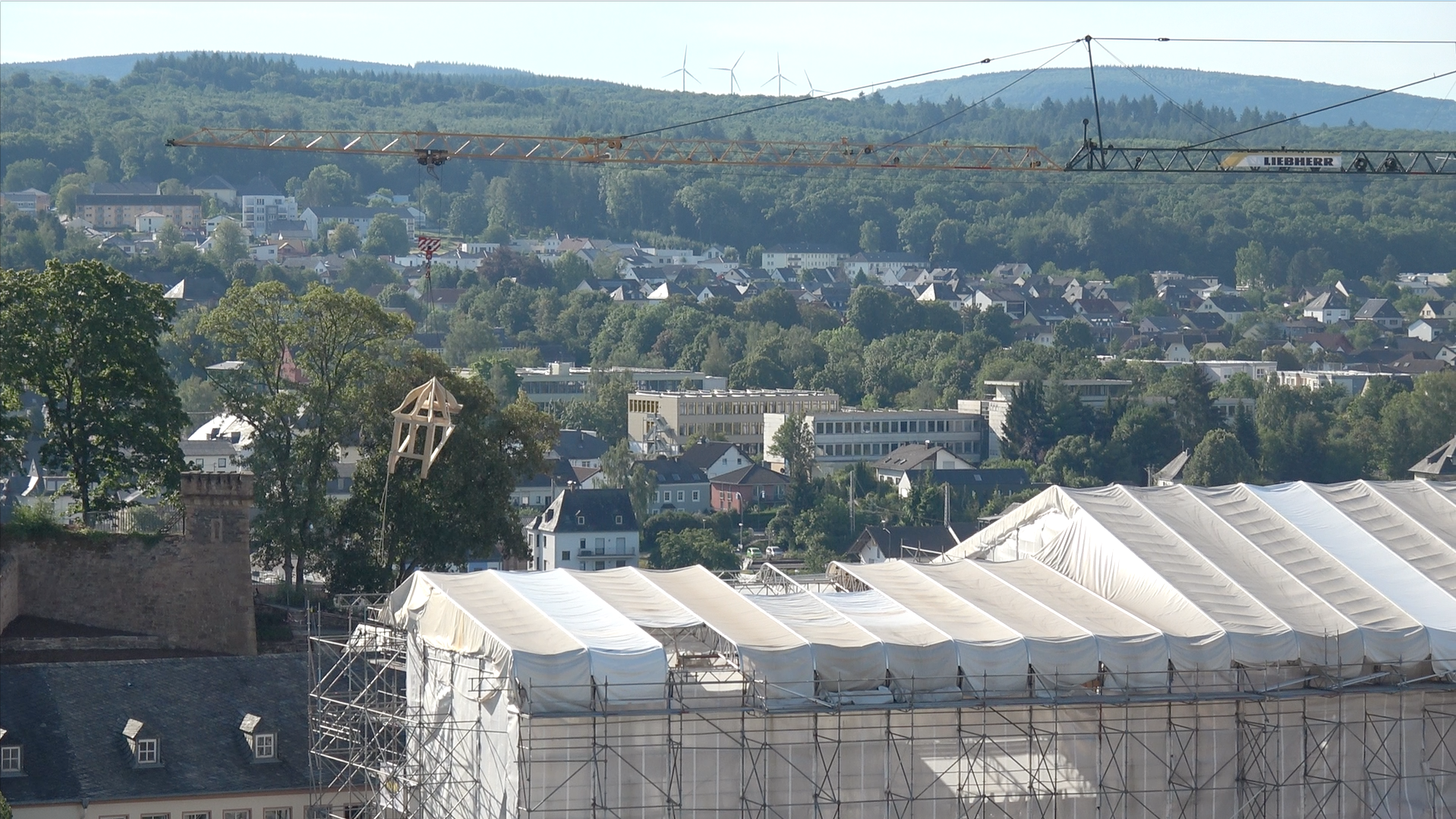 So wurden auch die geschwungenen Dachgaupen in der Werkstatt der Firma Holzbau Kohn GmbH in Beurig vorgefertigt und mit dem Kran in das zuvor geöffnete Zeltdach eingehoben. Sobald das neue Dach das Gebäude vor Regen schützt, wird das Zeltdach abgebaut und das Rathaus wieder in alter Form zu erkennen sein.